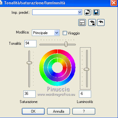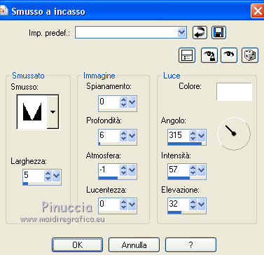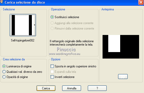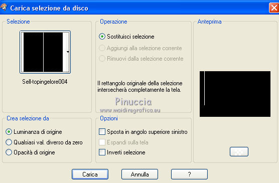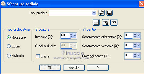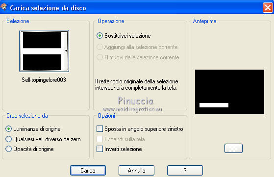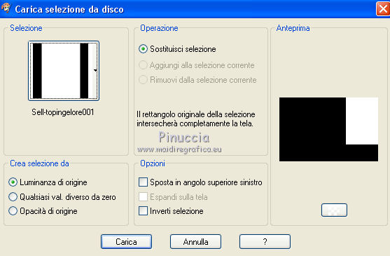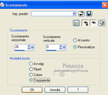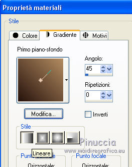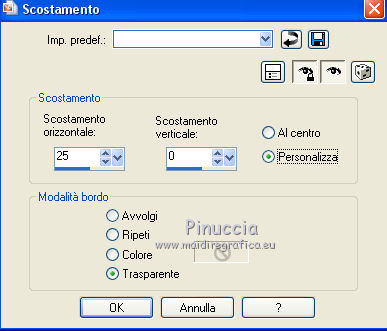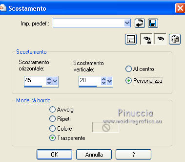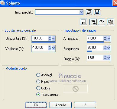 qui puoi trovare qualche risposta ai tuoi dubbi. Se l'argomento che ti interessa non è presente, ti prego di segnalarmelo. Questo tutorial è stato tradotto con CorelX7 e CorelX2, ma può essere realizzato anche con le altre versioni di PSP. Dalla versione X4, il comando Immagine>Rifletti è stato sostituito con Immagine>Capovolgi in orizzontale, e il comando Immagine>Capovolgi con Immagine>Capovolgi in verticale. Nelle versioni X5 e X6, le funzioni sono state migliorate rendendo disponibile il menu Oggetti. Con la nuova versione X7, sono tornati Rifletti>Capovolgi, ma con nuove varianti. Vedi la scheda sull'argomento qui traduzione in francese/traduction en français qui/ici Versioni/Versions quiOccorrente: Materiale qui Per i tubes grazie Luz Cristina (6171-Luz Cristina) e Beatriz (191-flower-LB TUBES) (in questa pagina trovi i links ai siti dei creatori di tubes) Filtri: se hai problemi con i filtri, consulta la mia sezione filtri qui Filters Unlimited 2.0 qui Mura's Meister - Copies qui Simple - Zoom out and flip qui Filter Factory Gallery L - Tiles a GoGo, Bonny Tiler qui Photo Effex - Scanlines qui Lotis - Mosaic Toolkit qui FM Tile Tools - Blend Emboss qui I filtri Factory Gallery e Simple si possono usare da soli o importati in Filters Unlimited (come fare vedi qui) Se un filtro fornito appare con questa icona ![]() non esitare a cambiare modalità di miscelatura e opacità secondo i colori utilizzati. Nelle ultime versioni di PSP non c'è il gradiente di primo piano/sfondo (Corel_06_029) Puoi usare i gradienti delle versioni precedenti. Trovi qui i gradienti Corel X. Metti il preset nella cartella Impostazioni predefinite. Metti le selezioni nella cartella Selezioni. 1. Apri una nuova immagine trasparente 1000 x 650 pixels. Imposta il colore di primo piano con il colore scuro #27130d, e il colore di sfondo con il colore chiaro #b28b60. ![]() Passa il colore di primo piano a Gradiente di primo piano/sfondo, stile Lineare. ![]() Riempi l'immagine trasparente con il gradiente.2. Effetti>Plugins>Mura's Meister - Copies. ![]() Effetti>Filtro definito dall'utente - seleziona il preset Emboss 3 e ok. ![]() 3. Effetti>Plugins>Simple - Zoom Out and Flip. 4. Effetti>Plugins>Filters Unlimited 2.0 - Filter Factory Gallery L - Tiles a GoGo ![]() 5. Selezione>Carica/Salva selezione>Carica selezione da disco. Cerca e carica la selezione Sell-topingelore001 ![]() 6. Livelli>Nuovo livello raster. Riempi la selezione con il gradiente.Selezione>Deseleziona. 7. Effetti>Plugins>Photoeffex - Scanlines. ![]() Livelli>Unisci>Unisci giù. 8. Effetti>Plugins>Filters Unlimited 2.0 - Filter Factory Gallery L - Bonny Tiler ![]() 9. Selezione>Carica/Salva selezione>Carica selezione da disco. Cerca e carica la selezione Sell-topingelore002 ![]() 10. Livelli>Nuovo livello raster. Imposta il colore di sfondo con il colore chiaro a07a55. Riempi la selezione con il colore chiaro.Selezione>Modifica>Contrai - 15 pixels. Premi sulla tastiera il tasto CANC ![]() Selezione>Deseleziona. 11. Apri il tube della donna e vai a Modifica>Copia. Torna al tuo lavoro e vai a Modifica>Incolla come nuovo livello. prima di posizionare il tube, l'ho ridimensionato una volta al 90% e una volta al 75% Adatta il tube alla cornice con lo strumento Puntatore ![]() ![]() Livelli>Unisci>Unisci giù. Effetti>Effetti 3D>Sfalsa ombra, colore #000000. ![]() 12. Livelli>Duplica. Immagine>Rifletti. 13. Effetti>Effetti di immagine>Scostamento. ![]() Livelli>Disponi>Sposta giù. 14. Regola>Sfocatura>Sfocatura radiale. ![]() 15. Effetti>Effetti di distorsione>Spigato. ![]() 16. Effetti>Effetti di distorsione>Coordinate polari. ![]() 17. Effetti>Effetti di immagine>Scostamento. ![]() 18. Su questo livello Regola>Tonalità e saturazione>Tonalità/Saturazione/Luminosità. ![]() 19. Apri il tube del fiore e vai a Modifica>Copia. Torna al tuo lavoro e vai a Modifica>Incolla come nuovo livello. Immagine>Ridimensiona, al 30%, tutti i livelli non selezionato. Regola>Messa a fuoco>Metti a fuoco. Posiziona il tube come nel mio esempio.![]() Effetti>Effetti 3D>Sfalsa ombra, colore #000000. ![]() 20. Attiva il livello Raster 1. Selezione>Carica/Salva selezione>Carica selezione da disco. Cerca e carica la selezione Sell-topingelore003 ![]() Selezione>Innalza selezione a livello. 21. Effetti>Plugins>LOtis - Mosaic Toolkit-v2.55 - Gears ![]() Selezione>Deseleziona. 22. Effetti>Plugins>FM Tile Tools - Blend Emboss, con i settaggi standard. ![]() 23. Livelli>Duplica. Immagine>Rifletti. 24. Effetti>Effetti di immagine>Scostamento. ![]() 25. Attiva nuovamente il livello Raster 1. Selezione>Carica/Salva selezione>Carica selezione da disco. Cerca e carica la selezione Sell-topingelore004 ![]() Selezione>Innalza selezione a livello. Selezione>Deseleziona. 26. Effetti>Effetti 3D>Smusso a incasso. ![]() 27. Livelli>Duplica. Immagine>Rifletti. 28. Effetti>Effetti di immagine>Scostamento. ![]() 29. Immagine>Aggiungi bordatura, 2 pixels, simmetriche, colore scuro #27130d. Immagine>Aggiungi bordatura, 50 pixels, simmetriche, colore bianco #ffffff. 30. Attiva lo strumento Bacchetta magica ![]() ![]() e clicca nel bordo bianco per selezionarlo. 31. Riporta il colore di sfondo al colore #b28b60 per avere il gradiente iniziale. Livelli>Nuovo livello raster. Riempi la selezione con il gradiente.32. Effetti>Plugins>Filters Unlimited 2.0 - Gradients - Linear,Duplex. ![]() Selezione>Deseleziona. Effetti>Effetti di bordo>Aumenta. 33. Immagine>Aggiungi bordatura, 2 pixels, simmetriche, colore scuro #27130d. Immagine>Ridimensiona, al 90%, tutti i livelli selezionato. Firma il tuo lavoro e salva in formato jpg. Versione con tubes di Luz Cristina e Lana ![]() ![]() Puoi scrivermi se hai problemi o dubbi, o trovi un link che non funziona, o soltanto per un saluto. 22 Febbraio 2021 |