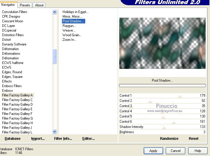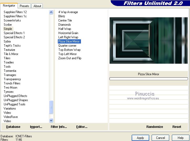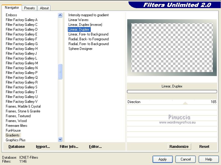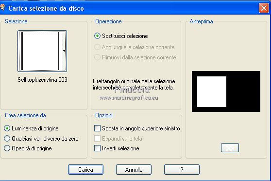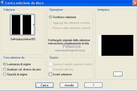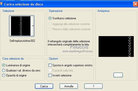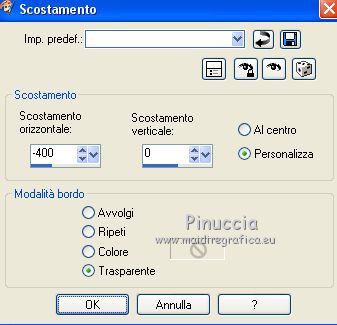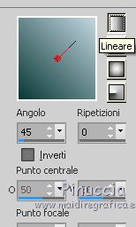 qui puoi trovare qualche risposta ai tuoi dubbi. Se l'argomento che ti interessa non è presente, ti prego di segnalarmelo. Questo tutorial è stato tradotto con CorelX7 e CorelX2, ma può essere realizzato anche con le altre versioni di PSP. Dalla versione X4, il comando Immagine>Rifletti è stato sostituito con Immagine>Capovolgi in orizzontale, e il comando Immagine>Capovolgi con Immagine>Capovolgi in verticale. Nelle versioni X5 e X6, le funzioni sono state migliorate rendendo disponibile il menu Oggetti. Con la nuova versione X7, sono tornati Rifletti>Capovolgi, ma con nuove varianti. Vedi la scheda sull'argomento qui traduzione in francese/traduction en français qui/ici Versioni/Versions quiOccorrente: Materiale qui Per il tube grazie Luz Cristina (6061-luzcristina) e Nikita (1293040162_paysages_nikita) (in questa pagina trovi i links ai siti dei creatori di tubes) Filtri: se hai problemi con i filtri, consulta la mia sezione filtri qui Filters Unlimited 2.0 qui VM Extravaganza - Holidays in Egypt qui Filter Factory Gallery A - Pool Shadow qui L&K's - L&K's Maxime qui Simple - Pizza Slice Mirror qui I filtri VM Extravaganza, S Simple si possono usare da soli o importati in Filters Unlimited (come fare vedi qui) Se un filtro fornito appare con questa icona ![]() non esitare a cambiare modalità di miscelatura e opacità secondo i colori utilizzati. Nelle ultime versioni di PSP non c'è il gradiente di primo piano/sfondo (Corel_06_029) Puoi usare i gradienti delle versioni precedenti. Trovi qui i gradienti Corel X. Metti le selezioni nella cartella Selezioni. 1. Apri una nuova immagine trasparente 1000 x 600 pixels. Imposta il colore di primo piano con il colore scuro #093836, e il colore di sfondo con il colore chiaro #c1d5de. ![]() Passa il colore di primo piano a Gradiente di primo piano/sfondo, stile Lineare. ![]() Riempi l'immagine trasparente con il gradiente.2. Selezione>Seleziona tutto. Apri il tube della donna e vai a Modifica>Copia. Torna al tuo lavoro e vai a Modifica>Incolla nella selezione. Selezione>Deseleziona. 3. Effetti>Effetti di immagine>Motivo unico, con i settaggi standard. ![]() 4. Regola>Sfocatura>Sfocatura gaussiana - raggio 35. ![]() 5. Effetti>Plugins>Filters Unlimited 2.0 - VM Extravaganza - Holidays in Egypt. ![]() Effetti>Effetti di bordo>Aumenta. Livelli>Duplica. 6. Effetti>Plugins>Filters Unlimited 2.0 - Filter Factory Gallery A - Pool Shadow. ![]() 7. Effetti>Plugins>L&K's - L&K's Maxime. ![]() Livelli>Unisci>Unisci giù. 8. Effetti>Plugins>Filters Unlimited 2.0 - Simple - Pizza Slice Mirror. ![]() 9. Selezione>Carica/Salva selezione>Carica selezione da disco. Cerca e carica la selezione Sell-topluzcristina-001. ![]() Selezione>Innalza selezione a livello. Selezione>Deseleziona. 10. Immagine>Rifletti. 11. Effetti>Effetti di immagine>Scostamento. ![]() Cambia la modalità di miscelatura di questo livello in Schiarisci. Livelli>Unisci>Unisci giù. 12. Selezione>Carica/Salva selezione>Carica selezione da disco. Cerca e carica la selezione Sell-topluzcristina-002. ![]() 13. Livelli>Nuovo livello raster. Imposta il colore di sfondo con il colore chiaro #d7d2b7 ![]() Riempi la selezione con il colore chiaro #d7d2b7.Selezione>Deseleziona. Livelli>Unisci>Unisci giù. 14. Apri il tube del paesaggio 1293040162_paysages_nikita e vai a Modifica>Copia. Torna al tuo lavoro e vai a Modifica>Incolla come nuovo livello. Posiziona il tube sulla cornice, a tuo piacimento.![]() 15. Selezione>Carica/Salva selezione>Carica selezione da disco. Cerca e carica la selezione Sell-topluzcristina-003. ![]() Se necessario, puoi ancora correggere la posizione del tube. ![]() Selezione>Inverti. Premi sulla tastiera il tasto CANC ![]() Selezione>Deseleziona. Livelli>Unisci>Unisci giù. 16. Attiva nuovamente il tube della donna e vai a Modifica>Copia. Torna al tuo lavoro e vai a Modifica>Incolla come nuovo livello. Immagine>Ridimensiona, all'80%, tutti i livelli non selezionato. Sposta il tube a destra.Effetti>Effetti 3D>Sfalsa ombra, colore nero. ![]() 17. Immagine>Aggiungi bordatura, 2 pixels, simmetriche, colore chiaro #c1d5de. Immagine>Aggiungi bordatura, 2 pixels, simmetriche, colore scuro #093836 Immagine>Aggiungi bordatura, 50 pixels, simmetriche, colore bianco. 18. Attiva lo strumento Bacchetta magica ![]() ![]() e clicca nel bordo bianco per selezionarlo. Imposta il colore di primo piano con il colore scuro #5a6e70, e il colore di sfondo con il colore chiaro #efede1. ![]() Passa il colore di primo piano a Gradiente di primo piano/sfondo, stile Lineare. ![]() Riempi la selezione con il gradiente.19. Effetti>Plugins>Filters>Unlimited 2.0 - Gradients - Linear, Duplex. ![]() 20. Regola>Aggiungi/Rimuovi disturbo>Rimozione artefatto JPEG ![]() Effetti>Effetti di bordo>Aumenta. 21. Immagine>Aggiungi bordatura, 2 pixels, simmetriche, colore scuro #093836. 22. Immagine>Ridimensiona, 1000 pixels di larghezza, tutti i livelli selezionato. 23. Firma il tuo lavoro e salva in formato jpg. Versione con tubes di Luz Cristina ![]() ![]() Puoi scrivermi se hai problemi o dubbi, o trovi un link che non funziona, o soltanto per un saluto. 30 Gennaio 2021 |