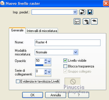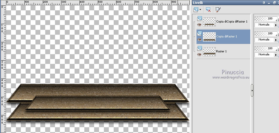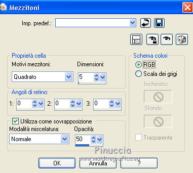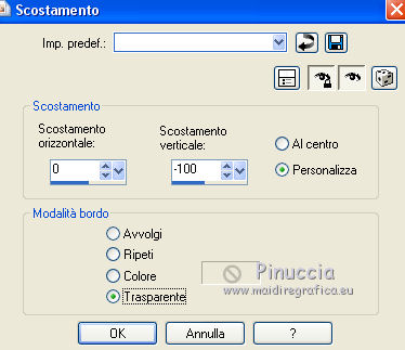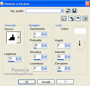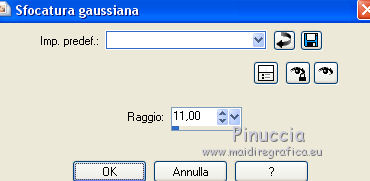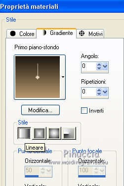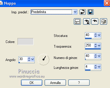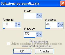 qui puoi trovare qualche risposta ai tuoi dubbi. Se l'argomento che ti interessa non è presente, ti prego di segnalarmelo. Questo tutorial è stato tradotto con CorelX7 e CorelX2, ma può essere realizzato anche con le altre versioni di PSP. Dalla versione X4, il comando Immagine>Rifletti è stato sostituito con Immagine>Capovolgi in orizzontale, e il comando Immagine>Capovolgi con Immagine>Capovolgi in verticale. Nelle versioni X5 e X6, le funzioni sono state migliorate rendendo disponibile il menu Oggetti. Con la nuova versione X7, sono tornati Rifletti>Capovolgi, ma con nuove varianti. Vedi la scheda sull'argomento qui traduzione in francese/traduction en français qui/iciVersioni/Versions qui Occorrente: Materiale qui Per i tubes grazie Beatriz e Luz Cristina. (in questa pagina trovi i links ai siti dei creatori di tubes) Filtri: se hai problemi con i filtri, consulta la mia sezione filtri qui Paint Engine - Fantastic Machine qui Flaming Pear - Flood qui ![]() non esitare a cambiare modalità di miscelatura e opacità secondo i colori utilizzati. Nelle ultime versioni di PSP non c'è il gradiente di primo piano/sfondo (Corel_06_029) Puoi usare i gradienti delle versioni precedenti. Trovi qui i gradienti Corel X. 1. Apri una nuova immagine trasparente 1000 x 700 pixels. 2. Imposta il colore di primo piano con il colore chiaro #b7976d, e il colore di sfondo con il colore scuro #1d1811. ![]() Passa il colore di primo piano a Gradiente di primo piano/sfondo, stile Lineare. ![]() Riempi l'immagine trasparente con il gradiente.2. Effetti>Effetti di trama>Nappa, con i settaggi standard. ![]() Effetti>Effetti di bordo>Aumenta. 3. Attiva lo strumento Puntatore ![]() in modalità Scala ![]() spingi il nodo centrale superiore verso il basso, fino a 250 pixels, e il nodo inferiore centrale verso l'alto, fino a 350 pixels. ![]() 4. Effetti>Effetti 3D>Smusso a incasso. ![]() 5. Attiva lo strumento Puntatore ![]() in modalità Prospettiva ![]() spingi il nodo superiore sinistro verso destra, fino a 80 pixels. Il nodo opposto si sposterà simmetricamente ![]() 6. Effetti>Effetti di immagine>Scostamento. ![]() 7. Livelli>Duplica. Effetti>Effetti di immagine>Scostamento. ![]() 8. Livelli>Duplica. Immagine>Ridimensiona, all'80%, tutti i livelli non selezionato. Effetti>Effetti 3D>Sfalsa ombra, colore #000000. ![]() 9. Attiva il livello Raster 1. Modifica>Ripeti Sfalsa ombra. Attiva il livello Copia di Raster 1. Modifica>Ripeti Sfalsa ombra. ![]() Livelli>Unisci>Unisci visibile. 10. Livelli>Nuovo livello raster. Riempi il livello con il gradiente.Livelli>Disponi>Porta sotto. 11. Livelli>Nuovo livello raster. Selezione>Seleziona tutto. Apri il tube del paesaggio e vai a Modifica>Copia. Torna al tuo lavoro e vai a Modifica>Incolla nella selezione. Selezione>Deseleziona. 12. Effetti>Effetti di immagine>Motivo unico, con i settaggi standard. ![]() 13. Regola>Sfocatura>Sfocatura gaussiana - raggio 11. ![]() Livelli>Unisci>Unisci giù. 14. Effetti>Plugins>Fantastic Machine - PaintEngine. Seleziona il preset curve brush e ok. ![]() se non trovi il preset, puoi copiare i settaggi che vedi nella schermata 15. Effetti>Plugins>Flaming Pear - Flood - Horizon a 60 e il resto standard, colore #000000. ![]() Per addolcire il bordo del filtro ![]() seleziona il bordo con lo strumento Selezione , rettangolo(chiudi il livello superiore per vedere meglio) ![]() Regola>Sfocatura>Sfocatura gaussiana, con i settaggi precedenti Risultato ![]() 16. Modifica>Incolla come nuovo livello (il tube del paesaggio è sempre in memoria). Livelli>Disponi>Porta in alto. Sposta in alto a destra.![]() 17. Attiva lo strumento Selezione ![]() (non importa il tipo di selezione impostato, perchè con la selezione personalizzata si ottiene sempre un rettangolo) clicca sull'icona Selezione personalizzata ![]() e imposta i seguenti settaggi. ![]() 18. Livelli>Nuovo livello raster. Riempi il livello con il gradiente.Selezione>Deseleziona. 19. Effetti>Effetti 3D>Smusso a incasso, con i settaggi precedenti. ![]() 20. Livelli>Duplica. Effetti>Effetti di immagine>Scostamento. ![]() Livelli>Duplica. Effetti>Effetti di immagine>Scostamento, con i settaggi precedenti. ![]() Livelli>Unisci>Unisci giù - 2 volte. 22. Livelli>Nuovo livello raster. Abbassa l'opacità di questo livello al 50%. ![]() 23. Selezione personalizzata ![]() ![]() Riempi la selezione con il gradiente.Selezione>Deseleziona. 24. Effetti>Effetti artistici>Mezzitoni. ![]() Livelli>Disponi>Sposta giù. 25. Attiva il livello superiore. Aggiungi il tuo tube accessorio, per l'esempio le foglie. Ridimensiona e disponi le foglie a tuo piacimento; per l'esempio. ![]() 26. Attiva lo strumento Pennello ![]() rotondo, dimensioni 24, opacità 50 ![]() 27. Livelli>Nuovo livello raster. Livelli>Disponi>Sposta giù (sotto il livello delle foglie). Imposta il colore di primo piano con il colore bianco #ffffff. Applica il pennello pressapoco come nell'esempio ![]() 28. Regola>Sfocatura>Sfocatura gaussiana - raggio 10. ![]() ![]() 29. Apri il tube della donna e vai a Modifica>Copia. Torna al tuo lavoro e vai a Modifica>Incolla come nuovo livello. Ridimensiona e posiziona il tube a tuo piacimento. Effetti>Effetti 3D>Sfalsa ombra, colore #000000. ![]() 30. Immagine>Aggiungi bordatura, 5 pixels, simmetriche, colore chiaro. Immagine>Aggiungi bordatura, 10 pixels, simmetriche, colore bianco. Immagine>Aggiungi bordatura, 2 pixels, simmetriche, colore nero #000000. Firma il tuo lavoro su un nuovo livello. Livelli>Unisci>Unisci tutto e salva in formato jpg. Versione con tubes di Luz Cristina ![]() ![]() Puoi scrivermi se hai problemi o dubbi, o trovi un link che non funziona, o soltanto per un saluto. 11 Luglio 2019 |