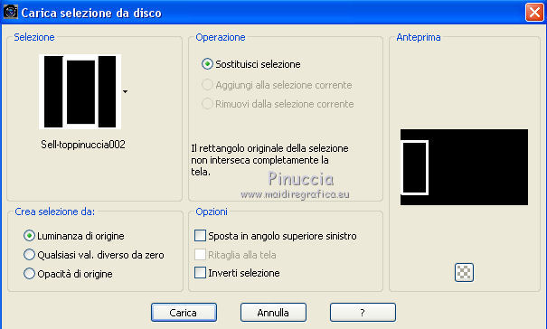 qui puoi trovare qualche risposta ai tuoi dubbi. Se l'argomento che ti interessa non è presente, ti prego di segnalarmelo. Questo tutorial è stato tradotto con CorelX7 e CorelX2, ma può essere realizzato anche con le altre versioni di PSP. Dalla versione X4, il comando Immagine>Rifletti è stato sostituito con Immagine>Capovolgi in orizzontale, e il comando Immagine>Capovolgi con Immagine>Capovolgi in verticale. Nelle versioni X5 e X6, le funzioni sono state migliorate rendendo disponibile il menu Oggetti. Con la nuova versione X7, sono tornati Rifletti>Capovolgi, ma con nuove varianti. Vedi la scheda sull'argomento qui traduzione in francese/traduction en français qui/ici Versioni/Versions quiOccorrente: Materiale qui Per i tubes grazie Luz Cristina e Beatriz. (in questa pagina trovi i links ai siti dei creatori di tubes) Filtri: se hai problemi con i filtri, consulta la mia sezione filtri qui Filters Unlimited 2.0 qui DSB Flux - Linear Transmission qui Mura's Seamless - Shift at Arch qui Filter Factory Gallery A - Pool Shadow qui Filter Factory Gallery T - Old Film 2 qui Sapphire Innovation v1.5 - SilverLining qui nella lista dei filtri trovi l'effetto sotto la lettera I "innovations v1.5 Mehdi - Kaleidoscope 2.1 qui Andromeda - Designs qui Transparency - Eliminate Black qui Mura's Meister - Perspective Tiling qui VM Natural - Lakeside Reflection qui I filtri Mura's Seamless, Factory Gallery, Transparency e VM Natural si possono usare da soli o importati in Filters Unlimited (come fare vedi qui) Se un filtro fornito appare con questa icona ![]() non esitare a cambiare modalità di miscelatura e opacità secondo i colori utilizzati. Nelle ultime versioni di PSP non c'è il gradiente di primo piano/sfondo (Corel_06_029) Puoi usare i gradienti delle versioni precedenti. Trovi qui i gradienti Corel X. Metti le selezioni nella cartella Selezioni. 1. Apri una nuova immagine trasparente 1000 x 600 pixels. Imposta il colore di primo piano con il colore chiaro #abbdae, e il colore di sfondo con il colore scuro #252d35. ![]() Passa il colore di primo piano a Gradiente di primo piano/sfondo, stile Sprazzo di luce. ![]() Riempi l'immagine trasparente con il gradiente.2. Effetti>Plugins>DSB Flux - Linear Transmission. ![]() Effetti>Effetti di bordo>Aumenta. 3. Effetti>Plugins>Filters Unlimited 2.0 - Mura's Seamless - Shift at Arch ![]() 4. Livelli>Duplica. Immagine>Ridimensiona, al 70%, tutti i livelli non selezionato. 5. Effetti>Plugins>Filters Unlimited 2.0 - Filter Factory Gallery A - Pool Shadow. ![]() 6. Effetti>Plugins>Innovation v1.5 - SilverLining. ![]() 7. Effetti>Plugins>Filters Unlimited 2.0 - Filter Factory Gallery T - Old Film 2. ![]() Livelli>Unisci>Unisci giù. 8. Effetti>Plugins>Mehdi - Kaleidoscope 2-1 ![]() 9. Livelli>Duplica. Cambia la modalità di miscelatura di questo livello in Luce netta. Livelli>Unisci>Unisci visibile. 10. Selezione>Carica/Salva selezione>Carica selezione da disco. Cerca e carica la selezione Sell-toppinuccia-001. ![]() 11. Livelli>Nuovo livello raster. Riempi con il colore scuro di sfondo.Selezione>Deseleziona. 12. Attiva lo strumento Bacchetta magica ![]() e clicca nella cornice per selezionarla. Livelli>Nuovo livello raster. Riempi la selezione con il gradiente.13. Effetti>Plugins>Andromeda - Designs ![]() Risultato: ![]() 14. Effetti>Plugins>Filters Unlimited 2.0 - Transparency - Eliminate Black. ![]() Effetti>Effetti di bordo>Aumenta. Selezione>Deseleziona. Livelli>Unisci>Unisci giù. 15. Effetti>Plugins>Mura's Meister - Perspective Tiling ![]() Effetti>Effetti 3D>Sfalsa ombra, colore #000000. ![]() 16. Selezione>Carica/Salva selezione>Carica selezione da disco. Cerca e carica la selezione Sell-toppinuccia-002. ![]() 17. Livelli>Nuovo livello raster. Riempi con il colore scuro di sfondo.Selezione>Deseleziona. 18. Attiva lo strumento Bacchetta magica ![]() e clicca nella cornice per selezionarla. ![]() Livelli>Nuovo livello raster. Riempi con il gradiente.19. Effetti>Plugins>Andromeda - Designs ![]() 20. Effetti>Plugins>Filters Unlimited 2.0 - Transparency - Eliminate Black. ![]() Effetti>Effetti di bordo>Aumenta. Selezione>Deseleziona. Livelli>Unisci>Unisci giù. 21. Livelli>Duplica. Immagine>Rifletti. Livelli>Unisci>Unisci giù. 22. Attiva il livello inferiore, Uniti. Effetti>Plugins>Filters Unlimited 2.0 - VM Natural - Lakeside Reflection. ![]() 23. Apri il tube del paesaggio di Luz Cristina e vai a Modifica>Copia. Torna al tuo lavoro e vai a Modifica>Incolla come nuovo livello. Attiva lo strumento Puntatore ![]() in modalità Scala ![]() usa i nodi centrali a destra e a sinistra per allargare il tube pressappoco come nell'esempio ![]() Livelli>Unisci>Unisci visibile. 24. Apri il tube 2978-woman-LB TUBES e vai a Modifica>Copia. Torna al tuo lavoro e vai a Modifica>Incolla come nuovo livello. Immagine>Rifletti. Immagine>Ridimensiona, all'80%, tutti i livelli non selezionato. Posiziona il tube a destra, o come preferisci.Effetti>Effetti 3D>Sfalsa ombra, colore #000000. ![]() 25. (Facoltativo) Aggiungi il tube decorativo 26. Immagine>Aggiungi bordatura, 5 pixels, simmetriche, colore chiaro #abbdae. Immagine>Aggiungi bordatura, 5 pixels, simmetriche, colore bianco #ffffff. Immagine>Aggiungi bordatura, 5 pixels, simmetriche, colore chiaro #abbdae. Selezione>Seleziona tutto. Selezione>Modifica>Contrai - 15 pixels. Selezione>Inverti. Effetti>Effetti di bordo>Aumenta. Selezione>Deseleziona. Firma il tuo lavoro e salva in formato jpg. Versione con tubes di Jewel ![]() ![]() Puoi scrivermi se hai problemi o dubbi, o trovi un link che non funziona, o soltanto per un saluto. 17 Gennaio 2021 |