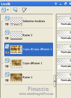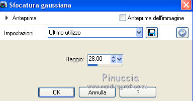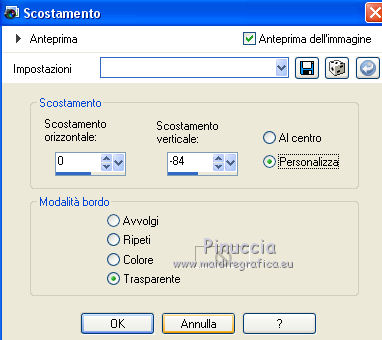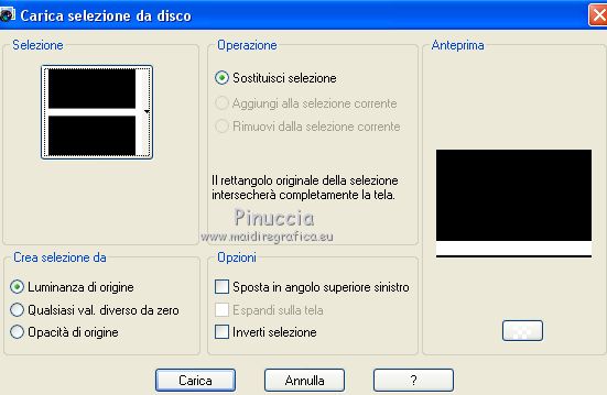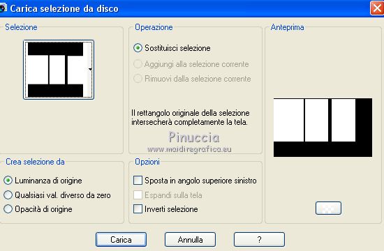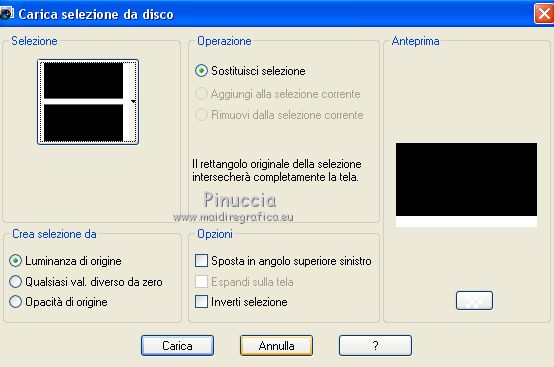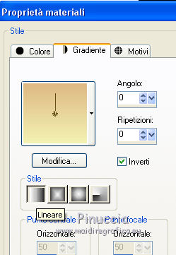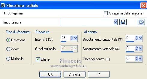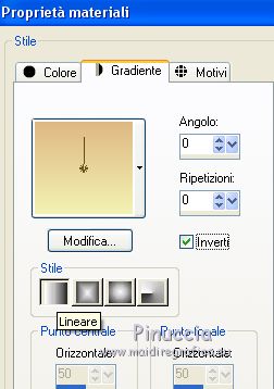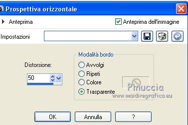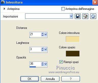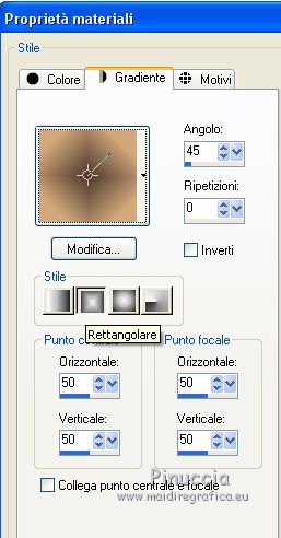 qui puoi trovare qualche risposta ai tuoi dubbi. Se l'argomento che ti interessa non è presente, ti prego di segnalarmelo. Questo tutorial è stato tradotto con CorelX7 e CorelX2, ma può essere realizzato anche con le altre versioni di PSP. Dalla versione X4, il comando Immagine>Rifletti è stato sostituito con Immagine>Capovolgi in orizzontale, e il comando Immagine>Capovolgi con Immagine>Capovolgi in verticale. Nelle versioni X5 e X6, le funzioni sono state migliorate rendendo disponibile il menu Oggetti. Con la nuova versione X7, sono tornati Rifletti>Capovolgi, ma con nuove varianti. Vedi la scheda sull'argomento qui traduzione in francese/traduction en français qui/ici Versioni/Versions quiOccorrente: Materiale qui Per i tubes grazie Gabry e Hebe. (in questa pagina trovi i links ai siti dei creatori di tubes) Filtri: se hai problemi con i filtri, consulta la mia sezione filtri qui Filters Unlimited 2.0 qui Funhouse - Loom qui VM_Texture - Tiles a GoGo qui Mura's Meister - Perspective Tiling qui I filtri Funhouse e VM Texture si possono usare da soli o importati in Filters Unlimited (come fare vedi qui) Se un filtro fornito appare con questa icona ![]() non esitare a cambiare modalità di miscelatura e opacità secondo i colori utilizzati. Nelle ultime versioni di PSP non c'è il gradiente di primo piano/sfondo (Corel_06_029) Puoi usare i gradienti delle versioni precedenti. Trovi qui i gradienti Corel X. Metti le selezioni nella cartella Selezioni. 1. Apri una nuova immagine trasparente 1000 x 600 pixels. Imposta il colore di primo piano con il colore scuro #4e3a2e, e il colore di sfondo con il colore chiaro #d2a77a. ![]() Passa il colore di primo piano a Gradiente di primo piano/sfondo, stile Rettangolare. ![]() Riempi l'immagine trasparente con il gradiente.Selezione>Seleziona tutto. Apri il tube del paesaggio e vai a Modifica>Copia. Torna al tuo lavoro e vai a Modifica>Incolla nella selezione. Selezione>Deseleziona. 2. Regola>Sfocatura>Sfocatura radiale. ![]() 3. Effetti>Effetti di immagine>Motivo unico, con i settaggi standard. ![]() 4. Regola>Sfocatura>Sfocatura gaussiana, raggio 28. ![]() 5. Effetti>Plugins>Filters Unlimited 2.0 - FunHouse - Loom. ![]() Livelli>Duplica. 6. Imposta il colore di primo piano con il colore scuro #deb883, e il colore di sfondo con il colore chiaro #f2f2b2. ![]() Passa il colore di primo piano a Gradiente di primo piano/sfondo, stile Lineare. ![]() Selezione>Seleziona tutto. Selezione>Modifica>Contrai - 40 pixels. Selezione>Inverti. 7. Livelli>Nuovo livello raster. Riempi il livello con il gradiente lineare.Selezione>Deseleziona. Livelli>Unisci>Unisci giù. Immagine>Ridimensiona, all'85%, tutti i livelli non selezionato. Livelli>Duplica. 8. Effetti>Effetti>Plugins>s>Filters Unlimited 2.0 - VM Texture - Tiles a GoGo ![]() 9. Selezione>Carica/Salva selezione>Carica selezione da disco. Cerca e carica la selezione Sell-001. ![]() 10. Livelli>Nuovo livello raster. Modifica>Incolla nella selezione (il tube del paesaggio è sempre in memoria). Selezione>Deseleziona. Cambia la modalità di miscelatura di questo livello in Luce netta. Livelli>Unisci>Unisci giù. 11- Selezione>Carica/Salva selezione>Carica selezione da disco. Cerca e carica la selezione Sell-002. ![]() Selezione>Innalza selezione a livello. Selezione>Deseleziona. 12. Effetti>Effetti geometrici>Prospettiva orizzontale. ![]() 13. Effetti>Effetti di riflesso>Specchio rotante, con i settaggi standard. ![]() 14. Immagine>Dimensioni tela - 1000 x 700 pixels. ![]() 15. Selezione>Carica/Salva selezione>Carica selezione da disco. Cerca e carica la selezione Sell-003 ![]() 16. Livelli>Nuovo livello raster. Riporta il colore di primo piano ai colori iniziali e al gradiente iniziali primo piano #4e3a2e, sfondo #d2a77a. ![]() Riempi la selezione con il gradiente.Selezione>Deseleziona. 17. Effetti>Effetti di trama>Intessitura. Colore intessitura #f3df9e; colore spazio #412f09. ![]() 18. Effetti>Plugins>MuRa's Filter Meister - Perspective Tiling ![]() Livelli>Disponi>Sposta giù. Attiva il livello superiore, Selezione innalzata. 19. Effetti>Effetti di immagine>Scostamento. ![]() 20. Effetti>Effetti 3D>Sfalsa ombra, colore #000000. ![]() Attiva il livello Copia 2 di Raster 1. ![]() Modifica>Ripeti Sfalsa ombra. 21. Livelli>Nuovo livello raster. Livelli>Disponi>Porta sotto. Passa il colore di primo piano a Colore. Riempi il livello con il colore scuro.Attiva il livello Raster 2. ![]() 22. Apri il tube Gabry-fiori-120 e vai a Modifica>Copia. Torna al tuo lavoro e vai a Modifica>Incolla come nuovo livello. Immagine>Ridimensiona, al 70%, tutti i livelli non selezionato. Posiziona correttamente il tube.![]() Effetti>Effetti 3D>Sfalsa ombra, con i settaggi precedenti. 23. Immagine>Aggiungi bordatura, 2 pixels, simmetriche, colore scuro. Immagine>Aggiungi bordatura, 25 pixels, simmetriche, colore bianco #ffffff. Attiva lo strumento Bacchetta magica ![]() ![]() e clicca nell'ultimo bordo di 25 pixels per selezionarlo. 24. Imposta il colore di primo piano con il colore scuro #deb883, e il colore di sfondo con il colore chiaro #f2f2b2. ![]() Passa il colore di primo piano a Gradiente di primo piano/sfondo, stile Lineare. ![]() Riempi la selezione con il gradiente.Effetti>Effetti di bordo>Aumenta. Selezione>Deseleziona. 25. Immagine>Aggiungi bordatura, 2 pixels, simmetriche, colore chiaro #f2f2b2. Firma il tuo lavoro e salva in formato jpg. Il tube dei fiori è di Syl; il paesaggio è mio ![]() ![]() Puoi scrivermi se hai problemi o dubbi, o trovi un link che non funziona, o soltanto per un saluto. 4 Gennaio 2021 |