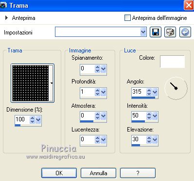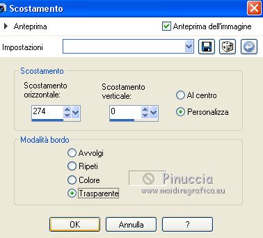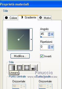 qui puoi trovare qualche risposta ai tuoi dubbi. Se l'argomento che ti interessa non è presente, ti prego di segnalarmelo. Questo tutorial è stato tradotto con CorelX7 e CorelX2, ma può essere realizzato anche con le altre versioni di PSP. Dalla versione X4, il comando Immagine>Rifletti è stato sostituito con Immagine>Capovolgi in orizzontale, e il comando Immagine>Capovolgi con Immagine>Capovolgi in verticale. Nelle versioni X5 e X6, le funzioni sono state migliorate rendendo disponibile il menu Oggetti. Con la nuova versione X7, sono tornati Rifletti>Capovolgi, ma con nuove varianti. Vedi la scheda sull'argomento qui traduzione in francese/traduction en français qui/ici Versioni/Versions quiOccorrente: Materiale qui Per i tubes grazie Yoka e LisaT. (in questa pagina trovi i links ai siti dei creatori di tubes) Filtri: se hai problemi con i filtri, consulta la mia sezione filtri qui Filters Unlimited 2.0 qui Simple - Centre Tile, Pizza Slice Mirror qui DSB Flux - Linear Transmission, Psychedelic qui Sapphire Innovation v1.5 qui nella lista dei filtri trovi l'effetto sotto la lettera I "innovations v1.5 Xero - Ultraviolet qui I filtri Simple si possono usare da soli o importati in Filters Unlimited (come fare vedi qui) Se un filtro fornito appare con questa icona ![]() non esitare a cambiare modalità di miscelatura e opacità secondo i colori utilizzati. Nelle ultime versioni di PSP non c'è il gradiente di primo piano/sfondo (Corel_06_029) Puoi usare i gradienti delle versioni precedenti. Trovi qui i gradienti Corel X. La trama Corel_15_006, o Griglia nelle versioni meno recenti, è standard in PSP. Se non la trovi nel tuo PSP, metti quella fornita nella cartella Trame. Metti le selezioni nella cartella Selezioni. 1. Apri una nuova immagine trasparente 950 x 650 pixels. Imposta il colore di primo piano con il colore scuro #303b50, e il colore di sfondo con il colore chiaro #94af84. ![]() Passa il colore di primo piano a Gradiente di primo piano/sfondo, stile Lineare. ![]() Riempi l'immagine trasparente con il gradiente.2. Effetti>Plugins>DSB Flux - Linear Transmission ![]() Effetti>Effetti di bordo>Aumenta. 3. Effetti>Plugins>Filters Unlimited 2.0 - Simple - Pizza Slice Mirror ![]() 4. Selezione>Carica/Salva selezione>Carica selezione da disco. Cerca e carica la selezione Sell-001. ![]() Selezione>Innalza selezione a livello. Selezione>Deseleziona. 5. Effetti>Plugins>Innovation V1.5 - SilverLining ![]() Livelli>Unisci>Unisci giù. 6. Effetti>Plugins>Filters Unlimited 2.0 - Simple - Centre Tile ![]() 7. Selezione>Carica/Salva selezione>Carica selezione da disco. Cerca e carica la selezione Sell-002. ![]() 8. Livelli>Nuovo livello raster. Riempi con il colore chiaro di sfondoSelezione>Deseleziona. 9. Effetti>Effetti di trama>Trama - seleziona la trama Griglia o Corel_15_006. ![]() Effetti>Effetti 3D>Sfalsa ombra, colore #000000. ![]() 10. Livelli>Duplica. Immagine>Capovolgi. 11. Effetti>Effetti di immagine>Scostamento. ![]() Livelli>Unisci>Unisci giù. Attiva il livello Raster 1. 12. Selezione>Carica/Salva selezione>Carica selezione da disco. Cerca e carica la selezione Sell-003. ![]() 13. Livelli>Nuovo livello raster. Riempi con il colore chiaro.Selezione>Modifica>Contrai - 20 pixels. 14. Livelli>Nuovo livello raster. Imposta il colore di primo piano con il colore bianco. Riempi con il colore bianco.Selezione>Modifica>Contrai - 2 pixels. Premi sulla tastiera il tasto CANC ![]() 15. Apri il tube paysages_0272_lisat/ e vai a Modifica>Copia. Torna al tuo lavoro e vai a Modifica>Incolla come nuovo livello. Posiziona il tube sulla selezione.![]() Selezione>Inverti. Premi sulla tastiera il tasto CANC. Selezione>Deseleziona. Cambia la modalità di miscelatura di questo livello in Luce netta. Livelli>Unisci>Unisci visibile. 16. Apri il tube Yoka-MISTEDGreenFace-100216 e vai a Modifica>Copia. Torna al tuo lavoro e vai a Modifica>Incolla come nuovo livello. Sposta il tube a sinistra.![]() 17. Effetti>Plugins>Xero - Ultraviolet. ![]() 18. Immagine>Aggiungi bordatura, 2 pixels, simmetriche, colore bianco. Immagine>Aggiungi bordatura, 30 pixels, simmetriche, colore chiaro. Attiva lo strumento Bacchetta magica ![]() ![]() e clicca nel bordo per selezionarlo. Riporta il colore di primo piano al colore (#303b50) e al gradiente iniziali ![]() Riempi la selezione con il gradiente.19. Effetti>Plugins>DSB Flux - Psychedelic. ![]() Selezione>Deseleziona. 20. Immagine>Aggiungi bordatura, 2 pixels, simmetriche, colore bianco. Firma il tuo lavoro e salva in formato jpg. Versione con tubes di Jewel e Cal ![]() ![]() Puoi scrivermi se hai problemi o dubbi, o trovi un link che non funziona, o soltanto per un saluto. 4 Gennaio 2021 |