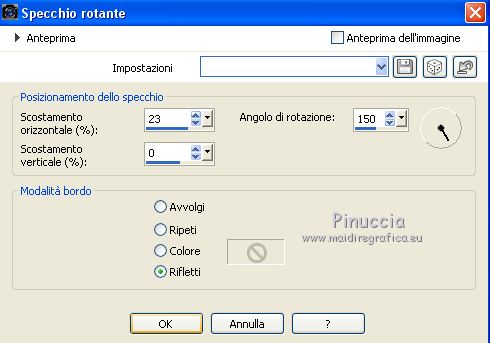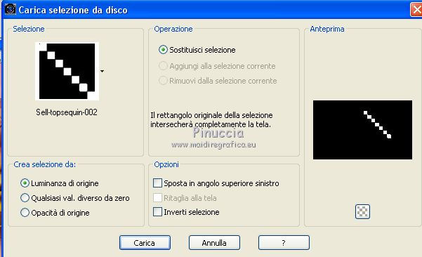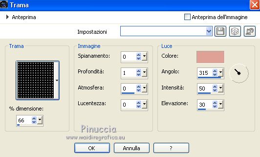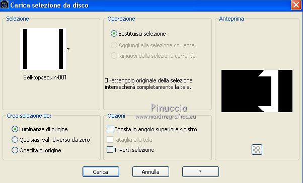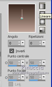 qui puoi trovare qualche risposta ai tuoi dubbi. Se l'argomento che ti interessa non è presente, ti prego di segnalarmelo. Questo tutorial è stato tradotto con CorelX7 e CorelX2, ma può essere realizzato anche con le altre versioni di PSP. Dalla versione X4, il comando Immagine>Rifletti è stato sostituito con Immagine>Capovolgi in orizzontale, e il comando Immagine>Capovolgi con Immagine>Capovolgi in verticale. Nelle versioni X5 e X6, le funzioni sono state migliorate rendendo disponibile il menu Oggetti. Con la nuova versione X7, sono tornati Rifletti>Capovolgi, ma con nuove varianti. Vedi la scheda sull'argomento qui traduzione in francese/traduction en français qui/ici Versioni/Versions quiOccorrente: Materiale qui Per il tube grazie Luz Cristina (4808-luzcristina) (in questa pagina trovi i links ai siti dei creatori di tubes) Filtri: se hai problemi con i filtri, consulta la mia sezione filtri qui Filters Unlimited 2.0 qui RCS Filter Pak 1.0 - RCS Sequins qui Mura's Meister - Copies qui L&K's - L&K's Jeffrey qui Nik Software - Color Efex Pro qui Simple - Pizza Slice Mirror qui I filtri RCS e Simple si possono usare da soli o importati in Filters Unlimited (come fare vedi qui) Se un filtro fornito appare con questa icona ![]() non esitare a cambiare modalità di miscelatura e opacità secondo i colori utilizzati. Nelle ultime versioni di PSP non c'è il gradiente di primo piano/sfondo (Corel_06_029) Puoi usare i gradienti delle versioni precedenti. Trovi qui i gradienti Corel X. La trama Corel_15_006 (o Griglia nelle versioni precedenti) è standard in PSP. Se non la trovi nel tuo PSP, metti quella fornita nella cartella Selezioni. Metti le selezioni nella cartella Selezioni. 1. Apri una nuova immagine trasparente 1000 x 600 pixels. Imposta il colore di primo piano con il colore scuro #3b261f, e il colore di sfondo con il colore chiaro #c1a699. ![]() Passa il colore di primo piano a Gradiente di primo piano/sfondo, stile Lineare. ![]() Riempi l'immagine trasparente con il gradiente.2. Effetti>Plugins>Mura's Meister - Copies. ![]() Effetti>Effetti di bordo>Aumenta. 3. Effetti>Effetti di riflesso>Specchio rotante. ![]() 4. Effetti>Plugins>Filters Unlimited 2.0 - Simple - Pizza Slice Mirror. ![]() 5. Selezione>Carica/Salva selezione>Carica selezione da disco. Cerca e carica la selezione Sell-topsequin-001. ![]() Selezione>Innalza selezione a livello. Selezione>Deseleziona. 6. Effetti>Plugins>L&K's - L&K's Jeffrey ![]() Effetti>Effetti di bordo>Aumenta. Livelli>Unisci>Unisci giù. 7. Effetti>Plugins>Filters Unlimited 2.0 - RCS Filter Pak 1_0 - RCS Sequins 11. ![]() Effetti>Effetti di bordo>Aumenta. Livelli>Duplica. 8. Effetti>Plugins>Nik Software - Color Efex Pro Bi-Color Filters - a destra seleziona Color Set Violet/Pink 3. ![]() Cambia la modalità di miscelatura di questo livello in Luce netta. 9. Apri il tube 4808-luzcristina e vai a Modifica>Copia. Torna al tuo lavoro e vai a Modifica>Incolla come nuovo livello. Immagine>Ridimensiona, al 75%, tutti i livelli non selezionato. Sposta il tube a sinistra.![]() 10. Selezione>Carica/Salva selezione>Carica selezione da disco. Cerca e carica la selezione Sell-topsequin-002. ![]() Imposta il colore di primo piano con il colore bianco #ffffff. Livelli>Nuovo livello raster. Riempi la selezione con il colore bianco.Selezione>Deseleziona. 11. Effetti>Effetti di trama>Trama - seleziona la trama Griglia o Corel_15_006, colore #dfa196. ![]() 12. Selezione>Carica/Salva selezione>Carica selezione da disco. Cerca e carica la selezione Sell-topsequin-003. ![]() 13. Livelli>Nuovo livello raster. Riempi la selezione con il colore bianco.Selezione>Deseleziona. 14. Effetti>Effetti di trama>Trama, con i settaggi precedenti. ![]() 15. Livelli>Duplica. Immagine>Rifletti. 16. Selezione>Carica/Salva selezione>Carica selezione da disco. Cerca e carica la selezione Sell-topsequin-004. ![]() Premi sulla tastiera il tasto CANC ![]() Selezione>Deseleziona. 17. Immagine>Aggiungi bordatura, 1 pixel, simmetriche, colore scuro #3b261f. Immagine>Aggiungi bordatura, 25 pixels, simmetriche, colore bianco. Immagine>Aggiungi bordatura, 1 pixel, simmetriche, colore scuro #3b261f. Firma il tuo lavoro e salva in formato jpg. Versioni con tubes di Gabry ![]() ![]() ![]() Puoi scrivermi se hai problemi o dubbi, o trovi un link che non funziona, o soltanto per un saluto. 15 Gennaio 2021 |