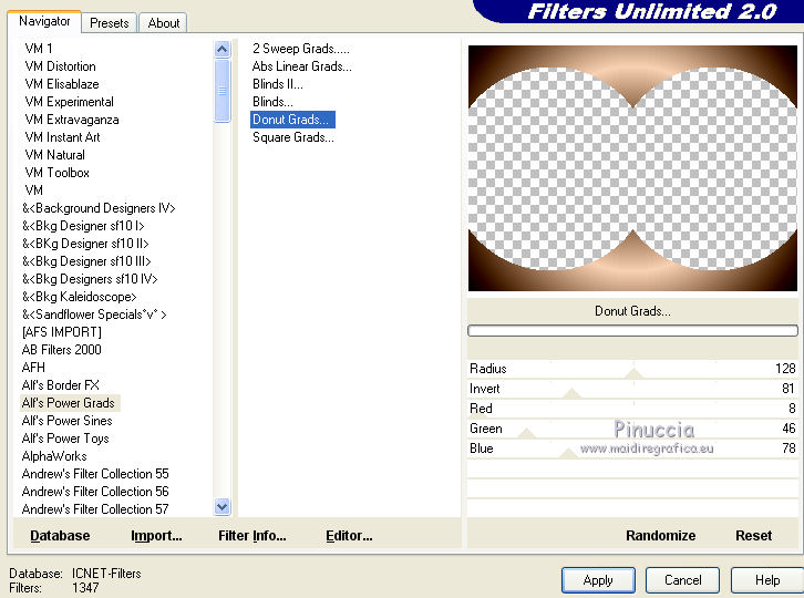 Effetti>Plugins>Filters Unlimited 2.0 - Alf's Power Grads - Donut Grads, con i settaggi standard.