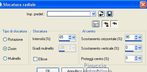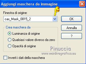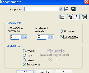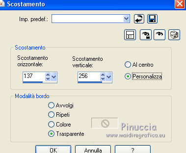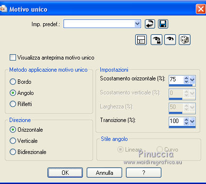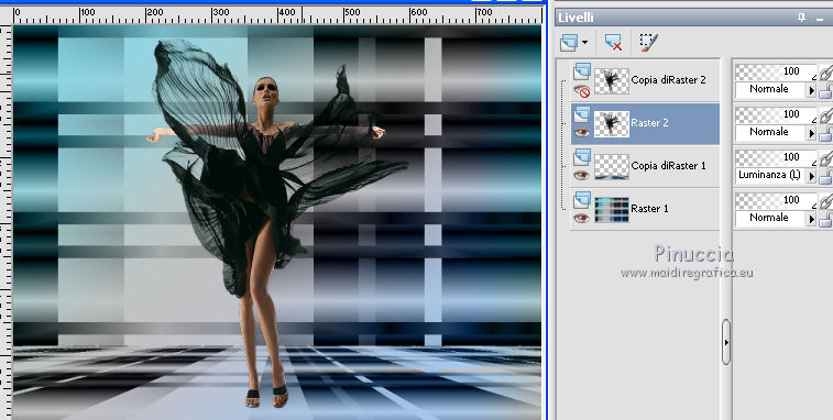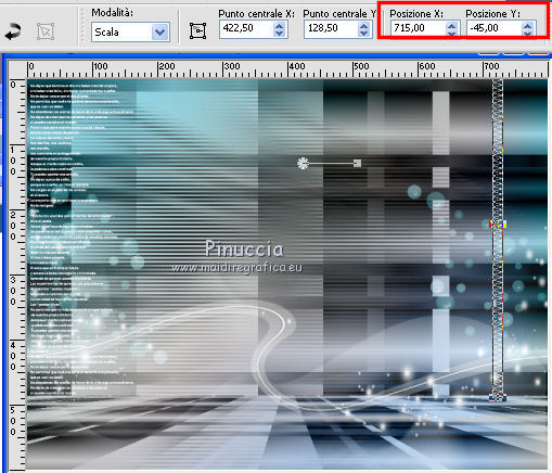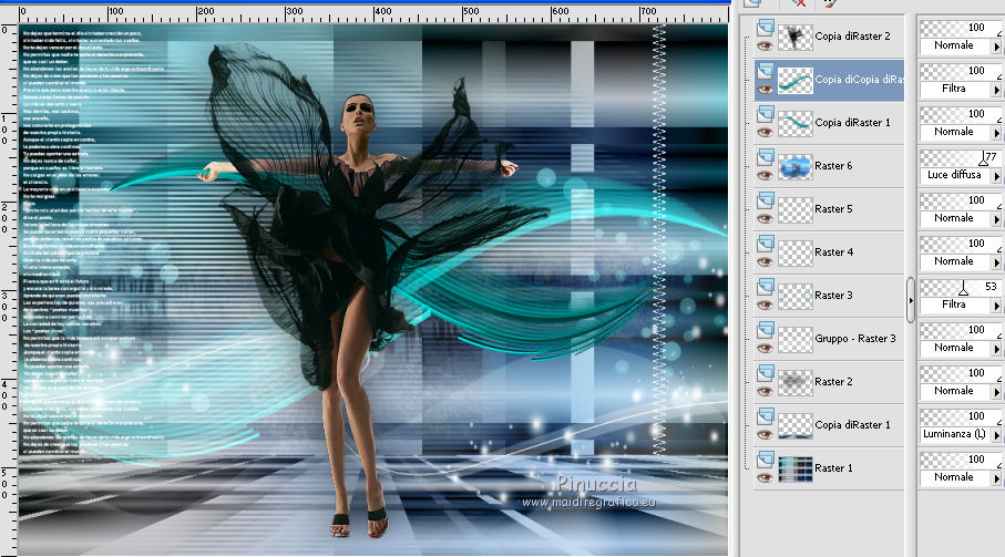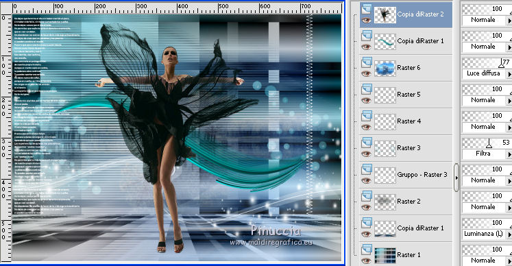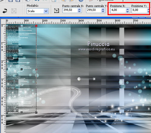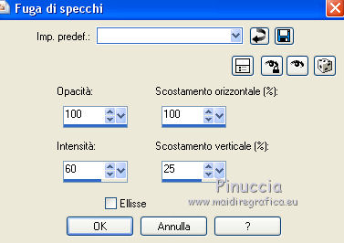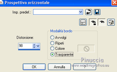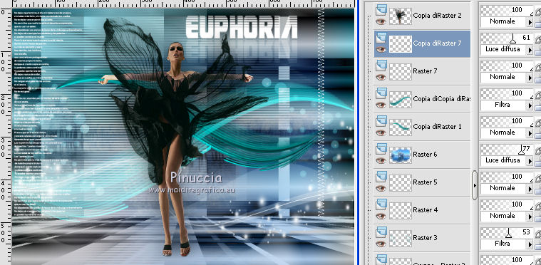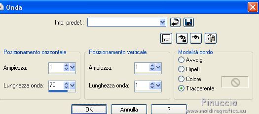 qui puoi trovare qualche risposta ai tuoi dubbi. Se l'argomento che ti interessa non è presente, ti prego di segnalarmelo. Questo tutorial è stato creato con Corel X6 e tradotto con CorelX6 e CorelX7, ma può essere realizzato anche con le altre versioni di PSP. Dalla versione X4, il comando Immagine>Rifletti è stato sostituito con Immagine>Capovolgi in orizzontale, e il comando Immagine>Capovolgi con Immagine>Capovolgi in verticale. Nelle versioni X5 e X6, le funzioni sono state migliorate rendendo disponibile il menu Oggetti. Con la versione X7 sono tornati i comandi Immagine>Rifletti e Immagine>Capovolgi, ma con nuove funzioni. Vedi la scheda sull'argomento qui traduzione in francese qui Le vostre versioni qui Occorrente: Materiale qui Tubes: Feel The Breeze_LR-11-10-09.pspimage di Lori Rhae, 04 0_861ef_e34b483_L.png misted Kamil-192.png maschera cas_Mask_0815_2.jpg Il resto del materiale è di Misae. (in questa pagina trovi i links ai loro siti). Plugins: Filters Unlimited 2.0 qui VM Instant Art - Wired qui VM Extravaganza - Transmission qui Mehdi - Wavy Lab 1.1 qui Mura's Meister - Perspective Tiling qui Mura's Meister - Copies qui Freeware Filters - Rot Blender qui Ap 01 [Innovations] - Wavy Cut qui I filtri VM Instant Art, VM Extravaganza e Freeware si possono usare da soli o importati in Filters Unlimited (come fare vedi qui) Se un filtro fornito appare con questa icona ![]() Se vuoi usare altri colori, non esitare a cambiare le modalità di miscelatura e l'opacità dei livelli. Metti la selezione nella cartella Selezioni. Apri la maschera in PSP e minimizzala con il resto del materiale. Colori utilizzati ![]() 1. Apri una nuova immagine trasparente 800 x 600 pixels. 2. Imposta il colore di primo piano con #6f91b4, e il colore di sfondo con #448b9a. ![]() 3. Effetti>Plugins>Mehdi - Wavy Lab 1.1 questo filtro crea gradienti con i colori della paletta: il primo è il colore di sfondo, il secondo quello di primo piano; cambia gli ultimi due colori creati dal filtro con il colore bianco #ffffff. ![]() 4. Livelli>Duplica. 5. Effetti>Plugins>VM Instant Art - Wired. ![]() 6. Cambia la modalità di miscelatura di questo livello in Luminanza (esistente). 7. Livelli>Unisci>Unisci giù. 8. Effetti>Effetti di immagine>Motivo unico. ![]() 9. Livelli>Duplica. 10. Effetti>Plugins>Mura's Meister - Perspective Tiling. ![]() 11. Cambia la modalità di miscelatura di questo livello in Luminanza (esistente). 12. Apri il tube Feel The Breeze_LR-11-10-09.pspimage e vai a Modifica>Copia. Torna al tuo lavoro e vai a Modifica>Incolla come nuovo livello. Immagine>Ridimensiona, al 50%, tutti i livelli non selezionato. Regola>Messa a fuoco>Metti a fuoco. 13. Livelli>Duplica. Chiudi questo livello e attiva il livello sottostante, Raster 2. ![]() 14. Regola>Sfocatura>Sfocatura radiale. ![]() 15. Effetti>Plugins>VM Extravaganza - Transmission. ![]() attenzione, l'effetto Transmission si trova anche nel filtro Visual Manipulation. Se non lo vedi nella lista del tuo VM Extravaganza, è probabile che Visual Manipulation sia stato aggiunto ai Percorsi Files prima di questo filtro. Secondo la versione utilizzata, il primo dei filtri inserito impedisce di vedere l'effetto nel secondo filtro. Per utilizzarlo, devi togliere Visual Manipulation dai Percorsi Files, oppure applicarlo in Unlimited 16. Livelli>Nuovo livello raster. Imposta il colore di primo piano con il colore bianco. Riempi il livello con il colore bianco #ffffff.17. Livelli>Nuovo livello maschera>Da immagine. Apri il menu sotto la finestra di origine e vedrai la lista dei files aperti. Seleziona la maschera cas_Mask_0815_2.jpg. ![]() Livelli>Unisci>Unisci gruppo. 18. Apri il tube 04 0_861ef_e34b483_L.png e vai a Modifica>Copia. Torna al tuo lavoro e vai a Modifica>Incolla come nuovo livello. Immagine>Ridimensiona, al 55%, tutti i livelli non selezionato. Oggetti>Allinea>Sinistra Se stai lavorando con una versione precedente che non dispone del menu Oggetti, usa lo strumento Spostamento per spostare il tube a sinistra.![]() 19. Livelli>Duplica. Immagine>Rifletti. Immagine>Capovolgi. Livelli>Unisci>Unisci giù. 20. Cambia la modalità di miscelatura di questo livello in Filtra, e abbassa l'opacità al 53%. ![]() 21. Apri il testo Texto.Euphoria.pspimage e vai a Modifica>Copia. Torna al tuo lavoro e vai a Modifica>Incolla come nuovo livello. 22. Per posizionare il testo: tasto K per attivare lo strumento Puntatore ![]() e in modalità Scala ![]() imposta Posizione X: 4,00 e Posizione Y: 8,00 ![]() 23. Livelli>Nuovo livello raster. Selezione>Carica/Salva selezione>Carica selezione da disco. Cerca e carica la selezione Euphoria.Seleccion.PspSelection. ![]() Riempi la selezione con il colore bianco di primo piano.Selezione>Deseleziona. 24. Effetti>Effetti di distorsione>Onda. ![]() 25. Immagine>Ruota per gradi - 90 gradi a destra. ![]() 26. Strumento Puntatore ![]() e imposta Posizione X: 715,00 e Posizione Y: -45,00 ![]() 27. Livelli>Nuovo livello raster. Selezione>Seleziona tutto. 28. Apri il misted Kamil-192.png e vai a Modifica>Copia. Torna al tuo lavoro e vai a Modifica>Incolla nella selezione. Selezione>Deseleziona. 29. Cambia la modalità di miscelatura di questo livello in Luce diffusa, e abbassa l'opacità al 77%. 30. Attiva il livello Raster 1. ![]() 31. Livelli>Duplica. Livelli>Disponi>Porta in alto. 32. Effetti>Plugins>Freeware Filters - Rot Blender (puoi cambiare il colore, in base ai tuoi colori) ![]() 33. Effetti>Effetti geometrici>Prospettiva orizzontale. ![]() 34. Immagine>Rifletti. 35. Ripeti Effetti>Effetti geometrici>Prospettiva orizzontale, con gli stessi settaggi. 36. Effetti>Effetti di riflesso>Fuga di specchi. ![]() 37. Effetti>Effetti geometrici>Cerchio. ![]() 38. Effetti>Effetti di distorsione>Onda. ![]() 39. Effetti>Plugins>Mura's Meister - Copies. ![]() 40. Livelli>Disponi>Sposta giù. 41. Riapri e attiva il livello del tube, Copia di Raster 2. ![]() 42. Effetti>Effetti 3D>Sfalsa ombra. ![]() 43. Attiva il livello sottostante, C