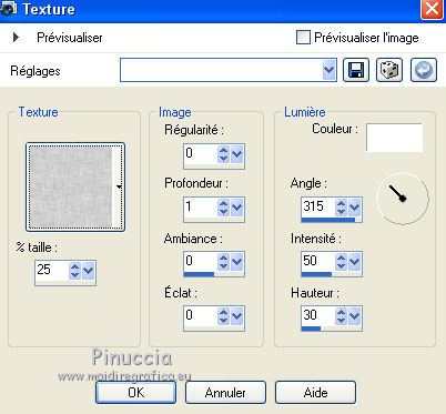 Effets>Effets de textures>Texture, sélectionner la texture Support fin (Corel_15_021), ou une texture pareille à choix.