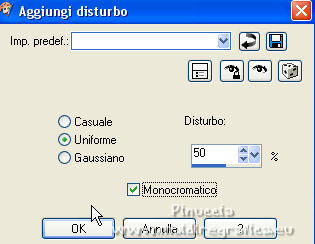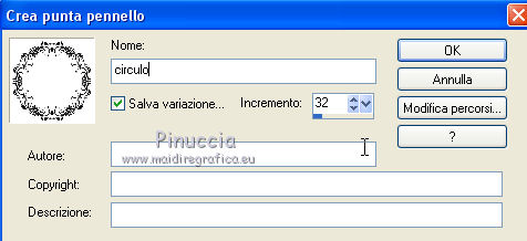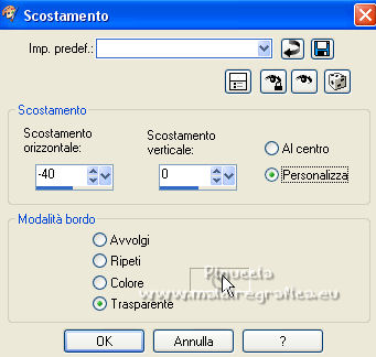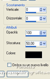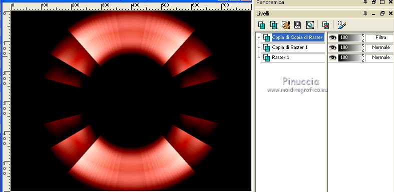 qui puoi trovare qualche risposta ai tuoi dubbi. Se l'argomento che ti interessa non è presente, ti prego di segnalarmelo. Questo tutorial è stato creato con Corel X6 e tradotto con CorelX e CorelX7, ma può essere realizzato anche con le altre versioni di PSP. Dalla versione X4, il comando Immagine>Rifletti è stato sostituito con Immagine>Capovolgi in orizzontale, e il comando Immagine>Capovolgi con Immagine>Capovolgi in verticale. Nelle versioni X5 e X6, le funzioni sono state migliorate rendendo disponibile il menu Oggetti. Con la versione X7 sono tornati i comandi Immagine>Rifletti e Immagine>Capovolgi, ma con nuove funzioni. Vedi la scheda sull'argomento qui traduzione in francese quiLe vostre versioni qui Occorrente: Materiale qui Per il tube utilizzato grazie Suizabella (SuizaBella_Ref_AG-00856.pspimage) (in questa pagina trovi i links ai loro siti). Filtri in caso di dubbi, ricorda di consultare la mia sezione filtri qui In questo tutorial si lavora con il filtro it@lian Editors Generatore. Questo filtro è composto da 24 motivi che apportano figure differenti ai lavori. I filtri it@lian Editors Generatore si possono usare da soli o importati in Filters Unlimited (come fare vedi qui) Filters Unlimited 2.0 qui it@lian Editors Generatore qui ![]() Se vuoi usare altri colori, non esitare a cambiare le modalità di miscelatura e l'opacità dei livelli. 1. Apri una nuova immagine trasparente 800 x 600 pixels. 2. Imposta il colore di primo piano con il colore nero #000000. Riempi l'immagine trasparente con il colore nero.3. Livelli>Duplica. 4. Effetti>Plugins>It@lian Editors Generatore - Pattern Piramide. ![]() i settaggi standard creano una figura di colore rosso. Se stai usando altri colori, sperimenta i settaggi Rosso/Verde/Blue. 5. Attiva lo strumento Selezione ![]() (non importa il tipo di selezione impostato, perchè con la selezione personalizzata si ottiene sempre un rettangolo) clicca sull'icona Selezione personalizzata ![]() e imposta i seguenti settaggi. ![]() Premi CANC sulla tastiera ![]() Selezione>Deseleziona. 6. Livelli>Duplica. Image>Capovolgi. Livelli>Unisci>Unisci giù. 7. Livelli>Duplica. Immagine>Ridimensiona, all'80%, tutti i livelli non selezionato. Cambia la modalità di miscelatura di questo livello in Filtra. ![]() 8. Livelli>Unisci>Unisci visibile. 9. Imposta il colore di primo piano con il colore #cf3730. 10. Apri il pennello Circulo.PspBrush. File>Esporta>Pennello personalizzato, assegna un nome al pennello e ok. ![]() Attiva lo strumento Pennello ![]() e seleziona il pennello che hai appena esportato ![]() Livelli>Nuovo livello raster. Applica il pennello al centro della figura, cliccando con il tasto sinistro del mouse, per usare il colore rosso di primo piano. ![]() 11. Attiva lo strumento Penna con i seguenti settaggi:![]() Traccia una linea verticale, partendo da 150 x 650 pixels ![]() fino a 450 pixels, pressappoco come nell'esempio. (se non vedi i righelli, vai a Visualizza>Righelli) ![]() 12. Livelli>Converti in livello raster. 13. Effetti>Effetti di distorsione>Onda. ![]() 14. Immagine>Ridimensiona, al 125%, tutti i livelli non selezionato. Regola>Messa a fuoco>Metti a fuoco. 15. Effetti>Effetti di immagine>Scostamento. ![]() 16. Livelli>Duplica. Immagine>Rifletti. 16. Apri il tube Botón.pspimage e vai a Modifica>Copia. Torna al tuo lavoro e vai a Modifica>Incolla come nuovo livello. 17. Effetti>Effetti di immagine>Scostamento. ![]() 18. Livelli>Duplica. Immagine>Rifletti. 19. Immagine>Aggiungi bordatura, 1 pixel, simmetriche, colore di primo piano. Immagine>Aggiungi bordatura, 15 pixels, simmetriche, colore nero #000000. Immagine>Aggiungi bordatura, 8 pixels, simmetriche, colore di primo piano. 20. Attiva lo strumento Bacchetta magica ![]() e clicca nel bordo di 8 pixels per selezionarlo. 21. Regola>Aggiungi/Rimuovi disturbo>Aggiungi disturbo. ![]() Selezione>Deseleziona. 22. Immagine>Aggiungi bordatura, 15 pixels, simmetriche, colore nero #000000. Immagine>Aggiungi bordatura, 1 pixel, simmetriche, colore di primo piano. Immagine>Aggiungi bordatura, 35 pixels, simmetriche, colore nero #000000. Immagine>Aggiungi bordatura, 1 pixel, simmetriche, colore di primo piano. 23. Apri il tube SuizaBella_Ref_AG-00856.pspimage e vai a Modifica>Copia. Torna al tuo lavoro e vai a Modifica>Incolla come nuovo livello. Immagine>Ridimensiona, al 55%, tutti i livelli non selezionato. Regola>Messa a fuoco>Metti a fuoco. 24. Effetti>Effetti di immagine>Scostamento. ![]() 25. Effetti>Effetti 3D>Sfalsa ombra. ![]() 26. Firma il tuo lavoro su un nuovo livello. Livelli>Unisci>Unisci tutto e salva in formato jpg. Versione con tube di Beatriz ![]() Le vostre versioni qui ![]() Puoi scrivermi se hai problemi o dubbi, o trovi un link che non funziona, o soltanto per un saluto. 12 Novembre 2019