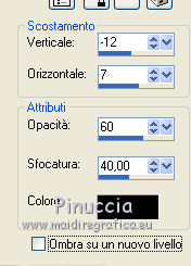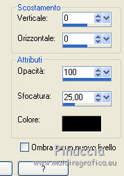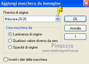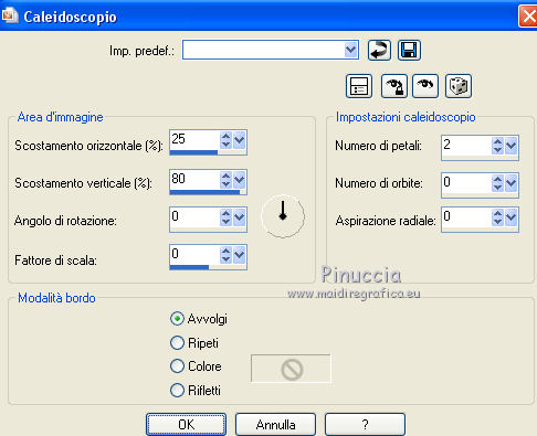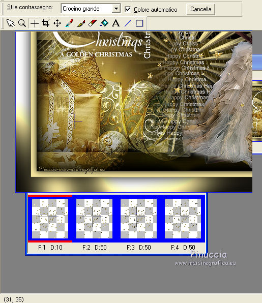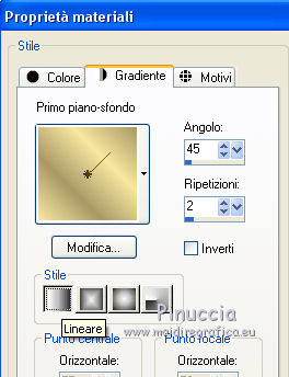 qui puoi trovare qualche risposta ai tuoi dubbi. Se l'argomento che ti interessa non è presente, ti prego di segnalarmelo. Questo tutorial è stato creato con Corel X6 e tradotto con CorelX, ma può essere realizzato anche con le altre versioni di PSP. Dalla versione X4, il comando Immagine>Rifletti è stato sostituito con Immagine>Capovolgi in orizzontale, e il comando Immagine>Capovolgi con Immagine>Capovolgi in verticale. Nelle versioni X5 e X6, le funzioni sono state migliorate rendendo disponibile il menu Oggetti. Con la versione X7 sono tornati i comandi Immagine>Rifletti e Immagine>Capovolgi, ma con nuove funzioni. Vedi la scheda sull'argomento qui traduzione in francese qui Le vostre versioni qui ![]() Occorrente: Materiale qui tube2215_mulher_mara_pontes.pspimage, _aOhPk1e6_Ywc8fcN-5Y34qGotI.pspimage, 0_b7c1e_dbc57b03_L.pspimage, Célébration - CR = PubliKado (9).pspimage misted chouchoucats82-s tubes_deco noel016_janvier_20.pspimage Maschera 20-20. Il resto del materiale è di Misae. Plugins: Filters Unlimited 2.0 qui Toadies - Metalfalls II qui Graphics Plus - Cross Shadow qui Alien Skin Eye Candy 5 Impact - Chrome qui &<Bkg Designer sf10III> - VME Shoutin (da importare in Unlimited) qui I filtri Toadies e Graphics Plus si possono usare da soli o importati in Filters Unlimited (come fare vedi qui) Se un filtro fornito appare con questa icona Animation Shop qui ![]() Se vuoi usare altri colori, non esitare a cambiare le modalità di miscelatura e l'opacità dei livelli. Nelle ultime versioni di PSP non c'è il gradiente di primo piano/sfondo (Corel_06_029) Puoi usare i gradienti delle versioni precedenti. Trovi qui i gradienti Corel X. Apri la maschera in PSP e minimizzala con il resto del materiale. Colori utilizzati ![]() 1. Apri una nuova immagine trasparente 800 x 600 pixels. 2. Imposta il colore di primo piano con #f7d79f, e il colore di sfondo con #a99967. ![]() 3. Passa il colore di primo piano a Gradiente di primo piano/sfondo, stile Lineare. ![]() 4. Riempi l'immagine trasparente con il gradiente.5. Livelli>Duplica. 6. Effetti>Plugins>Toadies - Metalfalls II. ![]() 7. Cambia la modalità di miscelatura di questo livello in Luminanza (esistente). 8. Livelli>Unisci>Unisci visibile. 9. Effetti>Effetti di riflesso>Caleidoscopio. ![]() 10. Effetti>Effetti di immagine>Motivo unico. ![]() 11. Per eliminare questa piccola linea ![]() Immagine>Ridimensiona, al 103%, tutti i livelli non selezionato. ![]() 12. Apri il tube Célébration - CR = PubliKado (9).pspimage, e vai a Modifica>Copia. Torna al tuo lavoro e vai a Modifica>Incolla come nuovo livello. 13. Cambia la modalità di miscelatura di questo livello in Filtra. 14. Livelli>Nuovo livello raster. Riempi con il gradiente.15. Effetti>Plugins>Filters Unlimited 2.0 - &<Bkg Designer sf10III> - VME Shoutin! ![]() 16. Effetti>Effetti di distorsione>Coordinate polari. ![]() 17. Effetti>Plugins>Alien Skin Eye Candy 5 Impact - Chrome. ![]() 18. Effetti>Effetti 3D>Sfalsa ombra. ![]() 19. Apri il tube _aOhPk1e6_Ywc8fcN-5Y34qGotI.pspimage e vai a Modifica>Copia. Torna al tuo lavoro e vai a Modifica>Incolla come nuovo livello. 20. Apri il tube chouchoucats82-s tubes_deco noel016_janvier_20.pspimage. Su questo tube: Livelli>Nuovo livello maschera>Da immagine, apri il menu sotto la finestra di origine e vedrai la lista dei files aperti. Seleziona la maschera 20-20. ![]() Livelli>Unisci>Unisci gruppo. Modifica>Copia. 21. Torna al tuo lavoro e vai a Modifica>Incolla come nuovo livello. Immagine>Rifletti. Immagine>Ridimensiona, all'80%, tutti i livelli non selezionato. Regola>Messa a fuoco>Metti a fuoco. 22. Effetti>Effetti di immagine>Scostamento. ![]() 23. Apri il tube tube2215_mulher_mara_pontes.pspimage e vai a Modifica>Copia. Torna al tuo lavoro e vai a Modifica>Incolla come nuovo livello. Immagine>Ridimensiona, al 90%, tutti i livelli non selezionato. Regola>Messa a fuoco>Metti a fuoco. 24. Effetti>Effetti di immagine>Scostamento. ![]() 25. Effetti>Effetti 3D>Sfalsa ombra, con i settaggi precedenti. 26. Apri il tube 0_b7c1e_dbc57b03_L.pspimage e vai a Modifica>Copia. Torna al tuo lavoro e vai a Modifica>Incolla come nuovo livello. 27. Apri il tube Misae.A Golden Chritmas.Texto.pspimage e vai a Modifica>Copia. Torna al tuo lavoro e vai a Modifica>Incolla come nuovo livello. 28. Effetti>Effetti di immagine>Scostamento. ![]() 29. Immagine>Aggiungi bordatura, 1 pixel, simmetriche, colore di sfondo. Immagine>Aggiungi bordatura, 15 pixels, simmetriche, colore di primo piano. 30. Attiva lo strumento Bacchetta magica ![]() ![]() Clicca nel bordo da 15 pixels per selezionarlo. 31. Selezione>Inverti. Effetti>Effetti 3D>Ritaglio. ![]() Modifica>Ripeti Ritaglio. 32. Effetti>Effetti 3D>Sfalsa ombra. ![]() Selezione>Deseleziona. 33. immagine>Aggiungi bordatura, 1 pixel, simmetriche, colore di sfondo. Immagine>Aggiungi bordatura, 40 pixels, simmetriche, colore di primo piano. 34. Seleziona il bordo da 40 pixels con la bacchetta magica ![]() 35. Effetti>Plugins>Graphics Plus - Cross Shadow, 2 volte con i settaggi standard. ![]() 36. Selezione>Inverti. 37. Effetti>Effetti 3D>Sfalsa ombra. ![]() 38. Immagine>Aggiungi bordatura, 1 pixel, simmetriche, colore di sfondo. Selezione>Deseleziona. 39. Firma il tuo lavoro e salva in formato jpg. Animazione 1. Modifica>Copia. Apri Animation Shop e vai a Modifica>Incolla>Incolla come nuova animazione. 2. Modifica>Duplica e ripeti per avere un'animazione composta da 4 fotogrammi. Clicca sul primo fotogramma per selezionarlo e vai a Modifica>Seleziona tutto. 3. Apri l'animazione Brillos dorados, anche questa composta da 4 fotogrammi. Modifica>Seleziona tutto. ![]() 4. Clicca sul crocino di registrazione per attivarlo e poi al centro della gif e nel punto del tuo lavoro in cui vuoi applicare la gif. ![]() 5. Clicca sulla freccia bianca e trascina il crocino sul tuo lavoro![]() La gif in questo modo si svuoterà. 6. Clicca su Modifica>Annulla Trascina e potrai ripetere l'operazione per aggiungere quante volte vorra
