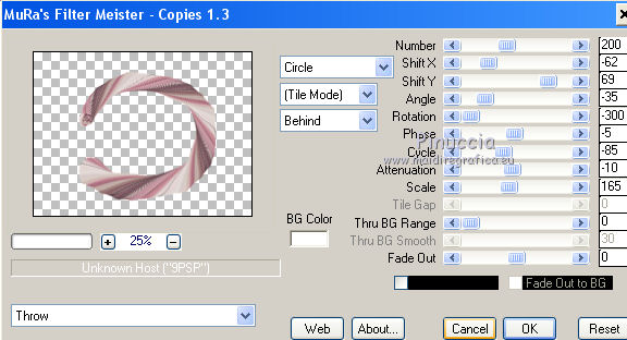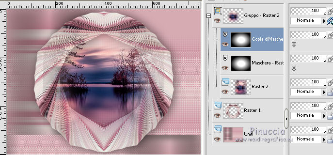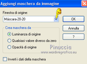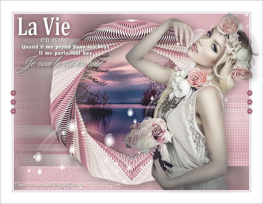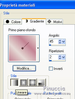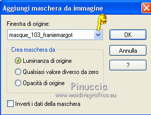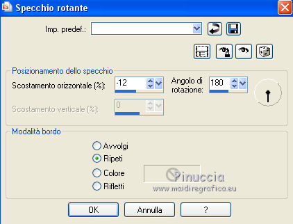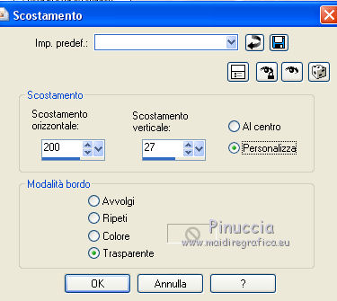 qui puoi trovare qualche risposta ai tuoi dubbi. Se l'argomento che ti interessa non è presente, ti prego di segnalarmelo. Questo tutorial è stato creato con CorelX6 e tradotto con CorelX, ma può essere realizzato anche con le altre versioni di PSP. Dalla versione X4, il comando Immagine>Rifletti è stato sostituito con Immagine>Capovolgi in orizzontale, e il comando Immagine>Capovolgi con Immagine>Capovolgi in verticale. Nelle versioni X5 e X6, le funzioni sono state migliorate rendendo disponibile il menu Oggetti. Con la versione X7 sono tornati i comandi Immagine>Rifletti e Immagine>Capovolgi, ma con nuove funzioni. Vedi la scheda sull'argomento qui traduzione in francese qui Le vostre versioni qui Occorrente: Materiale qui Grazie per il tube della donna Danimage, per il paesaggio Gabry, e per la maschera FranieMargot. Il resto del materiale è di Misae Filtri in caso di dubbi, ricorda di consultare la mia sezione filtri qui Filters Unlimited 2.0 qui Filter Factory Gallery F - Bubble Distort qui Tramages - Perforator 1 qui Mura's Meister - Copies qui Backgroundmaniac - Coarsed Embroidery qui I filtri Simple e VM Natural si possono usare da soli o importati in Filters Unlimited (come fare vedi qui) Se un filtro fornito appare con questa icona ![]() Se non vuoi sentire la musica, premi il tasto ESC Se vuoi usare altri colori, non esitare a cambiare le modalità di miscelatura e l'opacità dei livelli. Nelle ultime versioni di PSP non c'è il gradiente di primo piano/sfondo (Corel_06_029) Trovi i gradienti delle versioni precedenti qui Apri le maschere in PSP e minimizzale con il resto del materiale. 1. Apri una nuova immagine trasparente 800 x 600 pixels. 2. Imposta il colore di primo piano con #c38392, e il colore di sfondo con #e5d9d4. ![]() 3. Passa il colore di primo piano a Gradiente di primo piano/sfondo, stile Lineare. Nota Potrebbe capitare che il tuo PSP cambi l'opzione "Inverti". Per questo stai attento alla posizione del gradiente. ![]() 4. Riempi l'immagine trasparente con il gradiente.5. Effetti>Plugins>Backgroundmaniac - Coarsed Embroidery. ![]() 6. Livelli>Duplica. 7. Effetti>Plugins>Filter Factory Gallery F - Bubble Distort. ![]() 8. Effetti>Plugins>Tramages - Perforator 1. ![]() 9. Effetti>Effetti 3D>Sfalsa ombra. ![]() 10. Livelli>Unisci>Unisci visibile. 11. Apri il tube danimage alie-2-.pspimage. Modifica>Copia. Modifica>Incolla come nuova immagine e su questa immagine: attiva lo strumento Selezione a mano libera , da punto a punto,![]() e traccia una selezione intorno a una delle rose della ragazza. Non importa che il cerchio sia perfetto. Tieni presente che in base alla tua selezione, il risultato sarà differente. ![]() 12. Modifica>Copia. Torna al tuo lavoro e vai a Modifica>Incolla come nuovo livello. 13. Effetti>Plugins>Mura's Meister - Copies. ![]() 14. Immagine>Rifletti. 15. Effetti>Effetti di riflesso>Specchio rotante. ![]() 16. Immagine>Ridimensiona, al 125%, tutti i livelli non selezionato. 17. Effetti>Effetti di immagine>Scostamento. ![]() 18. Regola>Messa a fuoco>Maschera di contrasto. ![]() 19. Effetti>Effetti 3D>Sfalsa ombra. ![]() 20. Apri il tube GABRY-PAESAGGIO 112.pspimage e vai a Modifica>Copia. Torna al tuo lavoro e vai a Modifica>Incolla come nuovo livello. 21. Livelli>Nuovo livello maschera>Da immagine. Apri il menu sotto la finestra di origine e vedrai la lista dei files aperti. Seleziona la maschera 20-20. ![]() Livelli>Duplica. ![]() Livelli>Unisci>Unisci gruppo. 22. Livelli>Disponi>Sposta giù. 23. Livelli>Nuovo livello raster. Livelli>Disponi>Porta in alto. 24. Imposta il colore di primo piano con il colore bianco #ffffff. Riempi il livello con questo colore.25. Livelli>Nuovo livello maschera>Da immagine. Apri il menu sotto la finestra di origine e seleziona la maschera masque_103_franiemargot.pspimage. ![]() Livelli>Unisci>Unisci gruppo. 26. Immagine>Capovolgi. Immagine>Rifletti. 27. Apri il tube BlueMotion73.pspimage e vai a Modifica>Copia. Torna al tuo lavoro e vai a Modifica>Incolla come nuovo livello. 28. Effetti>Effetti di immagine>Scostamento. ![]() 29. Immagine>Aggiungi bordatura, 1 pixel, simmetriche, colore #c38392. Immagine>Aggiungi bordatura, 5 pixels, simmetriche, colore bianco #ffffff. Immagine>Aggiungi bordatura, 1 pixel, simmetriche, colore #c38392. Immagine>Aggiungi bordatura, 40 pixels, simmetriche, colore bianco #ffffff. Immagine>Aggiungi bordatura, 1 pixel, simmetriche, colore #c38392. 30. Apri il tube danimage alie-2-.pspimage e vai a Modifica>Copia. Torna al tuo lavoro e vai a Modifica>Incolla come nuovo livello. Immagine>ridimensiona, al 90%, tutti i livelli non selezionato. Regola>Messa a fuoco>Metti a fuoco. 31. Effetti>Effetti 3D>Sfalsa ombra. ![]() 32. Effetti>Effetti di immagine>Scostamento. ![]() 33. Apri il tube Adorno-la-vie-en-rose.pspimage e vai a Modifica>Copia. Torna al tuo lavoro e vai a Modifica>Incolla come nuovo livello. 34. Effetti>Effetti di immagine>Scostamento. ![]() 35. Livelli>Duplica. Immagine>Rifletti. 36. Apri il testo Texto-la-vie-en-rose.pspimage e vai a Modifica>Copia. Torna al tuo lavoro e vai a Modifica>Incolla come nuovo livello. 37. Effetti>Effetti di immagine>Scostamento. ![]() 38. Firma il tuo lavoro su un nuovo livello. 39. Livelli>Unisci>Unisci tutto e salva in formato jpg. I tubes di questo esempio sono di K@rine e Luna. ![]() ![]() La mia mail è nel menu in cima alla pagina. Puoi scrivermi se hai problemi o dubbi, o trovi un link che non funziona, o soltanto per un saluto. Se vorrai mandarmi la tua versione, sarò lieta di pubblicarla. 10 Agosto 2016 |