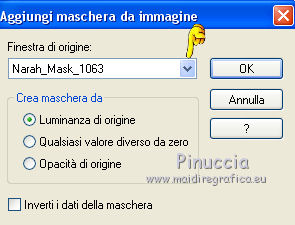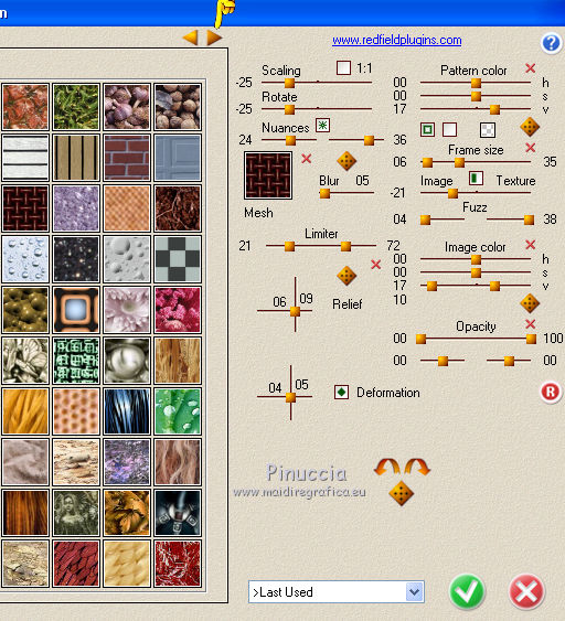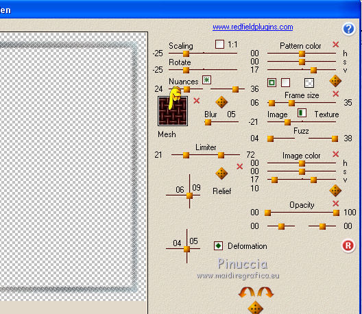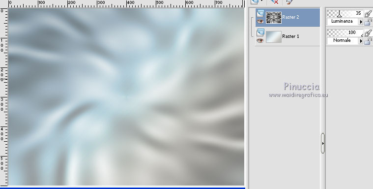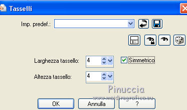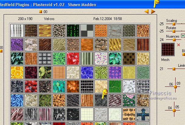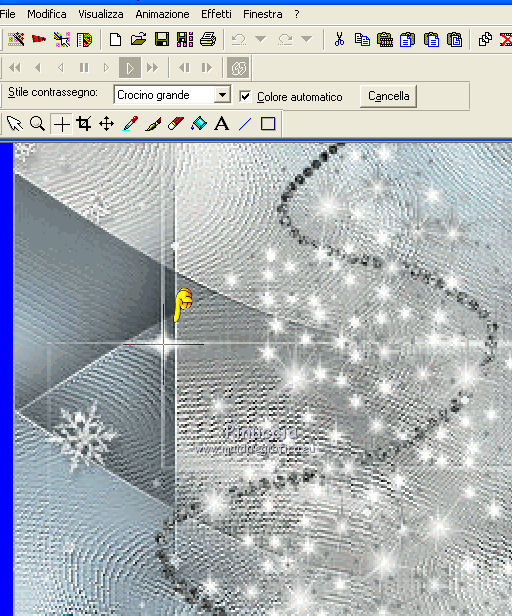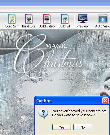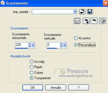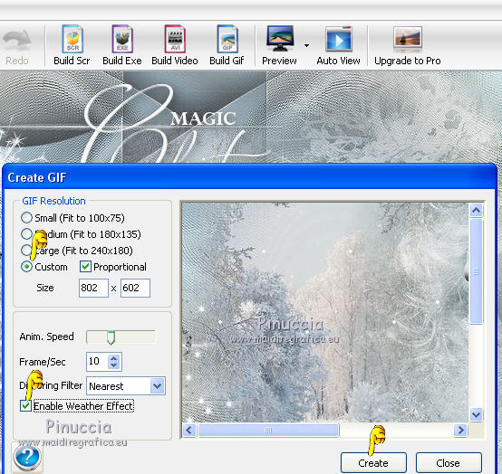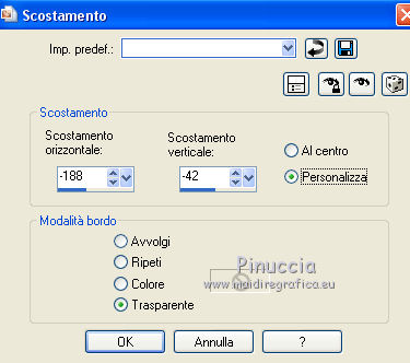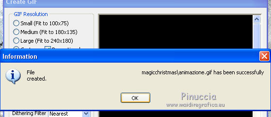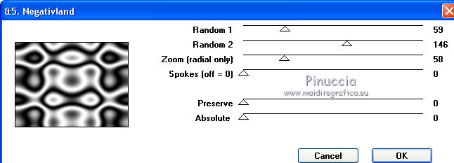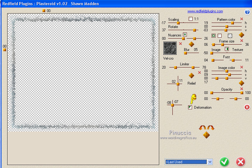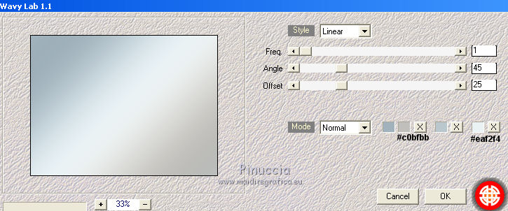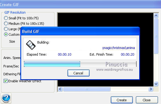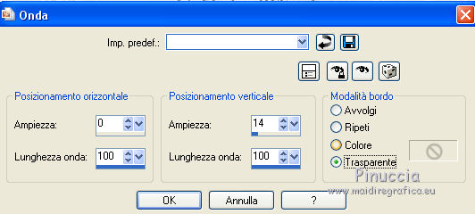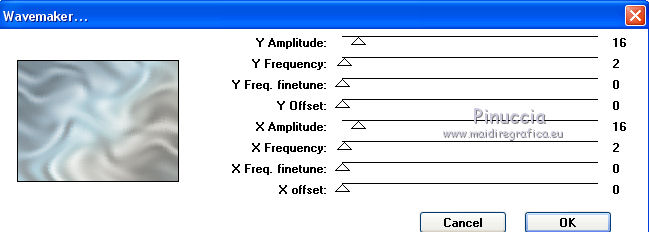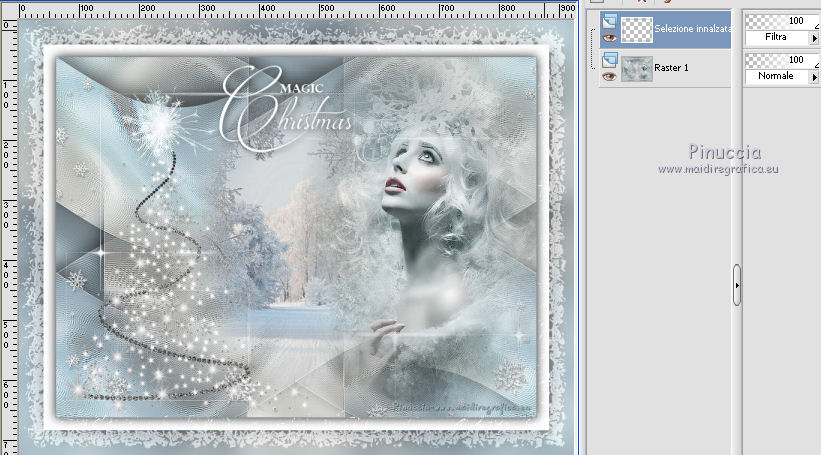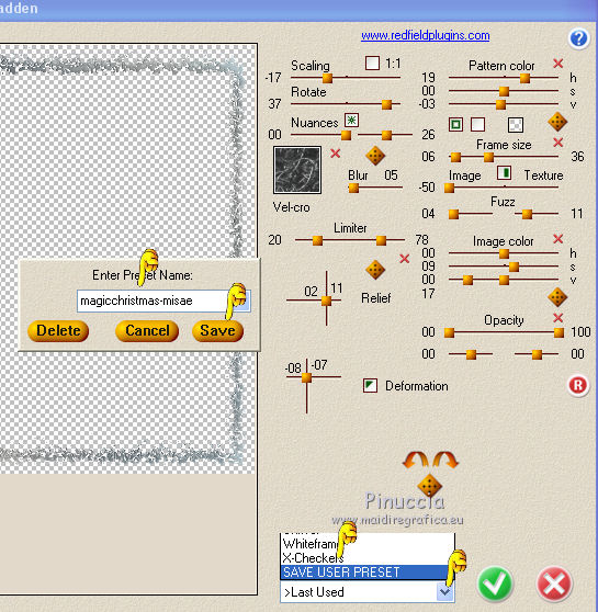 qui puoi trovare qualche risposta ai tuoi dubbi. Se l'argomento che ti interessa non è presente, ti prego di segnalarmelo. Questo tutorial è stato creato con Corel X6 e tradotto con CorelX, ma può essere realizzato anche con le altre versioni di PSP. Dalla versione X4, il comando Immagine>Rifletti è stato sostituito con Immagine>Capovolgi in orizzontale, e il comando Immagine>Capovolgi con Immagine>Capovolgi in verticale. Nelle versioni X5 e X6, le funzioni sono state migliorate rendendo disponibile il menu Oggetti. Con la versione X7 sono tornati i comandi Immagine>Rifletti e Immagine>Capovolgi, ma con nuove funzioni. Vedi la scheda sull'argomento qui traduzione in francese qui Le vostre versioni qui Occorrente: Materiale qui tubes utilizzati: misted rooskestubedesign-landschap-17.pspimage, maschera Narah_Mask_1063.pspimage de Narah tubes GlitterTree_BAC_AnotherChristmas.pspimage, IKHDesigns_WinterTale_el46.pspimage NLD Firework.pspimage. Il resto del materiale è di Misae. Plugins: Mehdi - Wavy Lab 1.1. qui Redfield/Plasteroid qui Neu qui Unplugged Tools qui I filtri Neu e Unplugged Tools si possono usare da soli o importati in Filters Unlimited (come fare vedi qui) Se un filtro fornito appare con questa icona Animation Shop qui Programma Life Photo Maker qui ![]() Se vuoi usare altri colori, non esitare a cambiare le modalità di miscelatura e l'opacità dei livelli. Apri la maschera in PSP e minimizzala con il resto del materiale. Colori utilizzati ![]() 1. Apri una nuova immagine trasparente 800 x 600 pixels. 2. Imposta il colore di primo piano con #d3dddf, e il colore di sfondo con #a1b2bc. ![]() 3. Effetti>Plugins>Mehdi - Wavy Lab 1.1 cambia il secondo colore con #c0bfbb e il quarto colore con #eaf2f4. ![]() 4. Livelli>Nuovo livello raster. 5. Effetti>Plugins>Neu! - 5.Negativland attenzione, nella lista il filtro si posiziona prima della lettera A ![]() ![]() 6. Regola>Sfocatura>Sfocatura radiale. ![]() 7. Cambia la modalità di miscelatura di questo livello in Luminanza e abbassa l'opacità al 35%. ![]() 8. Livelli>Unisci>Unisci giù. 9. Effetti>Effetti di distorsione>Tasselli ![]() 10. Effetti>Effetti di bordo>Aumenta di più. 11. Effetti>Plugins>Unplugged Tools - Wavemaker. ![]() 12. Livelli>Duplica. 13. Immagine>Ridimensiona, all'80%, tutti i livelli non selezionato. 14. Effetti>Effetti di immagine>Motivo unico, con i settaggi standard. ![]() 15. Effetti>Effetti di bordo>Aumenta. 16. Effetti>Effetti di distorsione>Onda. ![]() 17. Effetti>Effetti 3D>Sfalsa ombra. ![]() 18. Livelli>Duplica. Immagine>Rifletti. 19. Livelli>Unisci>Unisci visibile. 20. Livelli>Nuovo livello raster. 21. Imposta il colore di primo piano con il colore bianco #ffffff, e riempi il livello con il colore bianco.22. Livelli>Nuovo livello maschera>Da immagine. Apri il menu sotto la finestra di origine e vedrai la lista dei files aperti. Seleziona la maschera Narah_Mask_1063.pspimage. ![]() Livelli>Unisci>Unisci gruppo. 23. Effetti>Effetti di bordo>Aumenta. 24. Apri il tube rooskestubedesign-landschap-17.pspimage. Cancella la firma e vai a Modifica>Copia. Torna al tuo lavoro e vai a Modifica>Incolla come nuovo livello. 25. Immagine>Ridimensiona, al 75%, tutti i livelli non selezionato. Regola>Messa a fuoco>Metti a fuoco. 26. Apri IKHDesigns_WinterTale_el46.pspimage e vai a Modifica>Copia. Torna al tuo lavoro e vai a Modifica>Incolla come nuovo livello. 27. Apri GlitterTree_BAC_AnotherChristmas.pspimage e vai a Modifica>Copia. Torna al tuo lavoro e vai a Modifica>Incolla come nuovo livello. 28. Effetti>Effetti di immagine>Scostamento. ![]() 29. Regola>Tonalità e saturazione>Viraggio. ![]() 30. Apri NLD Firework.pspimage e vai a Modifica>Copia. Torna al tuo lavoro e vai a Modifica>Incolla come nuovo livello. 31. Immagine>Ridimensiona, al 55%, tutti i livelli non selezionato. 32. Effetti>Effetti di immagine>Scostamento. ![]() 33. Cambia la modalità di miscelatura di questo livello in Filtra. ![]() 34. Apri il tube Misae.Misted.42.pspimage e vai a Modifica>Copia. Torna al tuo lavoro e vai a Modifica>Incolla come nuovo livello. 35. Immagine>Ridimensiona, al 75%, tutti i livelli non selezionato. Regola>Messa a fuoco>Metti a fuoco. 36. Effetti>Effetti di immagine>Scostamento. ![]() 37. Apri il testo Misae.Texto.Magic.Christmas.pspimage e vai a Modifica>Copia. Torna al tuo lavoro e vai a Modifica>Incolla come nuovo livello. 38. Effetti>Effetti di immagine>Scostamento. ![]() 39. Firma il tuo lavoro su un nuovo livello. 40. Immagine>Aggiungi bordatura, 1 pixel, simmetriche, colore di sfondo. 41. Finestra>Duplica. Modifica>Copia e salva questa immagine come "lavoro 1". 42. Torna al tuo lavoro originale. Immagine>Aggiungi bordatura, 20 pixels, simmetriche, colore bianco #ffffff. 43. Attiva lo strumento Bacchetta magica ![]() e clicca nel bordo bianco per selezionarlo. Selezione>Inverti. 44. Effetti>Effetti 3D>Sfalsa ombra. ![]() 45. Selezione>Deseleziona. 46. Immagine>Aggiungi bordatura, 1 pixel, simmetriche, colore di sfondo. Immagine>Aggiungi bordatura, 40 pixels, simmetriche, colore bianco #ffffff. 47. Seleziona il bordo bianco con la bacchetta magica ![]() Modifica>Incolla nella selezione (l'immagine copiata al punto 41). 48. Regola>Sfocatura>Sfocatura gaussiana - raggio 15. ![]() 49. Selezione>Inverti. Effetti>Effetti 3D>Sfalsa ombra. ![]() 50. Selezione>Inverti. Selezione>Innalza selezione a livello. Selezione>Deseleziona. 51. Effetti>Plugins>Redfield - Plasteroid clicca sulla palettina del preset per aprire il menu dei preset ![]() e sulla freccia in alto per scorrere tutti i preset ![]() Seleziona il preset Vel-cro ![]() con i seguenti settaggi ![]() se vuoi salvare i settaggi per un futuro utilizzo, apri il menu in basso, clicca su SAVE USER PRESET, assegna un nome e Save. ![]() 52. Cambia la modalità di miscelatura di questo livello in Filtra. ![]() 53. Immagine>Aggiungi bordatura, 1 pixel, simmetriche, colore di sfondo. 54. Salva il lavoro in formato jpg. Animazione 1. Apri il programma Life Photo Maker