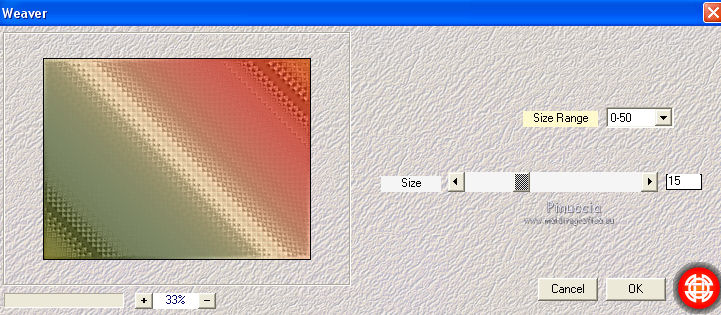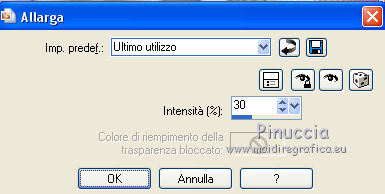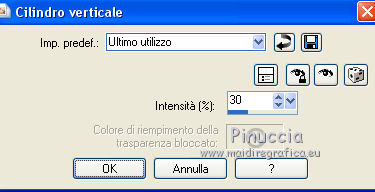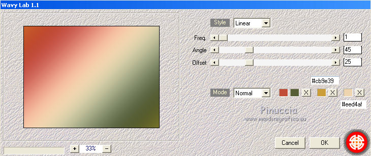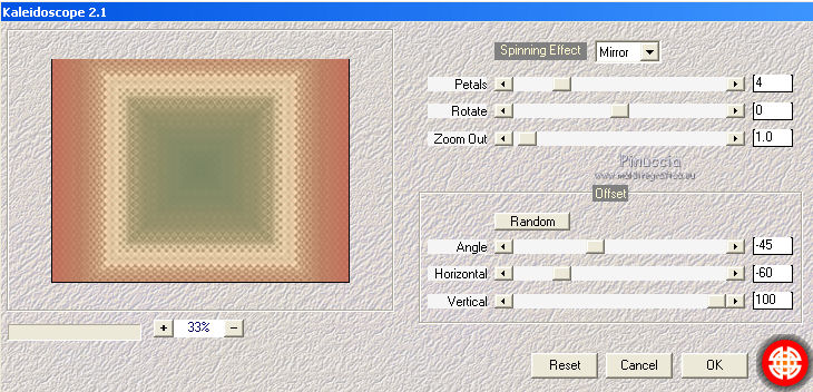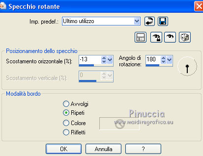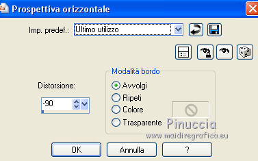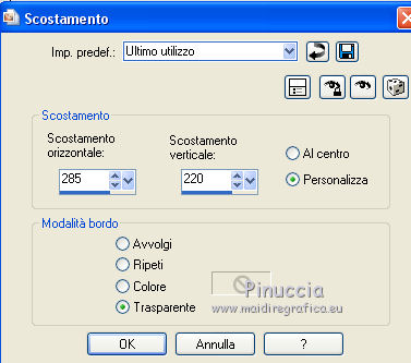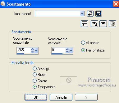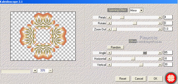 qui puoi trovare qualche risposta ai tuoi dubbi. Se l'argomento che ti interessa non è presente, ti prego di segnalarmelo. Questo tutorial è stato creato con Corel X6 e tradotto con CorelX, ma può essere realizzato anche con le altre versioni di PSP. Dalla versione X4, il comando Immagine>Rifletti è stato sostituito con Immagine>Capovolgi in orizzontale, e il comando Immagine>Capovolgi con Immagine>Capovolgi in verticale. Nelle versioni X5 e X6, le funzioni sono state migliorate rendendo disponibile il menu Oggetti. Con la versione X7 sono tornati i comandi Immagine>Rifletti e Immagine>Capovolgi, ma con nuove funzioni. Vedi la scheda sull'argomento qui traduzione in francese qui Le vostre versioni qui Occorrente: Materiale qui tubes utilizzati: MR_Miss Autumn.pspimage di Maryse; misted malackatube-oszi017_orig.pspimage di Malacka e 0_ae486_a3a1d07f_L.pspimage e 0_a8896_db02db41_L.pspimage trovati su Internet. Plugins: Mehdi qui Mehdi - Kaleidoscope 2.1 qui Mehdi - Wavy lab 1.1 qui Il filtro è composto da 26 + 3 effetti che permettono di cambiare l'aspetto di un'immagine, per realizzare effetti di caleidoscopo, distorsione, trasparenze, gradiente, disturbo, specchio e molto altro ancora. Vedi la scheda del filtro qui ![]() Se vuoi usare altri colori, non esitare a cambiare le modalità di miscelatura e l'opacità dei livelli. 1. Imposta il colore di primo piano con #575f36 e il colore di sfondo con #c14c38. ![]() Apri una nuova immagine trasparente 800 x 600 pixels. 2. Effetti>Plugins>Mehdi - Wavy Lab 1.1. questo filtro lavora con i colori della paletta: il primo è il colore di sfondo, il secondo quello di primo piano; cambia il terzo colore con #cb9e39 e il quarto con #eed4af. ![]() 3. Immagine>Rifletti. 4. Effetti>Plugins>Mehdi - Local Equilization. Questo filtro lavora senza finestra; risultato: ![]() 5. Effetti>Plugins>Mehdi - Weaver. ![]() 6. Effetti>Plugins>Mehdi - Kaleidoscope 2.1. ![]() 7. Effetti>Plugins>Mehdi - Curver. ![]() 8. Effetti>Effetti geometrici>Cilindro verticale. ![]() 9. Livelli>Duplica. 10. Immagine>Ridimensiona, al 55%, tutti i livelli non selezionato. 11. Effetti>Effetti geometrici>Prospettiva orizzontale. ![]() 12. Effetti>Effetti di distorsione>Coordinate polari. ![]() Modifica>Ripeti Coordinate polari. 13. Effetti>Effetti di riflesso>Specchio rotante. ![]() 14. Effetti>Effetti di distorsione>Stringi (nelle versioni più recenti è diventato Compressione). ![]() 15. Effetti>Plugins>Mehdi - Kaleidoscope 2.1. ![]() 16. Effetti>Effetti 3D>Sfalsa ombra. ![]() 17. Apri il tube malackatube-oszi017_orig.pspimage e vai a Modifica>Copia. Torna al tuo lavoro e vai a Modifica>Incolla come nuovo livello. 18. Immagine>Ridimensiona, al 35%, tutti i livelli non selezionato. 19. Regola>Messa a fuoco>metti a fuoco. 20. Livelli>Disponi>Sposta giù. 21. Apri il tube 0_a8896_db02db41_L.pspimage e vai a Modifica>Copia. Torna al tuo lavoro e vai a Modifica>Incolla come nuovo livello. 22. Livelli>Disponi>Porta in alto. 23. Effetti>Effetti di immagine>Scostamento. ![]() 24. Apri il tube MR_Miss Autumn.pspimage e vai a Modifica>Copia. Torna al tuo lavoro e vai a Modifica>Incolla come nuovo livello. Cancella il watermark. 25. Immagine>Ridimensiona, al 62%, tutti i livelli non selezionato. 26. Regola>Messa a fuoco>Metti a fuoco. 27. Effetti>Effetti 3D>Sfalsa ombra, con i settaggi precedenti. 28. Effetti>Effetti di immagine>Scostamento. ![]() 29. Per i bordi: imposta il colore di primo piano con #402816 e il colore di sfondo con #eed4af. ![]() Immagine>Aggiungi bordatura, 1 pixel, simmetriche, colore di primo piano #402816. 30. Modifica>Copia. 31. Immagine>Aggiungi bordatura, 6 pixels, simmetriche, colore di sfondo #eed4af. Immagine>Aggiungi bordatura, 1 pixel, simmetriche, colore di primo piano #402816. Immagine>Aggiungi bordatura, 40 pixels, simmetriche, colore di sfondo #eed4af. 32. Attiva lo strumento Bacchetta magica ![]() e clicca nel bordo da 40 pixels per selezionarlo. 33. Modifica>Incolla nella selezione. 34. Regola>Sfocatura>Sfocatura gaussiana - raggio 13. ![]() 35. Effetti>Effetti di distorsione>Allarga (nelle versioni più recenti è diventato Espansione). ![]() 36. Selezione>Deseleziona. 37. Immagine>Aggiungi bordatura, 1 pixel, simmetriche, colore di primo piano #402816. 38. Apri il tube 0_ae486_a3a1d07f_L.pspimage e vai a Modifica>Copia. Torna al tuo lavoro e vai a Modifica>Incolla come nuovo livello. 39. Effetti>Effetti di immagine>Scostamento. ![]() 40. Firma il tuo lavoro su un nuovo livello. 41. Livelli>Unisci>Unisci tutto e salva in formato jpg. I tubes di questo esempio sono di K@rine e Kathy ![]() ![]() La mia mail è nel menu in cima alla pagina. Puoi scrivermi se hai problemi o dubbi, o trovi un link che non funziona, o soltanto per un saluto. Se vorrai mandarmi la tua versione, sarò lieta di pubblicarla. 12 Settembre 2016 Le mie traduzioni sono regolarmente registrate |