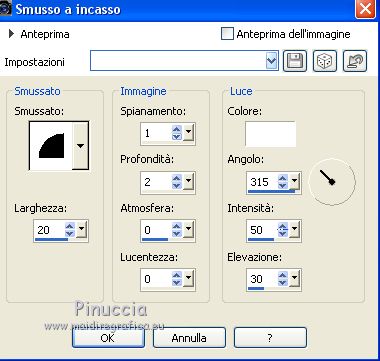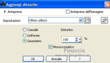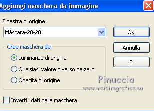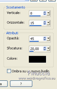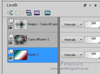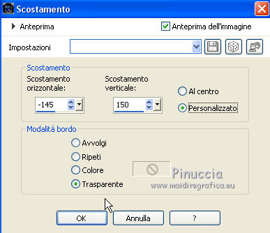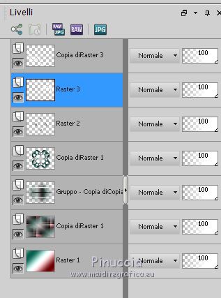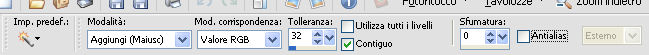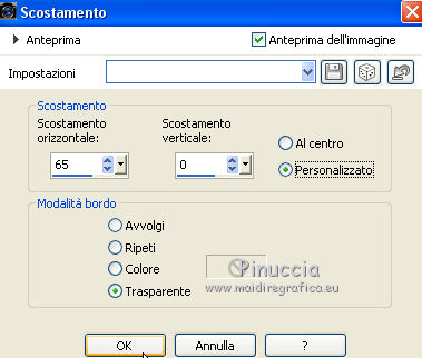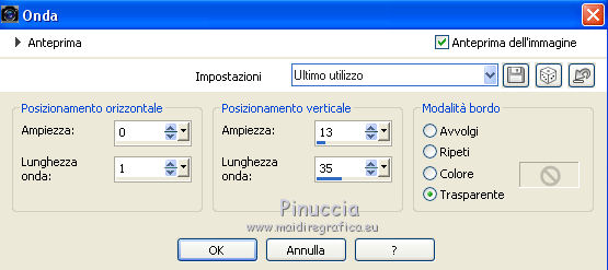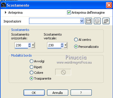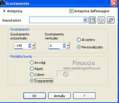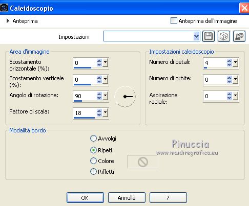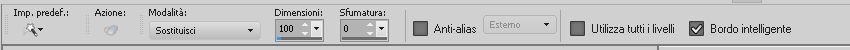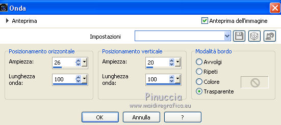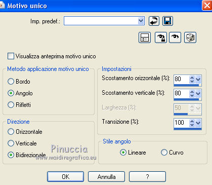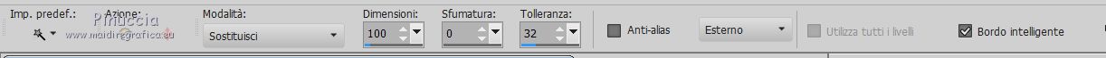 qui puoi trovare qualche risposta ai tuoi dubbi. Se l'argomento che ti interessa non è presente, ti prego di segnalarmelo. Questo tutorial è stato creato con Corel X6 e tradotto con CorelX e CorelX7, ma può essere realizzato anche con le altre versioni di PSP. Dalla versione X4, il comando Immagine>Rifletti è stato sostituito con Immagine>Capovolgi in orizzontale, e il comando Immagine>Capovolgi con Immagine>Capovolgi in verticale. Nelle versioni X5 e X6, le funzioni sono state migliorate rendendo disponibile il menu Oggetti. Con la versione X7 sono tornati i comandi Immagine>Rifletti e Immagine>Capovolgi, ma con nuove funzioni. Vedi la scheda sull'argomento qui traduzione in francese qui Le vostre versioni quiOccorrente: Materiale: qui Per il tube grazie Suizabella (SuizaBella_Ref_AG-001382). Il resto del materiale è di Misae. (in questa pagina trovi i links dei siti dei creatori dei materiali) Filtri in caso di dubbi, ricorda di consultare la mia sezione filtri qui Filters Unlimited 2.0 qui Mehdi - Wavy Lab qui Mura's Meister - Copies qui Kiwi Oelfilters - Videowand qui VM Texture - Cross Weave qui Flaming Pear - Flexify 2 qui AFS IMPORT - sqborder2 qui L&K's - L&K's Mayra qui Nik Software - Color Efex Pro qui Alien Skin Xenofex 2 - Constellation qui I filtri AFS IMPORT, Kiwi e VM Texture si possono usare da soli o importati in Filters Unlimited (come fare vedi qui) Se un filtro fornito appare con questa icona ![]() Se vuoi usare altri colori, non esitare a cambiare le modalità di miscelatura e l'opacità dei livelli. Apri la maschera in PSP e minimizzala con il resto del materiale. 1. Imposta il colore di primo piano con #085f4d, e il colore di sfondo con #6a0002. ![]() 2. Apri una nuova immagine trasparente 800 x 600 pixels. 3. Effetti>Plugins>Mehdi - Wavy Lab Questo filtro crea gradienti con i colori della paletta; il primo è il colore di sfondo, il secondo quello di primo piano; cambia il terzo colore creato dal filtro con il colore bianco #ffffff. ![]() 4. Livelli>Duplica. Effetti>Plugins>Kiwi's Oelfilters - Videowand. ![]() 5. Effetti>Effetti di immagine>Motivo unico. ![]() 6. Di nuovo Effetti>Effetti di immagine>Motivo unico, con i seguenti settaggi: ![]() Effetti>Effetti di bordo>Aumenta. 7. Livelli>Duplica. Effetti>Plugins>L&K's - L&K's Mayra, con i settaggi standard. ![]() 8. Livelli>Nuovo livello maschera>Da immagine. Apri il menu sotto la finestra di origine e vedrai la lista dei files aperti. Seleziona la maschera 20-20. ![]() Livelli>Unisci>Unisci gruppo. 9. Attiva il livello inferiore Raster 1. ![]() 10. Livelli>Duplica. Livelli>Disponi>Porta in alto. 11. Effetti>Plugins>Filters Unlimited 2.0 - VM Texture - Cross Weaver. ![]() 12. Effetti>Plugins>Flaming Pear - Flexify 2. ![]() 13. Effetti>Effetti di riflesso>Caleidoscopio. ![]() 14. Attiva lo strumento Pennello Selezione intelligente con i seguenti settaggi![]() nelle versioni meno recenti, non c'è il settaggio Tolleranza ![]() Clicca con molta cautela solo sulla parte rosso scura della figura ![]() Vedrai che è selezionato tutto tranne le 4 parti rosso scuro della figura. ![]() ![]() Prima della versione PSP7 non trovi lo strumento Pennello di Selezione intelligente. Puoi usare lo strumento Bacchetta magica , modalità Aggiungi![]() Clicca sulle parti rosse per selezionarle Selezione>Modifica>Espandi - 1 pixel. ![]() Premi sulla tastiera il tasto CANC ![]() Selezione>Deseleziona. ![]() 15. Effetti>Effetti 3D>Sfalsa ombra. ![]() 16. Apri il tube Adorno diamante e vai a Modifica>Copia. Torna al tuo lavoro e vai a Modifica>Incolla come nuovo livello. 17. Effetti>Effetti di immagine>Scostamento. ![]() 18. Livelli>Duplica. Immagine>Rifletti. Livelli>Duplica. Effetti>Effetti di immagine>Scostamento. ![]() 19. Livelli>Duplica. Immagine>Capovolgi. 20. Livelli>Unisci>Unisci giù - 3 volte. Regola>Messa a fuoco>Metti a fuoco. 21. Effetti>Effetti 3D>Sfalsa ombra. ![]() 22. Imposta il colore di primo piano con il colore bianco #ffffff. Attiva lo strumento Penna con i seguenti settaggi![]() 23. Traccia una linea tra i due punti. ![]() Clicca sul punto di partenza e poi sul punto di arrivo, ![]() e la linea si traccerà da sé ![]() Livelli>Converti in livello raster. 24. Effetti>Effetti di distorsione>Onda. ![]() 25. Effetti>Plugins>Mura's Meister - Copies. ![]() 26. Attiva lo strumento Gomma ![]() ![]() Passa la gomma una sola volta su questa parte ![]() 27. Dovresti avere pressappoco questo ![]() ![]() 28. Effetti>Effetti di distorsione>Onda. ![]() 29. Effetti>Plugins>Alien Skin Xenofex 2 - Constellation. ![]() 30. Livelli>Duplica. Immagine>Rifletti. Immagine>Capovolgi. 31. Attiva il livello Raster 3. ![]() Livelli>Disponi>Sposta giù - 2 volte. Abbassa l'opacità di questo livello al 75%. Attiva il livello superiore, Copia di Raster 3. Abbassa l'opacità di questo livello al 75%. ![]() 32. Apri il tube SuizaBella_Ref_AG-001382 e vai a Modifica>Copia. Torna al tuo lavoro e vai a Modifica>Incolla come nuovo livello. Immagine>Ridimensiona, al 59%, tutti i livelli non selezionato. 33. Effetti>Effetti di immagine>Scostamento. ![]() Regola>Messa a fuoco>Metti a fuoco. 34. Effetti>Effetti 3D>Sfalsa ombra. ![]() Livelli>Disponi>Sposta giù. 35. Apri il tube Texto_byebye e vai a Modifica>Copia. Torna al tuo lavoro e vai a Modifica>Incolla come nuovo livello. 36. Effetti>Effetti di immagine>Scostamento. ![]() 37. Per i bordi, imposta nuovamente il colore di primo piano con #085f4d. Immagine>Aggiungi bordatura, 1 pixel, simmetriche, colore di primo piano #085f4d. Immagine>Aggiungi bordatura, 3 pixels, simmetriche, colore bianco #ffffff. Immagine>Aggiungi bordatura, 1 pixel, simmetriche, colore di primo piano #085f4d. Immagine>Aggiungi bordatura, 5 pixels, simmetriche, colore bianco #ffffff. 38. Attiva lo strumento Bacchetta magica ![]() e clicca sull'ultimo bordo per selezionarlo. 39. Regola>Aggiungi/Rimuovi disturbo>Aggiungi disturbo. ![]() Selezione>Deseleziona. 40. Immagine>Aggiungi bordatura, 1 pixel, simmetriche, colore di pr