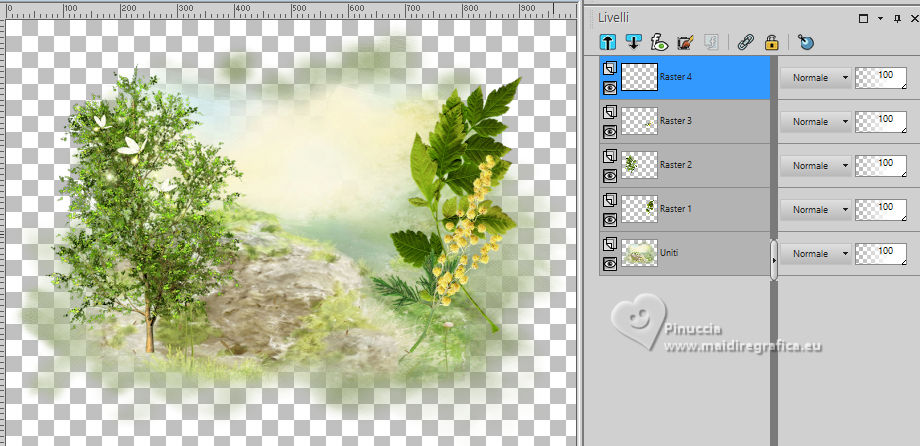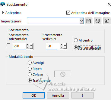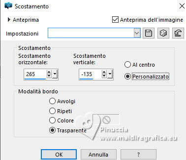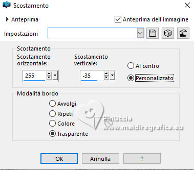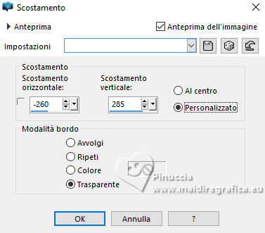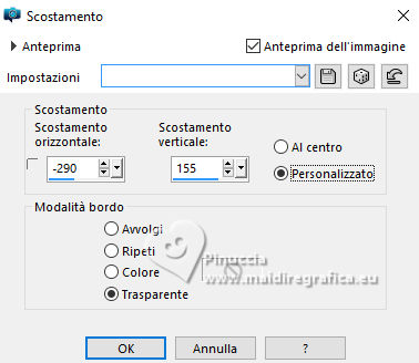 qui puoi trovare qualche risposta ai tuoi dubbi. Se l'argomento che ti interessa non è presente, ti prego di segnalarmelo. Questo tutorial è stato creato con PSP 2020 e tradotto con PSPX9, ma può essere realizzato anche con le altre versioni di PSP. Dalla versione X4, il comando Immagine>Rifletti è stato sostituito con Immagine>Capovolgi in orizzontale, e il comando Immagine>Capovolgi con Immagine>Capovolgi in verticale. Nelle versioni X5 e X6, le funzioni sono state migliorate rendendo disponibile il menu Oggetti. Con la versione X7 sono tornati i comandi Immagine>Rifletti e Immagine>Capovolgi, ma con nuove funzioni. Vedi la scheda sull'argomento qui traduzione in francese qui Le vostre versioni qui![]() Occorrente: ![]() Tube Fairy 712 dello scrap Spring di IS Design. (in questa pagina trovi i links dei siti dei creatori dei materiali) ![]() Uno scrap è un insieme di elementi o immagini che devono essere in armonia in termini di tema, colori e dimensioni. È anche molto importante anche che le ombre non vengano "tagliate" e che siano salvate in formato png ottimizzato. ![]() 1. Apri una nuova immagine trasparente 1000 x 750 pixels. 2. Selezione>Seleziona tutto. 3. Apri l'immagine di sfondo 133921619_4m ![]() Modifica>Copia. Torna al tuo lavoro e vai a Modifica>Incolla nella selezione. Selezione>Deseleziona. 4. Livelli>Nuovo livello raster. Apri l'immagine di sfondo 133921618_3m ![]() Modifica>Copia. Torna al tuo lavoro e vai a Modifica>Incolla nella selezione. Selezione>Deseleziona. 5. Immagine>Ridimensiona, all'80%, tutti i livelli non selezionato. Regola>Messa a fuoco>Metti a fuoco. 6. Livelli>Duplica. Livelli>Unisci>Unisci visibile. 7. Apri l'elemento 0_191ec0_9a7bfd82_orig ![]() Modifica>Copia. Torna al tuo lavoro e vai a Modifica>Incolla come nuovo livello. Immagine>Ridimensiona, al 70%, tutti i livelli non selezionato. 8. Immagine>Ruota per gradi - 90 gradi a sinistra. ![]() 9. Immagine>Rifletti>Rifletti orizzontalmente. 10. Effetti>Effetti di immagine>Scostamento. ![]() 11. Regola>Messa a fuoco>Metti a fuoco. 12. Apri l'elemento 0_191eec_375d0a7c_orig ![]() Modifica>Copia. Torna al tuo lavoro e vai a Modifica>Incolla come nuovo livello. Immagine>Ridimensiona, all'80%, tutti i livelli non selezionato. 13. Effetti>Effetti di immagine>Scostamento. ![]() 14. Regola>Messa a fuoco>Metti a fuoco. 15. Apri l'elemento 0_191f14_3eb42a72_orig ![]() Modifica>Copia. Torna al tuo lavoro e vai a Modifica>Incolla come nuovo livello. Immagine>Ridimensiona, al 55%, tutti i livelli non selezionato. 16. Effetti>Effetti di immagine>Scostamento. ![]() 17. Regola>Messa a fuoco>Metti a fuoco. 18. Apri l'elemento 0_191ee7_e529d579_orig ![]() Modifica>Copia. Torna al tuo lavoro e vai a Modifica>Incolla come nuovo livello. Immagine>Ridimensiona, al 25%, tutti i livelli non selezionato. 19. Effetti>Effetti di immagine>Scostamento. ![]() 20. Regola>Messa a fuoco>Metti a fuoco. 21. Dovresti avere questo ![]() 22. Apri l'elemento 0_191eef_7d215634_orig ![]() Modifica>Copia. Torna al tuo lavoro e vai a Modifica>Incolla come nuovo livello. Immagine>Ridimensiona, al 50%, tutti i livelli non selezionato. 23. Effetti>Effetti di immagine>Scostamento. ![]() Regola>Messa a fuoco>Metti a fuoco. 24. Apri l'elemento 0_191eb7_be55be79_orig ![]() Modifica>Copia. Torna al tuo lavoro e vai a Modifica>Incolla come nuovo livello. Immagine>Ridimensiona, al 40%, tutti i livelli non selezionato. 25. Effetti>Effetti di immagine>Scostamento. ![]() Regola>Messa a fuoco>Metti a fuoco. 26. Apri il tube Fairy 712 ![]() Modifica>Copia. Torna al tuo lavoro e vai a Modifica>Incolla come nuovo livello. Immagine>Ridimensiona, al 70%, tutti i livelli non selezionato. Immagine>Rifletti>Rifletti orizzontalmente. 27. Effetti>Effetti di immagine>Scostamento. ![]() Regola>Messa a fuoco>Metti a fuoco. 28. Chiudi il livello Uniti ![]() 29. Livelli>Unisci>Unisci visibile. 30. Effetti>Effetti 3D>Sfalsa ombra. ![]() 31. Apri il livello chiuso e rimani posizionato sul livello superiore. Apri il testo Magical.Forest.Texto.Misae ![]() Modifica>Copia. Torna al tuo lavoro e vai a Modifica>Incolla come nuovo livello. 32. Effetti>Effetti di immagine>Scostamento. ![]() 33. Firma il tuo lavoro su un nuovo livello. 34. Livelli>Unisci>Unisci visibile. Salva in formato png per conservare la trasparenza dello sfondo. File>Esporta>Ottimizzazione PNG ![]() ![]() ![]() Per il tube di questo esempio grazie Silvie ![]() Puoi scrivermi se hai problemi o dubbi, o trovi un link che non funziona, o soltanto per un saluto. 18 Ottobre 2024 |