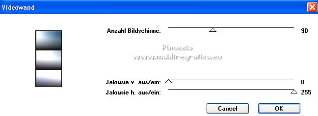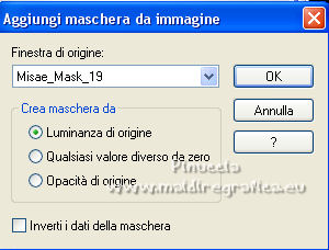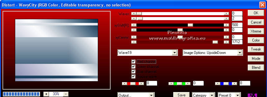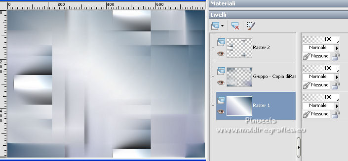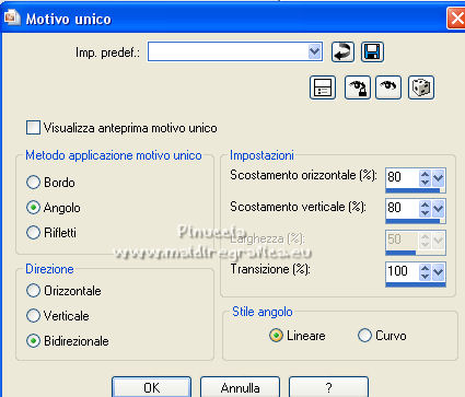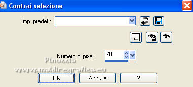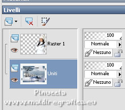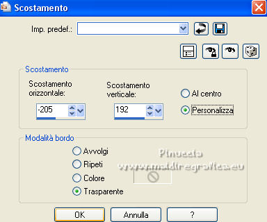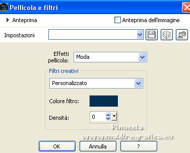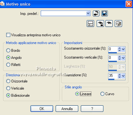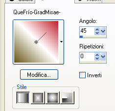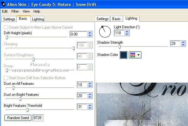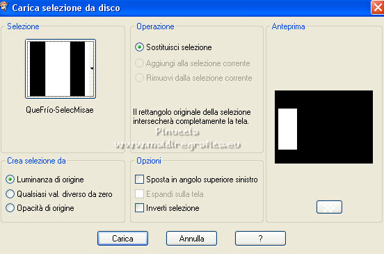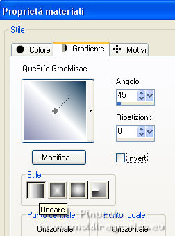 qui puoi trovare qualche risposta ai tuoi dubbi. Se l'argomento che ti interessa non è presente, ti prego di segnalarmelo. Questo tutorial è stato creato con Corel X6 e tradotto con CorelX e CorelX7, ma può essere realizzato anche con le altre versioni di PSP. Dalla versione X4, il comando Immagine>Rifletti è stato sostituito con Immagine>Capovolgi in orizzontale, e il comando Immagine>Capovolgi con Immagine>Capovolgi in verticale. Nelle versioni X5 e X6, le funzioni sono state migliorate rendendo disponibile il menu Oggetti. Con la versione X7 sono tornati i comandi Immagine>Rifletti e Immagine>Capovolgi, ma con nuove funzioni. Vedi la scheda sull'argomento qui traduzione in francese qui Le vostre versioni quiOccorrente: Per i tubes grazie Mina e Beatrice. Il resto del materiale è di Misae. (in questa pagina trovi i links dei siti dei creatori dei materiali) ![]() in caso di dubbi, ricorda di consultare la mia sezione filtri qui Filters Unlimited 2.0 qui Kiwi's - Videowand qui AP 01 [Innovations] - Distort-WavyCity qui L&K's - L&K's Katharina qui Alien Skin Eye Candy 5 Nature - Snow Drift qui I filtri Kiwi's si possono usare da soli o importati in Filters Unlimited (come fare vedi qui) Se un filtro fornito appare con questa icona Animation Shop qui ![]() Se vuoi usare altri colori, non esitare a cambiare le modalità di miscelatura e l'opacità dei livelli. ![]() Metti il gradiente nella cartella Gradienti. Metti la selezione nella cartella Selezioni. Apri la maschera in PSP e minimizzala con il resto del materiale. 1. Imposta il colore di primo piano con #878cb0, e il colore di sfondo con #083152. ![]() 2. Passa il colore di primo piano a Gradiente, e seleziona il gradiente QueFrio-GradMisae, stile Lineare. ![]() se usi altri colori anche il gradiente cambierà colore ![]() 3. Apri una nuova immagine trasparente 800 x 600 pixels. Riempi l'immagine trasparente con il gradiente.4. Regola>Sfocatura>Sfocatura gaussiana - raggio 30. ![]() 5. Livelli>Duplica. Immagine>Rifletti. 6. Livelli>Nuovo livello maschera>Da immagine. Apri il menu sotto la finestra di origine e vedrai la lista dei files aperti. Seleziona la maschera Misae_Mask_19. ![]() Livelli>Unisci>Unisci gruppo. 7. Effetti>Effetti 3D>Sfalsa ombra. ![]() 8. Effetti>Effetti di immagine>Motivo unico. ![]() 9. Livelli>Nuovo livello raster. Selezione>Carica/Salva selezione>Carica selezione da disco. Cerca e carica la selezione QueFrio-SelecMisae ![]() Riempi la selezione con il gradiente.10. Regola>Sfocatura>Sfocatura gaussiana - raggio 30. ![]() 11. Effetti>Plugins>Kiwi's - Videowand. ![]() Selezione>Deseleziona. 12. Effetti>Effetti di immagine>Motivo unico. ![]() 13. Ripeti Effetti>Effetti di immagine>Motivo unico, con questi settaggi ![]() 14. Attiva il livello Raster 1. ![]() 15. Effetti>Plugins>AP 01 [Innovations] - Distort-WavyCity. ![]() 16. Effetti>Effetti di immagine>Motivo unico. ![]() 17. Effetti>Plugins>L&K's - L&K's Katharina. ![]() 18. Effetti>Effetti di bordo>Aumenta. Avremo questo: ![]() 19. Attiva il livello superiore. Apri il misted Mina@.mist.inverno.11.11 ![]() Cancella il watermark e vai a Modifica>Copia. Torna al tuo lavoro e vai a Modifica>Incolla come nuovo livello. 20. Immagine>Aggiungi bordatura, 1 pixel, simmetriche, colore di sfondo #083152. Immagine>Aggiungi bordatura, 5 pixels, simmetriche, colore bianco #ffffff. Immagine>Aggiungi bordatura, 1 pixel, simmetriche, colore di sfondo #083152. Immagine>Aggiungi bordatura, 25 pixels, simmetriche, colore bianco #ffffff. Immagine>Aggiungi bordatura, 1 pixel, simmetriche, colore di sfondo #083152. Immagine>Aggiungi bordatura, 5 pixels, simmetriche, colore bianco #ffffff. Immagine>Aggiungi bordatura, 1 pixel, simmetriche, colore di sfondo #083152. Immagine>Aggiungi bordatura, 35 pixels, simmetriche, colore bianco #ffffff. Immagine>Aggiungi bordatura, 1 pixel, simmetriche, colore di sfondo #083152. 21. Apri Deco_Que Frío_Misae ![]() Modifica>Copia. Torna al tuo lavoro e vai a Modifica>Incolla come nuovo livello. 22. Effetti>Effetti di immagine>Scostamento. ![]() 23. Livelli>Duplica. Immagine>Rifletti. 24. Apri Texto_Que Frío_Misae ![]() Modifica>Copia. Torna al tuo lavoro e vai a Modifica>Incolla come nuovo livello. 25. Effetti>Effetti di immagine>Scostamento. ![]() 26. Effetti>Effetti 3D>Sfalsa ombra. ![]() 27. Firma il tuo lavoro su un nuovo livello. 28. Livelli>Unisci>Unisci visibile. 29. Immagine>Ridimensiona, al 95%, tutti i livelli selezionato. Regola>Messa a fuoco>Metti a fuoco. 30. Effetti>Effetti foto>Pellicola e Filtri - colore di sfondo #083152. ![]() 31. Apri il tube OBG_1558 ![]() Cancella il watermark e vai Modifica>Copia. Torna al tuo lavoro e vai a Modifica>Incolla come nuovo livello. Immagine>Rifletti. Immagine>Ridimensiona, al 95%, tutti i livelli non selezionato. 32. Effetti>Effetti di immagine>Scostamento. ![]() Regola>Messa a fuoco>Metti a fuoco. 33. Effetti>Effetti foto>Pellicola e Filtri, con i settaggi precedenti. ![]() 34. Effetti>Effetti 3D>Sfalsa ombra, con i settaggi precedenti. ![]() 35. Attiva il livello Uniti. ![]() 36. Selezione>Seleziona tutto. Selezione>Modifica>Contrai - 70 pixels. ![]() 37. Effetti>Plugins>Alien Skin Eye Candy Nature - Snow Drift. Shadow Color: colore di sfondo #083152 ![]() Selezione>Deseleziona. 38. Modifica>Copia Speciale>Copia Unione. 39. Apri Animation Shop e vai a Modifica>Incolla>Incolla come nuova animazione. 40. Torna in PSP. Modifica>Annulla Deseleziona. Modifica>Annulla Snow drift. Oppure, sulla barra degli strumenti, clicca due volte sull'icona corrispondente. ![]() 41. Effetti>Plugins>Alien Skin Eye Candy Nature - Snow Drift. Clicca una volta su Random Seed (non importa se il numero non è lo stesso del tutorial), e ok. ![]() Selezione>Deseleziona. 42. Modifica>Copia Speciale>Copia Unione. Torna in Animation Shop e vai a Modifica>Incolla>Incolla dopo il fotogramma corrente. 43. Ancora in PSP. Modifica>Annulla Deseleziona. Modifica>Annulla Snow drift. 44. Effetti>Plugins>Alien Skin Eye Candy Natur