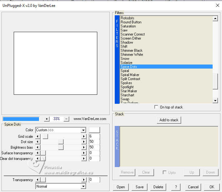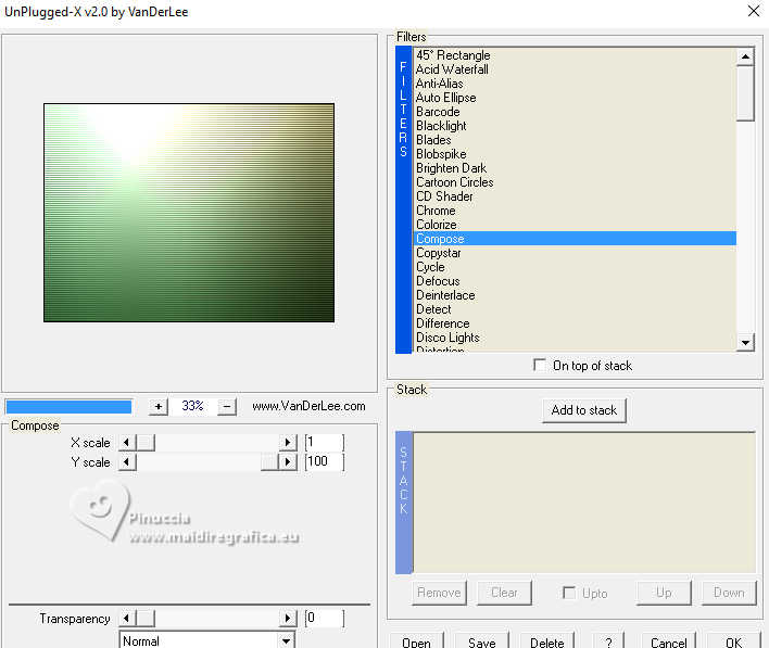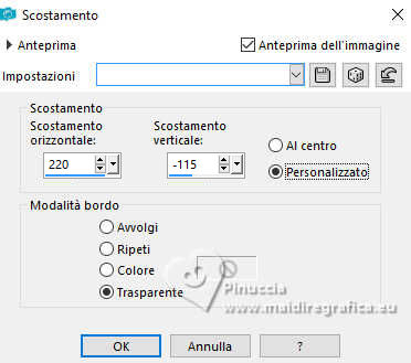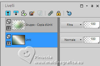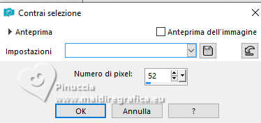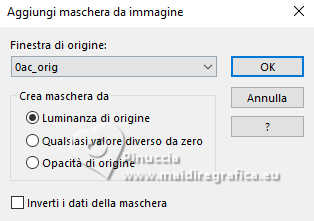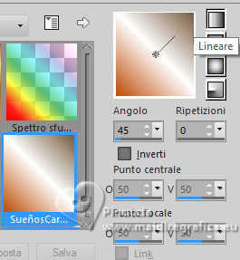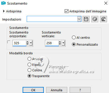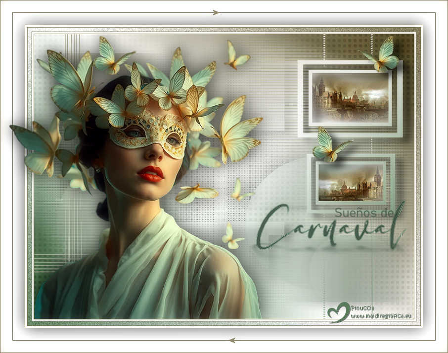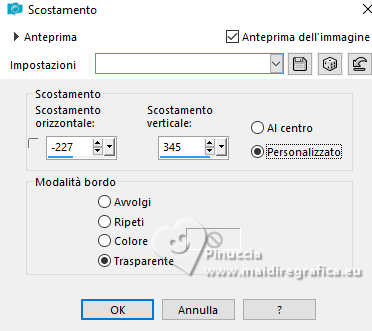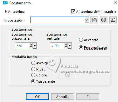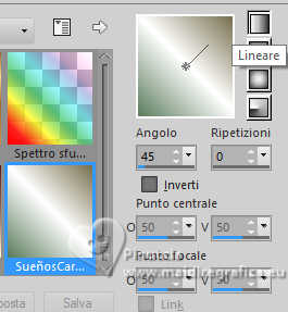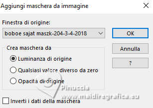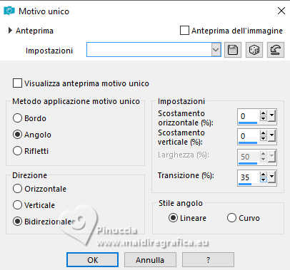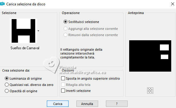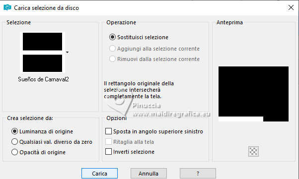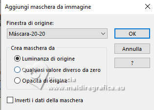 qui puoi trovare qualche risposta ai tuoi dubbi. Se l'argomento che ti interessa non è presente, ti prego di segnalarmelo. Questo tutorial è stato creato con PSP 2020 e tradotto con PSPX9, ma può essere realizzato anche con le altre versioni di PSP. Dalla versione X4, il comando Immagine>Rifletti è stato sostituito con Immagine>Capovolgi in orizzontale, e il comando Immagine>Capovolgi con Immagine>Capovolgi in verticale. Nelle versioni X5 e X6, le funzioni sono state migliorate rendendo disponibile il menu Oggetti. Con la versione X7 sono tornati i comandi Immagine>Rifletti e Immagine>Capovolgi, ma con nuove funzioni. Vedi la scheda sull'argomento qui traduzione in francese qui Le vostre versioni qui![]() Occorrente: ![]() Tubes: carnaval21-coly, misted london_apocalypse_sm_by_myjavier_gloria212. Maschere: 0ac_orig, boboe sajat maszk-204-3-4-2018. Testo Sueños de Carnaval di Yedralina. Il resto del materiale è di Misae. (in questa pagina trovi i links dei siti dei creatori dei materiali) Filtri: in caso di dubbi, ricorda di consultare la mia sezione filtri qui VanDerLee - Unplugged-X qui ![]() non esitare a cambiare modalità di miscelatura e opacità secondo i colori utilizzati. Nelle ultime versioni di PSP non c'è il gradiente di primo piano/sfondo (Corel_06_029) Puoi usare i gradienti delle versioni precedenti. Trovi qui i gradienti Corel X. ![]() Metti il gradiente nella cartella Gradienti. Metti le selezioni nella cartella Selezioni. Apri le maschere in PSP e minimizzale con il resto del materiale. PUNTO 1 Apri una nuova immagine trasparente 800 x 600 pixels. Imposta il colore di primo piano con #5b7c5c. e il colore di sfondo con #776f4e. ![]() Passa il colore di primo piano a Gradiente e seleziona il gradiente SueñosCarnaval-GradMisae, stile Lineare. ![]() **** se stai usando altri colori, anche il gradiente cambierà colore questi i colori e il gradiente della mia versione ![]() ![]() **** Livelli>Duplica. Cambia la modalità di miscelatura di questo livello in Moltiplica. Livelli>Unisci>Unisci visibile. Regola>Sfocatura>Sfocatura gaussiana - raggio 45. ![]() Livelli>Duplica. PUNTO 2 Effetti>Plugins>VanDerLee - Unplugged-X - Compose ![]() Livelli>Nuovo livello maschera>Da immagine. Apri il menu sotto la finestra di origine e vedrai la lista dei files aperti. Seleziona la maschera 20/20. ![]() Livelli>Unisci>Unisci gruppo. Effetti>Effetti di bordo>Aumenta. Cambia la modalità di miscelatura di questo livello in Filtra. PUNTO 3 Attiva il livello Uniti ![]() Livelli>Duplica. Livelli>Disponi>Porta in alto. Immagine>Rifletti>Rifletti orizzontalmente. Livelli>Nuovo livello maschera>Da immagine. Apri il menu sotto la finestra di origine e seleziona la maschera 0ac_orig ![]() Livelli>Unisci>Unisci gruppo. Effetti>Effetti 3D>Sfalsa ombra, colore nero. ![]() Effetti>Effetti di immagine>Motivo unico. ![]() Livelli>Nuovo livello maschera>Da immagine. Apri il menu sotto la finestra di origine e seleziona la maschera 20/20 ![]() Livelli>Unisci>Unisci gruppo. PUNTO 4 Livelli>Nuovo livello raster. Effetti>Plugins>VanDerLee - Unplugged-X - Spice Dot Color #ffffff - Grid Scale 6 ![]() Livelli>Nuovo livello maschera>Da immagine. Apri il menu sotto la finestra di origine e seleziona la maschera 20/20 ![]() Livelli>Duplica. Livelli>Unisci>Unisci gruppo. Immagine>Ridimensiona, all'80%, tutti i livelli non selezionato. Effetti>Effetti di immagine>Motivo unico. ![]() Cambia la modalità di miscelatura di questo livello in Sovrapponi, e abbassa l'opacità al 32%. PUNTO 5 Attiva nuovamente il livello Uniti. ![]() Livelli>Duplica. Livelli>Disponi>Porta in alto. Immagine>Rifletti>Rifletti orizzontalmente. Livelli>Nuovo livello maschera>Da immagine. Apri il menu sotto la finestra di origine e seleziona la maschera boboe sajat maszk-204-3-4-2018 ![]() Livelli>Unisci>Unisci gruppo. Effetti>Effetti 3D>Sfalsa ombra, colore nero. ![]() Livelli>Duplica. Cambia la modalità di miscelatura di questo livello in Filtra, e abbassa l'opacità al 63%. PUNTO 6 Livelli>Nuovo livello raster. Selezione>Carica/Salva selezione>Carica selezione da disco. Cerca e carica la selezione Sueños de carnaval ![]() Riempi le selezioni con il gradiente.Selezione>Deseleziona. Apri il misted london_apocalypse_sm_by_myjavier_gloria212 ![]() Immagine>Ridimensiona, al 20%, tutti i livelli selezionato. Modifica>Copia. Torna al tuo lavoro e vai a Modifica>Incolla come nuovo livello. Effetti>Effetti di immagine>Scostamento. ![]() Livelli>Duplica. Immagine>Rifletti>Rifletti orizzontalmente. Effetti>Effetti di immagine>Scostamento. ![]() Livelli>Unisci>Unisci giù. Regola>Messa a fuoco>Metti a fuoco. Selezione>Carica/Salva selezione>Carica selezione da disco. Carica nuovamente la selezione Sueños de carnaval ![]() Selezione>Inverti. Premi sulla tastiera il tasto CANC .Selezione>Deseleziona. Livelli>Unisci>Unisci giù. Livelli>Disponi>Sposta giù - 2 volte. PUNTO 7 Immagine>Aggiungi bordatura, 1 pixel, simmetriche, colore di sfondo #776f5e. Immagine>Aggiungi bordatura, 4 pixels, simmetriche, colore bianco #ffffff. Immagine>Aggiungi bordatura, 1 pixel, simmetriche, colore di sfondo #776f5e. Immagine>Aggiungi bordatura, 8 pixels, simmetriche, colore bianco #ffffff. Attiva lo strumento Bacchetta magica ![]() e clicca nell'ultimo bordo per selezionarlo. Riempi la selezione con il gradiente.Regola>Aggiungi/Rimuovi disturbo>Aggiungi disturbo. ![]() Selezione>Deseleziona. Immagine>Aggiungi bordatura, 1 pixel, simmetriche, colore di sfondo #776f5e. Immagine>Aggiungi bordatura, 4 pixels, simmetriche, colore bianco #ffffff. Immagine>Aggiungi bordatura, 1 pixel, simmetriche, colore di sfondo #776f5e. Immagine>Aggiungi bordatura, 25 pixels, simmetriche, colore bianco #ffffff. Immagine>Aggiungi bordatura, 1 pixel, simmetriche, colore di sfondo #776f5e. Immagine>Aggiungi bordatura, 25 pixels, simmetriche, colore bianco #ffffff. Immagine>Aggiungi bordatura, 1 pixel, simmetriche, colore di sfondo #776f5e. Selezione>Seleziona tutto. Selezione>Modifica>Cont