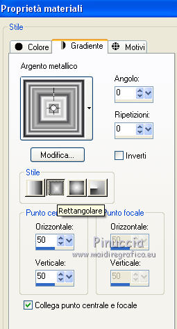 qui puoi trovare qualche risposta ai tuoi dubbi. Se l'argomento che ti interessa non è presente, ti prego di segnalarmelo. Questo tutorial è stato creato con Corel X6 e tradotto con CorelX e CorelX7, ma può essere realizzato anche con le altre versioni di PSP. Dalla versione X4, il comando Immagine>Rifletti è stato sostituito con Immagine>Capovolgi in orizzontale, e il comando Immagine>Capovolgi con Immagine>Capovolgi in verticale. Nelle versioni X5 e X6, le funzioni sono state migliorate rendendo disponibile il menu Oggetti. Con la versione X7 sono tornati i comandi Immagine>Rifletti e Immagine>Capovolgi, ma con nuove funzioni. Vedi la scheda sull'argomento qui traduzione in francese quiLe vostre versioni qui Occorrente: Tube a scelta. Per i tubes del mio esempio grazie Cal. (in questa pagina trovi i links ai loro siti). Filtri in caso di dubbi, ricorda di consultare la mia sezione filtri qui In questo tutorial tratteremo il filtro SuperRune qui Super Cubic è un plugin di Photoshop che facilita il ritocco di panorami a 360 gradi. I plugin mapperanno le distorsioni panoramiche su piani piatti, in modo che possano essere facilmente modificati. Il filtro è composto da files in formato 8bf, pertanto va semplicemente scompattato in una cartella a scelta, da aggiungere ai Percorsi Files. Gli effetti del filtro sono 4 ![]() In realtà gli effetti sono due: 1.SuperCubic e 2.SuperCubic Reverse, che sono stati doppiati in una versione "express", che lavora automaticamente senza finestra. Per l'elaborazione del risultato finale ho usato anche il filtro Cybia Screenworks qui ![]() Se vuoi usare altri colori, non esitare a cambiare le modalità di miscelatura e l'opacità dei livelli. Scegli un paesaggio o un'immagine in png, un tube o tube accessori a tuo piacimento. 1. Apri una nuova immagine trasparente a tuo piacimento; per il mio esempio ho scelto 900 x 600 pixels. 2. Passa il colore di primo piano a Gradiente e seleziona il gradiente Argento metallico, stile Rettangolare. ![]() Riempi l'immagine trasparente con il gradiente.3. Effetti>Plugins>SuperRune Filters - SuperCubic Reverse ![]() 4. Livelli>Duplica. Immagine>Capovolgi. Livelli>Unisci>Unisci visibile. Se imposti Zenith and Nadir, il punto 4 non è necessario ![]() 5. Effetti>Effetti di riflesso>Specchio rotante. ![]() 6. Aggiungi una trama o, come nel mio esempio, applica il filtro Screenwork. Effetti>Plugins>Cybia Screenworks - io ho scelto Dot Screen ![]() per la seconda versione ho scelto Light Gauze ![]() Effetti>Effetti 3D>Sfalsa ombra, a scelta. 7. Ora continua e finisci il lavoro secondo i tuoi gusti. Per il mio esempio ho aggiunto un livello in basso e riempito con un gradiente e/o una trama. Quindi ho aggiunto un paesaggio e un tube. In base ai tuoi colori, cambia la modalità di miscelatura del livello del filtro ![]() o del livello del paesaggio 8. Firma il tuo lavoro e salva in formato jpg. Versione con tubes di Gabry e Cal ![]() Le vostre versioni qui ![]() Puoi scrivermi se hai problemi o dubbi, o trovi un link che non funziona, o soltanto per un saluto. 11 Gennaio 2020