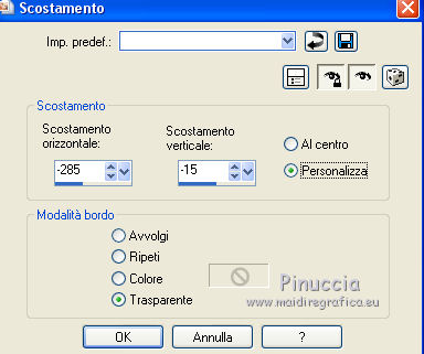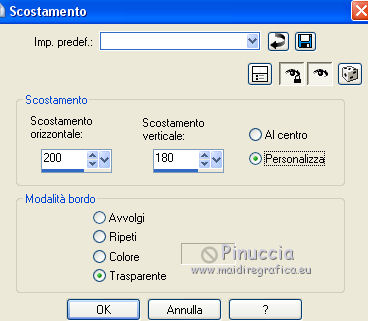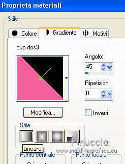 qui puoi trovare qualche risposta ai tuoi dubbi. Se l'argomento che ti interessa non è presente, ti prego di segnalarmelo. Questo tutorial è stato creato con Corel X6 e tradotto con CorelX e CorelX7, ma può essere realizzato anche con le altre versioni di PSP. Dalla versione X4, il comando Immagine>Rifletti è stato sostituito con Immagine>Capovolgi in orizzontale, e il comando Immagine>Capovolgi con Immagine>Capovolgi in verticale. Nelle versioni X5 e X6, le funzioni sono state migliorate rendendo disponibile il menu Oggetti. Con la versione X7 sono tornati i comandi Immagine>Rifletti e Immagine>Capovolgi, ma con nuove funzioni. Vedi la scheda sull'argomento qui traduzione in francese qui Le vostre versioni qui Occorrente: Materiale qui Per i tubes grazie Libellule (libellulegraphisme_belle_chapeau_noir.png) e Coleçäo (Coleçäo Mist Flores 007 LDesigns-2017.pspimage) e Wieskes (wieskes tube 537.png) (in questa pagina trovi i links ai loro siti). Plugins: Filters Unlimited 2.0 qui &<Bkg Kaleidoscope> - Tile Maker 1 (da importare in Unlimited) qui Alf's Power Toys - Color Grid qui VM Toolbox - MirrorriM qui Simple - Top Left Mirror qui Graphics Plus - Horizontal Mirror qui Mura's Meister - Copies qui Nik Software - Color Efex Pro qui I filtri VM Toolbox, Alf's Power Toys, Simple e Graphics Plus si possono usare da soli o importati in Filters Unlimited (come fare vedi qui) Se un filtro fornito appare con questa icona ![]() Se vuoi usare altri colori, non esitare a cambiare le modalità di miscelatura e l'opacità dei livelli. Metti il gradiente nella cartella Gradienti. 1. Apri una nuova immagine trasparente 1000 x 700 pixels. 2. Imposta il colore di primo piano con #000000, e il colore di sfondo con #f2609b. ![]() Passa il colore di primo piano a Gradiente e seleziona il gradiente Duo Dos 3, stile Lineare. ![]() 3. Riempi l'immagine trasparente con il gradiente.4. Effetti>Plugins>VM Toolbox - MirrororriM ![]() 5. Effetti>Plugins>Filters Unlimited 2.0 - &<Bkg Kaleidoscope> - Tile Maker 1. ![]() 6. Effetti>Plugins>Filters Unlimited 2.0 - Tile & Mirror - Mirrored & Scaled. ![]() 7. Effetti>Plugins>Mura's Meister - Copies. ![]() 8. Effetti>Plugins>Graphics Plus - Horizontal Mirror. ![]() 9. Effetti>Plugins>Alf's Power Toys - Color Grid. ![]() 10. Livelli>Duplica. Effetti>Effetti geometrici>Prospettiva verticale. ![]() 11. Immagine>Capovolgi. Ripeti Effetti>Effetti geometrici>Prospettiva verticale, con gli stessi settaggi. Risultato: ![]() 12. Effetti>Plugins>Mura's Meister - Copies. ![]() 13. Effetti>Plugins>Simple - Top Left Mirror. ![]() 14. Effetti>Effetti di distorsione>Stringi (nelle nuove versioni è diventato Compressione). ![]() 15. Ripeti Effetti>Effetti di distorsione>Stringi, intensità 50. ![]() 16. Regola>Flash riempimento. ![]() 17. Effetti>Effetti 3D>Sfalsa ombra. ![]() 18. Apri il tube Coleçäo Mist Flores 007 LDesigns-2017.pspimage e vai a Modifica>Copia. Torna al tuo lavoro e vai a Modifica>Incolla come nuovo livello. Immagine>Ridimensiona, al 20%, tutti i livelli non selezionato. Regola>Messa a fuoco>Metti a fuoco. 19. Effetti>Effetti di immagine>Scostamento. ![]() 20. Apri il tube libellulegraphisme_belle_chapeau_noir.png e vai a Modifica>Copia. Torna al tuo lavoro e vai a Modifica>Incolla come nuovo livello. Immagine>Ridimensiona, al 75%, tutti i livelli non selezionato. Regola>Messa a fuoco>Metti a fuoco. 21. Effetti>Effetti di immagine>Scostamento. ![]() 22. Effetti>Effetti 3D>Sfalsa ombra, con i settaggi precedenti. ![]() 23. Apri il tube wieskes tube 537.png e vai a Modifica>Copia. Torna al tuo lavoro e vai a Modifica>Incolla come nuovo livello. 24. Immagine>Ruota per gradi - 90 gradi a destra. ![]() 25. Immagine>Rifletti. Effetti>Effetti di immagine>Scostamento. ![]() 26. Effetti>Effetti 3D>Sfalsa ombra, con i settaggi precedenti. 27. Livelli>Unisci>Unisci visibile. 28. Effetti>Plugins>Nik Software - Color Efex Pro - Glamour Glow. ![]() 29. Apri Symetrie.texto.pspimage e vai a Modifica>Copia. Torna al tuo lavoro e vai a Modifica>Incolla come nuovo livello. 30. Effetti>Effetti di immagine>Scostamento. ![]() 31. Livelli>Unisci>Unisci tutto. 32. Firma il tuo lavoro e salva in formato jpg. I tubes di questo esempio sono di Tocha e Anna.br ![]() Le vostre versioni qui ![]() La mia mail è nel menu in cima alla pagina. Puoi scrivermi se hai problemi o dubbi, o trovi un link che non funziona, o soltanto per un saluto. Se vorrai mandarmi la tua versione, sarò lieta di pubblicarla. 15 Aprile 2018 Le mie traduzioni sono regolarmente registrate |