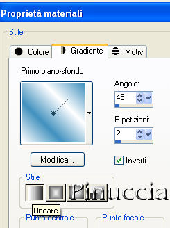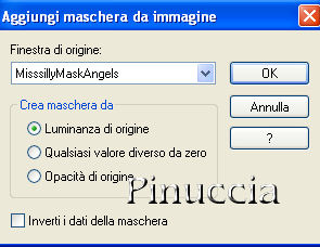 qui puoi trovare qualche risposta ai tuoi dubbi. Se l'argomento che ti interessa non è presente, ti prego di segnalarmelo. Per tradurre questo tutorial ho usato Corel X. Occorrente: Materiale qui Apri una nuova immagine trasparente 600 x 450 pixels. Imposta il colore di primo piano con #4191be, e il colore di sfondo con #ffffff (bianco). Passa il colore di primo piano a Gradiente con i seguenti settaggi: ![]() Riempi l'immagine trasparente con il gradiente.Apri il tube MisssillyGrid e vai a Modifica>Copia. Torna al tuo lavoro e vai a Modifica>Incolla come nuovo livello. Nella paletta dei livelli abbassa l'opacità di questo livello al 36%. Apri il tube KaraT5064 e vai a Modifica>Copia. Torna al tuo lavoro e vai a Modifica>Incolla come nuovo livello. Immagine>rifletti. Sposta il tube in basso a destra.Attiva lo strumento Deformazione ![]() Puntatore se stai usando PSP Xe spingi i nodi centrali verso l'esterno fino a riempire la maggior parte dell'immagine. ![]() Apri il tube cdw_Romance e vai a Modifica>Copia. Torna al tuo lavoro e vai a Modifica>Incolla come nuovo livello. Sposta il tube in basso a destra.Livelli>Nuovo livello raster. Riempi il livello con il colore bianco di sfondo.Apri la maschera MisssillyMaskAngels e minimizzala. Livelli>Nuovo livello maschera>Da immagine. Apri il menu sotto la finestra di origine e vedrai la lista dei files aperti. ![]() Seleziona la maschera con i seguenti settaggi. ![]() Livelli>Unisci>Unisci gruppo. Apri Text e vai a Modifica>Copia. Torna al tuo lavoro e vai a Modifica>Incolla come nuovo livello. Posiziona il testo dove preferisci o vedi il mio esempio.in fondo al tutorial l'esempio con il mio testo in italiano. Se vuoi usarlo prendilo qui Apri il tube jet-woman5-oktober-2008 e vai a Modifica>Copia. Torna al tuo lavoro e vai a Modifica>Incolla come nuovo livello. Immagine>ridimensiona, 3 volte all'85%, tutti i livelli non selezionato. Sposta il tube in basso a sinistra.Effetti>Effetti 3D>Sfalsa ombra: ![]() Aggiungi il tuo nome e/o il tuo watermark. Immagine>Aggiungi bordatura, 5 pixels, simmetriche, con il colore di primo piano #4191be. Cliccando con il tasto destro del mouse sulla palettina del colore apparirà la finestra degli ultimi colori usati, e in basso a sinistra, i colori impostati nella paletta dei materiali. Clicca sul colore di primo e sarà automaticamente impostato come colore dei bordi. ![]() Hai finito. Puoi salvare in formato jpg.