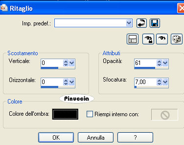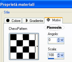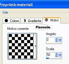 qui puoi trovare qualche risposta ai tuoi dubbi. Se l'argomento che ti interessa non č presente, ti prego di segnalarmelo. Per tradurre questo tutorial ho usato Corel X. Occorrente: Materiale qui Apri una nuova immagine trasparente 600 x 500 pixels. Imposta sia il colore di primo piano che il colore di sfondo con il bianco. Apri il motivo "ChessPattern" e minimizzalo nella tua area di lavoro. Passa il colore di primo piano a Motivi. Apri il menu e, nella lista dei motivi disponibili, troverai anche i files aperti in PSP e tra questi ChessPattern. Seleziona questo motivo con i seguenti settaggi. ![]() Riempi l'immagine trasparente con questo motivo.Livelli>Nuovo livello raster. Selezione>Seleziona tutto. Apri Edge round 03 e vai a Modifica>Copia. Torna al tuo lavoro e vai a Modifica>Incolla nella selezione. Selezione>Deseleziona. Immagine>Rifletti. Livelli>Unisci>Unisci gių. Livelli>Nuovo livello raster. Selezione>Seleziona tutto. Selezione>Modifica>Contrai - 10 pixels. Selezione>Inverti. Cambia i settaggi del motivo, impostando Scala a 50. ![]() Riempi il livello con questo motivo.Effetti>Effetti 3D>Sfalsa ombra. ![]() Livelli>Nuovo livello raster. Effetti>Effetti 3D>Ritaglio: ![]() Livelli>Unisci>Unisci gių. Attiva il livello inferiore. Apri il tube jet-woman8-maart-2008 e vai a Modifica>Copia. Torna al tuo lavoro e vai a Modifica>Incolla come nuovo livello. Immagine>Rifletti. Immagine>Ridimensiona, all'85%, tutti i livelli non selezionato. Sposta il tube a sinistra.Livelli>Nuovo livello raster. Attiva lo strumento Selezione ,clicca sull'icona Selezione personalizzata ![]() e imposta i seguenti settaggi: ![]() Riempi la selezione con il colore bianco.Apri il tube Lut schaakspel 18-3-2008 e vai a Modifica>Copia. Torna al tuo lavoro e vai a Modifica>Incolla nella selezione. Selezione>Modifica>Seleziona bordature selezione: ![]() Riempi con il colore nero.Selezione>Deseleziona. Effetti>Effetti 3D>Sfalsa ombra, con i settaggi precedenti. Apri il file di testo "Text" e vai a Modifica>Copia. Torna al tuo lavoro e vai a Modifica>Incolla come nuovo livello. Sposta il testo come nel mio esempio.Livelli>Unisci>Unisci gių. Livelli>Duplica. Immagine>Ridimensiona, 2 volte all'85%, tutti i livelli non selezionato. Immagine>Ruota per gradi - 30 gradi a destra: ![]() Regola>Messa a fuoco>Metti a fuoco. Sposta l'immagine come nel mio esempio.Attiva lo strumento Testo , scegli un font o usa quello fornito, e scrivi il tuo nome.Livelli>Unisci>Unisci tutto e salva in formato jpg.