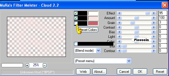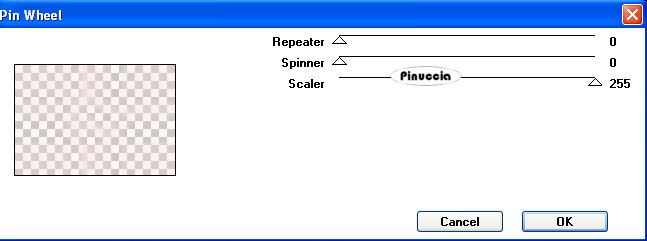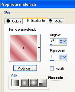 qui puoi trovare qualche risposta ai tuoi dubbi. Se l'argomento che ti interessa non è presente, ti prego di segnalarmelo. Per tradurre questo tutorial ho usato Corel X. Occorrente: Materiale qui Filtri: Graphics Plus qui Mura's Meister - Cloud qui Penta.com - Jeans qui Penta.com - Color dot qui ![]() Apri una nuova immagine trasparente 800 x 550 pixels. Imposta il colore di primo piano con #f6e2e0, e il colore di sfondo con #c66269. Passa il colore di primo piano a Gradiente. ![]() Riempi l'immagine trasparente con il gradiente.Regola>Sfocatura>Sfocatura gaussiana - raggio 30. ![]() Effetti>Plugins>Penta.com - Jeans, con i settaggi standard. ![]() Livelli>Nuovo livello raster. Riempi con il gradiente.Regola>Sfocatura>Sfocatura gaussiana - raggio 30. Nella paletta dei livelli abbassa l'opacità di questo livello all'88%. Livelli>Nuovo livello raster. Effetti>Plugins>Mura's Meister - Cloud, con i seguenti settaggi: attenzione: togli la selezione dalla casellina del colore di sfondo. ![]() Effetti>Plugins>Graphics Plus - Pin Wheel: ![]() Apri il tube KaraT3300 e vai a Modifica>Copia. Torna al tuo lavoro e vai a Modifica>Incolla come nuovo livello. Cambia la modalità di miscelatura di questo livello in Sovrapponi. Livelli>Duplica. Abbassa l'opacità di questo livello al 60%. ![]() Apri il tube Pink beauties~Jiggs e vai a Modifica>Copia. Torna al tuo lavoro e vai a Modifica>Incolla come nuovo livello. Immagine>Ridimensiona, 2 volte all'85%, tutti i livelli non selezionato. Cambia la modalità di miscelatura di questo livello in Sovrapponi. Sposta il tube nell'angolo in basso a sinistra.Apri il tube Misssilly-MistedWoman-Feb2010 e vai a Modifica>Copia. Torna al tuo lavoro e vai a Modifica>Incolla come nuovo livello. Immagine>Ridimensiona, all'85%, tutti i livelli non selezionato. Abbassa l'opacità di questo livello al 60%. Sposta il tube nell'angolo in alto a sinistra.Apri il tube Floral13. Selezione>Seleziona tutto. Selezione>Mobile. Selezione>Immobilizza. Livelli>Nuovo livello raster. Riempi con il colore di sfondo #c66269.Modifica>Copia (stai copiando soltanto il livello aggiunto). Torna al tuo lavoro e vai a Modifica>Incolla come nuovo livello. Sposta il tube in basso, vedi il mio esempio.Apri il tube Floral15. Selezione>Seleziona tutto. Selezione>Mobile. Selezione>Immobilizza. Livelli>Nuovo livello raster. Riempi con il colore di sfondo #c66269.Modifica>Copia (stai copiando soltanto il livello aggiunto). Torna al tuo lavoro e vai a Modifica>Incolla come nuovo livello. Immagine>Capovolgi. Sposta il tube nell'angolo in alto a destra, vedi il mio esempio.Apri "text" e vai a Modifica>Copia. Torna al tuo lavoro e vai a Modifica>Incolla come nuovo livello. Posiziona correttamente il testo.Con il materiale trovi il font usato per questo testo. Puoi usarlo per scrivere eventualmente un altro testo a tua scelta. Apri il tube Misssilly-Woman-Feb2010 e vai a Modifica>Copia. Torna al tuo lavoro e vai a Modifica>Incolla come nuovo livello. Immagine>Ridimensiona, 2 volte all'85%, tutti i livelli non selezionato. Sposta il tube nell'angolo in basso a destra.Livelli>Nuovo livello raster. Selezione>Seleziona tutto. Riempi con il colore di sfondo #c66269.Selezione>Modifica>Contrai - 1 pixel. Premi sulla tastiera il tasto CANC. Selezione>Deseleziona. Effetti>Effetti 3D>Sfalsa ombra. ![]() Aggiungi il tuo nome e/o il tuo watermark. Immagine>Aggiungi bordatura, 20 pixels, simmetriche, con il colore bianco. Seleziona questo bordo con la bacchetta magica ![]() Effetti>Effetti 3D>Sfalsa ombra, con i settaggi precedenti. Riempi la selezione con il gradiente.Regola>Sfocatura>Sfocatura gaussiana - raggio 30. Effetti>Plugins>Penta.com - Color dot con i settaggi standard. ![]() Livelli>Nuovo livello raster. Riempi ancora con il gradiente.Regola>Sfocatura>Sfocatura gaussiana - raggio 30. Livelli>Nuovo livello raster. Selezione>Seleziona tutto. Riempi con il colore di sfondo #c66269.Selezione>Modifica>Contrai - 2 pixels. Premi sulla tastiera il tasto CANC. Selezione>Deseleziona. Hai finito. Puoi salvare in formato jpg.