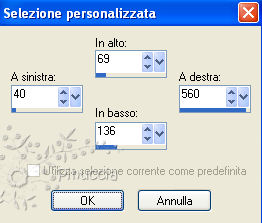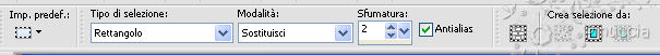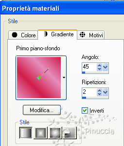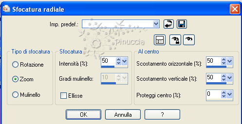 qui puoi trovare qualche risposta ai tuoi dubbi. Se l'argomento che ti interessa non è presente, ti prego di segnalarmelo. Per tradurre questo tutorial ho usato Corel X. Occorrente: Materiale qui Apri una nuova immagine trasparente 600 x 450 pixels. Imposta il colore di primo piano con #d11e4b, e il colore di sfondo con #e48ebd. Passa il colore di primo piano a Gradiente, con i seguenti settaggi: ![]() Riempi l'immagine trasparente con il gradiente.Apri il tube Misssilly-Tulips-May2008 e vai a Modifica>Copia. non chiuderlo, perchè ti servirà ancora. Torna al tuo lavoro e vai a Modifica>Incolla come nuovo livello. Immagine>Ridimensiona, 3 volte all'85%, tutti i livelli non selezionato. Sposta il tube nell'angolo in basso a destra.Livelli>Duplica. Immagine>Rifletti. Livelli>Unisci>Unisci giù. Livelli>Duplica. Immagine>Capovolgi. Livelli>Unisci>Unisci giù. Livelli>Duplica, e attiva il livello sottostante. ![]() Regola>Sfocatura>Sfocatura gaussiana - raggio 10. ![]() Attiva il livello superiore. Regola>Sfocatura>Sfocatura radiale, con i seguenti settaggi: ![]() Apri il tube jet-womanface5-januari-2008 e vai a Modifica>Copia. non chiuderlo, perchè ti servirà ancora. Torna al tuo lavoro e vai a Modifica>Incolla come nuovo livello. Immagine>Ridimensiona, 3 volte all'85%, tutti i livelli non selezionato. Sposta il tube un po' più a sinistra.Regola>Sfocatura>Sfocatura radiale, con i settaggi precedenti. Nella paletta dei livelli abbassa l'opacità al 60%. Livelli>Unisci>Unisci visibile. Selezione>Seleziona tutto. Selezione>Modifica>Contrai - 40 pixels. Effetti>Effetti 3D>sfalsa ombra, con i seguenti settaggi: ![]() Selezione>Inverti. Regola>Aggiungi/Rimuovi disturbo>Aggiungi disturbo, con i seguenti settaggi: ![]() Selezione>Seleziona tutto. Selezione>Modifica>Contrai - 2 pixels. Selezione>Inverti. Riempi con il colore di primo piano #d11e4b.Selezione>Deseleziona. Livelli>Nuovo livello raster. Attiva lo strumento Selezione ![]() ![]() clicca sull'icona Selezione personalizzata ![]() e imposta i seguenti settaggi: ![]() Riempi la selezione con il colore di primo piano.Abbassa l'opacità di questo livello al 70%. Selezione>Deseleziona. Apri Text e vai a Modifica>Copia. Torna al tuo lavoro e vai a Modifica>Incolla come nuovo livello. Sposta il testo sulla striscia, a destra.Attiva nuovamente il tube jet-womanface5-januari-2008 e vai a Modifica>Copia. Torna al tuo lavoro e vai a Modifica>Incolla come nuovo livello. Immagine>Ridimensiona, 3 volte all'85%, tutti i livelli non selezionato. Sposta il tube adattandolo alla cornice.![]() Attiva nuovamente il tube Misssilly-Tulips-May2008 e vai a Modifica>Copia. Torna al tuo lavoro e vai a Modifica>Incolla come nuovo livello. Immagine>Ridimensiona, 3 volte all'85%, tutti i livelli non selezionato. Sposta il tube adattandolo alla cornice.![]() Aggiungi il tuo nome e/o il tuo watermark e salva in formato jpg.
