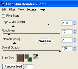 Effetti>Plugins>Alien skin Xenofex 2 - Stain, con i seguenti settaggi, con il colore di primo piano 6b533b.
