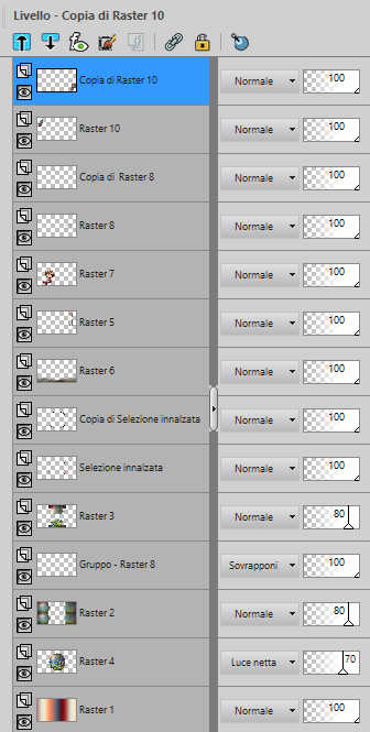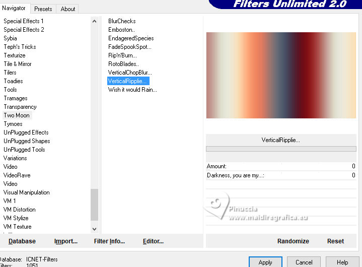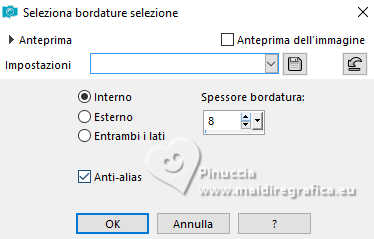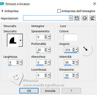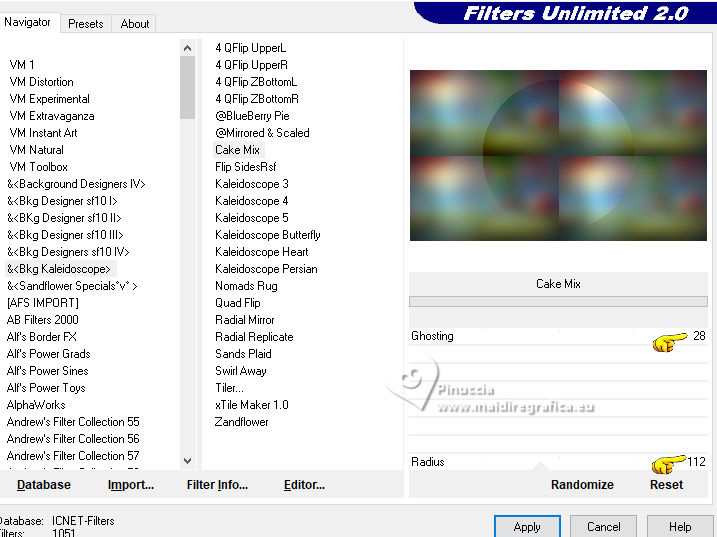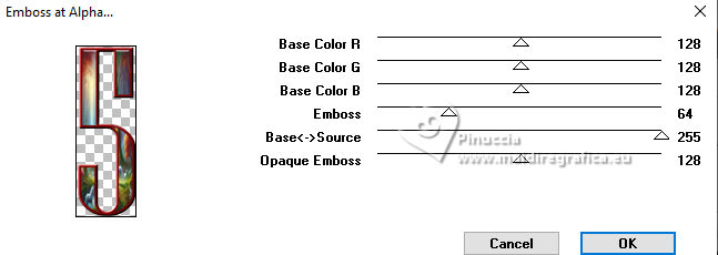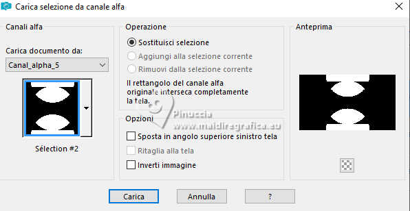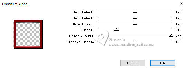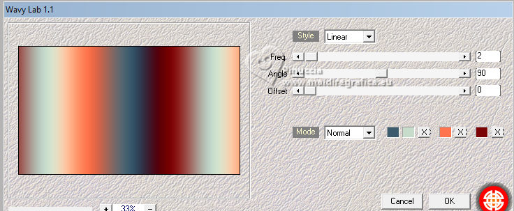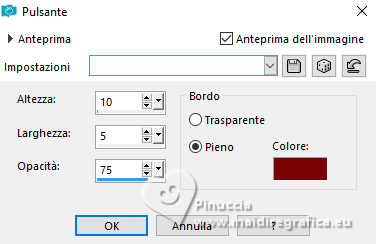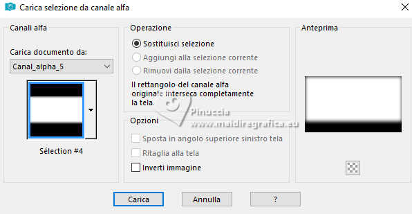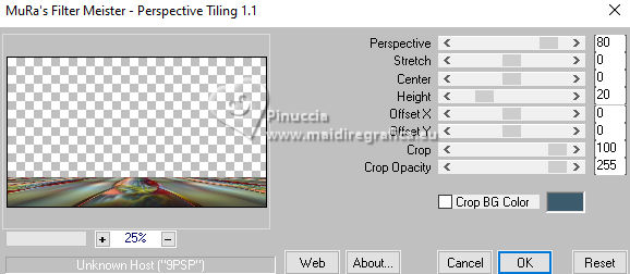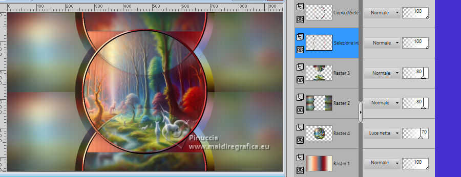 qui puoi trovare qualche risposta ai tuoi dubbi. Se l'argomento che ti interessa non è presente, ti prego di segnalarmelo. Questo tutorial, creato con PSP 2020, è stato tradotto con PSPX9, ma può essere realizzato anche con le altre versioni di PSP. Dalla versione X4, il comando Immagine>Rifletti è stato sostituito con Immagine>Capovolgi in orizzontale, e il comando Immagine>Capovolgi con Immagine>Capovolgi in verticale. Nelle versioni X5 e X6, le funzioni sono state migliorate rendendo disponibile il menu Oggetti. Con la nuova versione X7, sono tornati Rifletti>Capovolgi, ma con nuove varianti. Vedi la scheda sull'argomento qui English Translation qui ![]() Occorrente: ![]() Altri personaggi sul tema qui (non utilizzare per altri tutorial) (in questa pagina trovi i links ai siti dei creatori del materiale) ![]() se hai problemi con i filtri, consulta la mia sezione filtri qui Filters Unlimited 2.0 qui &<Bkg Kaleidoscope> qui Two Moon - Vertical Ripplie qui Mura's Meister - Perspective Tiling qui Mura's Seamless - Emboss at Alpha qui Mehdi - Wavy Lab 1.1 qui Se necessario (facoltativo) Adjust>Variations qui I filtri Two Moon e Mura's Seamless si possono usare da soli o importati in Filters Unlimited (come fare vedi qui) Se un filtro fornito appare con questa icona ![]() non esitare a cambiare modalità di miscelatura e opacità secondo i colori utilizzati. ![]() Se hai problemi con il canale alfa, apri una nuova immagine trasparente 950 x 550 pixels, e usa le selezioni da disco. Imposta il colore di primo piano con #e7dccb, e il colore di sfondo con #3c5b6d. ![]() colore 3: #ff744c colore 4: #7b0305 1. Apri Canal_alpha_5 Questa immagine, che sarà la base del tuo lavoro non è vuota, ma contiene le selezioni salvate sul canale alfa. Effetti>Plugins>Mehdi - Wavy Lab 1.1. Questo filtro crea gradienti con i colori della paletta: il primo è il colore di sfondo, il secondo è il colore di primo piano. Cambia gli ultimi due colori creati dal filtro: il terzo con il colore 3 #ff744c, e il quarto con il colore 4 #7b0305. ![]() Regola>Sfocatura>Sfocatura gaussiana - raggio 50. ![]() 2. Effetti>Plugins>Filters Unlimited 2.0 - Two Moon - VerticalRipplie. ![]() 3. Livelli>Nuovo livello raster. Selezione>Seleziona tutto. Apri l'immagine Paysage imaginaire1_AIgen_par MM ![]() Modifica>Copia. Torna al tuo lavoro e vai a Modifica>Incolla nella selezione. Regola>Sfocatura>Sfocatura gaussiana, con i settaggi precedenti. Effetti>Plugins>Filters Unlimited 2.0 - &<Bkg Kaleidoscope> - Cake Mix ![]() Selezione>Deseleziona. 4. Selezione>Carica/Salva selezione>Carica selezione da canale alfa. La selezione sélection 1 è subito disponibile. Devi soltanto cliccare Carica. ![]() Premi sulla tastiera il tasto CANC ![]() ![]() Selezione>Deseleziona. Effetti>Effetti di immagine>Motivo unico. ![]() Abbassa l'opacità di questo livello all'80% (adatta al tuo lavoro). 5. Livelli>Nuovo livello raster. Selezione>Carica/Salva selezione>Carica selezione da canale alfa. Apri il menu delle selezioni e carica la selezione sélection 2 ![]() Modifica>Incolla nella selezione (il paesaggio è ancora in memoria). Effetti>Plugins>Filters Unlimited 2.0 - Special Effects 1 - Focal Blur. ![]() Selezione>Deseleziona. Abbassa l'opacità di questo livello all'80% (adatta al tuo lavoro) Effetti>Effetti 3D>Sfalsa ombra, colore 4 #7b0305. ![]() 6. Attiva il livello Raster 1. Livelli>Nuovo livello raster. Selezione>Carica/Salva selezione>Carica selezione da canale alfa. Carica nuovamente la selezione sélection 1 ![]() Modifica>Incolla nella selezione (il paesaggio è sempre in memoria). Cambia la modalità di miscelatura di questo livello in Luce netta, e abbassa l'opacità al 70% (adatta ai tuoi colori). Effetti>Plugins>Mura's Seamless - Emboss at Alpha, con i settaggi standard. ![]() Mantieni selezionato. 7. Attiva il livello Raster 1. Selezione>Modifica>Seleziona bordature selezione. ![]() Selezione>Innalza selezione a livello. Livelli>Disponi>Porta in alto. Effetti>Effetti 3D>Pulsante - colore 4 #7b0305. ![]() Effetti>Effetti 3D>Smusso a incasso. ![]() Selezione>Deseleziona. 8. Livelli>Duplica. Attiva il livello sottostante. Effetti>Effetti di immagine>Motivo unico, con i settaggi precedenti. Dovresti avere questo: ![]() 9. Attiva il livello Raster 1. Modifica>Copia Modifica>Incolla come nuova immagine e minimizza questa immagine che ti servirà per i bordi. 10. Attiva il livello superiore. Livelli>Nuovo livello raster. Selezione>Carica/Salva selezione>Carica selezione da canale alfa. Apri il menu delle selezioni e carica la selezione sélection 3 ![]() Attiva nuovamente l'immagine del paesaggio e vai a Modifica>Copia. Torna al tuo lavoro e vai a Modifica>Incolla nella selezione. Mantieni selezionato. 11. Apri déco glass ![]() Modifica>Copia. Torna al tuo lavoro e vai a Modifica>Incolla nella selezione. Selezione>Modifica>Seleziona bordature selezione. ![]() Imposta il colore di sfondo con il colore 4 #7b0305. ![]() Riempi la selezione con il colore 4.Effetti>Plugins>Mura's Seamless - Emboss at Alpha, con i settaggi standard. ![]() Selezione>Deseleziona. 12. Immagine>Ridimensiona, al 70%, tutti i livelli non selezionato. Tasto K per attivare lo strumento Puntatore ![]() Posizione X: 766,00 - Posizione Y: 20,00. ![]() Tasto M per deselezionare lo strumento. 13. Chiudi questo livello. Modifica>Copia Speciale>Copia Unione. Modifica>Incolla come nuovo livello. Effetti>Plugins>Mura's Meister - Perspective Tiling. ![]() Selezione>Carica/Salva selezione>Carica selezione da canale alfa. Apri il menu delle selezioni e carica la selezione sélection 4 ![]() Premi 3 volte sulla tastiera il tasto CANC. Selezione>Deseleziona. Effetti>Effetti di distorsione>Distorsione, con i settaggi standard. ![]() Livelli>Disponi>Sposta giù. 14. Riapri e attiva il livello superiore. 15. Apri il tube young 1_AIgen&tubeMM ![]() Cancella il watermark e vai a Modifica>Copia. Torna al tuo lavoro e vai a Modifica>Incolla come nuovo livello. Immagine>Ridimensiona,