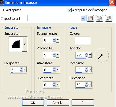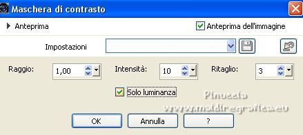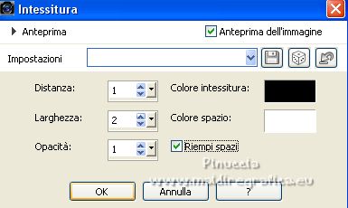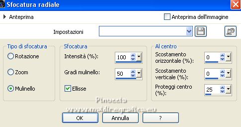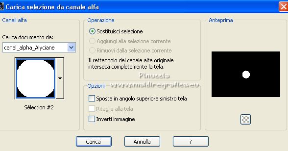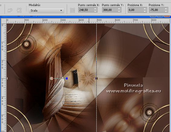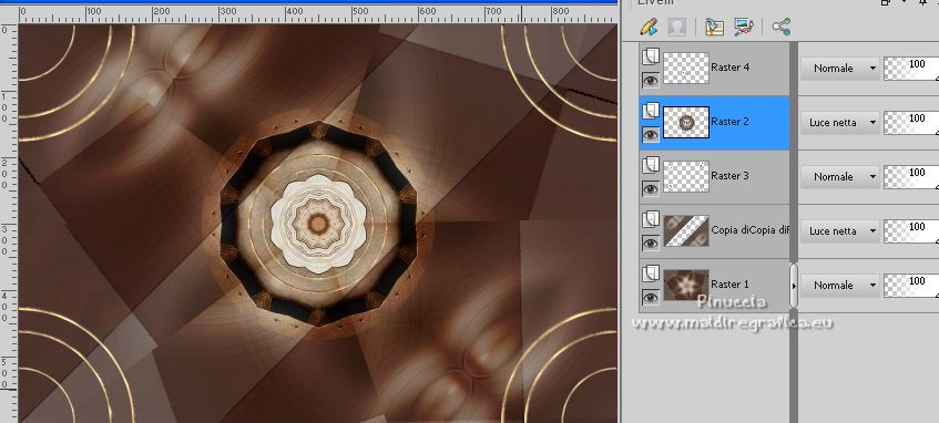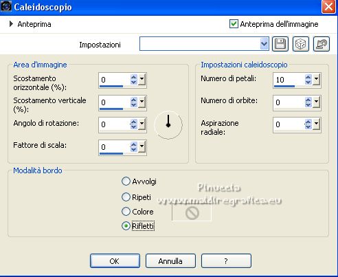 qui puoi trovare qualche risposta ai tuoi dubbi. Se l'argomento che ti interessa non è presente, ti prego di segnalarmelo. Questo tutorial è stato realizzato con PSP Ultimate 2019 e tradotto con PSPX7, ma può essere realizzato anche con le altre versioni di PSP. Dalla versione X4, il comando Immagine>Rifletti è stato sostituito con Immagine>Capovolgi in orizzontale, e il comando Immagine>Capovolgi con Immagine>Capovolgi in verticale. Nelle versioni X5 e X6, le funzioni sono state migliorate rendendo disponibile il menu Oggetti. Con la nuova versione X7, sono tornati Rifletti>Capovolgi, ma con nuove varianti. Vedi la scheda sull'argomento qui English Translation qui/here![]() Occorrente: ![]() Grazie: per i tubes CibiBijoux e Luz Cristina. Il resto del materiale è di Moi-Même. (in questa pagina trovi i links ai siti dei creatori del materiale) ![]() se hai problemi con i filtri, consulta la mia sezione filtri qui Filters Unlimited 2.0 qui <Bkg Designer sf10I> - Corner Half Wrap (da importare in Unlimited) qui <Background Designers IV> - sf10 Diamond Flip, Kaleidoscope 3, sf10 Slice N Dice (da importare in Unlimited) qui FM Tile Tools - Blend Emboss qui Jeux de lignes - Entrelacement qui Alien Skin Eye Candy 5 Impact - Brushed Metal, Glass, Perspective Shadow qui I filtri Jeux de lignes si possono usare da soli o importati in Filters Unlimited (come fare vedi qui) Se un filtro fornito appare con questa icona ![]() non esitare a cambiare modalità di miscelatura e opacità secondo i colori utilizzati. ![]() Se hai problemi con il canale alfa, apri una nuova immagine trasparente 900 x 600 pixels, e usa la selezioni da disco. 1. Imposta il colore di primo piano con il colore chiaro #cac8bc, e il colore di sfondo con il colore scuro #604e4b. ![]() Apri canal alpha_alyciane Questa immagine, che sarà la base del tuo lavoro, non è vuota, ma contiene le selezioni salvate sul canale alfa. Riempi l'immagine trasparente con il colore di sfondo.2. Selezione>Seleziona tutto. Apri il tube del paesaggio 5068-luzcristina ![]() Modifica>Copia. Minimizza il tube. Torna al tuo lavoro e vai a Modifica>Incolla nella selezione. Selezione>Deseleziona. Regola>Sfocatura>Sfocatura radiale. ![]() Effetti>Effetti di bordo>Aumenta. 3. Livelli>Duplica. Immagine>Ruota per gradi - 90 gradi a sinistra. ![]() Effetti>Effetti 3D>Sfalsa ombra, colore nero. ![]() Effetti>Plugins>Filters Unlimited 2.0 - &<Background Designers IV> - sf10 Diamond Flip, con i settaggi standard. ![]() 4. Livelli>Duplica. Chiudi questo livello e attiva il livello sottostante dell'originale. Cambia la modalità di miscelatura di questo livello in Luce netta, o secondo i tuoi colori. Livelli>Unisci>Unisci giù. Effetti>Plugins>Filters Unlimited 2.0 - &<Background Designers IV> - @Kaleidoscope 3 con i settaggi standard ![]() 5. Modifica>Incolla come nuovo livello (il tube del paesaggio è sempre in memoria). Effetti>Effetti di immagine>Motivo unico, con i settaggi standard. ![]() Effetti>Effetti di riflesso>Caleidoscopio. ![]() (l'effetto varia secondo il tube utilizzato, non ha importanza). 6. Selezione>Carica/Salva selezione>Carica selezione da canale alfa. La selezione sélection #1 è subito disponibile. Devi soltanto cliccare Carica. ![]() Selezione>Inverti. Premi sulla tastiera il tasto CANC ![]() Selezione>Deseleziona. 7. Riapri e attiva il livello superiore. Cambia la modalità di miscelatura di questo livello in Luce netta. Effetti>Plugins>Filters Unlimited 2.0 - &<Bkg Designer sf10I> - Corner Half Wrap. ![]() Effetti>Plugins>Filters Unlimited 2.0 - &<Background Designers IV> - sf10 Slice N Dice ![]() Effetti>Effetti 3D>Sfalsa ombra. ![]() 8. Deco: Livelli>Nuovo livello raster. Selezione>Carica/Salva selezione>Carica selezione da canale alfa. Carica nuovamente la selezione #1 Riempi la selezione con il colore di primo piano.Selezione>Modifica>Contrai - 5 pixels. Premi sulla tastiera il tasto CANC. Selezione>Deseleziona. 9. Livelli>Duplica. Immagine>Ridimensiona, all'80%, tutti i livelli non selezionato. Livelli>Duplica. Immagine>Ridimensiona, al 60%, tutti i livelli non selezionato. Livelli>Unisci>Unisci giù - 2 volte. Effetti>Effetti di immagine>Motivo unico, con i settaggi standard. ![]() 10. Selezione>Seleziona tutto. Selezione>Mobile. Effetti>Plugins>Alien Skin Eye Candy 5 Impact - Brushed Metal - Handbrushed Gold. ![]() Effetti>Effetti 3D>Smusso a incasso. ![]() Selezione>Deseleziona. 11. Selezione>Carica/Salva selezione>Carica selezione da canale alfa. Carica nuovamente la selezione #1 Selezione>Modifica>Espandi - 10 pixels. Modifica>Taglia (per tenere in memoria la parte tagliata). Modifica>Incolla come nuovo livello. Selezione>Deseleziona. 12. Immagine>Ridimensiona, al 60%, tutti i livelli non selezionato. Attiva il secondo livello dal basso. Livelli>Disponi>Sposta su - 2 volte. ![]() Modifica>Taglia 13. Selezione>Carica/Salva selezione>Carica selezione da canale alfa. Apri il menu delle selezioni e carica la selezione #2. ![]() Modifica>Incolla nella selezione. Effetti>Plugins>Alien Skin Eye Candy 5 Impact - Glass seleziona il preset Clear, o altro secondo il tuo lavoro. ![]() Selezione>Deseleziona. 14. Attiva il livello superiore. Livelli>Unisci>Unisci giù. Immagine>Ridimensiona, al 50%, tutti i livelli non selezionato. Tasto K per attivare lo strumento Puntatore ![]() imposta Posizione X: 58,00 e Posizione Y: 60,00. ![]() Tasto M per deselezionare lo strumento. 15. Livelli>Duplica. Immagine>Rifletti. Immagine>Capovolgi. Livelli>Unisci>Unisci giù. Effetti>Effetti 3D>Sfalsa ombra, colore nero. ![]() 16. Attiva il livello sottostante. Immagine>Ridimensiona, al 110%, tutti i livelli non selezionato. Effetti>Effetti 3D>Sfalsa ombra, con i settaggi precedenti. 17. Attiva il livello inferiore, Raster 1. Attiva nuovamente il tube del paesaggio e vai a Modifica>Copia. Torna al tuo lavoro e vai a Modifica>Incolla come nuovo livello. Effetti>Plugins>FM Tile Tools - Blend Emboss, con i settaggi standard. ![]() Oggetti>Allinea>Sinist