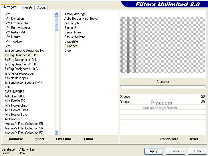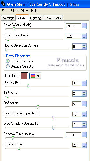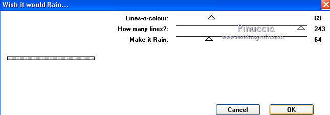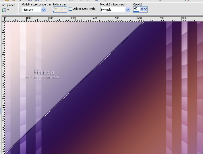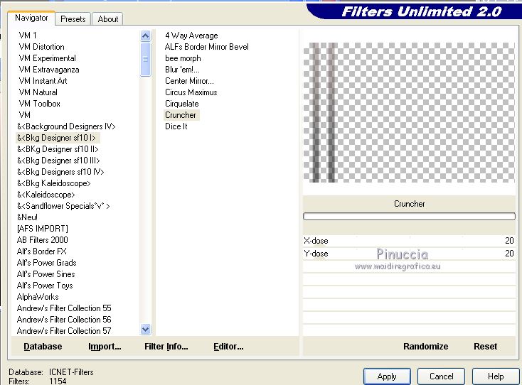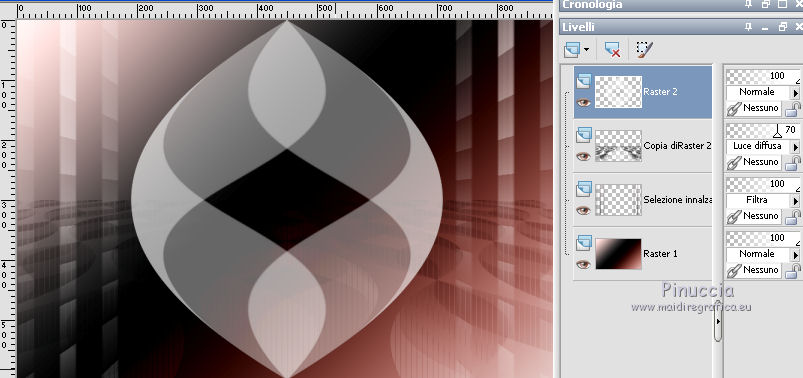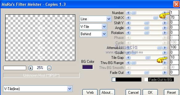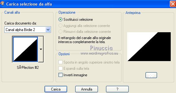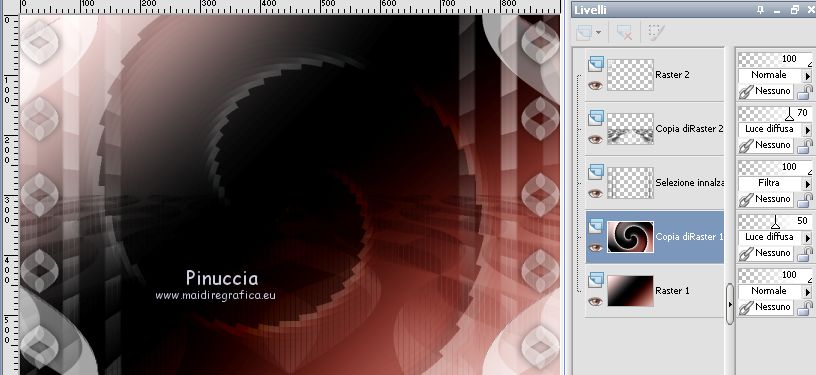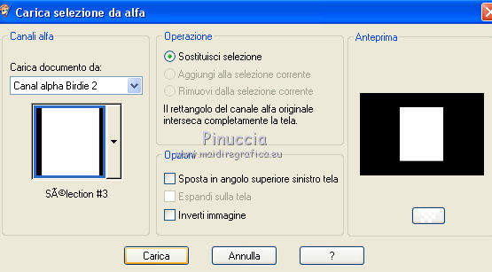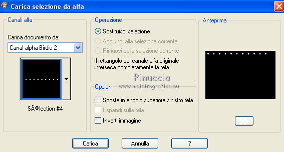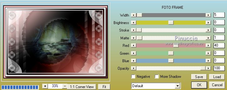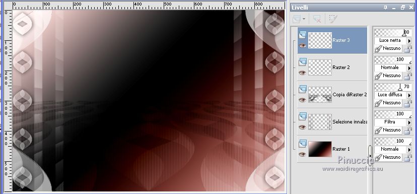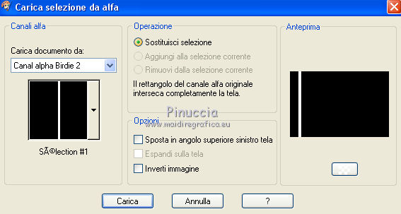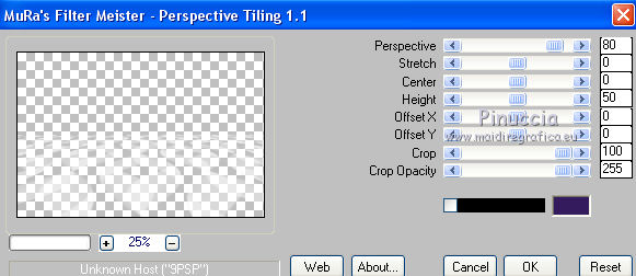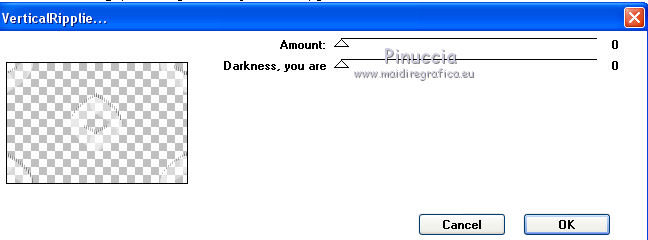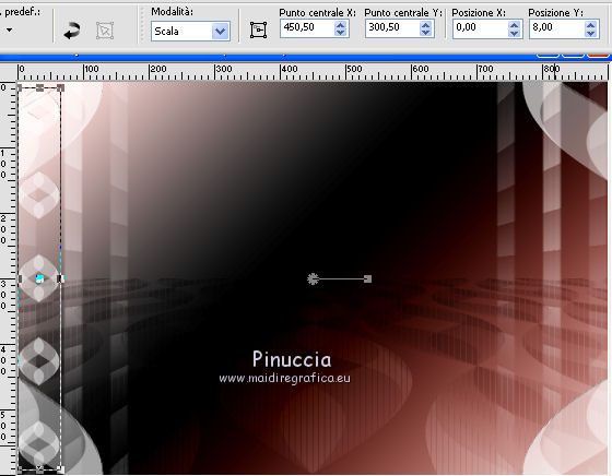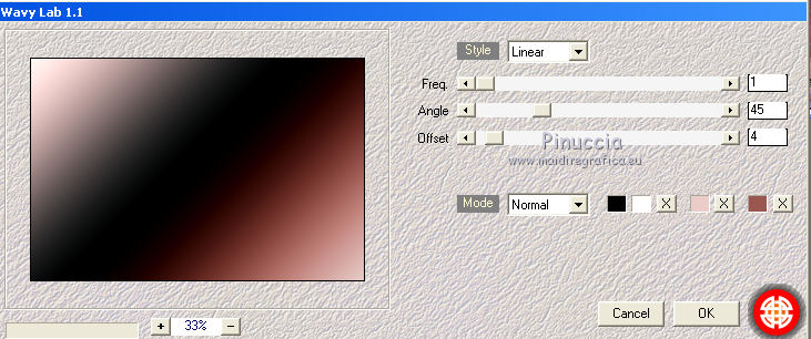 qui puoi trovare qualche risposta ai tuoi dubbi. Se l'argomento che ti interessa non è presente, ti prego di segnalarmelo. Questo tutorial è stato realizzato con Corel2020 e tradotto con CorelX7, ma può essere realizzato anche con le altre versioni di PSP. Dalla versione X4, il comando Immagine>Rifletti è stato sostituito con Immagine>Capovolgi in orizzontale, e il comando Immagine>Capovolgi con Immagine>Capovolgi in verticale. Nelle versioni X5 e X6, le funzioni sono state migliorate rendendo disponibile il menu Oggetti. Con la nuova versione X7, sono tornati Rifletti>Capovolgi, ma con nuove varianti. Vedi la scheda sull'argomento qui Occorrente: Materiale qui Per i tubes grazie Tine e Kahlan. Il resto del materiale è di Moi-même. (in questa pagina trovi i links ai siti dei creatori del materiale) Filtri: se hai problemi con i filtri, consulta la mia sezione filtri qui Filters Unlimited 2.0 qui &<Bkg Designer sf10I> - Cruncher (da importare in Unlimited) qui Two Moon - Vertical Ripplie, Wish it would rain, Rotoblades, Rip'n-Burn, Swirles qui nel materiale trovi il filtro in files ffx da importare in Unlimited) Mehdi - Wavy Lab 1.1. qui Mura's Meister - Perspective Tiling qui Mura's Meister - Copies qui Flaming Pear - Flexify 2 qui AAA Frames - Foto Frame qui Xero - Ultraviolet qui I filtri Two Moon si possono usare da soli o importati in Filters Unlimited (come fare vedi qui) Se un filtro fornito appare con questa icona ![]() non esitare a cambiare modalità di miscelatura e opacità secondo i colori utilizzati. Imposta il colore di primo piano con #ffffff, e il colore di sfondo con #010000. ![]() 1. Apri canal_alpha birdie2 2. L'immagine, che sarà la base del tuo lavoro, non è vuota, ma contiene le selezioni salvate sul canale alfa. (se hai problemi con il canale alfa, apri una nuova immagine trasparente 900 x 600 pixels, e carica le selezioni da disco, usando le selezioni fornite nel materiale). Effetti>Plugins>Mehdi - Wavy Lab 1.1. questo filtro crea gradienti con i colori della paletta: il primo è il colore di primo piano, il secondo quello di sfondo. Cambia gli ultimi due colori creati dal filtro: il terzo con il colore #ecccc7, e il quarto con il colore #995750 ![]() 2. Selezione>Carica/Salva selezione>Carica selezione da canale alpha. La selezione #1 è subito disponibile. Devi soltanto cliccare Carica. se hai problemi con il canale alfa, carica da disco la selezione che trovi nel materiale ![]() Selezione>Innalza selezione a livello. Selezione>Deseleziona. 3. Effetti>Plugins>Filters Unlimited 2.0 - &<Bkg Designer sf10I> - Cruncher, con i settaggi standard. ![]() Ripeti l'Effetto una seconda volta. ![]() 4. Effetti>Plugins>Two Moon - VerticalRipplie, con i settaggi standard. ![]() Effetti>Plugins>Two Moon - RotoBlades, con i settaggi standard. ![]() Livelli>Duplica. Immagine>Rifletti. Livelli>Unisci>Unisci giù. Cambia la modalità di miscelatura di questo livello in Filtra. 5. Livelli>Nuovo livello raster. Selezione>Carica/Salva selezione>Carica selezione da canale alpha. Apri il menu delle selezioni e carica la selezione #2. ![]() Imposta il colore di primo piano con il colore bianco. Abbassa l'opacità dello strumento Riempimento al 40%. Riempi la selezione con il colore bianco.![]() Selezione>Deseleziona. 6. Effetti>Plugins>Flaming Pear - Flexify 2. ![]() se hai problemi con il filtro Flexify, copia e incolla come nuovo livello il risultato che trovi nel materiale, e continua dal punto 7. Livelli>Duplica. Immagine>Rifletti. Livelli>Unisci>Unisci giù. Livelli>Duplica. Immagine>Capovolgi. Livelli>Unisci>Unisci giù. Ripeti Effetti>Plugins>Flaming Pear - Flexify 2, con i settaggi precedenti. ![]() 7. Livelli>Duplica. Effetti>Effetti di immagine>Motivo unico, con i settaggi standard. ![]() Effetti>Plugins>Mura's Meister - Perspective Tiling. ![]() Effetti>Plugins>Two Moon - Rip'n-Burn. ![]() Cambia la modalità di miscelatura di questo livello in Luce diffusa, e abbassa l'opacità al 70%. Regola>Messa a fuoco>Metti a fuoco. Livelli>Disponi>Sposta giù. Effetti>Plugins>Two Moon - Wish it would rain, con i settaggi standard. ![]() 8. Attiva il livello superiore. ![]() Immagine>Ridimensiona, al 50%, tutti i livelli non selezionato. Effetti>Effetti di immagine>Motivo unico, con i settaggi standard. ![]() Effetti>Plugins>Two Moon - VerticalRipplie, con i settaggi standard. ![]() 9. Selezione>Carica/Salva selezione>Carica selezione da canale alpha. Apri il menu delle selezioni e carica la selezione #3. ![]() Modifica>Taglia (per tenere in memoria l'immagine). Modifica>Incolla come nuovo livello. Selezione>Deseleziona. Immagine>Ridimensiona, al 25%, tutti i livelli non selezionato. Effetti>Plugins>Mura's Meister - Copies. ![]() Oggetti>Allinea>Sinistra. Oggetti>Allinea>Centra verticale nella tela Oppure tasto K sulla tastiera per attivare lo strumento Puntatore ![]() e imposta Posizione X: 0,00 e Posizione Y a 8,00. ![]() Effetti>Effetti 3D>Sfalsa ombra, colore nero. ![]() 10. Livelli>Duplica. Immagine>Rifletti. Livelli>Unisci>Unisci giù. Cambia la modalità di miscelatura di questo livello in Luce netta, e abbassa l'opacità all'80%. ![]() Livelli>Unisci>Unisci giù. 11. Livelli>Duplica. Attiva il livello di sfondo. Livelli>Duplica. Effetti>Plugins>Two Moon - Swirler, con i settaggi standard. ![]() Cambia la modalità di miscelatura di questo livello in Luce diffusa, e abbassa l'opacità al 50%. Effetti>Effetti di bordo>Aumenta. ![]() 12. Apri il tube del paesaggio e vai a Modifica>Copia. torna al tuo lavoro e vai a Modifica>Incolla come nuovo livello. Immagine>Ridimensiona, se necessario. Oggetti>Allinea>Centra nella tela Regola>Messa a fuoco>Metti a fuoco, se necessario. Effetti>Plugins>Xero - Ultraviolet, facoltativo (da adattare in base al paesaggio utilizzato) ![]() Abbassa l'opacità di questo livello all'80%. 13. Immagine>Aggiungi bordatura, 1 pixel, simmetriche, colore di sfondo. Immagine>Aggiungi bordatura, 5 pixels, simmetriche, colore di primo piano . Immagine>Agg