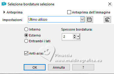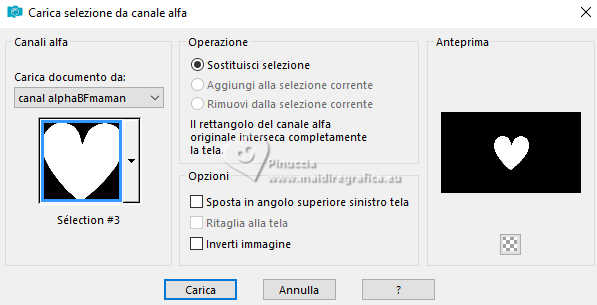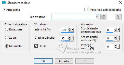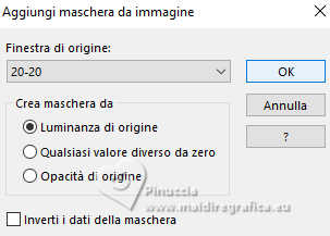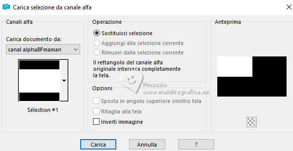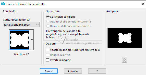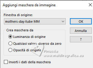 qui puoi trovare qualche risposta ai tuoi dubbi. Se l'argomento che ti interessa non è presente, ti prego di segnalarmelo. Questo tutorial, creato con PSP 2020, è stato tradotto con PSPX9, ma può essere realizzato anche con le altre versioni di PSP. Dalla versione X4, il comando Immagine>Rifletti è stato sostituito con Immagine>Capovolgi in orizzontale, e il comando Immagine>Capovolgi con Immagine>Capovolgi in verticale. Nelle versioni X5 e X6, le funzioni sono state migliorate rendendo disponibile il menu Oggetti. Con la nuova versione X7, sono tornati Rifletti>Capovolgi, ma con nuove varianti. Vedi la scheda sull'argomento qui English Translation qui/here![]() Occorrente: ![]() Per i tubes grazie Elli e Cal. Il resto del materiale è di Moi-Méme. Trovi i tubes a tema di Moi-Méme qui (in questa pagina trovi i links ai siti dei creatori del materiale) ![]() se hai problemi con i filtri, consulta la mia sezione filtri qui Filters Unlimited 2.0 qui &<Kaleidoscope> - Cake Mix, 4QFlip UpperL (da importare in Unlimited) qui Forest AFS - tile - nel materiale, da importare in Unlimited Richard Rosenman - Lens FX qui FM Tile Tools - Blend Emboss qui DSB Flux - Linear Transmission qui Optional: Alien Skin Eye Candy 5 Impact - Extrude qui ![]() non esitare a cambiare modalità di miscelatura e opacità secondo i colori utilizzati. Nelle ultime versioni di PSP non c'é il gradiente di primo piano/sfondo (Corel_06_029) Puoi usare i gradienti delle versioni precedenti. Trovi qui i gradienti Corel X. ![]() Apri la maschera in PSP e minimizza con il resto del materiale (uno dei tube servirà da maschera) Se hai problemi con il canale alfa, apri una nuova immagine trasparente 950 x 550 pixels, e usa le selezioni da disco. 1. Imposta il colore di primo piano con il colore #381526, e il colore di sfondo con il colore nero #000000. ![]() colore 3 bianco #ffffff. Passa il colore di primo piano a Gradiente di primo piano/sfondo, stile Radiale. ![]() 2. Apri canal_alpha_BFmaman Questa immagine, che sarà la base del tuo lavoro non è vuota, ma contiene le selezioni salvate sul canale alfa. Riempi l'immagine trasparente con il gradiente.3. Selezione>Seleziona tutto. Apri il tube Tube maman... ![]() Modifica>Copia. Nota: il tube maman2, che servirà più tardi, contiene una selezione attiva. Se vuoi utilizzare un altro tube, puoi servirti di questo tube come esempio per la tua selezione. Torna al tuo lavoro e vai a Modifica>Incolla nella selezione. Regola>Sfocatura>Sfocatura radiale ![]() Regola>Sfocatura>Sfocatura gaussiana - raggio 30. ![]() Selezione>Deseleziona. 4. Effetti>Plugins>Filters Unlimited 2.0 - &<Bkg Kaleidoscope> - Cake Mix, con i settaggi standard. ![]() Effetti>Effetti di immagine>Motivo unico, con i settaggi standard. ![]() Effetti>Effetti di riflesso>Specchio rotante, con i settaggi standard. ![]() 5. Effeetti>Plugins>Richard Rosenman - Lens FX, con i settaggi standard. ![]() Effetti>Effetti di bordo>Aumenta. Effetti>Effetti di immagine>Motivo unico, con i settaggi standard. Effetti>Plugins>Filters Unlimited 2.0 - Forest AFS - Tile, con i settaggi standard. ![]() 6. Livelli>Nuovo livello raster. Selezione>Carica/Salva selezione>Carica selezione da canale alfa. La selezione sélection 1 è subito disponibile. Devi soltanto cliccare Carica. ![]() Imposta il colore di primo piano con il colore bianco. Riempi la selezione con il colore bianco.7. Apri l'immagine mothers-day-tube MM ![]() Minimizza l'immagine che userai come maschera. Torna al tuo lavoro. Livelli>Nuovo livello maschera>da immagine. Apri il menu sotto la finestra di origine e vedrai la lista dei files aperti. Seleziona l'immagine mothers-day-tube MM ![]() Livelli>Unisci>Unisci gruppo. Selezione>Deseleziona. Effetti>Plugins>Filters Unlimited 2.0 - &<Bkg Kaleidoscope> - 4QFlip UpperL ![]() 8. Attiva il livello sottostante. Livelli>Nuovo livello raster. Selezione>Carica/Salva selezione>Carica selezione da canale alfa. Apri il menu delle selezioni e carica la selezione sélection 2. ![]() Apri il misted CAL-2647-041018 ![]() Cancella il watermark e vai a Modifica>Copia. Torna al tuo lavoro e vai a Modifica>Incolla nella selezione. Livelli>Duplica. Livelli>Unisci>Unisci giù. Immagine>Ridimensiona, al 120%, tutti i livelli non selezionato. Selezione>Modifica>Espandi - 5 pixels. Selezione>Inverti. Premi sulla tastiera il tasto CANC ![]() Selezione>Inverti. Effetti>Plugins>FM Tile Tools - Blend Emboss, con i settaggi standard. ![]() Selezione>Deseleziona. 9. Attiva il livello soprastante. Livelli>Duplica. 10. Attiva nuovamente il livello sottostante. Effetti>Effetti di distorsione>Vento - da destra, intensità 100 ![]() Ripeti Effetti>Effetti di distorsione>Vento - da sinistra, intensità 100 ![]() Effetti>Plugins>DSB Flux - Linear Transmission. ![]() Cambia la modalità di miscelatura di questo livello in Luce diffusa. Di nuovo Effetti>Plugins>FM Tile Tools - Blend Emboss, con i settaggi standard. ![]() 11. Attiva il livello soprastante. Effetti>Effetti 3D>Sfalsa ombra, colore nero. ![]() 12. Apri déco horizontale 1 ![]() Cancella il watermark e vai a Modifica>Copia. Torna al tuo lavoro e vai a Modifica>Incolla come nuovo livello. Non spostarlo. 13. Attiva il livello di sfondo, Raster 1. ![]() Selezione>Seleziona tutto. Selezione>Modifica>Contrai - 40 pixels. Selezione>Inverti. Selezione>Innalza selezione a livello. Effetti>Plugins>DSB Flux - Linear Transmission, con i settaggi precedenti. 14. Se hai problemi a usare il filtro che segue, trovi l'effetto Extrude nel materiale, da copiare/incollare nella selezione e adattare ai tuoi colori. Effetti>Plugins>Alien Skin Eye Candy 5 Impact - Extrude Setting: Centered,Small Taper ![]() Effetti>Effetti di bordo>Aumenta. Mantieni selezionato. 15. Selezione>Modifica>Seleziona bordature selezione. ![]() Riempi la selezione con il colore bianco.Effetti>Effetti di bordo>Aumenta. Selezione>Deseleziona. Livelli>Disponi>Porta in alto. Effetti>Effetti di riflesso>Specchio rotante, con i settaggi pr