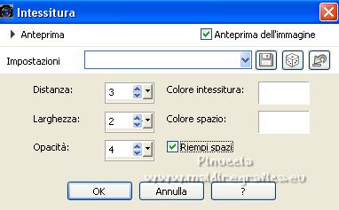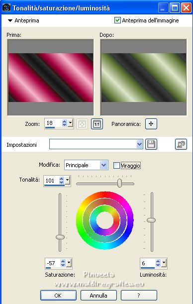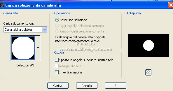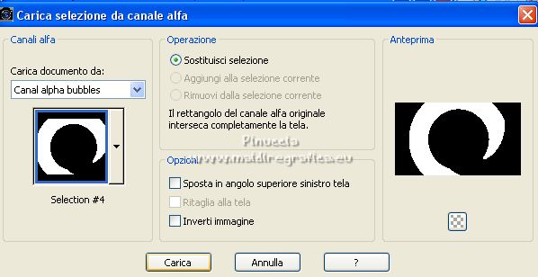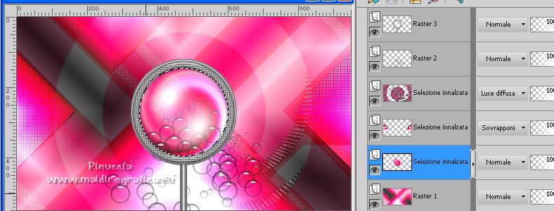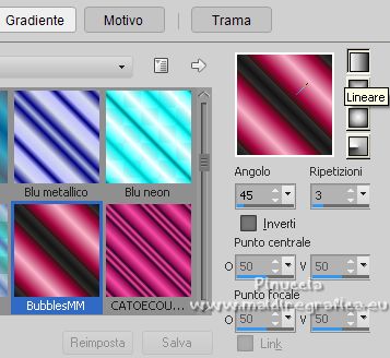 qui puoi trovare qualche risposta ai tuoi dubbi. Se l'argomento che ti interessa non è presente, ti prego di segnalarmelo. Questo tutorial è stato realizzato con PSP Ultimate 2019 e tradotto con PSPX7, ma può essere realizzato anche con le altre versioni di PSP. Dalla versione X4, il comando Immagine>Rifletti è stato sostituito con Immagine>Capovolgi in orizzontale, e il comando Immagine>Capovolgi con Immagine>Capovolgi in verticale. Nelle versioni X5 e X6, le funzioni sono state migliorate rendendo disponibile il menu Oggetti. Con la nuova versione X7, sono tornati Rifletti>Capovolgi, ma con nuove varianti. Vedi la scheda sull'argomento qui English Translation qui/here![]() Occorrente: ![]() Per il tube grazie AnaRidzi. Il paesaggio viene da Internet. Il resto del materiale è di Moi-Même. (in questa pagina trovi i links ai siti dei creatori del materiale) ![]() se hai problemi con i filtri, consulta la mia sezione filtri qui Filters Unlimited 2.0 qui Funhouse - Perverse, Gyro - nel materiale Déformation (D-formation) - Circulator - nel materiale. AAA Frames - Texture Frame qui AP Lines - Lines SilverLining qui ![]() non esitare a cambiare modalità di miscelatura e opacità secondo i colori utilizzati. ![]() Metti il gradiente nella cartella Gradienti. Se hai problemi con il canale alfa, apri una nuova immagine trasparente 950 x 550 pixels, e usa la selezioni da disco. 1. Se usi altri colori, scegli colori vivi. Imposta il colore di primo piano con il colore chiaro #f7b4c9, e il colore di sfondo con il colore scuro #a5033e. ![]() Passa il colore di primo piano a Gradiente e seleziona il gradiente Bubbles MM, stile Lineare. ![]() Per adattare il gradiente ai tuoi colori, puoi cambiare i due colori di destra. ![]() Altra opzione: Regola>Tonalità/Saturazione/Luminosità, come nella mia seconda versione ![]() (adatta ai tuoi colori) 2. Apri canal alpha_bubbles Questa immagine, che sarà la base del tuo lavoro, non è vuota, ma contiene le selezioni salvate sul canale alfa. Riempi l'immagine trasparente con il gradiente.Selezione>Carica/Salva selezione>Carica selezione da canale alfa. La selezione sélection #1 è subito disponibile. Devi soltanto cliccare Carica. ![]() Selezione>innalza selezione a livello. Effetti>Effetti di trama>Intessitura, entrambi i colori bianco. ![]() Effetti>Effetti 3D>Smusso a incasso. ![]() Selezione>Deseleziona. 3. Effetti>Plugins>Filters Unlimited 2.0 - Deformation - Circulator, con i settaggi standard. ![]() attenzione: se stai usando la versione di Unlimited che non si installa perchè composta da files in formato 8bf, avrai un risultato differente. ![]() Effetti>Effetti 3D>Sfalsa ombra, colore nero. ![]() Regola>Messa a fuoco>Metti a fuoco. Cambia la modalità di miscelatura di questo livello in Luce diffusa, o secondo i tuoi colori. 4. Attiva il livello inferiore, Raster 1. Effetti>Plugins>Filters Unlimited 2.0 - Funhouse - Perverse. ![]() Selezione>Carica/Salva selezione>Carica selezione da canale alfa. Apri il menu delle selezioni e carica la selezione #2. ![]() Selezione>Innalza selezione a livello. Effetti>Effetti di trama>Intessitura, con i settaggi precedenti. Selezione>Deseleziona. Livelli>Duplica. Immagine>Rifletti. Livelli>Unisci>Unisci giù. Cambia la modalità di miscelatura di questo livello in Sovrapponi. Effetti>Effetti 3D>Sfalsa ombra, con i settaggi precedenti. 5. Attiva il livello superiore. Apri il tube bubbles centre_MM ![]() Cancella il watermark e vai a Modifica>Copia. Torna al tuo lavoro e vai a Modifica>Incolla come nuovo livello. Spostalo in basso.![]() Oppure: Oggetti>Allinea>Inferiore. 6. Apri il tube déco bubbles_MM ![]() Modifica>Copia. Torna al tuo lavoro e vai a Modifica>Incolla come nuovo livello. Spostalo in basso.![]() Oppure: Oggetti>Allinea>Inferiore. 7. Attiva il livello di sfondo, Raster 1. Selezione>Carica/Salva selezione>Carica selezione da canale alfa. Apri il menu delle selezioni e carica la selezione #3. ![]() Selezione>Innalza selezione a livello. Effetti>Plugins>Filters Unlimited 2.0 - Funhouse - Gyro, con i settaggi standard. ![]() 8. Mantieni selezionato. ![]() 9. Livelli>Nuovo livello raster. Apri il tube del paesaggio ![]() (io ho scelto un'immagine in jpg, tu puoi scegliere un misted) Modifica>Copia. Torna al tuo lavoro e vai a Modifica>Incolla nella selezione. (se usi un misted: duplica/unisci giù). Cambia la modalità di miscelatura di questo livello in Luminanza (esistente), o secondo il tube. Selezione>Deseleziona. 10. Attiva nuovamente il livello di sfondo, Raster 1. Selezione>Carica/Salva selezione>Carica selezione da canale alfa. Apri il menu delle selezioni e carica la selezione #4. ![]() Selezione>Innalza la selezione a livello. Regola>Sfocatura>Sfocatura gaussiana - raggio 30. ![]() Cambia la modalità di miscelatura di questo livello in Indebolisci. Selezione>Deseleziona. 11. Immagine>Aggiungi bordatura, 1 pixel, simmetriche, colore #808080. questo colore, come il bianco e nero, è un colore base della paletta dei colori: è il colore grigio scuro della seconda linea ![]() Immagine>Aggiungi bordatura, 2 pixels, simmetriche, colore di sfondo. Immagine>Aggiungi bordatura, 1 pixel, simmetriche, colore #808080. Selezione>Seleziona tutto. 12. Immagine>Aggiungi bordatura, 10 pixels, simmetriche, colore di primo piano. Selezione>Inverti. Riempi la selezione con il gradiente.(ripeti Tonalità/Saturazione/Luminosità, se hai usato questa opzione in precedenza, al punto 1). Effetti>Effetti di bordo>Aumenta di più. Selezione>Deseleziona. 13. Immagine>Aggiungi bordatura, 1 pixel, simmetriche, colore #808080. Immagine>Aggiungi bordatura, 2 pixels, simmetriche, colore di sfondo. Immagine>Aggiungi bordatura, 1 pixel, simmetriche, colore #808080. Selezione>Seleziona tutto. 14. Immagine>Aggiungi bordatura, 10 pixels, simmetriche, colore di primo piano. Selezione>Inverti. Riempi la selezione con il gradiente.(ripeti Tonalità/Saturazione/Luminosità, se hai usato questa opzione in precedenza, al punto 1).