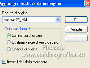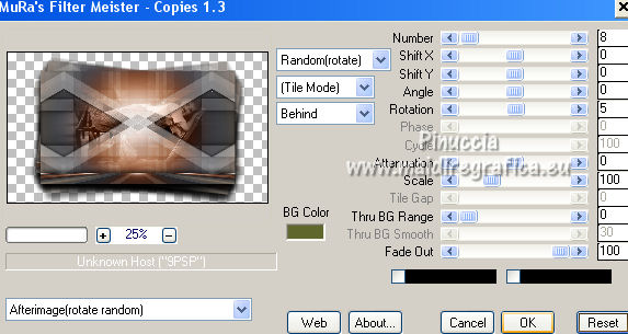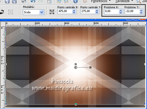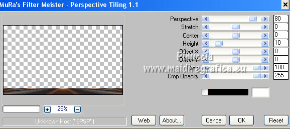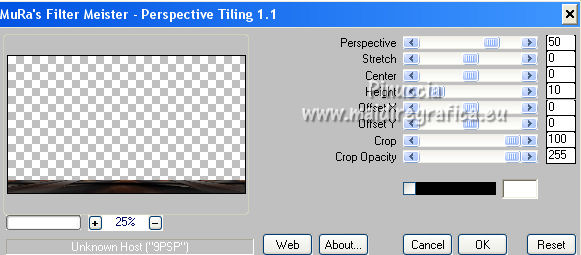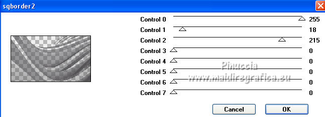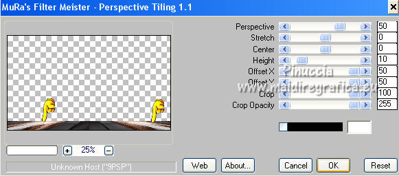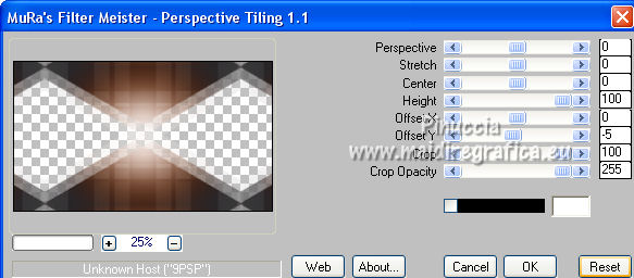 qui puoi trovare qualche risposta ai tuoi dubbi. Se l'argomento che ti interessa non è presente, ti prego di segnalarmelo. Questo tutorial è stato realizzato con Corel2020 e tradotto con CorelX, ma può essere realizzato anche con le altre versioni di PSP. Dalla versione X4, il comando Immagine>Rifletti è stato sostituito con Immagine>Capovolgi in orizzontale, e il comando Immagine>Capovolgi con Immagine>Capovolgi in verticale. Nelle versioni X5 e X6, le funzioni sono state migliorate rendendo disponibile il menu Oggetti. Con la nuova versione X7, sono tornati Rifletti>Capovolgi, ma con nuove varianti. Vedi la scheda sull'argomento qui Occorrente: Materiale qui Il materiale è di Moi-Même. (in questa pagina trovi i links ai siti dei creatori del materiale) Filtri: se hai problemi con i filtri, consulta la mia sezione filtri qui Filters Unlimited 2.0 qui &<Bkg Designer sf10I> - Cruncher (da importare in Unlimited) qui Mehdi - Wavy Lab 1.1 qui AFS IMPORT - sqborder2 qui Alien Skin Eye Candy 5 Impact - Glass, Extrude qui Mura's Meister - Perspective Tiling qui Mura's Meister - Copies qui ![]() non esitare a cambiare modalità di miscelatura e opacità secondo i colori utilizzati. Metti il pennello nella cartella Pennelli. Attenzione, ogni pennello è composto da due files che non devono essere separati. Vedi gli appunti sui pennelli qui Ricordati di cancellare il watermark prima di copiare i tubes, e di non salvare le modifiche quando li chiudi. Il pennello fornito è "orfano", per questo non può essere utilizzato e copiandolo nella cartella Pennelli, darà questo risultato ![]() Vedi gli appunti sui pennelli qui Puoi usare il pennello completo che ho aggiunto nel materiale (ricorda, devi copiare nella cartella pennelli entrambi i files), o copiare/incollare il file in png che Moi-Même ha aggiunto nella sua cartella Apri le maschere in PSP e minimizzale con il resto del materiale. 1. Imposta il colore di primo piano con #282629, e il colore di sfondo con il colore bianco #ffffff. ![]() 1. Apri canal alpha Charlot (dimensione 950 x 550 pixels) Finestra>Duplica o sulla tastiera maiuscola+D per fare una copia. ![]() Chiudi l'originale. La copia, che sarà la base del tuo lavoro, non è vuota, ma contiene le selezioni salvate sul canale alfa. (nel materiale trovi le selezioni da salvare "da disco", in caso di problemi con il canale alfa) Effetti>Plugins>Mehdi - Wavy Lab 1.1. questo filtro lavora con i colori della paletta: il primo è il colore di sfondo, il secondo quello di primo piano; cambia gli ultimi due colori creati dal filtro: il terzo con il colore #685e53 e il quarto con il colore #7d513b. ![]() 2. Livelli>Nuovo livello raster. Riempi il livello con il colore bianco.Livelli>Nuovo livello maschera>Da immagine. Apri il menu sotto la finestra di origine e vedrai la lista dei files aperti. Seleziona la maschera 22_MM. ![]() Livelli>Unisci>Unisci gruppo. Cambia la modalità di miscelatura di questo livello in Luce diffusa. Livelli>Unisci>Unisci giù. 3. Selezione>Carica/Salva selezione>Carica selezione da canale alfa. La selezione #1 è subito disponibile. Devi soltanto cliccare Carica. ![]() Selezione>Innalza selezione a livello (non preoccuparti se non vedi nulla, è normale). Selezione>Deseleziona. 4. Livelli>Duplica. Immagine>Capovolgi. Livelli>Unisci>Unisci giù. Cambia la modalità di miscelatura di questo livello in Filtra. Effetti>Plugins>Filters Unlimited 2.0 - &<Bkg Designer sf10I> - Cruncher. ![]() Effetti>Plugins>Mura's Meister - Perspective Tiling. ![]() Tasto K per attivare lo strumento Puntatore ![]() e imposta Posizione X: 0,00 e Posizione Y: 22,00. ![]() Tasto M per deselezionare lo strumento. 5. Attiva il livello sottostante. Livelli>Duplica. Livelli>Disponi>Porta in alto. Effetti>Plugins>Mura's Meister - Perspective Tiling. ![]() Effetti>Effetti 3D>Sfalsa ombra, colore nero. ![]() 6. Livelli>Nuovo livello raster. Selezione>Carica/Salva selezione>Carica selezione da canale alfa. Apri il menu delle selezioni e carica la selezione #2. ![]() Effetti>Plugins>Alien Skin Eye Candy 5 Impact - Glass. Seleziona il preset Clear e ok. ![]() Selezione>Deseleziona. 7. Livelli>Duplica. Immagine>Rifletti. Livelli>Unisci>Unisci giù. Attiva il livello inferiore. Apri il misted Charlie_temps-modernes e vai a Modifica>Copia. Torna al tuo lavoro e vai a Modifica>Incolla come nuovo livello. Immagine>Rifletti. Cambia la modalità di miscelatura di questo livello in Luminanza (esistente). Livelli>Unisci>Unisci visibile. 8. Livelli>Duplica. Immagine>Ridimensiona, al 75%, tutti i livelli non selezionato. Effetti>Plugins>Alien Skin Eye Candy 5 Impact - Extrude. Seleziona il preset small offset, no smoothing ![]() Effetti>Effetti 3D>Sfalsa ombra, colore nero. ![]() Effetti>Plugins>Mura's Meister - Copies. ![]() 9. Attiva il livello inferiore, Uniti. Regola>Sfocatura>Sfocatura gaussiana - raggio 10. ![]() Livelli>Nuovo livello raster. Riempi il livello con il colore di primo piano.Livelli>Nuovo livello maschera>Da immagine. Apri il menu sotto la finestra di origine e vedrai la lista dei files aperti. Seleziona la maschera immeuble_moderne_mb_0. ![]() Livelli>Unisci>Unisci gruppo. Effetti>Plugins>AFS IMPORT - sqborder2. ![]() Cambia la modalità di miscelatura di questo livello in Sovrapponi, e abbassa l'opacità all'80%. ![]() 10. Attiva il livello superiore. Livelli>Nuovo livello raster. Selezione>Carica/Salva selezione>Carica selezione da canale alfa. Apri il menu delle selezioni e carica la selezione #3. ![]() Riempi la selezione con il colore di primo piano.Effetti>Plugins>Alien Skin Eye Candy 5 Impact - Clear. Selezione>Deseleziona. Livelli>Duplica. Immagine>Rifletti. Livelli>Unisci>Unisci visibile. 11. Livelli>Duplica. Effetti>Plugins>MuRa’s Meister, Perspective tilling. ![]() per il mio esempio ho cambiato i settaggi, per dare un po' di luce al "pavimento" ![]() 12. Immagine>Aggiungi bordatura, 1 pixel, simmetriche, colore di primo piano. Immagine>Aggiungi bordatura, 3 pixels, simme