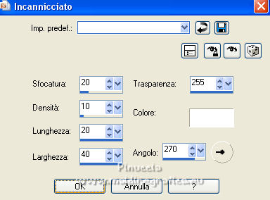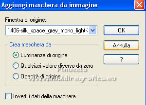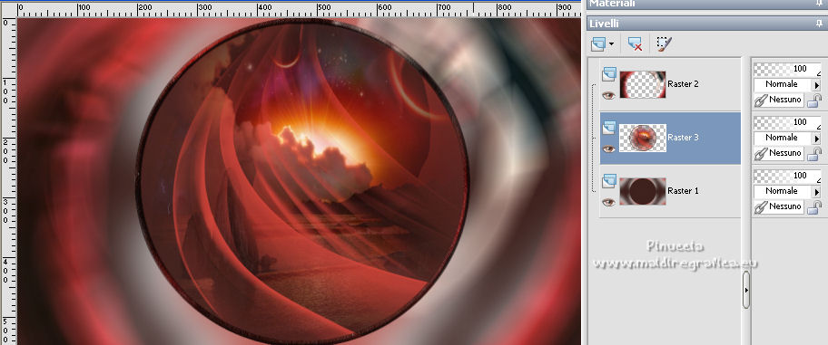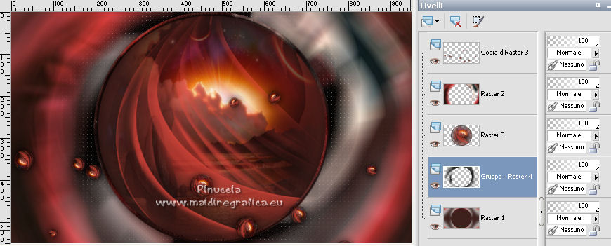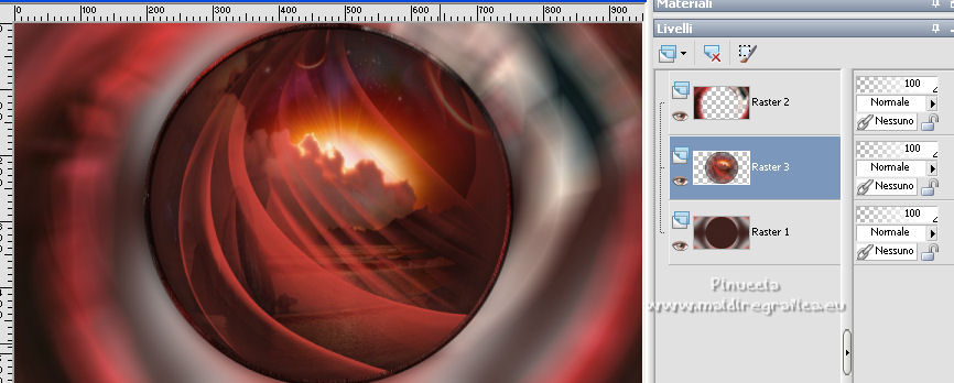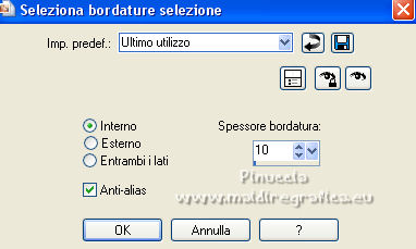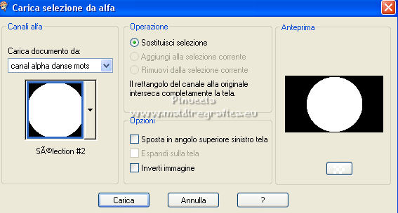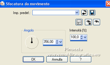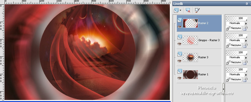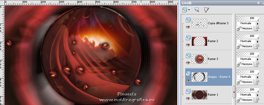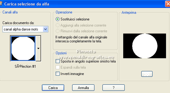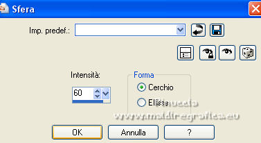 qui puoi trovare qualche risposta ai tuoi dubbi. Se l'argomento che ti interessa non è presente, ti prego di segnalarmelo. Questo tutorial è stato realizzato con Corel2020 e tradotto con CorelX, ma può essere realizzato anche con le altre versioni di PSP. Dalla versione X4, il comando Immagine>Rifletti è stato sostituito con Immagine>Capovolgi in orizzontale, e il comando Immagine>Capovolgi con Immagine>Capovolgi in verticale. Nelle versioni X5 e X6, le funzioni sono state migliorate rendendo disponibile il menu Oggetti. Con la nuova versione X7, sono tornati Rifletti>Capovolgi, ma con nuove varianti. Vedi la scheda sull'argomento qui English translation hereOccorrente: Materiale qui Per i tubes grazie Silvie e AnaRidzi. Una maschera trovata sulla rete. Il resto del materiale è di Moi-Même. (in questa pagina trovi i links ai siti dei creatori del materiale) Filtri: se hai problemi con i filtri, consulta la mia sezione filtri qui Filters Unlimited 2.0 qui Herfs - Fresnel Alpha - nel materiale AP [Lines] - Lines SilverLining qui Mehdi - Wavy Lab 1.1 qui Mura's Meister - Pole Transform qui Mura's Meister - Copies qui ![]() non esitare a cambiare modalità di miscelatura e opacità secondo i colori utilizzati. Ricordati di cancellare il watermark prima di copiare i tubes, e di non salvare le modifiche quando li chiudi. Apri le maschere in PSP e minimizzale con il resto del materiale. 1. Imposta il colore di primo piano con #e3493f, e il colore di sfondo con il colore #3f221e. ![]() 1. Apri canal alpha danse mots (dimensione 950 x 550 pixels) Finestra>Duplica o sulla tastiera maiuscola+D per fare una copia. ![]() Chiudi l'originale. La copia, che sarà la base del tuo lavoro, non è vuota, ma contiene le selezioni salvate sul canale alfa. (nel materiale trovi le selezioni da copia nella cartella Selezione e caricare "da disco", in caso di problemi con il canale alfa) Riempi l'immagine trasparente con il colore di sfondo.2. Livelli>Nuovo livello raster. Effetti>Plugins>Mehdi - Wavy Lab 1.1. questo filtro lavora con i colori della paletta: il primo è il colore di sfondo, il secondo quello di primo piano; cambia gli ultimi due colori creati dal filtro con il colore bianco #ffffff. ![]() Regola>Sfocatura>Sfocatura gaussiana - raggio 30. ![]() Effetti>Plugins>Filters Unlimited 2.0 - Herf - Fresnel alpha, con i settaggi standard ![]() Abbassa l'opacità di questo livello al 70%. Livelli>Unisci>Unisci giù. 3. (Questo effetto può cambiare secondo il tube utilizzato). Livelli>Nuovo livello raster. Selezione>Seleziona tutto. Apri il tube della ballerina e vai a Modifica>Copia. Minimizza il tube. Torna al tuo lavoro e vai a Modifica>Incolla nella selezione. Selezione>Deseleziona. Regola>Sfocatura>Sfocatura da movimento. ![]() 4. Tasto K per attivare lo strumento Puntatore ![]() in modalità Scala ![]() spingi il nodo centrale superiore verso il basso fino a 100 pixels, e il nodo centrale inferiore verso l'alto fino a 450 pixels. (Se non vedi i righelli, vai a Visualizza>Righelli). ![]() Tasto M per deselezionare lo strumento. Effetti>Plugins>Mura's Meister - Pole Transform. ![]() Selezione>Carica/Salva selezione>Carica selezione da canale alfa. La selezione #1 è subito disponibile. Devi soltanto cliccare Carica. ![]() Premi sulla tastiera il tasto CANC ![]() Mantieni selezionato. 5. Attiva il livello sottostante (Raster 1). Livelli>Nuovo livello raster. Riempi il livello con il colore di primo piano.Livelli>Nuovo livello maschera>Da immagine. Apri il menu sotto la finestra di origine e vedrai la lista dei files aperti. Seleziona la maschera 1406-silk_space. ![]() Livelli>Unisci>Unisci gruppo. Mantieni sempre selezionato. 6. Attiva nuovamente il livello sottostante, raster 1. Livelli>Nuovo livello raster. Apri il tube del paesaggio e vai a Modifica>Copia. Torna al tuo lavoro e vai a Modifica>Incolla nella selezione. Selezione>Deseleziona. 8. Attiva il livello superiore. ![]() Modifica>Copia. Livelli>Nuovo livello raster. Selezione>Carica/Salva selezione>Carica selezione da canale alfa. Carica nuovamente la selezione #1. ![]() Selezione>Modifica>Seleziona bordature selezione. ![]() Riempi la selezione con il colore di sfondo.Modifica>Incolla nella selezione (l'immagine in memoria). Effetti>Effetti di trama>Incannicciato. ![]() Effetti>Effetti 3D>Smusso a incasso. ![]() Selezione>Deseleziona. Effetti>Effetti 3D>Sfalsa ombra, colore nero. ![]() 9. Livelli>Disponi>Sposta giù. Livelli>Unisci>Unisci giù - 2 volte. ![]() Effetti>Effetti 3D>Sfalsa ombra, colore nero. ![]() Selezione>Carica/Salva selezione>Carica selezione da canale alfa. Apri il menu delle selezioni e carica la selezione #2 ![]() Effetti>Effetti geometrici>Sfera. ![]() Selezione>Deseleziona. Dovresti avere questo. ![]() 10. Livelli>Duplica. Immagine>Ridimensiona, al 10%, tutti i livelli non selezionato. Livelli>Disponi>Porta in alto. Effetti>Plugins>Mura's Meister - Copies. ![]() Random significa casuale, per questo non potrai avere un risultato uguale al mio, e anche se applichi l'effetto una seconda volta con gli stessi settaggi il risultato sarà sempre differente. Se vuoi cambiarlo, clicca sulla finestra di anteprima finché non vedi il risultato che ti piace di più. ![]() Tasto K per attivare lo strumento Puntatore ![]() e imposta Posizione X: 5,00 e Posizione Y: 188,00. ![]() Tasto M per deselezionare lo strumento. Regola>Messa a fuoco>Metti a fuoco. Effetti>Effetti 3D>Sfalsa ombra, con i settaggi precedenti. 11. Attiva il livello sottostante. ![]() Effetti>Effetti di riflesso>Specchio rotante. ![]() Per il mio esempio, ho saltato questo passaggio, perchè toglieva la parte chiara dell'effetto. ![]() Vedi in fondo al tutorial la tag con questo passaggio. 12. Attiva il livello sottostante, Raster 3. Imposta il colore di primo piano con il colore nero. Livelli>Nuovo livello raster. Riempi il livello con il colore nero.Livelli>Nuovo livello maschera>Da immagine. Apri il menu sotto la finestra di origine e seleziona la maschera Ma