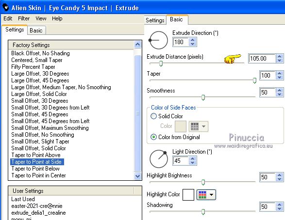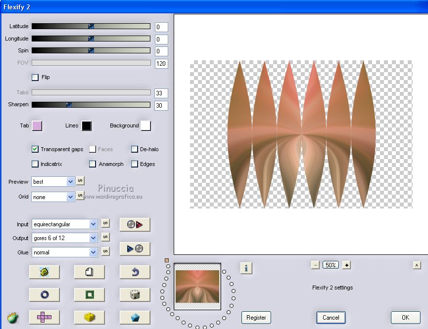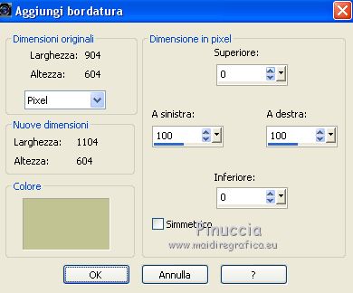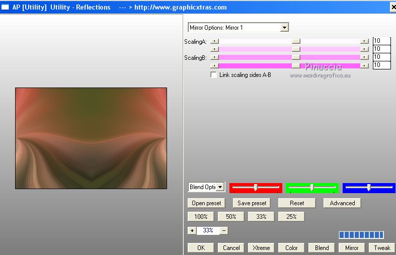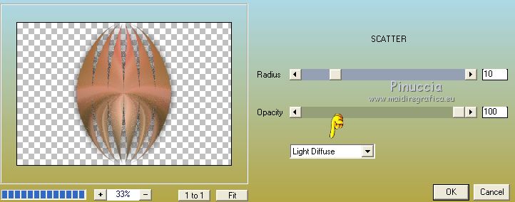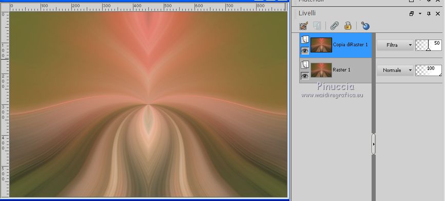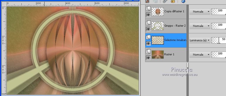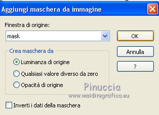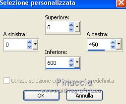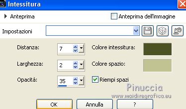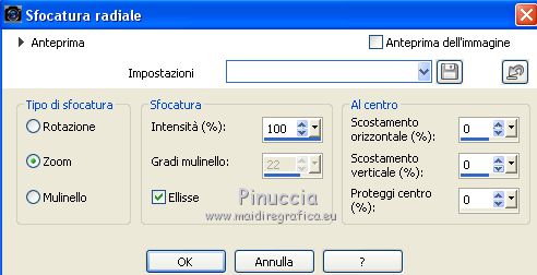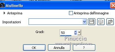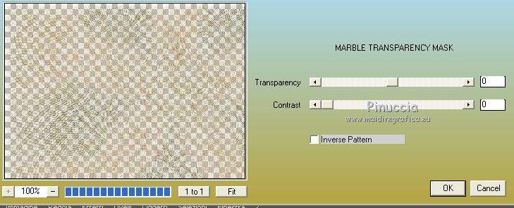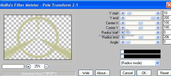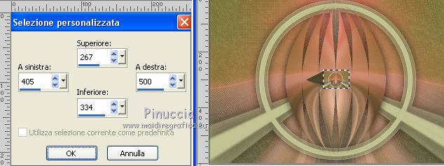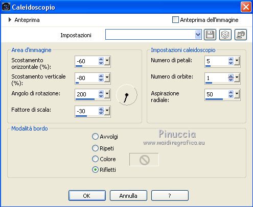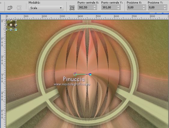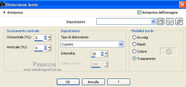 qui puoi trovare qualche risposta ai tuoi dubbi. Se l'argomento che ti interessa non è presente, ti prego di segnalarmelo. Questo tutorial è stato realizzato con Corel2020 e tradotto con CorelX7, ma può essere realizzato anche con le altre versioni di PSP. Dalla versione X4, il comando Immagine>Rifletti è stato sostituito con Immagine>Capovolgi in orizzontale, e il comando Immagine>Capovolgi con Immagine>Capovolgi in verticale. Nelle versioni X5 e X6, le funzioni sono state migliorate rendendo disponibile il menu Oggetti. Con la nuova versione X7, sono tornati Rifletti>Capovolgi, ma con nuove varianti. Vedi la scheda sull'argomento qui Occorrente: Materiale qui Per il tube grazie Tigre Blanc. (in questa pagina trovi i links ai siti dei creatori del materiale) Filtri: se hai problemi con i filtri, consulta la mia sezione filtri qui Flaming Pear - Flexify 2 qui AP Utility - Reflections qui AAA Filters - Scatter qui Mura's Meister - Pole Transform qui Mura's Meister - Copies qui Alien Skin Eye Candy 5 Impact - Extrude qui ![]() non esitare a cambiare modalità di miscelatura e opacità secondo i colori utilizzati. Apri la maschera in PSP e minimizzala con il resto del materiale. Scegli dal tube un colore chiaro e un colore scuro. Se il tuo tube non è così colorato come quello fornito, scegli un colore vivo per il tuo sfondo. Per l'esempio: Imposta il colore di primo piano con il colore #c1c392, e il colore di sfondo con il colore #4c5224. ![]() 1. Apri una nuova immagine trasparente 900 x 600 pixels, e riempila con il colore di sfondo.Selezione>Seleziona tutto. 2. Apri il tube principale e vai a Modifica>Copia. Torna al tuo lavoro e vai a Modifica>Incolla nella selezione. Selezione>Deseleziona. 3. Regola>Sfocatura>Sfocatura radiale. ![]() (ovviamente, il risultato cambia secondo il tube utilizzato). Effetti>Effetti di distorsione>Mulinello. ![]() Effetti>Plugins>AP Utility-Reflections ![]() Ripeti l'Effetto una seconda volta. 4. Livelli>Duplica. Immagine>Capovolgi. Cambia la modalità di miscelatura di questo livello in Filtra, e abbassa l'opacità al 50%. ![]() Livelli>Unisci>Unisci giù. 5. Livelli>Duplica. Effetti>Plugins>Flaming Pear - Flexify 2 ![]() Se hai problemi con questo filtro, trovi nel materiale il risultato finale (ma déco terminé). Copia/incolla come nuovo livello, adatta ai tuoi colori e continua dal punto 6 da copiare/incollare come nuovo livello e adattare ai tuoi colori. Effetti>Effetti geometrici>Cerchio. ![]() Effetti>Effetti 3D>Sfalsa ombra, colore nero. ![]() Effetti>Plugins>AAA Filters - Scatter (light diffuse) ![]() Immagine>Ridimensiona, al 90%, tutti i livelli non selezionato. 6. Attiva il livello sottostante, Raster 1. Livelli>Nuovo livello raster. Riempi il livello con il colore di primo piano.Livelli>Nuovo livello maschera>da immagine. Apri il menu sotto la finestra di origine e vedrai la lista dei files aperti. Seleziona la maschera ![]() Livelli>Duplica. Livelli>Unisci>Unisci gruppo. 7. Effetti>Plugins>Mura's Meister - Pole Transform. ![]() Effetti>Effetti di bordo>Aumenta. Effetti>Effetti 3D>Sfalsa ombra, con i settaggi precedenti. Effetti>Plugins>AAA Filters - Scatter, con i settaggi precedenti. 8. Attiva il livello di sfondo, Raster 1. Attiva lo strumento Selezione ![]() (non importa il tipo di selezione impostato, perchè con la selezione personalizzata si ottiene sempre un rettangolo) clicca sull'icona Selezione personalizzata ![]() e imposta i seguenti settaggi. ![]() Selezione>Innalza selezione a livello. Effetti>Effetti di trama>Intessitura. colore intessitura: colore di sfondo colore spazio: colore di primo piano ![]() Selezione>Deseleziona. Effetti>Effetti di riflesso>Caleidoscopio. ![]() Cambia la modalità di miscelatura di questo livello in Luminanza (esistente) e abbassa l'opacità al 50% (o secondo i tuoi colori). Effetti>Plugins>AAA Filters - Marble Mask, con i settaggi standard. ![]() Risultato ![]() 9. Livelli>Unisci>Unisci visibile. Regola>Messa a fuoco>Metti a fuoco. 10. Immagine>Aggiungi bordatura, 1 pixels, simmetriche, colore di sfondo. Livelli>Duplica. Immagine>Ridimensiona, al 10%, tutti i livelli non selezionato. Effetti>Plugins>Alien Skin Eye Candy 5 Impact - Extrude. Seleziona il preset Taper to point at side e sotto Basic cambia Distance con 150. ![]() 11. Selezione personalizzata ![]() ![]() Premi sulla tastiera il tasto CANC ![]() Selezione>Deseleziona. Immagine>Ridimensiona, al 90%, tutti i livelli non selezionato. Tasto K sulla tastiera per attivare lo strumento Puntatore ![]() e imposta Posizione X e Y a 0,00 ![]() Tasto M per deselezionare lo strumento. Effetti>Plugins>Mura's Meister - Copies. ![]() Oggetti>Allinea>Centra verticale nella tela, o, con lo strumento Puntatore ![]() imposta Posizione X: 0,00 e Posizione Y: 23,00 ![]() 12. Livelli>Duplica. Immagine>Rifletti. Livelli>Unisci>Unisci giù. Effetti>Effetti 3D>Sfalsa ombra, con i settaggi precedenti. 13. Immagine>Aggiungi bordatura, 1 pixel, simmetriche, colore di sfondo. Selezione>Seleziona tutto. Immagine>Aggiungi bordatura, simmetriche non selezionato, colore di primo piano. ![]() Effetti>Effetti di immagine>Motivo unico, con i settaggi standard. ![]() Effetti>Effetti 3D>Sfalsa ombra, con i settaggi precedenti. Selezione>Deseleziona. 14. Livelli>Duplica. Effetti>Effetti di distorsione>Distorsione lente. ![]() Effetti>Effetti 3D>Sfalsa ombra, con i settaggi precedenti. Regola>Messa a fuoco>Metti a fuoco. 15. Attiva il livello sottostante. Regola>Sfocatura>Sfocatura gaussiana - raggio 30. ![]() 16. Attiva il livello soprastante. Apri déco 1, e vai a Modifica>Copia. Torna al tuo lavoro e vai a Modifica>Incolla come nuovo livello. É al suo posto. Cambia la modalità di miscelatura di questo livello in Luce diffusa. 17. Apri déco 2 e vai a Modifica>Copia. Torna al tuo lavoro e vai a Modifica>Incolla come nuovo livello. Immagine>Ridimensiona, al 105%, tutti i livelli non selezionato. Cambia la modalità di miscelatura di questo livello in Luce diffusa. 18. Apr