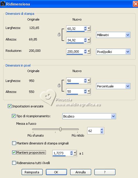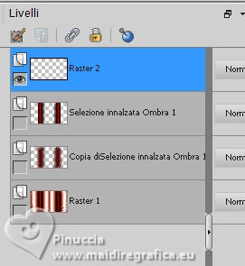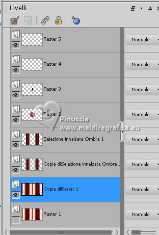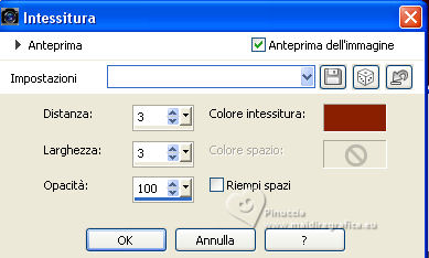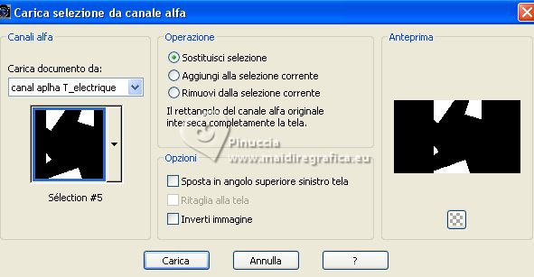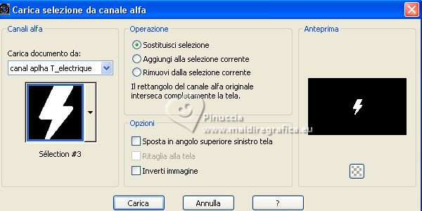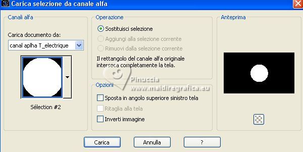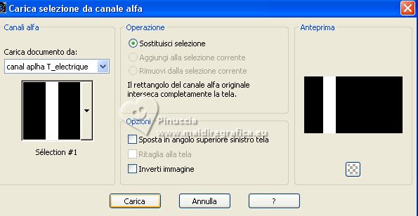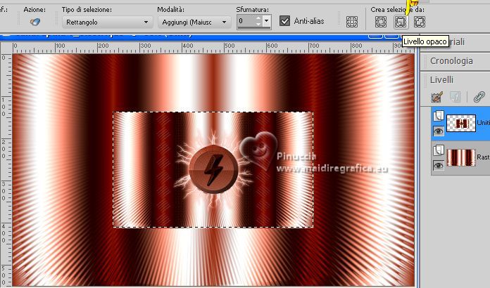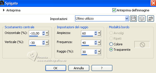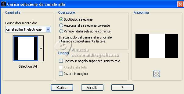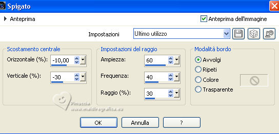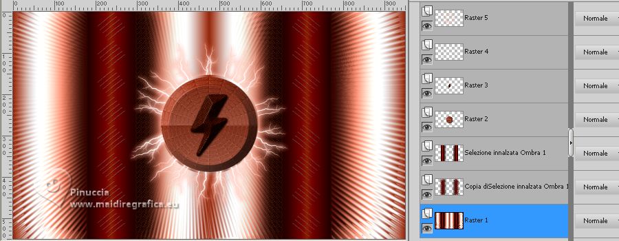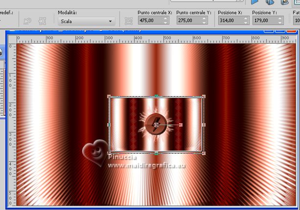 qui puoi trovare qualche risposta ai tuoi dubbi. Se l'argomento che ti interessa non è presente, ti prego di segnalarmelo. Questo tutorial è stato realizzato con PSP Ultimate 2020 e tradotto con PSPX7, ma può essere realizzato anche con le altre versioni di PSP. Dalla versione X4, il comando Immagine>Rifletti è stato sostituito con Immagine>Capovolgi in orizzontale, e il comando Immagine>Capovolgi con Immagine>Capovolgi in verticale. Nelle versioni X5 e X6, le funzioni sono state migliorate rendendo disponibile il menu Oggetti. Con la nuova versione X7, sono tornati Rifletti>Capovolgi, ma con nuove varianti. Vedi la scheda sull'argomento qui English Translation qui/here Le vostre versioni qui![]() Occorrente: ![]() Per il tube grazie Guismo. Il resto del materiale è di Moi-Même. (in questa pagina trovi i links ai siti dei creatori del materiale) ![]() se hai problemi con i filtri, consulta la mia sezione filtri qui Filters Unlimited 2.0 qui Mehdi - Wavy Lab 1.1 qui &<Bkg Kaleidoscope> - @ Mirrored Scaled (da importare in Unlimited) qui &<Background DesignersIV> - @Kaleidoscope 3 (da importare in Unlimited) qui Oliver's - Toile d'araignée qui Alien Skin Eye Candy 5 Impact - Bevel qui I filtri Oliver's si possono usare da soli o importati in Filters Unlimited (come fare vedi qui) Se un filtro fornito appare con questa icona ![]() non esitare a cambiare modalità di miscelatura e opacità secondo i colori utilizzati. Nelle ultime versioni di PSP non c'é il gradiente di primo piano/sfondo (Corel_06_029) Puoi usare i gradienti delle versioni precedenti. Trovi qui i gradienti Corel X. ![]() Se hai problemi con il canale alfa, Apri una nuova immagine trasparente 950 x 550 pixels, e usa le selezioni da disco. Colori ![]() Imposta il colore di primo piano con il colore 1 #ff977c, e il colore di sfondo con il colore #8b1c00. ![]() 1. Apri canal alpha T_electrique Questa immagine non è vuota, ma contiene le selezioni salvate sul canale alfa. Effetti>Plugins>Mehdi - Wavy Lab 1.1. questo filtro lavora con i colori della paletta: il primo é il colore di sfondo, il secondo quello di primo piano; Cambia gli ultimi due colori creati dal filtro: il terzo con il colore 3 #2f0900 e il quarto con il colore 4 #ffffff. ![]() Effetti>Effetti di riflesso>Specchio rotante. ![]() Effetti>Plugins>Filters Unlimited 2.0 - Tile & Mirrored - @Mirrored Scaled. ![]() 2. Selezione>Carica/Salva selezione>Carica selezione da canale alfa. La selezione sélection #1 è subito disponibile. Devi soltanto cliccare Carica. ![]() Selezione>Innalza selezione a livello. Effetti>Effetti geometrici>Cilindro verticale. ![]() Selezione>Deseleziona. Effetti>Effetti 3D>Sfalsa ombra, colore nero, ombra su nuovo livello selezionato. ![]() Rimani sul livello dell'ombra. Effetti>Effetti di trama>Intessitura colore intessitura: colore di sfondo ![]() 3. Attiva il livello superiore. Livelli>Unisci>Unisci giù. Livelli>Duplica. Immagine>Rifletti>Rifletti orizzontale (Immagine>Rifletti) Livelli>Unisci>Unisci giù. 4. Livelli>Duplica. Regola>Sfocatura>Sfocatura gaussiana - raggio 30. ![]() Effetti>Effetti di distorsione>Spigato. ![]() Immagine>Rifletti>Rifletti verticalmente (Immagine>Capovolgi). Ripeti Effetti>Effetti di distorsione>Spigato, con i settaggi precedenti. Livelli>Disponi>Sposta giù. 5. Attiva il livello inferiore, Raster 1. Selezione>Seleziona tutto. Effetti>Effetti di distorsione>Spigato, con gli stessi settaggi, ma seleziona Trasparente. ![]() Selezione>Deseleziona. 6. Attiva il livello superiore. Chiudi tutti i livelli: Livelli>Visualizza>Nessuno 7. Livelli>Nuovo livello raster. ![]() Selezione>Carica/Salva selezione>Carica selezione da canale alfa. Apri il menu delle selezioni e carica la selezione sélection #2. ![]() Passa il colore di primo piano a Gradiente di primo piano/sfondo, stile Lineare. ![]() Riempi la selezione con il gradiente.Effetti>Plugins>Filters Unlimited 2.0 - Oliver's Filters - Toile d'araignée, con i settaggi standard. ![]() Selezione>Deseleziona. Effetti>Plugins>Alien Skin Eye Candy 5 Impact - Bevel Seleziona il preset Flat Edge, small e ok. ![]() 8. Livelli>Nuovo livello raster. Selezione>Carica/Salva selezione>Carica selezione da canale alfa. Apri il menu delle selezioni e carica la selezione sélection #3. ![]() Imposta il colore di primo piano con il colore 3 #2f0900. ![]() Riempi la selezione con il colore di primo piano.Effetti>Effetti di trama>Intessitura, con i settaggi precedenti. ![]() Effetti>Plugins>Alien Skin Eye Candy 5 Impact - Bevel, con i settaggi precedenti. ![]() Selezione>Deseleziona. Effetti>Effetti 3D>Sfalsa ombra, colore nero, ombra su nuovo livello non selezionato. ![]() 9. Modifica>Copia Speciale>Copia Unione. Modifica>Incolla come nuova immagine, e minimizza questa immagine che ti servirà più tardi. 10. Torna al tuo lavoro. Riapri i livelli chiusi: Livelli>Visualizza>Tutto. ![]() 11. Apri déco 1 ![]() Cancella il watermark e vai a Modifica>Copia. Minimizza il tube, perchè ti servirà ancora Torna al tuo lavoro e vai a Modifica>Incolla come nuovo livello. Non spostarlo. 12. Apri déco Electrify ![]() (Colorizza secondo i tuoi colori: Regola>Tonalità e saturazione>Viraggio). Modifica>Copia. Torna al tuo lavoro e vai a Modifica>Incolla come nuovo livello. Non spostarlo. 13. Attiva il livello inferiore, Raster 1. ![]() Livelli>Duplica. Chiudi il livello inferiore e rimani sul livello della copia. ![]() Livelli>Unisci>Unisci visibile. Riapri il livello Raster 1. 14. Rimani sempre sul livello superiore. Immagine>Ridimensiona, al 50%, tutti i livelli non selezionato. ![]() Regola>Messa a fuoco>Metti a fuoco. Attiva lo strumento Selezione ![]() e clicca su Livello opaco ![]() Selezione>Modifica>Seleziona bordature selezione. ![]() Imposta il colore di primo piano con il colore bianco. Riempi la selezione con il colore bianco.Effetti>Plugins>Alien Skin Eye Candy 5 Impact - Bevel Seleziona il preset Flat Edge, large e ok. ![]() Selezione>Deseleziona. Effetti>Effetti 3D>Sfals