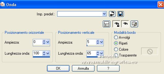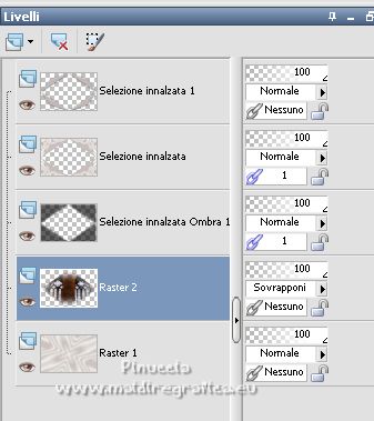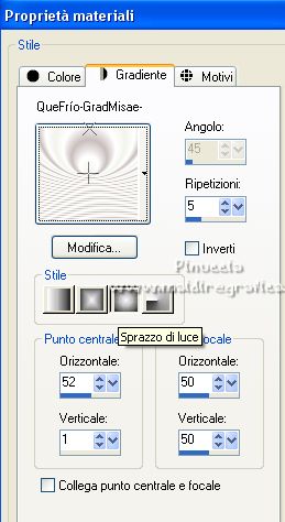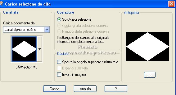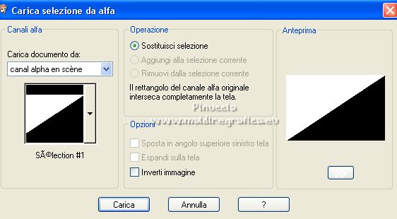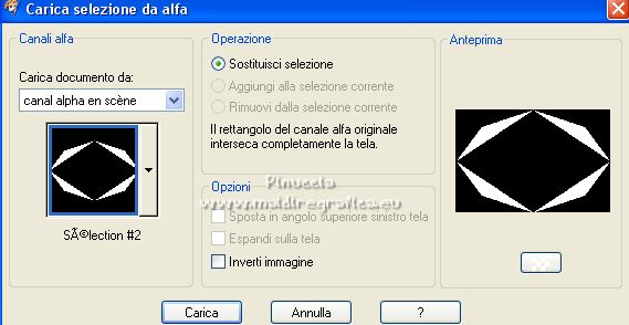 qui puoi trovare qualche risposta ai tuoi dubbi. Se l'argomento che ti interessa non è presente, ti prego di segnalarmelo. Questo tutorial è stato realizzato con PSP Ultimate 2020 e tradotto con PSPX7, ma può essere realizzato anche con le altre versioni di PSP. Dalla versione X4, il comando Immagine>Rifletti è stato sostituito con Immagine>Capovolgi in orizzontale, e il comando Immagine>Capovolgi con Immagine>Capovolgi in verticale. Nelle versioni X5 e X6, le funzioni sono state migliorate rendendo disponibile il menu Oggetti. Con la nuova versione X7, sono tornati Rifletti>Capovolgi, ma con nuove varianti. Vedi la scheda sull'argomento qui English Translation qui/here![]() Occorrente: ![]() Per il misted grazie Nena Silva. Il resto del materiale è di Moi-Même. (in questa pagina trovi i links ai siti dei creatori del materiale) ![]() se hai problemi con i filtri, consulta la mia sezione filtri qui Filters Unlimited 2.0 qui &<Bkg Designer sf10I> - Center Mirror, Alf's Border Mirror Bevel (da importare in Unlimited) qui VM Toolbox - Instant Tile qui Azyzam Designs Filter - Crazy Stripes - nel materiale Carolaine and Sensibility qui I filtri VM Toolbox si possono usare da soli o importati in Filters Unlimited (come fare vedi qui) Se un filtro fornito appare con questa icona ![]() non esitare a cambiare modalità di miscelatura e opacità secondo i colori utilizzati. Nelle ultime versioni di PSP non c'é il gradiente di primo piano/sfondo (Corel_06_029) Puoi usare i gradienti delle versioni precedenti. Trovi qui i gradienti Corel X. ![]() Se hai problemi con il canale alfa, apri una nuova immagine trasparente 900 x 600 pixels, e usa la selezioni da disco. Imposta il colore di primo piano con il colore chiaro #f2f3ed, e il colore di sfondo con il colore scuro #c8bebc. ![]() Passa il colore di primo piano a Gradiente di primo piano/sfondo, stile Sprazzo di luce. ![]() 1. Apri canal alpha_en scène Questa immagine, che sarà la base del tuo lavoro, non è vuota, ma contiene le selezioni salvate sul canale alfa. Riempi l'immagine trasparente con il gradiente.Effetti>Plugins>Filters Unlimited 2.0 - &<Bkg Designer sf10I> - Center Mirror, con i settaggi standard. ![]() 2. Selezione>Carica/Salva selezione>Carica selezione da canale alfa. La selezione sélection #1 è subito disponibile. Devi soltanto cliccare Carica. ![]() Selezione>innalza selezione a livello. Selezione>Deseleziona. Effetti>Plugins>VM Toolbox - Instant Tile, con i settaggi standard. ![]() Effetti>Plugins>Azyzam's Designs Filter - Crazy Stripes. ![]() Effets>Modules Externes>Filters Unlimited 2.0 - &<Bkg Designer sf10I> - Alf's border Mirror Bevel, con i settaggi standard Attenzione: il risultato cambia secondo la versione di Unlimited. Questo dovrebbe essere il risultato, come appare nel tutorial originale, ottenuto usando la versione software di Unlimited. ![]() Con questa versione il risultato è influenzato dal colore di sfondo Vedi i risultati con il colore di sfondo nero e con il colore di sfondo blu ![]() Con la versione di Unlimited che non si installa perchè composta da files in formato 8bf, il risultato sarà sempre questo, qualsiasi colore sia impostato come colore di sfondo ![]() 3. Selezione>Carica/Salva selezione>Carica selezione da canale alfa. Apri il menu delle selezioni e carica la selezione #2. ![]() Selezione>Innalza selezione a livello. se hai usato la versione di Unlimited in file 8bf, puoi eventualmente - se ti sembra il caso - riempire la selezione con il tuo colore di sfondo Effetti>Plugins>Carolaine and Sensibility - CS-DLines, con i settaggi standard. ![]() Effetti>Effetti 3D>Smusso a incasso. ![]() Effetti>Effetti 3D>Sfalsa ombra, colore nero. ![]() Risultato ![]() 4. Attiva il livello sottostante, Selezione innalzata. Effetti>Effetti 3D>Sfalsa ombra, colore nero, ombra su nuovo livello selezionato. ![]() Rimani sul livello dell'ombra. Effetti>Plugins>Carolaine and Sensibility - CS-LDots. ![]() Livelli>Duplica. Immagine>Capovolgi. Livelli>Unisci>Unisci giù. 5. Attiva il livello di sfondo. Livelli>Nuovo livello raster. Selezione>Carica/Salva selezione>Carica selezione da canale alfa. Apri il menu delle selezioni e carica la selezione #3. ![]() Selezione>Modifica>Espandi - 5 pixels. Apri il paesaggio vvs-paisagem0318 ![]() Modifica>Copia. Torna al tuo lavoro e vai a Modifica>Incolla nella selezione. Selezione>Deseleziona. Cambia la modalità di miscelatura di questo livello in Sovrapponi, o secondo il tuo lavoro. La paletta ![]() 6. Attiva il livello di sfondo, Raster 1. Regola>Sfocatura>Sfocatura gaussiana, raggio 10. ![]() 7. Attiva il livello superiore. Apri déco Roses ![]() Cancella il watermark e vai a Modifica>Copia. Torna al tuo lavoro e vai a Modifica>Incolla come nuovo livello. Nota: per cambiare il tuo colore, puoi utilizzare lo strumento Trasforma in destinazione ![]() ![]() e applica il tuo gradiente. Sposta il tube a sinistra.(Oggetti>Allinea>Sinistra). Effetti>Effetti 3D>Sfalsa ombra, colore nero, ombra su nuovo livello selezionato. ![]() Effetti>Plugins>Carolaine and Sensibility - CS_LDots, con i settaggi precedenti. 9. Attiva il livello soprastante. Livelli>Unisci>Unisci giù. Effetti>Effetti di riflesso>Specchio rotante. ![]() 10. Immagine>Aggiungi bordatura, 3 pixels, simmetriche, colore di primo piano. Immagine>Aggiungi bordatura, 3 pixels, simmetriche, colore di sfondo. Selezione>Seleziona tutto. Immagine>Aggiungi bordatura, 60 pixels, simmetriche, colore di primo piano. Selezione>Inverti. Riempi la selezione con il gradiente.Selezione>Innalza selezione a livello. Effetti>Plugins>Azyzam's - Crazy stripes, con i settaggi precedenti. Livelli>Nuovo livello raster. Effetti>Effetti 3D>Ritaglio, colore nero. ![]() Selezione>Inverti. Effetti>Effetti 3D>Ritaglio, con i settaggi precedenti. Effetti>Effetti 3D>Sfalsa ombra, con i settaggi precedenti, ma ombra su nuovo livello non selezionato. ![]() Selezione>Deseleziona. Livelli>Unisci>Unisci giù. 12. Livelli>Duplica. Effetti>Effetti di