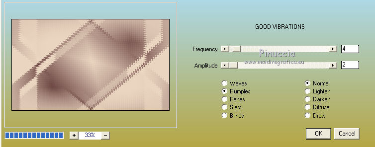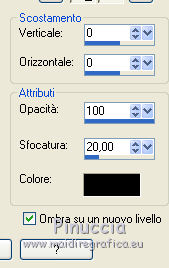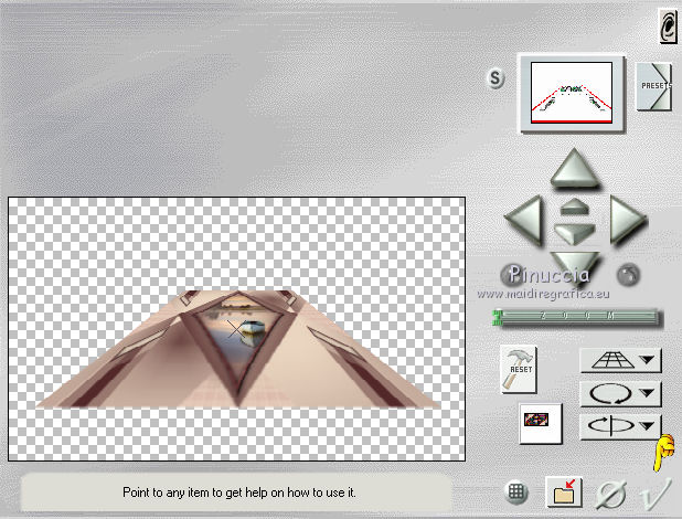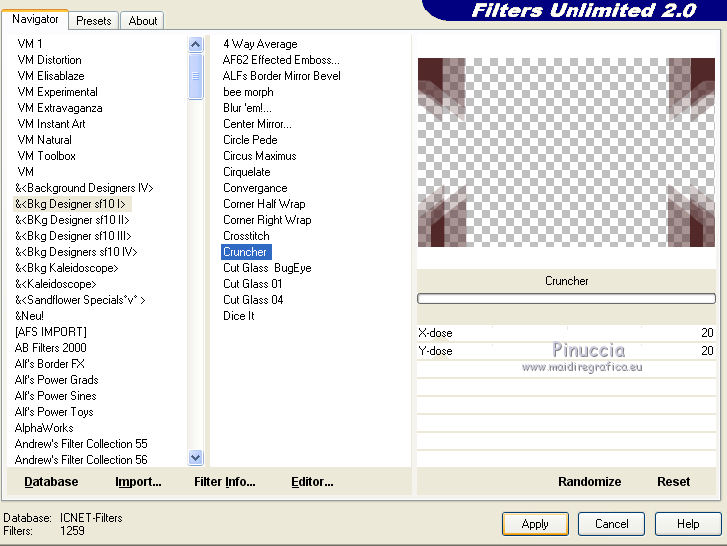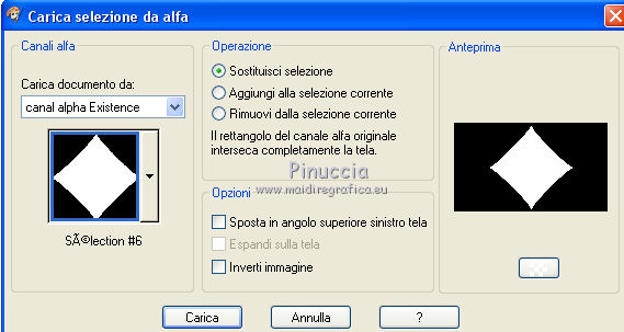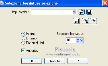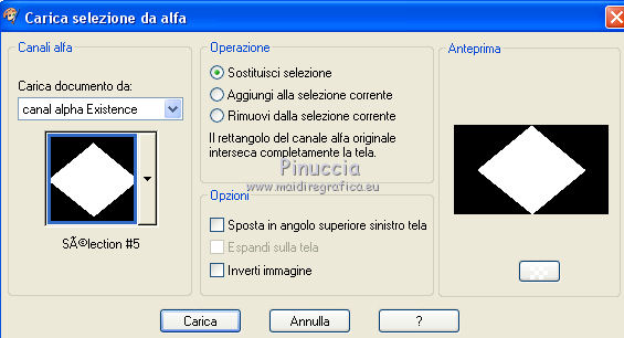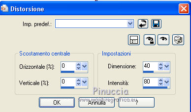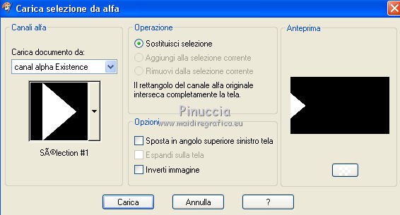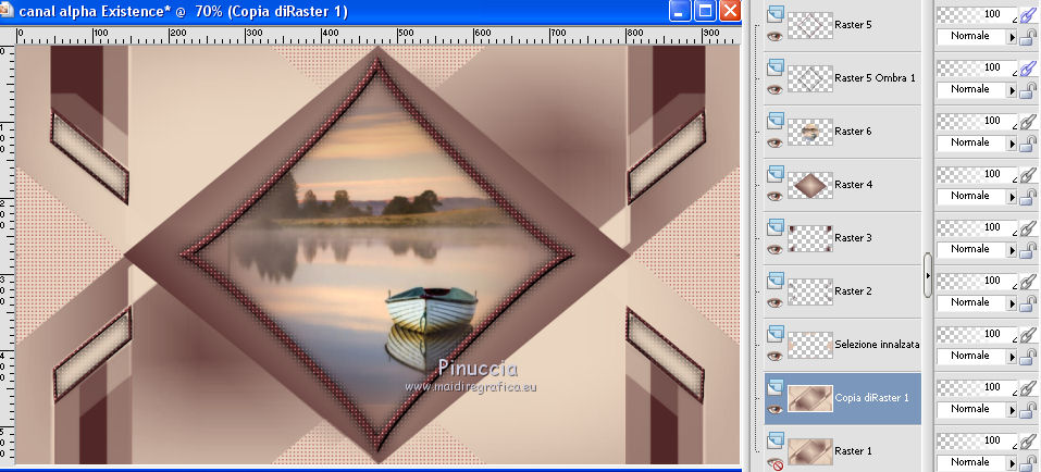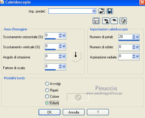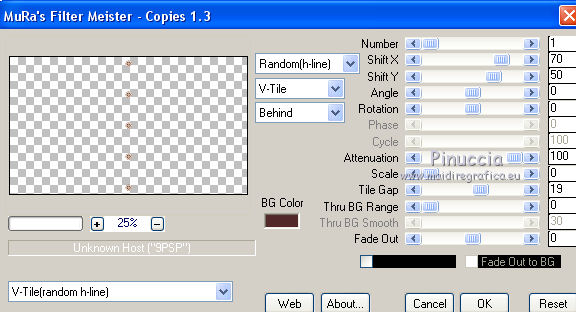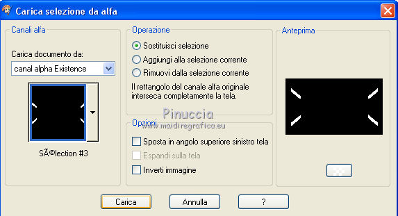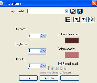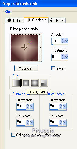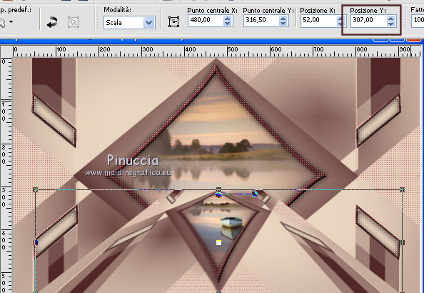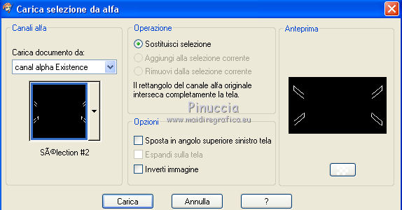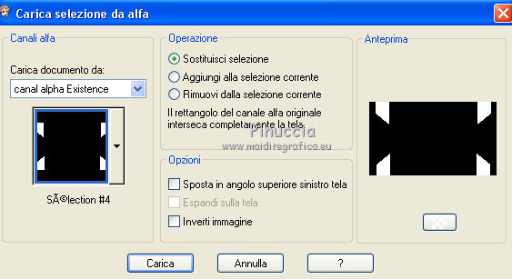 qui puoi trovare qualche risposta ai tuoi dubbi. Se l'argomento che ti interessa non è presente, ti prego di segnalarmelo. Questo tutorial è stato realizzato con Corel2020 e tradotto con CorelX, ma può essere realizzato anche con le altre versioni di PSP. Dalla versione X4, il comando Immagine>Rifletti è stato sostituito con Immagine>Capovolgi in orizzontale, e il comando Immagine>Capovolgi con Immagine>Capovolgi in verticale. Nelle versioni X5 e X6, le funzioni sono state migliorate rendendo disponibile il menu Oggetti. Con la nuova versione X7, sono tornati Rifletti>Capovolgi, ma con nuove varianti. Vedi la scheda sull'argomento qui Occorrente: Materiale qui Per il tube e la maschera grazie Renée e Tine. Il resto del materiale è di Moi-Même. (in questa pagina trovi i links ai siti dei creatori del materiale) Filtri: se hai problemi con i filtri, consulta la mia sezione filtri qui Filters Unlimited 2.0 qui &<Bkg Designer sf10I> - Cruncher (da importare in Unlimited) qui Andromeda - Perspective qui Mura's Meister - Pole Transform qui Mura's Meister - Perspective Tiling qui Alien Skin Eye Candy 5 Impact - Glass qui AAA Frames - Foto Frame qui ![]() non esitare a cambiare modalità di miscelatura e opacità secondo i colori utilizzati. Metti la selezione existence 3 nella cartella Selezioni. Apri le maschere in PSP e minimizzale con il resto del materiale. Ricordati di cancellare il watermark prima di copiare i tubes, e di non salvare le modifiche quando li chiudi. Imposta il colore di primo piano con #ead5c0, e il colore di sfondo con #522829. ![]() 1. Apri canal alpha existence (dimensione 950 x 550 pixels) Finestra>Duplica o sulla tastiera maiuscola+D per fare una copia. ![]() Chiudi l'originale. La copia, che sarà la base del tuo lavoro, non è vuota, ma contiene le selezioni salvate sul canale alfa. (nel materiale trovi le selezioni da salvare "da disco", in caso di problemi con il canale alfa) Riempi l'immagine trasparente con il colore di primo piano.2. Passa il colore di primo piano a Gradiente di primo piano/sfondo, stile Rettangolare. ![]() Livelli>Nuovo livello raster. Riempi il livello con il gradiente.Livelli>Nuovo livello maschera>Da immagine. Apri il menu sotto la finestra di origine e vedrai la lista dei files aperti. Seleziona la maschera creation.tine_masque054. ![]() Livelli>Duplica Livelli>Unisci>Unisci gruppo. Livelli>Unisci>Unisci giù. 3. Selezione>Carica/Salva selezione>Carica selezione da canale alfa. La selezione #1 è subito disponibile. Devi soltanto cliccare Carica. ![]() Selezione>Innalza selezione a livello. Effetti>Effetti di trama>Intessitura. colore intessitura: colore di sfondo #522829 colore spazio: colore #bb7074. ![]() Selezione>Deseleziona. 4. Livelli>Duplica. Immagine>Rifletti. Livelli>Unisci>Unisci giù. Livelli>Duplica. Effetti>Effetti di immagine>Motivo unico. ![]() Livelli>Unisci>Unisci giù. 5. Livelli>Nuovo livello raster. Selezione>Carica/Salva selezione>Carica selezione da canale alfa. Apri il menu delle selezioni e carica la selezione #2. ![]() Riempi il livello con il colore di sfondo(secondo i tuoi colori, adatta se necessario). Effetti>Effetti di trama>Intessitura, con i settaggi precedenti. Effetti>Effetti 3D>Smusso a incasso. ![]() 6. Selezione>Carica/Salva selezione>Carica selezione da canale alfa. Apri il menu delle selezioni e carica la selezione #3 (la nuova selezione sostituirà la precedente) ![]() Effetti>Plugins>Alien Skin Eye Candy 5 Impact - Glass. Seleziona il preset Clear e ok. ![]() Effetti>Effetti di trama>Intessitura, con i settaggi precedenti. 7. Livelli>Nuovo livello raster. Selezione>Carica/Salva selezione>Carica selezione da canale alfa. Apri il menu delle selezioni e carica la selezione #4. ![]() Riempi la selezione con il colore di sfondo.Effetti>Plugins>Filters Unlmited 2.0 - &<Bkg Designer sf10IT> - Cruncher, con i settaggi standard. ![]() Regola>Messa a fuoco>Accentua messa a fuoco. 8. Selezione>Carica/Salva selezione>Carica selezione da canale alfa. Apri il menu delle selezioni e carica la selezione #5. ![]() Livelli>Nuovo livello raster. Riempi la selezione con il gradiente.9. Livelli>Nuovo livello raster. Selezione>Carica/Salva selezione>Carica selezione da canale alfa. Apri il menu delle selezioni e carica la selezione #6. ![]() Selezione>Modifica>Seleziona bordature selezione. ![]() Riempi con il colore di sfondo (adatta se necessario).Effetti>Effetti di trama>Intessitura, con i settaggi precedenti. Effetti>Effetti 3D>Smusso a incasso, con i settaggi precedenti. Selezione>Deseleziona. Effetti>Effetti 3D>Sfalsa ombra, colore nero, ombra su nuovo livello selezionato. ![]() 10. Rimani posizionato sul livello dell'ombra. Effetti>Effetti di trama>Intessitura, con i settaggi precedenti. 11. Attiva il livello sottostante, Raster 4. Selezione>Carica/Salva selezione>Carica selezione da canale alfa. Apri il menu delle selezioni e carica nuovamente la selezione #6. ![]() Selezione>Modifica>Contrai - 5 pixels. Apri il tube del paesaggio e vai a Modifica>Copia. Torna al tuo lavoro e vai a Modifica>Incolla come nuovo livello. Immagine>Ridimensiona, al 70%, tutti i livelli non selezionato. Selezione>Inverti. Premi sulla tastiera il tasto CANC ![]() Selezione>Deseleziona. 12. Attiva il livello di sfondo, Raster 1. Livelli>Duplica. Chiudi il livello di sfondo e rimani posizionato sul livello della copia ![]() 13. Livelli>Unisci>Unisci visibile. Livelli>Duplica. Effetti>Plugins>Andromeda - Perspective clicca su Presets ![]() Imposta i settaggi, e clicca sul segno di spunta in basso a destra per applicare. ![]() Di nuovo clicca sul segno di spunta in basso a destra per chiudere. ![]() Tasto K sulla tastiera per attivare lo strumento Puntatore ![]() mantieni X: 52,00 e imposta Posizione Y: 307,00. ![]() Tasto M per deselezionare lo strumento. Effetti>Effetti di distorsione>Distorsione. ![]() Effetti>Effetti 3D>Sfalsa ombra, colore nero, ombra su nuovo livello non selezionato. ![]() 14. Livelli>Unisci>Unisci visibile. Mo