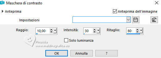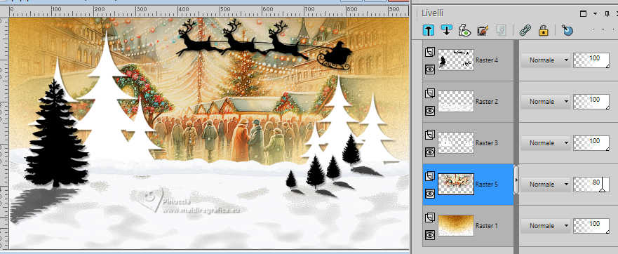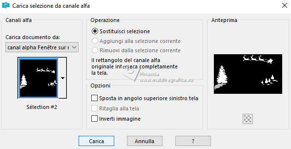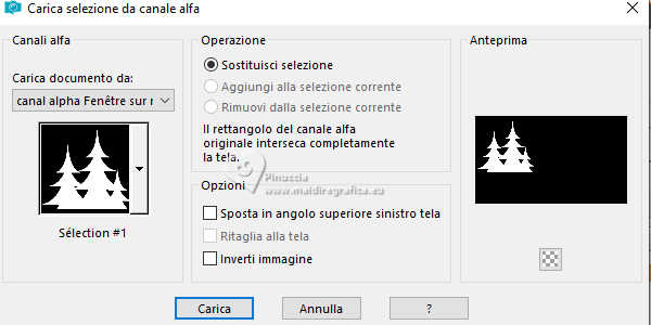 qui puoi trovare qualche risposta ai tuoi dubbi. Se l'argomento che ti interessa non è presente, ti prego di segnalarmelo. Questo tutorial è stato tradotto con PSPX9, ma può essere realizzato anche con le altre versioni di PSP. Dalla versione X4, il comando Immagine>Rifletti è stato sostituito con Immagine>Capovolgi in orizzontale, e il comando Immagine>Capovolgi con Immagine>Capovolgi in verticale. Nelle versioni X5 e X6, le funzioni sono state migliorate rendendo disponibile il menu Oggetti. Con la nuova versione X7, sono tornati Rifletti>Capovolgi, ma con nuove varianti. Vedi la scheda sull'argomento qui English Translation qui/here Le vostre versioni qui![]() Occorrente: ![]() Per un tube grazie Riet. Il resto del materiale di Moi-Même. (in questa pagina trovi i links ai siti dei creatori del materiale) ![]() se hai problemi con i filtri, consulta la mia sezione filtri qui Filters Unlimited 2.0 qui Mehdi - Wavy Lab 1.1. qui AAA Filters - Granularity qui FM Tile Tools - Blend Emboss qui Graphics Plus - Cross Shadow qui I filtri Graphics Plus si possono usare da soli o importati in Filters Unlimited (come fare vedi qui) Se un filtro fornito appare con questa icona ![]() non esitare a cambiare modalità di miscelatura e opacità secondo i colori utilizzati. ![]() Se hai problemi con il canale alfa, apri una nuova immagine trasparente 950 x 550 pixels, e usa le selezioni da disco. Imposta il colore di primo piano con #e4d8b9, e il colore di sfondo con #dca541. ![]() 1. Apri canal alpha Fenêtre sur Noël Questa immagine, che sarà la base del tuo lavoro non è vuota, ma contiene le selezioni salvate sul canale alfa. Effetti>Plugins>Mehdi - Wavy Lab 1.1. Questo filtro crea gradienti con i colori della tua paletta. Im primo è il colore di sfondo, il secondo quello di primo piano. Cambia gli ultimi due colori creati dal filtro: il terzo con il colore 3 #6d171f, il quarto con il colore bianco #ffffff. ![]() Effetti>Plugins>AAA Filters - Granularity. ![]() 2. Apri déco sol neige ![]() Cancella il watermark e vai a Modifica>Copia. Torna al tuo lavoro e vai a Modifica>Incolla come nuovo livello. Spostalo in basso (Oggetti>Allinea>Inferiore)o tasto K per attivare lo strumento Puntatore ![]() e imposta Posizione X: -1,00 e Posizione Y: 309,00. ![]() Tasto M per deselezionare lo strumento. Effetti>Effetti 3D>Sfalsa ombra, colore nero. ![]() 3. Imposta il colore di primo piano con il colore bianco. Livelli>Nuovo livello raster. Selezione>Carica/Salva selezione>Carica selezione da canale alfa. La selezione sélection 1 è subito disponibile. Devi soltanto cliccare Carica. ![]() Riempi la selezione con il colore bianco.Selezione>Deseleziona. Livelli>Disponi>Sposta giù. 4. Livelli>Duplica. Immagine>Ridimensiona, al 70%, tutti i livelli non selezionato Immagine>Rifletti. Tasto K per attivare lo strumento Puntatore ![]() Imposta Posizione X: 690,00 e Posizione Y: 132,00. ![]() Tasto M per deselezionare lo strumento. Livelli>Unisci>Unisci giù. Effetti>Effetti 3D>Sfalsa ombra, con i settaggi precedenti. 5. Imposta il colore di primo piano con il colore nero. Attiva il livello superiore. Livelli>Nuovo livello raster. Selezione>Carica/Salva selezione>Carica selezione da canale alfa. Apri il menu delle selezioni e carica la selezione sélection 2 ![]() Riempi la selezione con il colore nero.Selezione>Deseleziona. Effetti>Effetti 3D>Sfalsa ombra, con i settaggi precedenti. 6. Attiva il livello Raster 1. Apri il misted Misted-ai-generated-Par MM ![]() Modifica>Copia. Torna al tuo lavoro e vai a Modifica>Incolla come nuovo livello. Per l'esempio: Tasto K per attivare lo strumento Puntatore ![]() Imposta Posizione X: -35,00 e Posizione Y: -157,00. ![]() Tasto M per deselezionare lo strumento. Effetti>Plugins>FM Tile Tools - Blend Emboss, con i settaggi standard. ![]() (Ridimensiona e posiziona secondo il tuo tube). Abbassa l'opacità di questo livello all'80%. ![]() 7. Immagine>Aggiungi bordatura, 1 pixel, simmetriche, colore di sfondo. Immagine>Aggiungi bordatura, 1 pixel, simmetriche, colore nero. Selezione>Seleziona tutto. Immagine>Aggiungi bordatura, 5 pixels, simmetriche, colore 3 #6d171f. Selezione>Inverti. Effetti>Plugins>Graphics Plus - Cross Shadow, con i settaggi standard. ![]() Selezione>Deseleziona. Immagine>Aggiungi bordatura, 1 pixel, simmetriche, colore nero. 8. Apri il tube Déco Fenêtre ![]() Cancella il watermark e vai a Modifica>Copia. Torna al tuo lavoro e vai a Modifica>Incolla come nuovo livello. Il tube è al suo posto (Posizione X: 9,00 - Y: 103,00) 9. Apri il tube ai-generated-Renne_noel_tube MM ![]() Cancella il watermark e vai a Modifica>Copia. Torna al tuo lavoro e vai a Modifica>Incolla come nuovo livello. Immagine>Ridimensiona, al 50%, tutti i livelli non selezionato. Regola>Messa a fuoco>Metti a fuoco. Tasto K per attivare lo strumento Puntatore ![]() Imposta Posizione X: 595,00 e Posizione Y: 147,00. ![]() Effetti>Effetti 3D>Sfalsa ombra, colore nero. ![]() 10. Apri il tube déco suspension noël ![]() Cancella il watermark e vai a Modifica>Copia. Torna al tuo lavoro e vai a Modifica>Incolla come nuovo livello. mantieni Posizione X: 14,00 e imposta Posizione Y: 0,00. ![]() 11. Apri il tube père noël_Ai gemerated&tube par MM ![]() Cancella il watermark e vai a Modifica>Copia. Torna al tuo lavoro e vai a Modifica>Incolla come nuovo livello. Immagine>Ridimensiona, al 50%, tutti i livelli non selezionato. Imposta Posizione X: 163,00 e Posizione Y: 134,00. ![]() Effetti>Effetti 3D>Sfalsa ombra, con i settaggi precedenti. 12 Apri il tube Riet 1071-081123 ![]() Cancella il watermark e vai a Modifica>Copia. Torna al tuo lavoro e vai a Modifica>Incolla come nuovo livello. Immagine>Ridimensiona, al 70%, tutti i livelli non selezionato. Tasto K per attivare lo strumento Puntatore ![]() Imposta Posizione X: 724,00 e Posizione Y: 242,00. ![]() Effetti>Effetti 3D>Sfalsa ombra, con i settaggi precedenti. 13. Apri il tube déco 1 ![]() Modifica>Copia. Torna al tuo lavoro e vai a Modif