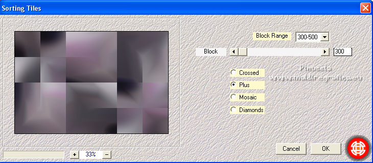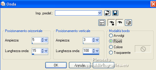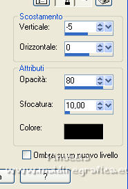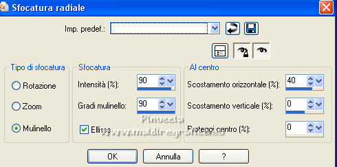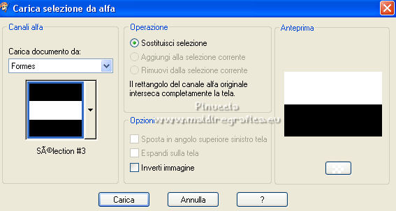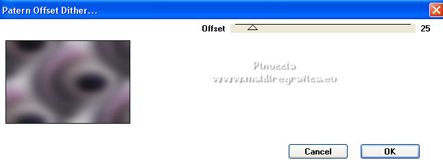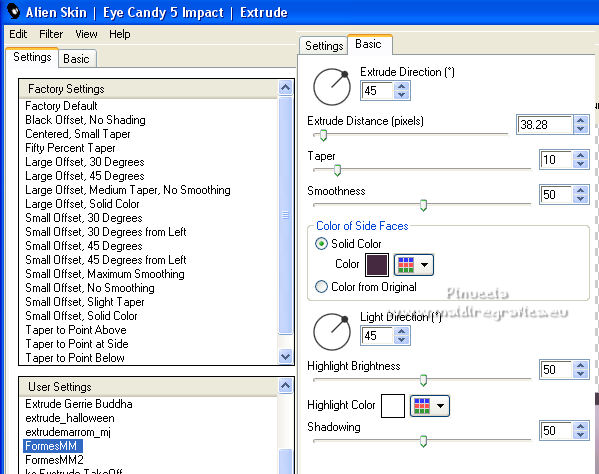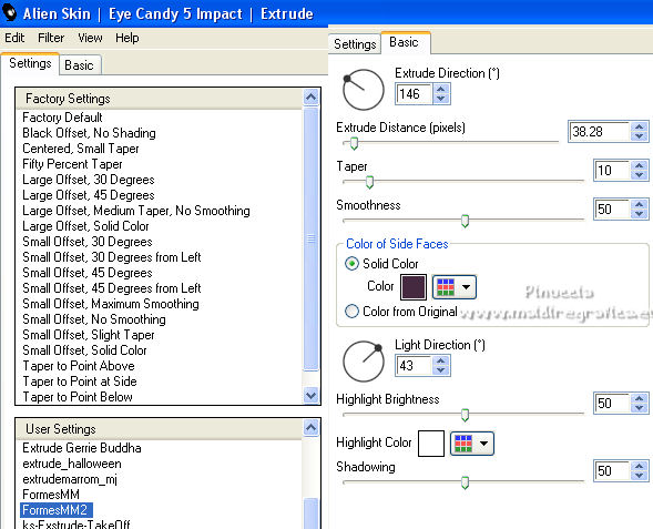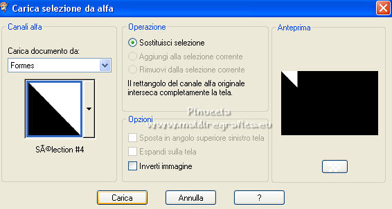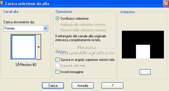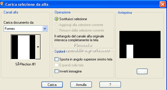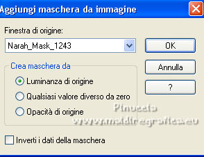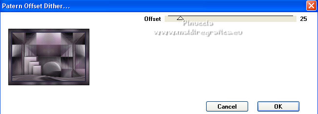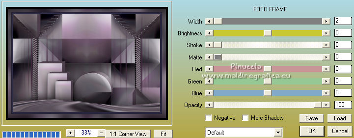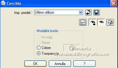 qui puoi trovare qualche risposta ai tuoi dubbi. Se l'argomento che ti interessa non è presente, ti prego di segnalarmelo. Questo tutorial è stato realizzato con Corel2020 e tradotto con CorelX, ma può essere realizzato anche con le altre versioni di PSP. Dalla versione X4, il comando Immagine>Rifletti è stato sostituito con Immagine>Capovolgi in orizzontale, e il comando Immagine>Capovolgi con Immagine>Capovolgi in verticale. Nelle versioni X5 e X6, le funzioni sono state migliorate rendendo disponibile il menu Oggetti. Con la nuova versione X7, sono tornati Rifletti>Capovolgi, ma con nuove varianti. Vedi la scheda sull'argomento qui Occorrente: Materiale qui Per il tube grazie Tine. Il resto del materiale è di Moi-Même. (in questa pagina trovi i links ai siti dei creatori del materiale) Filtri: se hai problemi con i filtri, consulta la mia sezione filtri qui Filters Unlimited 2.0 qui Mehdi - Sorting Tiles qui Unplugged Effects - Patern Offset Dither... qui Mura's Meister - Pole Transform qui Mura's Meister - Perspective Tiling qui Alien Skin Eye Candy 5 Impact - Extrude qui AAA Frames - Foto Frame qui I filtri Unplugged si possono usare da soli o importati in Filters Unlimited (come fare vedi qui) Se un filtro fornito appare con questa icona ![]() non esitare a cambiare modalità di miscelatura e opacità secondo i colori utilizzati. Metti i preset Cliccando sul file una o due volte (a seconda delle tue impostazioni), automaticamente il preset si installerà nella cartella corretta. perchè uno o due clic vedi qui Ricordati di cancellare il watermark prima di copiare i tubes, e di non salvare le modifiche quando li chiudi. Apri la maschera in PSP e minimizzala con il resto del materiale. Imposta il colore di primo piano con #2f2c47, e il colore di sfondo con #05060a. ![]() 1. Apri canal alpha Formes (dimensione 900 x 600 pixels) Finestra>Duplica o sulla tastiera maiuscola+D per fare una copia. ![]() Chiudi l'originale. La copia, che sarà la base del tuo lavoro, non è vuota, ma contiene le selezioni salvate sul canale alfa. (nel materiale trovi le selezioni da salvare "da disco", in caso di problemi con il canale alfa) 2. Selezione>Seleziona tutto. Apri il tube della donna e vai a Modifica>Copia. Torna al tuo lavoro e vai a Modifica>Incolla nella selezione. Regola>Sfocatura>Sfocatura radiale. ![]() Selezione>Deseleziona. Effetti>Effetti di immagine>Motivo unico, con i settaggi standard. ![]() Regola>Sfocatura>Sfocatura gaussiana, raggio 30. ![]() Livelli>Unisci>Unisci tutto. Livelli>Innalza livello di sfondo, Raster 1. 3. Effetti>Plugins>Filters Unlimited 2.0 - Unplugged Effects - Patern Offset Dither.... ![]() 4. Effetti>Plugins>Mehdi - Sorting Tiles. ![]() Effetti>Effetti di bordo>Aumenta. 5. Scegli un colore più vivace come colore di primo piano: per me #452941. ![]() 6. Selezione>Carica/Salva selezione>Carica selezione da canale alfa. La selezione #1 è subito disponibile. Devi soltanto cliccare Carica. ![]() Selezione>Innalza selezione a livello. Effetti>Plugins>Alien Skin Eye Candy 5 Impact - Extrude. Seleziona il preset FormeMM e imposta Basic color con il tuo nuovo colore di primo piano. ![]() Selezione>Deseleziona. Effetti>Effetti 3D>Sfalsa ombra, colore nero. ![]() 7. Livelli>Duplica. Immagine>Ridimensiona, all'80%, tutti i livelli non selezionato. Oggetti>Allinea>Inferiore Se stai lavorando con una versione precedente che non rende disponibile il menu Oggetti, attiva lo strumento Puntatore ![]() e imposta Posizione Y: 324,00 ![]() Livelli>Duplica. Immagine>Ridimensiona, all'80%, tutti i livelli non selezionato. Oggetti>Allinea>Inferiore. O Posizione Y: 380,00 ![]() Effetti>Effetti 3D>Sfalsa ombra, con i settaggi precedenti. 8. Attiva il livello Raster 1. Selezione>Carica/Salva selezione>Carica selezione da canale alfa. Apri il menu delle selezioni e carica la selezione #2. ![]() Selezione>Innalza selezione a livello. Effetti>Effetti geometrici>Cerchio. ![]() Selezione>Inverti. Premi sulla tastiera il tasto CANC ![]() Selezione>Inverti. Effetti>Plugins>Alien Skin Eye Candy 5 Impact - Extrude, con i settaggi precedenti. Selezione>Deseleziona. Immagine>Ridimensiona, all'80%, tutti i livelli non selezionato. Effetti>Effetti 3D>Sfalsa ombra, con i settaggi precedenti. Tasto K sulla tastiera per attivare lo strumento Puntatore ![]() e imposta Posizione X: 297,00 e Posizione Y: 316,00. ![]() Tasto M per deselezionare lo strumento. 9. Attiva nuovamente il livello Raster 1. Selezione>Carica/Salva selezione>Carica selezione da canale alfa. Apri il menu delle selezioni e carica la selezione #3. ![]() Selezione>Innalza selezione a livello. Effetti>Effetti di riflesso>Specchio rotante. ![]() Effetti>Effetti 3D>Sfalsa ombra, con i settaggi precedenti. Selezione>Deseleziona. 10. Selezione>Carica/Salva selezione>Carica selezione da canale alfa. Apri il menu delle selezioni e carica la selezione #4. ![]() Selezione>Innalza selezione a livello. Livelli>Disponi>Porta in alto. Effetti>Plugins>Alien Skin Eye Candy 5 Impact - Extrude, con i settaggi precedenti. Selezione>Deseleziona. Livelli>Duplica. Immagine>Rifletti. Immagine>Capovolgi. Livelli>Unisci>Unisci giù. Effetti>Effetti 3D>Sfalsa ombra, colore nero. ![]() 11. Attiva il livello sottostante. Apri déco 1 e vai a Modifica>Copia. Torna al tuo lavoro e vai a Modifica>Incolla come nuovo livello. Tasto K sulla tastiera per attivare lo strumento Puntatore ![]() e imposta Posizione X: 607,00 (mantieni Posizione Y: 0,00). ![]() Tasto M per deselezionare lo strumento. Effetti>Plugins>Alien Skin Eye Candy 5 Impact - Extrude, con i settaggi precedenti. Livelli>Duplica. Immagine>Rifletti. Livelli>Unisci>Unisci giù. Effetti>Effetti 3D>Sfalsa ombra, con i settaggi precedenti. 12. Attiva ancora il livello Raster 1. Livelli>Nuovo livello raster. Riempi con il nuovo colore di primo piano.Livelli>Nuovo livello maschera>Da immagine. Apri il menu sotto la finestra di origine e vedrai la lista dei files aperti. Seleziona la maschera Narah_ Mask_124