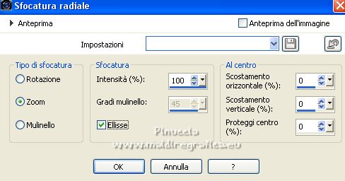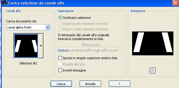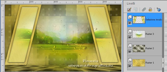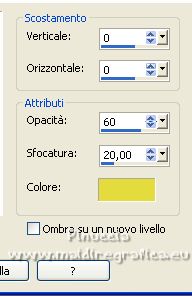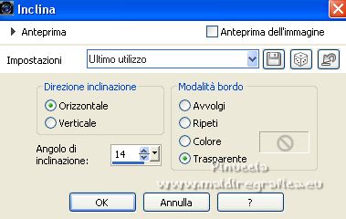 qui puoi trovare qualche risposta ai tuoi dubbi. Se l'argomento che ti interessa non è presente, ti prego di segnalarmelo. Questo tutorial è stato realizzato con Corel2020 e tradotto con CorelX, ma può essere realizzato anche con le altre versioni di PSP. Dalla versione X4, il comando Immagine>Rifletti è stato sostituito con Immagine>Capovolgi in orizzontale, e il comando Immagine>Capovolgi con Immagine>Capovolgi in verticale. Nelle versioni X5 e X6, le funzioni sono state migliorate rendendo disponibile il menu Oggetti. Con la nuova versione X7, sono tornati Rifletti>Capovolgi, ma con nuove varianti. Vedi la scheda sull'argomento qui English Translation qui/here Le vostre versioni qui/hereOccorrente: Materiale qui Grazie per il tube della donna EllyS e per il paesaggio Kahlan. Frutti dalla rete. Il resto del materiale è di Moi-Même. (in questa pagina trovi i links ai siti dei creatori del materiale) Filtri: se hai problemi con i filtri, consulta la mia sezione filtri qui Filters Unlimited 2.0 qui &<Bkg Designer sf10I> - Circle Pede (da importare in Unlimited) qui FM Tile Tools - Blend Emboss qui Alien Skin Eye Candy 5 Nature - Water Drops qui Alien Skin Eye Candy 5 Impact - Glass qui ![]() non esitare a cambiare modalità di miscelatura e opacità secondo i colori utilizzati. ![]() Imposta il colore di primo piano con il colore 1#e4dc3d, e il colore di sfondo con il colore 2 #f2f0a4. ![]() 1. Apri canal alpha fresh. Finestra>Duplica o sulla tastiera maiuscola+D per fare una copia. ![]() Chiudi l'originale. La copia, che sarà la base del tuo lavoro, non é vuota, ma contiene le selezioni salvate sul canale alfa. 2. Selezione>Seleziona tutto. Apri l'immagine leaves-69999_960_720 L'immagine ha vari livelli di colore diverso: attiva il livello con il tuo colore e vai a Modifica>Copia. Torna al tuo lavoro e vai a Modifica>Incolla nella selezione. Selezione>Deseleziona. Effetti>Effetti di immagine>Motivo unico, con i settaggi standard. ![]() Regola>Sfocatura>Sfocatura radiale. ![]() Effetti>Plugins>Filters Unlimited 2.0 - &<Bkg Designer sf10I> - Circle Pede, con i settaggi standard. ![]() (colorizza, se necessario). 3. Apri il tube déco 1 Citrus, e vai a Modifica>Copia. Torna al tuo lavoro e vai a Modifica>Incolla come nuovo livello. Effetti>Effetti 3D>Sfalsa ombra, colore di primo piano. ![]() (secondo i tuoi colori, abbassa l'opacità). 4. Apri il misted del paesaggio, cancella la firma. Note: per ottenere lo stesso genere di effetti: 1. bisogna usare lo stesso misted, puoi cambiare dopo il suo colore, per esempio con il filtro Adjust,Variations. 2. Applicare sul misted: Effetti>Plugins>Alien Skin Eye Candy 5 Nature - Water Drops, settaggi a scelta. Modifica>Copia. Torna al tuo lavoro e vai a Modifica>Incolla come nuovo livello. 5. Attiva il livello di sfondo. Selezione>Carica/Salva selezione>Carica selezione da canale alfa. La selezione #1 é subito disponibile. Devi soltanto cliccare Carica. ![]() Selezione>Innalza selezione a livello. Livelli>Disponi>Porta in alto. Selezione>Deseleziona. Effetti>Effetti geometrici>Specchio rotante. ![]() Effetti>Effetti geometrici>Inclina. ![]() Ripeti Effetti>Effetti geometrici>Specchio rotante. ![]() 6. Livelli>Nuovo livello raster. Selezione>Carica/Salva selezione>Carica selezione da canale alfa. Apri il menu delle selezioni e carica la selezione #2. ![]() Modifica>Incolla nella selezione (il paesaggio è ancora in memoria). Livelli>Duplica - 2 volte. Livelli>Unisci>Unisci giù - 3 volte. Effetti>Plugins>Alien Skin Eye Candy 5 Impact - Glass. Basic: colore di sfondo. ![]() Di nuovo Modifica>Incolla nella selezione (il paesaggio è sempre in memoria). Effetti>Effetti 3D>Sfalsa ombra, colore nero. ![]() Selezione>Deseleziona. Ripeti Effetti>Effetti 3D>Sfalsa ombra, con i settaggi precedenti. Rimani su questo livello ![]() 7. Effetti>Effetti di distorsione>Mulinello. ![]() Effetti>Effetti di immagine>Motivo unico, con i settaggi standard. ![]() Effetti>Effetti 3D>Sfalsa ombra, con i settaggi precedenti. Risultato ![]() 8. Immagine>Aggiungi bordatura, 1 pixel, simmetriche, colore di primo piano. Immagine>Aggiungi bordatura, 1 pixel, simmetriche, colore nero. Selezione>Seleziona tutto. Immagine>Aggiungi bordatura, 30 pixels, simmetriche, colore di sfondo. Effetti>Effetti di immagine>Motivo unico, con i settaggi standard. ![]() Selezione>Inverti. Regola>Sfocatura>Sfocatura gaussiana - raggio 10. ![]() 9. Apri il tube déco cadre, e vai a Modifica>Copia. Torna al tuo lavoro e vai a Modifica>Incolla nella selezione. 10. Selezione>Inverti. Effetti>Effetti 3D>Sfalsa ombra, con i settaggi precedenti. Selezione>Deseleziona. 11. Immagine>Aggiungi bordatura, 1 pixel, simmetriche, colore di primo piano. Immagine>Aggiungi bordatura, 1 pixel, simmetriche, colore nero. Selezione>Seleziona tutto. Immagine>Aggiungi bordatura, 30 pixels, simmetriche, colore di sfondo. Effetti>Effetti di immagine>Motivo unico, con i settaggi standard. ![]() Selezione>Inverti. Effetti>Plugins>FM Tile Tools - Blend Emboss, con i settaggi standard. ![]() Selezione>Deseleziona. 12. (Puoi utilizzare altri déco, colorare il mio o usarli come riferimento). Apri il tube déco feuilles citronnier, cancella la firma, e vai a Modifica>Copia. Torna al tuo lavoro e vai a Modifica>Incolla come nuovo livello. Posiziona come nell'esempio.![]() 13. Apri déco citrons, e vai a Modifica>Copia. Torna al tuo lavoro e vai a Modifica>Incolla come nuovo livello. Posiziona come nell'esempio.![]() 14. Apri déco 2, e vai a Modifica>Copia. Torna al tuo lavoro e vai a Modifica>Incolla come nuovo livello. Posiziona come nell'esempio.![]() (Duplica, se necessario). 15. Apri il tube della donna e vai a Modifica>Copia. Torna al tuo lavoro e vai a Modifica>Incolla come nuovo livello. Immagine>Ridimensiona, al 90%, tutti i livelli non selezionato. Oggetti>Allinea>Inferiore, o sposta il tube in basso, sul bordo.Effetti>Effetti 3D>Sfalsa ombra, colore nero. ![]() 16. Apri il tube titre, e vai a Modifica>Copia. Torna