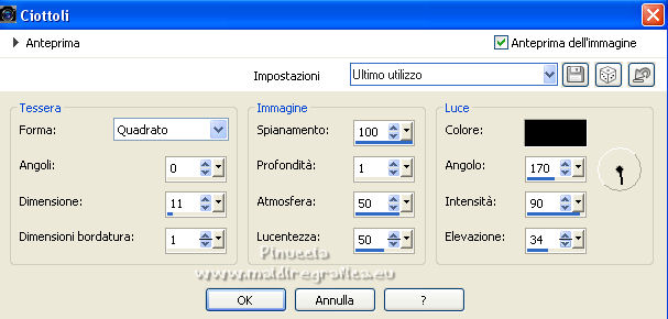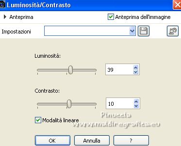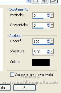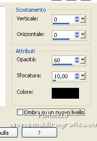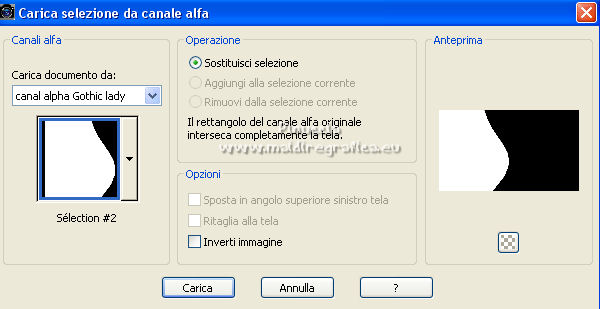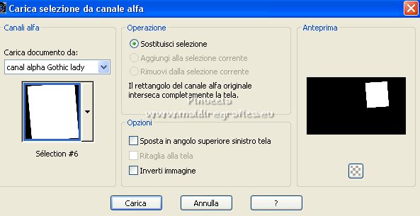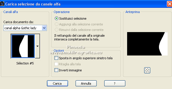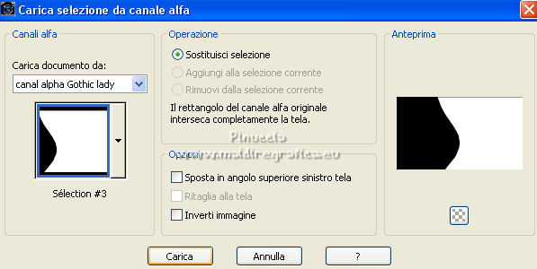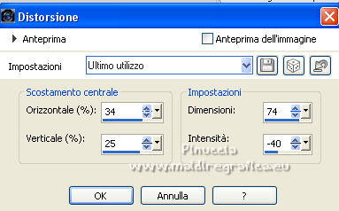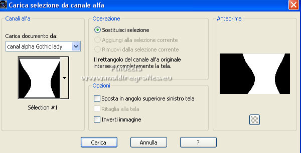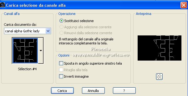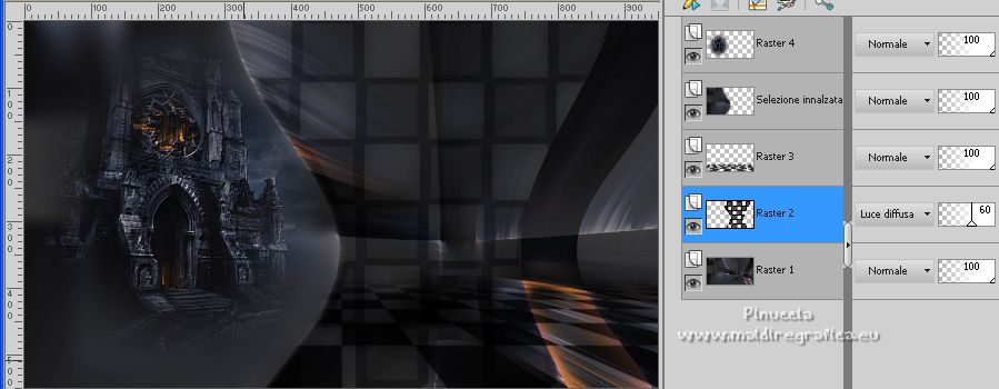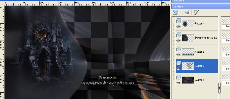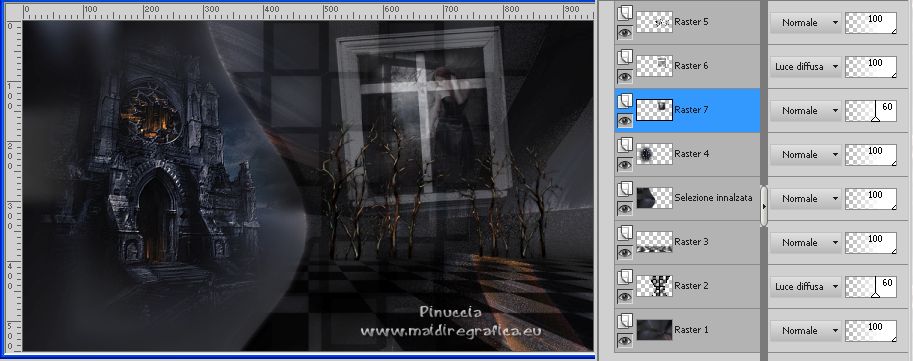 qui puoi trovare qualche risposta ai tuoi dubbi. Se l'argomento che ti interessa non è presente, ti prego di segnalarmelo. Questo tutorial è stato realizzato con Corel2020 e tradotto con CorelX, ma può essere realizzato anche con le altre versioni di PSP. Dalla versione X4, il comando Immagine>Rifletti è stato sostituito con Immagine>Capovolgi in orizzontale, e il comando Immagine>Capovolgi con Immagine>Capovolgi in verticale. Nelle versioni X5 e X6, le funzioni sono state migliorate rendendo disponibile il menu Oggetti. Con la nuova versione X7, sono tornati Rifletti>Capovolgi, ma con nuove varianti. Vedi la scheda sull'argomento qui English Translation qui/here![]() Occorrente: ![]() Per i tubes grazie Nikita, Violet Vixen e Kahlan. Alberi e uccelli da Internet. Il resto del materiale è di Moi-Même. (in questa pagina trovi i links ai siti dei creatori del materiale) ![]() se hai problemi con i filtri, consulta la mia sezione filtri qui Filters Unlimited 2.0 qui VM Natural - Speed qui Mehdi - Sorting Tiles qui Mura's Meister - Perspective Tiling qui Mura's Seamless - Checks qui Alien Skin Eye Candy 5 Impact - qui FM Tile Tools - Blend Emboss qui I filtri VM Natural e Mura's Seamless si possono usare da soli o importati in Filters Unlimited (come fare vedi qui) Se un filtro fornito appare con questa icona ![]() non esitare a cambiare modalità di miscelatura e opacità secondo i colori utilizzati. 1. Imposta il colore di primo piano con #afafae, e il colore di sfondo con #363535. ![]() Se hai problemi con il canale alfa, apri una nuova immagine trasparente 950 x 550 pixels, e usa le selezioni da disco. 2. Apri canal alpha Gothic Lady Questa immagine, che sarà la base del tuo lavoro, non è vuota, ma contiene le selezioni salvate sul canale alfa. Riempi l'immagine trasparente con il colore di sfondo.Selezione>Seleziona tutto. Apri il tube del paesaggio Kahlan e vai a Modifica>Copia. Minimizza il tube. Torna al tuo lavoro e vai a Modifica>Incolla nella selezione. Selezione>Deseleziona. 3. Effetti>Effetti di immagine>Motivo unico, con i settaggi standard. ![]() Effetti>Plugins>Mehdi - Sorting Tiles. ![]() Effetti>Effetti di distorsione>Distorsione. ![]() 4. Livelli>Nuovo livello raster. Selezione>Carica/Salva selezione>Carica selezione da canale alfa. La selezione sélection #1 è subito disponibile. Devi soltanto cliccare Carica. ![]() Effetti>Plugins>Mura's Seamless - Checks, con i settaggi standard. ![]() Selezione>Deseleziona. 5. Livelli>Nuovo livello raster. Effetti>Plugins>Mura's Seamless - Checks, con i settaggi precedenti. Effetti>Plugins>Mura's Meister - Perspective Tiling. ![]() Livelli>Duplica. Livelli>Unisci>Unisci giù. Attiva lo strumento Bacchetta magica sfumatura 30e clicca nella parte trasparente per selezionarla. Premi 4 volte CANC sulla tastiera Selezione>Deseleziona. (non dimenticare di riporta la sfumatura della bacchetta magica a 0) Effetti>Effetti 3D>Sfalsa ombra, colore nero. ![]() 6. Attiva il livello di sfondo, Raster 1. Selezione>Carica/Salva selezione>Carica selezione da canale alfa. Apri il menu delle selezioni e carica la selezione sélection #2 ![]() Selezione>Innalza selezione a livello. Livelli>Disponi>Porta in alto. Regola>Sfocatura>Sfocatura gaussiana - raggio 10. ![]() 7. Livelli>Nuovo livello raster. Modifica>Incolla nella selezione (il tube del paesaggio Kaglan è sempre in memoria). Selezione>Deseleziona. Effetti>Plugins>FM Tile Tools - Blend Emboss, con i settaggi standard. ![]() Livelli>Duplica. Livelli>Unisci>Unisci giù. 8. Attiva il livello sottostante. Selezione>Carica/Salva selezione>Carica selezione da canale alfa. Apri il menu delle selezioni e carica la selezione sélection #3 ![]() Premi 2 volte CANC sulla tastiera. Selezione>Deseleziona. Effetti>Effetti di distorsione>Vento - da sinistra, intensità 15. ![]() Effetti>Effetti 3D>Sfalsa ombra, con i settaggi precedenti. ![]() 9. Attiva il secondo livello dal basso, Raster 2. ![]() Selezione>Carica/Salva selezione>Carica selezione da canale alfa. Apri il menu delle selezioni e carica la selezione sélection #4 ![]() Imposta il colore di sfondo con il colore nero #000000. Riempi il livello con il colore nero.Effetti>Plugins>Alien Skin Eye Candy 5 Impact - Extrude - colore nero. ![]() Selezione>Deseleziona. Effetti>Effetti 3D>Sfalsa ombra, con i settaggi precedenti. Selezione>Carica/Salva selezione>Carica selezione da canale alfa. Apri il menu delle selezioni e carica la selezione sélection #5 ![]() Premi sulla tastiera il tasto CANC. Selezione>Deseleziona. Cambia la modalità di miscelatura di questo livello in Luce diffusa, e abbassa l'opacità al 60%. ![]() 10. Attiva il livello inferiore, Raster 1. Effetti>Plugins>VM Natural - Speed, con i settaggi standard. ![]() 11. Attiva il livello superiore. Apri déco arbres e vai a Modifica>Copia. Torna al tuo lavoro e vai a Modifica>Incolla come nuovo livello. Tasto K per attivare lo strumento Puntatore ![]() e imposta Posizione x: 472,00 e Posizione Y: 145,00. ![]() 12. Attiva il livello sottostante. Apri déco fenêtre e vai a Modifica>Copia. Torna al tuo lavoro e vai a Modifica>Incolla come nuovo livello. Immagine>Ridimensiona, al 70%, tutti i livelli non selezionato. Imposta Posizione x: 521,00 e Posizione Y: 4,00. ![]() Tasto M per deselezionare lo strumento. Cambia la modalità di miscelatura di questo livello in Luce diffusa. Regola>Luminosità e contrasto>Luminosità e contrasto. ![]() 13. Attiva il livello sottostante. Livelli>Nuovo livello raster. Selezione>Carica/Salva selezione>Carica selezione da canale alfa. Apri il menu delle selezioni e carica la selezione sélection #6 ![]() Apri il secondo misted DarkFantasy00001_VioletVixenMist Immagine>Rifletti. Modifica>Copia. Torna al tuo lavoro e vai a Modifica>Incolla nella selezione. Abbassa l'opacità di questo livello al 60%. Selezione>Deseleziona. ![]() 14. Attiva il livello superiore. Apri il tube del corvo b4af30c2 e vai a Modifica>Copia. Torna al tuo lavoro e vai a Modifica>Inco