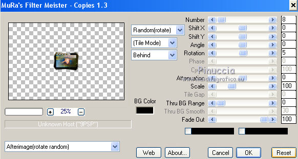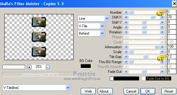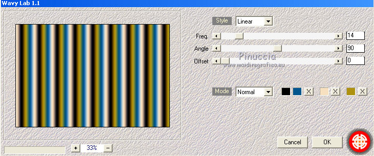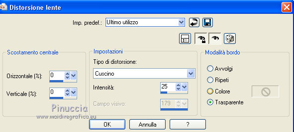 qui puoi trovare qualche risposta ai tuoi dubbi. Se l'argomento che ti interessa non è presente, ti prego di segnalarmelo. Questo tutorial è stato realizzato con Corel2020 e tradotto con CorelX7, ma può essere realizzato anche con le altre versioni di PSP. Dalla versione X4, il comando Immagine>Rifletti è stato sostituito con Immagine>Capovolgi in orizzontale, e il comando Immagine>Capovolgi con Immagine>Capovolgi in verticale. Nelle versioni X5 e X6, le funzioni sono state migliorate rendendo disponibile il menu Oggetti. Con la nuova versione X7, sono tornati Rifletti>Capovolgi, ma con nuove varianti. Vedi la scheda sull'argomento qui Occorrente: Materiale qui Per i tube grazie Gabry e WA. Il resto del materiale è di Moi-Même Se hai problemi con il canale alfa, puoi usare le selezioni fornite, da mettere nella cartella Selezioni. (in questa pagina trovi i links ai siti dei creatori del materiale) Filtri: se hai problemi con i filtri, consulta la mia sezione filtri qui Filters Unlimited 2.0 qui DC Special - Edger, Brix qui nel materiale trovi gli effetti usati nel tutorial Mehdi - Wavy Lab 1.1. qui Mehdi - Sorting Tiles, Weaver qui Mura's Meister - Copies qui Alien Skin Eye Candy 5 Impact - Perspective Shadow qui I filtri DC Special si possono usare da soli o importati in Filters Unlimited (come fare vedi qui) Se un filtro fornito appare con questa icona ![]() non esitare a cambiare modalità di miscelatura e opacità secondo i colori utilizzati. Metti il preset Cliccando sul file una o due volte (a seconda delle tue impostazioni), automaticamente il preset si installerà nella cartella corretta. perchè uno o due clic vedi qui Scegli 4 colori dal tuo tube. Per l'esempio: Imposta il colore di primo piano con il colore #01568d, e il colore di sfondo con il colore nero #000000. ![]() colore 3: #f7e0c0. colore 4: #ae910f. 1. Apri una nuova immagine trasparente 900 x 600 pixels. 2. Effetti>Plugins>Mehdi - Wavy Lab 1.1. questo filtro lavora con i colori della paletta: il primo è il colore di sfondo, il secondo quello di primo piano; cambia gli altri due colori creati dal filtro: il terzo con il colore 3 #f7e0c0 e l'ultimo con il colore 4 #ae910f. ![]() Effetti>Plugins>Mehdi - Sorting Tiles. ![]() Effetti>Plugins>Mehdi - Weaver. ![]() Effetti>Plugins>Filters Unlimited 2.0 - DC Special Edger. ![]() Effetti>Plugins>Filters Unlimited 2.0 - DC Special - Brix. (adatta i settaggi in base ai tuoi colori) ![]() Regola>Messa a fuoco>Metti a fuoco. 2. Livelli>Nuovo livello raster. Selezione>Seleziona tutto. Apri il misted graffiti art_mistedMM 3, e vai a Modifica>Copia. Torna al tuo lavoro e vai a Modifica>Incolla nella selezione. Selezione>Deseleziona. 3. Effetti>Effetti di immagine>Motivo unico, con i settaggi standard. ![]() Cambia la modalità di miscelatura di questo livello in Sovrapponi, o secondo i tuoi colori. Effetti>Effetti geometrici>Prospettiva orizzontale. ![]() Effetti>Effetti 3D>Sfalsa ombra, colore nero. ![]() Effetti>Effetti di distorsione>Distorsione lente. ![]() Regola>Messa a fuoco>Metti a fuoco. 4. Apri il tube déco 1, e vai a Modifica>Copia. Torna al tuo lavoro e vai a Modifica>Incolla come nuovo livello. 5. Livelli>Nuovo livello raster. Attiva lo strumento Selezione ![]() (non importa il tipo di selezione impostato, perchè con la selezione personalizzata si ottiene sempre un rettangolo) clicca sull'icona Selezione personalizzata ![]() e imposta i seguenti settaggi. ![]() Selezione>Modifica>Seleziona bordature selezione. ![]() Mantieni selezionato. 6. Effetti>Plugins>Mehdi - Wavy Lab 1.1., con i settaggi precedenti. Effetti>Plugins>Mehdi - Sorting Tiles, con i settaggi precedenti. Effetti>Effetti di bordo>Aumenta. Selezione>Deseleziona. 7. Attiva lo strumento Bacchetta magica ![]() e clicca nella cornice per selezionarla. ![]() Riempi la selezione con il colore di sfondo #000000.Selezione>Modifica>Contrai - 2 pixels. Premi sulla tastiera il tasto CANC ![]() Attiva il livello di sfondo, Raster 1. Selezione>Innalza selezione a livello. Livelli>Disponi>Porta in alto. Attiva nuovamente il misted e vai a Modifica>Copia. Torna al tuo lavoro e vai a Modifica>Incolla nella selezione. Selezione>Deseleziona. Livelli>Unisci>Unisci giù. 8. Immagine>Ridimensiona, al 50%, tutti i livelli non selezionato. Regola>Messa a fuoco>Metti a fuoco. Effetti>Plugins>Mura's Meister - Copies. ![]() random significa casuale, per questo il risultato non sarà uguale al mio Effetti>Plugins>Mura's Meister - Copies. ![]() 9. Tasto K sulla tastiera per attivare lo strumento Puntatore ![]() Imposta Posizione X: 0,00 e Posizione Y: 29,00 ![]() E poi Prospettiva orizzontale 14,00 prospettiva verticale: 8,00 Inclinazione: 2,00 Impostati i settaggi, questi si modificheranno da soli ![]() Tasto M per deselezionare lo strumento. Regola>Luminosità e contrasto>Luminosità e contrasto (secondo il tuo lavoro). ![]() Effetti>Effetti 3D>Sfalsa ombra, con i settaggi precedenti. Effetti>Plugins>Alien Skin Eye Candy 5 Impact - Perspective Shadow. Seleziona il preset shadow graffitiMM e ok. ![]() 10. Attiva il livello sottostante. Apri il tube déco 2 (adatta ai tuoi colori) e vai a Modifica>Copia. Torna al tuo lavoro e vai a Modifica>Incolla come nuovo livello. Tasto K per attivare lo strumento Puntatore ![]() e imposta Posizione X: 78,00 e Posizione Y: 0,00. ![]() La tag e i livelli ![]() 11. Immagine>Aggiungi bordatura, 1 pixel, simmetriche, colore 2 #000000. (secondo i tuoi colori: di preferenza, il colore più scuro) Immagine>Aggiungi bordatura, 10 pixels, simmetriche, colore 3 #f7e0c0. Immagine>Aggiungi bordatura, 1 pixel, simmetriche, colore 2 #000000. Selezione>Seleziona tutto. 12. Immagine>Aggiungi bordatura, 40 pixels, simmetriche, colore 3 #f7e0c0. Selezione>Inverti. Effetti>Plugins>Mehdi - Wavy Lab 1.1., con i settaggi precedenti. Effetti>Plugins>Mehdi - Sorting Tiles, con i settaggi precedenti. Effetti>Plugins>Mehdi - Weaver, con i settaggi precedenti. Effetti>Effetti di bordo>Aumenta. Selezione>Inverti. E