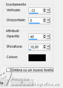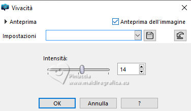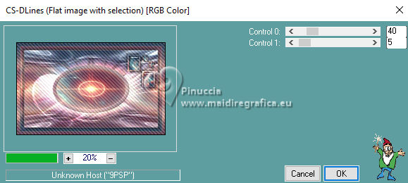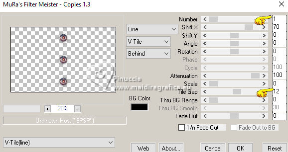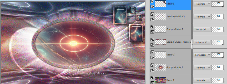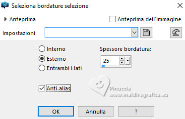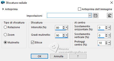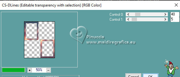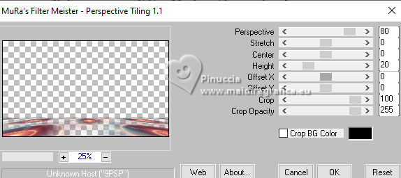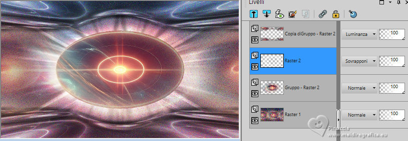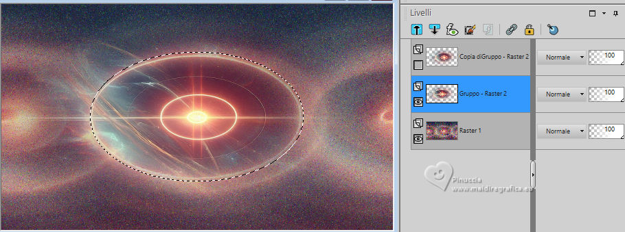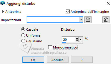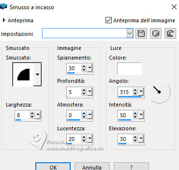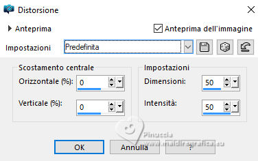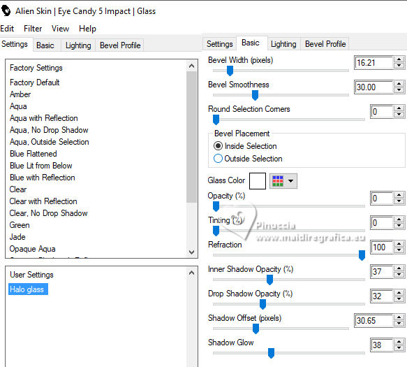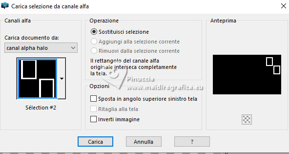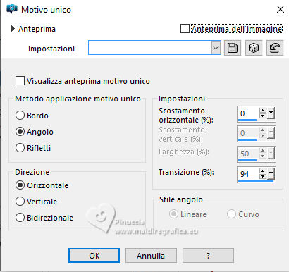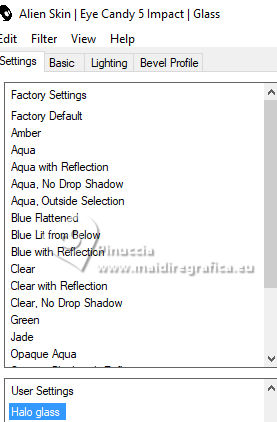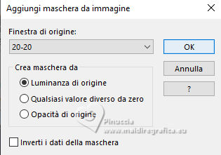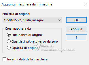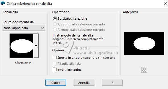 qui puoi trovare qualche risposta ai tuoi dubbi. Se l'argomento che ti interessa non è presente, ti prego di segnalarmelo. Questo tutorial, creato con PSP 2020, è stato tradotto con PSPX9, ma può essere realizzato anche con le altre versioni di PSP. Dalla versione X4, il comando Immagine>Rifletti è stato sostituito con Immagine>Capovolgi in orizzontale, e il comando Immagine>Capovolgi con Immagine>Capovolgi in verticale. Nelle versioni X5 e X6, le funzioni sono state migliorate rendendo disponibile il menu Oggetti. Con la nuova versione X7, sono tornati Rifletti>Capovolgi, ma con nuove varianti. Vedi la scheda sull'argomento qui English Translation qui Le vostre versioni qui![]() Occorrente: ![]() Materiale di Moi-Même Trovi tubes a tema qui (in questa pagina trovi i links ai siti dei creatori del materiale) ![]() se hai problemi con i filtri, consulta la mia sezione filtri qui Filters Unlimited 2.0 qui Mura's Seamless - Emboss at Alpha qui Mura's Meister - Perspective Tiling qui Mura's Meister - Copies qui Carolaine and Sensibility - CS-DLines qui Alien Skin Eye Candy 5 Impact - Glass qui I filtri Mura's Seamless si possono usare da soli o importati in Filters Unlimited (come fare vedi qui) Se un filtro fornito appare con questa icona ![]() non esitare a cambiare modalità di miscelatura e opacità secondo i colori utilizzati. Metti il preset Cliccando sul file una o due volte (a seconda delle tue impostazioni), automaticamente il preset si installerà nella cartella corretta. perchè uno o due clic vedi qui ![]() Se hai problemi con il canale alfa, apri una nuova immagine trasparente 950 x 550 pixels, e usa le selezioni da disco. Apri le maschere in PSP e minimizzale con il resto del materiale. 1. Imposta il colore di primo piano con il colore bianco, e il colore di sfondo con il colore nero. ![]() Apri Canal_alpha_Halo Questa immagine, che sarà la base del tuo lavoro non è vuota, ma contiene una selezione salvata sul canale alfa. Selezione>Seleziona tutto. Apri l'immagine Halo_ AI generated ![]() Modifica>Copia. Torna al tuo lavoro e vai a Modifica>Incolla nella selezione. Minimizza l'immagine, che ti servirà ancora. Selezione>Deseleziona. 2. Regola>Sfocatura>Sfocatura radiale. ![]() Effetti>Effetti di immagine>Motivo unico. ![]() Regola>Aggiungi/Rimuovi disturbo>Aggiungi disturbo. ![]() 3. Livelli>Nuovo livello raster. Selezione>Seleziona tutto. Modifica>Incolla nella selezione (l'immagine minimizzata è sempre in memoria). Selezione>Deseleziona. Livelli>Nuovo livello maschera>Da immagine. Apri il menu sotto la finestra di origine e vedrai la lista dei files aperti. Seleziona la maschera 20-20. ![]() Livelli>Duplica. Livelli>Unisci>Unisci gruppo. Regola>Messa a fuoco>Metti a fuoco. 4. Livelli>Duplica. Chiudi questo livello, e attiva il livello sottostante dell'originale. ![]() Tasto K per attivare lo strumento Puntatore ![]() Posizione X: 57,00 - Posizione Y: -10,00. ![]() Tasto M per deselezionare lo strumento. Regola>Messa a fuoco>Metti a fuoco. Secondo il tuo paesaggio: Selezione>Carica/Salva selezione>Carica selezione da canale alfa. La selezione #1 è subito disponibile. Devi soltanto cliccare Carica. ![]() Sposta nella selezione la parte dell'immagine che vuoi mettere in risalto.![]() Selezione>Deseleziona. 5. Riapri e attiva il livello soprastante. Effetti>Effetti di immagine>Motivo unico, con i settaggi standard. ![]() Effetti>Plugins>Mura's Meister - Perspective Tiling. ![]() Cambia la modalità di miscelatura di questo livello in Luminanza. 6. Livelli>Duplica. Immagine>Rifletti>Rifletti verticalmente. Livelli>Unisci>Unisci giù. Effetti>Effetti di distorsione>Distorsione. ![]() Effetti>Effetti 3D>Sfalsa ombra, colore nero. ![]() Ripeti l'Effetto Sfalsa ombra in negativo. ![]() 7. Apri déco halo ![]() Cancella il watermark Modifica>Copia. Torna al tuo lavoro e vai a Modifica>Incolla come nuovo livello. Livelli>Disponi>Sposta giù. Cambia la modalità di miscelatura di questo livello in Sovrapponi. ![]() 8. Attiva il livello Raster 1. Livelli>Nuovo livello raster. Riempi il livello con il colore bianco.Livelli>Nuovo livello maschera>Da immagine. Apri il menu sotto la finestra di origine e seleziona la maschera 1250182272_nikita_masque ![]() Livelli>Duplica. Livelli>Unisci>Unisci gruppo. Livelli>Disponi>Porta in alto. Cambia la modalità di miscelatura di questo livello in Sovrapponi. Se necessario, cancella la firma sull'angolo inferiore destro ![]() Immagine>Rifletti>Rifletti orizzontalmente. Effetti>Plugins>Mura's Seamless - Emboss at Alpha, con i settaggi standard. ![]() Selezione>Carica/Salva selezione>Carica selezione da canale alfa. Carica nuovamente la selezione #1. ![]() Premi sulla tastiera il tasto CANC ![]() ![]() Mantieni selezionato. 9. Attiva il livello Raster 1. Selezione>Modifica>Contrai - 10 pixels. Selezione>Modifica>Seleziona bordature selezione. ![]() Selezione>Modifica>Sfuma - 3 pixels. Selezione>Innalza selezione a livello. Livelli>Disponi>Porta in alto. Effetti>Plugins>Carolaine and Sensibility - CS_DLines, con i settaggi standard. ![]() Effetti>Effetti 3D>Smusso a incasso. ![]() Regola>Messa a fuoco>Metti a fuoco. Regola>Aggiungi/Rimuovi disturbo>Aggiungi disturbo, con i settaggi precedenti. ![]() Selezione>Deseleziona. 10. Attiva il livello Raster 1. Facoltativo, secondo i tuoi colori: Regola>Tonalità e saturazione>Vivacità. ![]() Modifica>Copia. Modifica>Incolla come nuova immagine. Salva per precauzione. 11. Attiva il livello superiore. Livelli>Nuovo livello raster. Selezione>Carica/Salva selezione>Carica selezione da canale alfa. Apri il menu delle selezionie carica la selezione 2. ![]() Modifica>Incolla nella selezione (l'immagine minimizzata è ancora in memoria). Regola>Messa a fuoco>Metti a fuoco. Effetti>Plugins>Carolaine and Sensibility - CS_DLines, con i settaggi standard. ![]() Effetti>Effetti 3D>Smusso a incasso, con i settaggi precedenti. ![]() Selezione>Deseleziona. Rimani su questo livello. 12. Selezione>Carica/Salva selezion