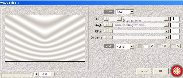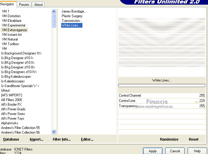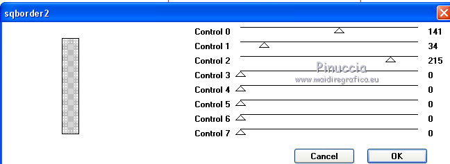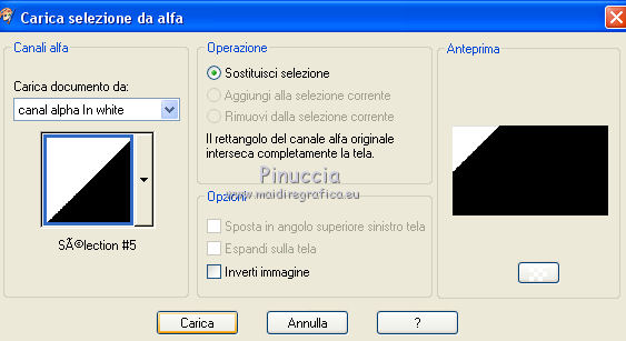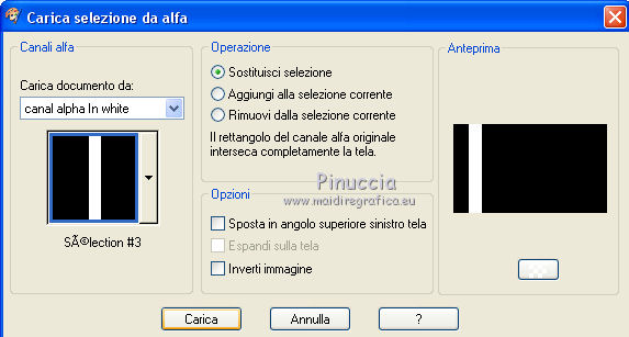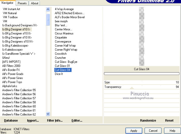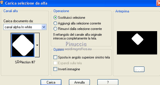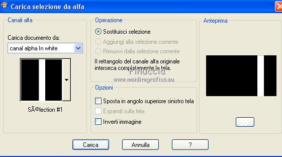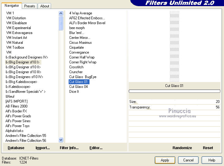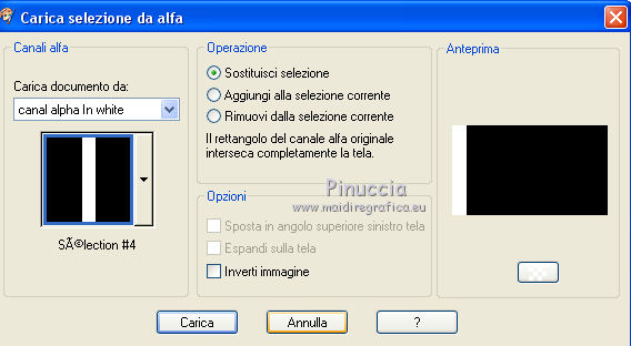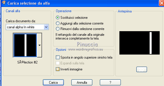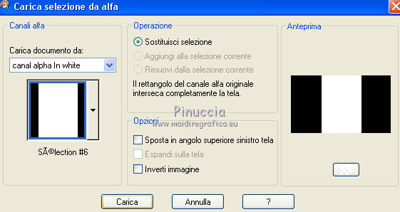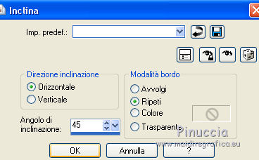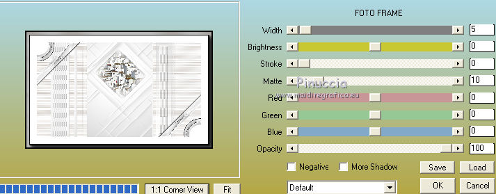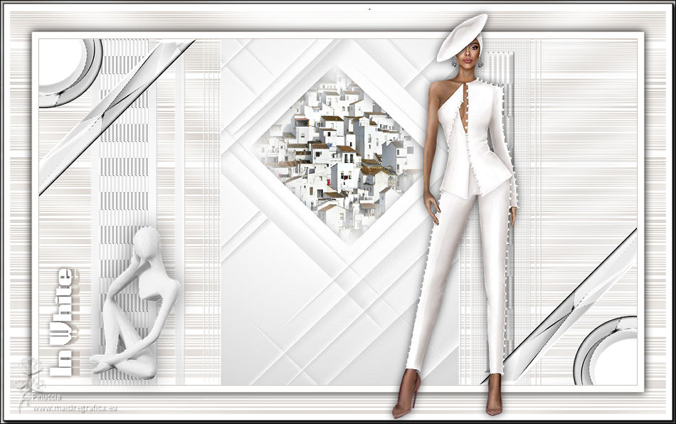 qui puoi trovare qualche risposta ai tuoi dubbi. Se l'argomento che ti interessa non è presente, ti prego di segnalarmelo. Questo tutorial è stato realizzato con Corel2020 e tradotto con CorelX, ma può essere realizzato anche con le altre versioni di PSP. Dalla versione X4, il comando Immagine>Rifletti è stato sostituito con Immagine>Capovolgi in orizzontale, e il comando Immagine>Capovolgi con Immagine>Capovolgi in verticale. Nelle versioni X5 e X6, le funzioni sono state migliorate rendendo disponibile il menu Oggetti. Con la nuova versione X7, sono tornati Rifletti>Capovolgi, ma con nuove varianti. Vedi la scheda sull'argomento qui Occorrente: Materiale qui Grazie per il tube e la maschera Colybrix e smArt designs. Il resto del materiale è di Moi-Même. (in questa pagina trovi i links ai siti dei creatori del materiale) Filtri: se hai problemi con i filtri, consulta la mia sezione filtri qui Filters Unlimited 2.0 qui &<Bkg Designer sf10I> - Cut Glass 04, Cut Glass 01 (da importare in Unlimited) qui VM Extravaganza - White line qui AFS IMPORT - sqborder2 qui Mehdi - Wavy Lab 1.1 qui Mura's Meister - Pole Transform qui AAA Frames - Foto Frame qui I filtri VM Extravaganza e AFS IMPORT si possono usare da soli o importati in Filters Unlimited (come fare vedi qui) Se un filtro fornito appare con questa icona ![]() non esitare a cambiare modalità di miscelatura e opacità secondo i colori utilizzati. Se cambi il tube principale, è preferibile scegliere un personaggio vestito di bianco. I filtri che in questo tutorial sono importati in Unlimited possono dare risultati differenti, a seconda della versione di Unlimited utilizzata. In fondo al tutorial il risultato con la versione di Unlimited che non si installa, perchè composta da files in formato 8bf. Apri la maschera in PSP e minimizzala con il resto del materiale. Imposta il colore di primo piano con #ffffff, e il colore di sfondo con #cbc3bb. ![]() 1. Apri canal alpha_inwhite (dimensione 950 x 550 pixels). Finestra>Duplica o sulla tastiera maiuscola+D per fare una copia. ![]() Chiudi l'originale. La copia, che sarà la base del tuo lavoro, non è vuota, ma contiene le selezioni salvate sul canale alfa. Effetti>Plugins>Mehdi - Wavy Lab 1.1. Questo filtro crea gradienti con i colori della paletta: il primo è il colore di sfondo, il secondo quello di primo piano. Mantieni gli altri due colori creati dal filtro. ![]() Regola>Sfocatura>Sfocatura gaussiana - raggio 20. ![]() Effetti>Plugins>Filters Unlimited 2.0 - VM Extravaganza - White Lines, con i settaggi standard. ![]() Regola>Messa a fuoco>Metti a fuoco. 2. Livelli>Nuovo livello raster. Riempi il livello con il colore bianco.Livelli>Nuovo livello maschera>Da immagine. Apri il menu sotto la finestra di origine e vedrai la lista dei files aperti. Seleziona la maschera smArt_maszk_79. ![]() Livelli>Unisci>Unisci gruppo. Effetti>Effetti 3D>Sfalsa ombra, colore nero. ![]() 3. Selezione>Carica/Salva selezione>Carica selezione da canale alfa. La selezione #1 è subito disponibile. Devi soltanto cliccare Carica. ![]() Effetti>Plugins>AFS IMPORT - sqborder2, con i settaggi standard ![]() 4. Selezione>Carica/Salva selezione>Carica selezione da canale alfa. Apri il menu delle selezioni e carica la selezione #2. ![]() La nuova selezione sostituirà la precedente. ![]() Effetti>Plugins>Filters Unlimited 2.0 - &<Bkg Designer sf10I> - Cut Glass 04, con i settaggi standard. ![]() Effetti>Effetti 3D>Smusso a incasso. ![]() 5. Selezione>Carica/Salva selezione>Carica selezione da canale alfa. Apri il menu delle selezioni e carica la selezione #3. ![]() Effetti>Plugins>Filters Unlimited 2.0 - &<Bkg Designer sf10I> - Cut Glass 01, con i settaggi standard. ![]() Regola>Messa a fuoco>Metti a fuoco. 6. Selezione>Carica/Salva selezione>Carica selezione da canale alfa. Apri il menu delle selezioni e carica la selezione #4. ![]() Livelli>Nuovo livello raster. Apri l'immagine 662954.jpg, e vai a Modifica>Copia. Torna al tuo lavoro e vai a Modifica>Incolla nella selezione. Regola>Messa a fuoco>Metti a fuoco. Effetti>Effetti 3D>Smusso a incasso, con i settaggi precedenti. Selezione>Deseleziona. 7. Effetti>Effetti geometrici>Inclina. ![]() Rimani su questo livello. Selezione>Carica/Salva selezione>Carica selezione da canale alfa. Apri il menu delle selezioni e carica la selezione #5. ![]() Effetti>Plugins>Mura's Meister - Pole Transform. ![]() Selezione>Deseleziona. Immagine>Ridimensiona, al 70%, tutti i livelli non selezionato. Oggetti>Allinea>Superiore. Oggetti>Allinea>Sinistra. O sposta l'immagine nell'angolo in alto a sinistra.Con lo strumento Puntatore ![]() imposta Posizione X e Y a 0,00 ![]() ![]() 8. Livelli>Duplica. Immagine>Capovolgi. Immagine>Rifletti. Livelli>Unisci>Unisci giù. 9. Attiva il livello inferiore, Raster 1. Selezione>Carica/Salva selezione>Carica selezione da canale alfa. Apri il menu delle selezioni e carica la selezione #6. ![]() Livelli>Nuovo livello raster. Apri l'immagine fond-abstrait-forme-diamant-blanc, e vai a Modifica>Copia. Torna al tuo lavoro e vai a Modifica>Incolla nella selezione. Regola>Messa a fuoco>Metti a fuoco 10. Livelli>Nuovo livello raster. Selezione>Carica/Salva selezione>Carica selezione da canale alfa. Apri il menu delle selezioni e carica la selezione #7. ![]() Apri il misted del paesaggio e vai a Modifica>Copia. Torna al tuo lavoro e vai a Modifica>Incolla nella selezione. (secondo il tuo paesaggio, duplica se necessario). Apri il tube déco glass e vai a Modifica>Copia. Torna al tuo lavoro e vai a Modifica>Incolla nella selezione. Selezione>Deseleziona. 11. Attiva il livello di sfondo. Modifica>Copia. 12. Immagine>Aggiungi bordatura, 1 pixel, simmetriche, colore di sfondo. Immagine>Aggiungi bordatura, 10 pixels, simmetriche, colore bianco. Immagine>Aggiungi bordatura, 1 pixel, simmetriche, colore di sfondo. Selezione>Seleziona tutto. 13. Immagine>Aggiungi bordatura, 50 pixels, simmetriche, colore bianco. Selezione>Inverti. Modifica>Incolla nella selezione (