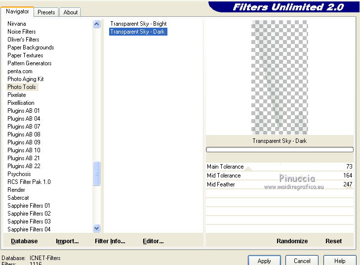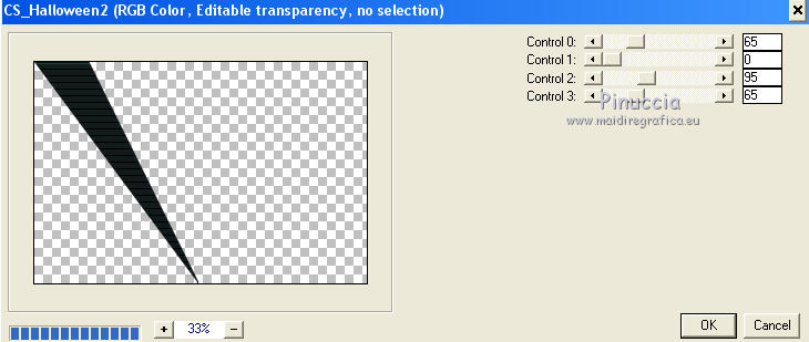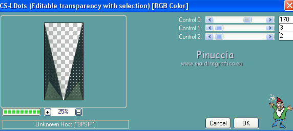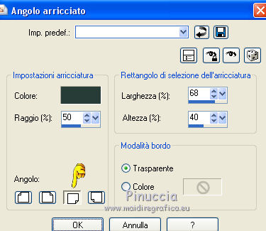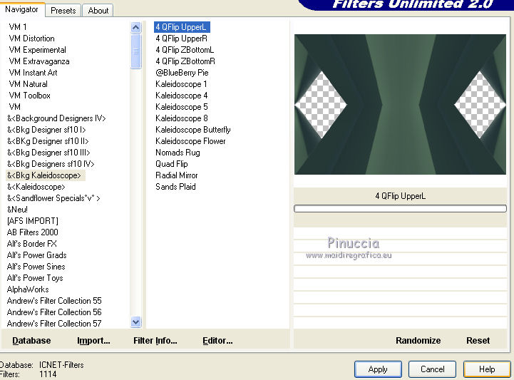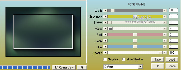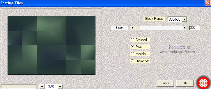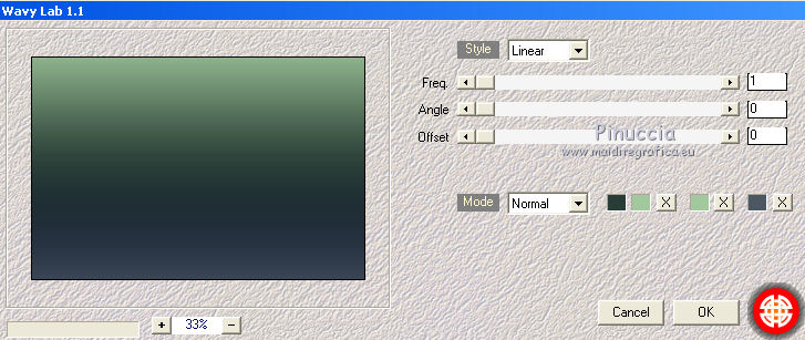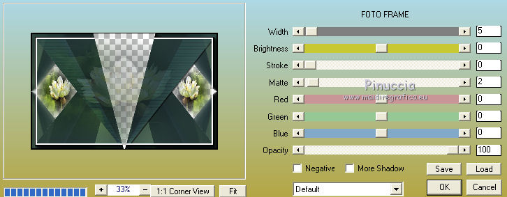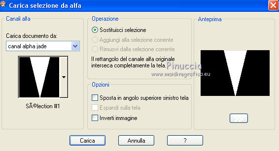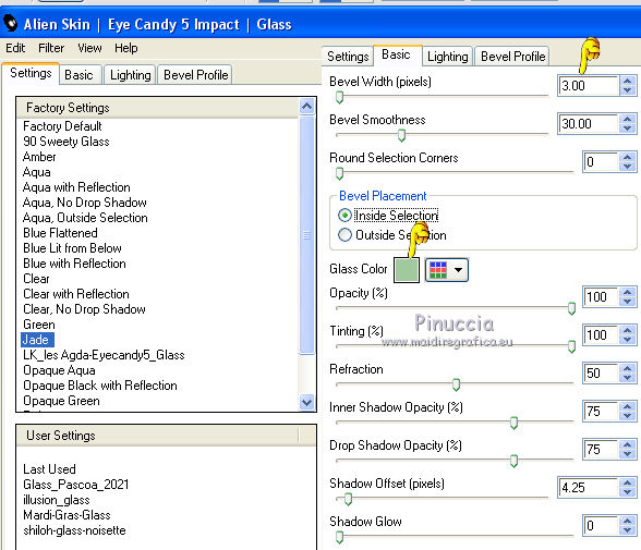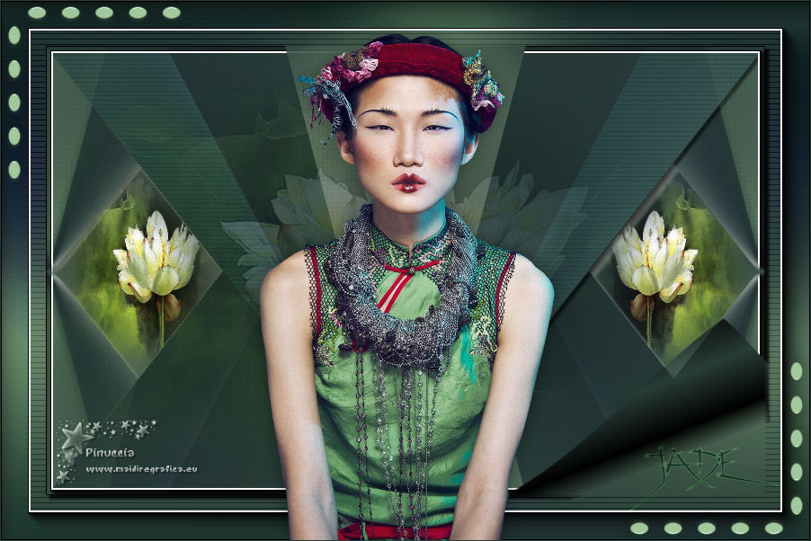 qui puoi trovare qualche risposta ai tuoi dubbi. Se l'argomento che ti interessa non è presente, ti prego di segnalarmelo. Questo tutorial è stato realizzato con Corel2020 e tradotto con CorelX7, ma può essere realizzato anche con le altre versioni di PSP. Dalla versione X4, il comando Immagine>Rifletti è stato sostituito con Immagine>Capovolgi in orizzontale, e il comando Immagine>Capovolgi con Immagine>Capovolgi in verticale. Nelle versioni X5 e X6, le funzioni sono state migliorate rendendo disponibile il menu Oggetti. Con la nuova versione X7, sono tornati Rifletti>Capovolgi, ma con nuove varianti. Vedi la scheda sull'argomento qui Occorrente: Materiale qui Per i tubes grazie Guismo (trovi il tube usato qui http://tubeguismolapassiondecreer.blogspot.com/) ed Elly. Il resto del materiale è di Moi-Même Se hai problemi con il canale alfa, puoi usare le selezioni fornite, da mettere nella cartella Selezioni. (in questa pagina trovi i links ai siti dei creatori del materiale) Filtri: se hai problemi con i filtri, consulta la mia sezione filtri qui Filters Unlimited 2.0 qui &<Kaleidoscope> - 4 QFlip UpperL (da importare in Unlimited) qui Photo Tools - Transparent Sky Dark qui Mehdi - Wavy Lab 1.1 qui Mehdi - Sorting Tiles qui Carolaine and Sensibility - CS-LDots, CS-Halloween 2 qui Alien Skin Eye Candy 5 Impact - Glass qui AAA Frames - Foto Frame qui I filtri Photo Tools si possono usare da soli o importati in Filters Unlimited (come fare vedi qui) Se un filtro fornito appare con questa icona ![]() non esitare a cambiare modalità di miscelatura e opacità secondo i colori utilizzati. (Sul vostro tube è importante scegliere un colore chiaro e 2 colori scuri). Imposta il colore di primo piano con #a2c99d, e il colore di sfondo con il colore #293d38. ![]() Terzo colore (per il filtro Mehdi) #4b5864. 1. Apri canal alpha_Jade 2021 (dimensione 900 x 600 pixels) Finestra>Duplica o sulla tastiera maiuscola+D per fare una copia. ![]() Chiudi l'originale. La copia, che sarà la base del tuo lavoro, non è vuota, ma contiene le selezioni salvate sul canale alfa. Effetti>Plugins>Mehdi - Wavy Lab 1.1. Questo filtro crea gradienti con i colori della paletta: il primo è il colore di sfondo, il secondo quello di primo piano; cambia gli ultimi due colori creati dal filtro: il terzo con il colore di primo piano #a2c99d e il quarto con il colore 3 #4b5864. ![]() 2. Effetti>Effetti di immagine>Motivo unico, con i settaggi standard. ![]() Regola>Sfocatura>Sfocatura gaussiana - raggio 40. ![]() 3. Livelli>Duplica. Effetti>Plugins>Mehdi - Sorting Tiles. ![]() Effetti>Effetti geometrici>Prospettiva verticale. ![]() 4. Selezione>Seleziona tutto. Selezione>Mobile. Effetti>Effetti di immagine>Motivo unico, con i settaggi standard. ![]() Selezione>Inverti. Effetti>Plugins>Filters Unlimited 2.0 - &<Bkg Kaleidoscope> - 4QFlipUpperL ![]() Selezione>Inverti. Effetti>Effetti 3D>Sfalsa ombra, colore nero. ![]() Selezione>Deseleziona. Effetti>Effetti 3D>Sfalsa ombra, con i settaggi precedenti. 5. Selezione>Carica/Salva selezione>Carica selezione da canale alfa. La selezione #1 è subito disponibile. Devi soltanto cliccare Carica. ![]() Effetti>Plugins>Filters Unlimited 2.0 - Photo Tools - Transparent Sky Dark. ![]() Effetti>Plugins>Carolaine and Sensibility - CS-LDots ![]() Selezione>Innalza selezione a livello. Selezione>Deseleziona. 6. Effetti>Effetti di immagine>Motivo unico, con i settaggi standard. ![]() Facoltativo, secondo i tuoi colori: Livelli>Duplica. Immagine>Rifletti. Livelli>Unisci>Unisci giù. (potete scegliere una modalità di miscelatura o abbassare l'opacità se necessario; per la mia seconda versione: modalità Filtra). 7. Attiva il livello sottostante. Selezione>Carica/Salva selezione>Carica selezione da canale alfa. Apri il menu delle selezioni e carica la selezione #2. ![]() Selezione>Innalza selezione a livello. Selezione>Deseleziona. Effetti>Plugins>Carolaine and Sensibility - CS_Halloween 2, con i settaggi standard. ![]() Regola>Messa a fuoco>Metti a fuoco. 8. Livelli>Duplica. Immagine>Rifletti. Livelli>Unisci>Unisci giù. Effetti>Effetti 3D>Sfalsa ombra, con i settaggi precedenti. Cambia la modalità di miscelatura di questo livello in Indebolisci (o secondo i tuoi colori; per la mia seconda versione: Luce netta). ![]() 9. Attiva il livello di sfondo, Raster 1. Livelli>Nuovo livello raster. Selezione>Carica/Salva selezione>Carica selezione da canale alfa. Apri il menu delle selezioni e carica la selezione #3. ![]() 10. Apri il misted (per me il fiore), e vai a Modifica>Copia. Torna al tuo lavoro e vai a Modifica>Incolla nella selezione. Selezione>Deseleziona. 11. Livelli>Duplica. Immagine>Rifletti. Livelli>Unisci>Unisci giù. 12. Attiva il livello superiore. Livelli>Nuovo livello raster. Selezione>Seleziona tutto. Modifica>Incolla nella selezione (il misted è ancora in memoria). Immagine>Ridimensiona, se necessario (dipende dal tuo misted). Selezione>Deseleziona. Tasto K per attivare lo strumento Puntatore ![]() e imposta Posizione x: -104,00 e Posizione Y: -3,00. ![]() (o adatta al tuo misted) Tasto M per deselezionare lo strumento. Cambia la modalità di miscelatura di questo livello in Luce diffusa, e abbassa l'opacità al 50% (o secondo il tuo misted). Livelli>Disponi>Sposta giù. Rimani su questo livello. 13. Chiudi il livello di sfondo, Raster 1. ![]() Livelli>Unisci>Unisci visibile. Modifica>Taglia (anche per tenere l'immagine in memoria). Selezione>Seleziona tutto. Selezione>Modifica>Contrai - 50 pixels. Modifica>Incolla nella selezione. Effetti>Effetti 3D>Sfalsa ombra, con i settaggi precedenti. Mantieni selezionato. 14. Riapri e attiva il livello inferiore. Selezione>Inverti. Effetti>Plugins>Carolaine and Sensibility - CS_Halloween 2, con i settaggi precedenti. ![]() Effetti>Plugins>AAA Frames - Foto Frame ![]() Selezione>Inverti. 15. Attiva il livello superiore, Uniti. Effetti>Plugins>AAA Frames - Foto Frame, cambia width con 5. ![]() Effetti>Effetti 3D>Sfalsa ombra, con i setta