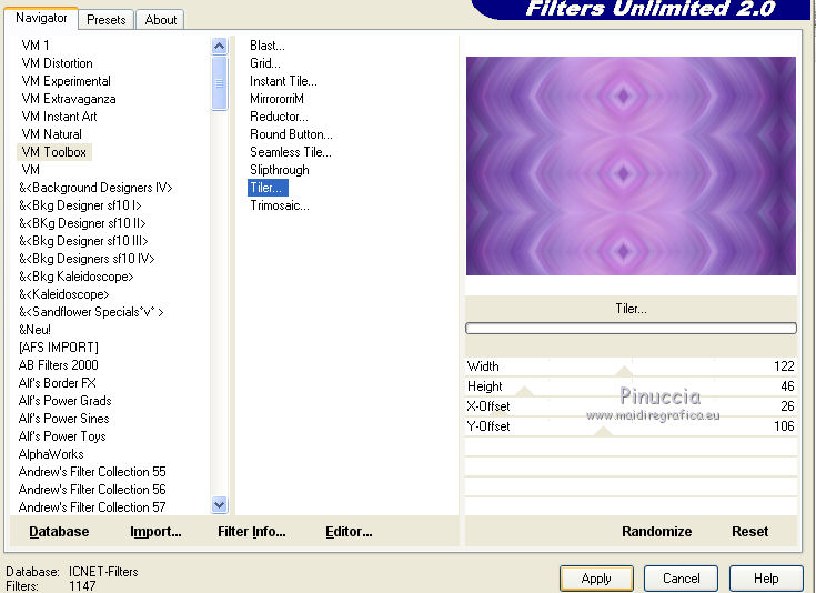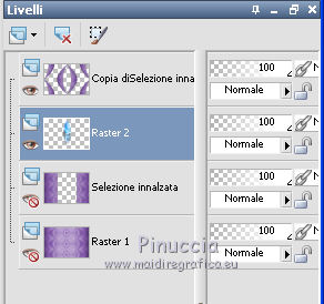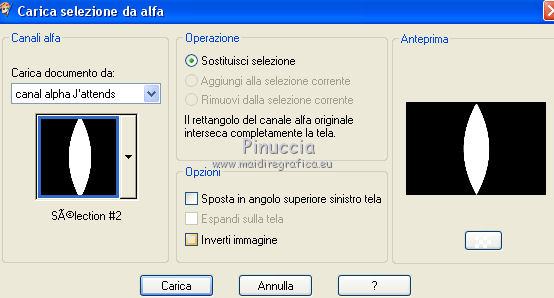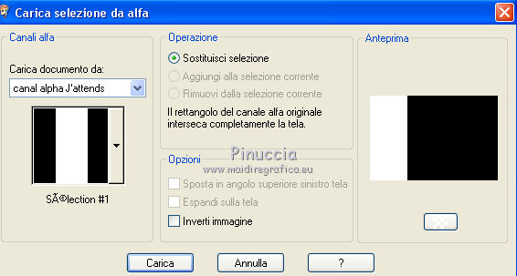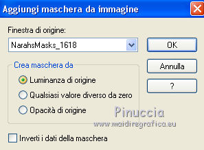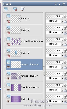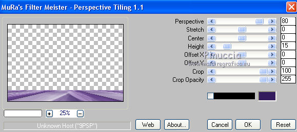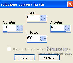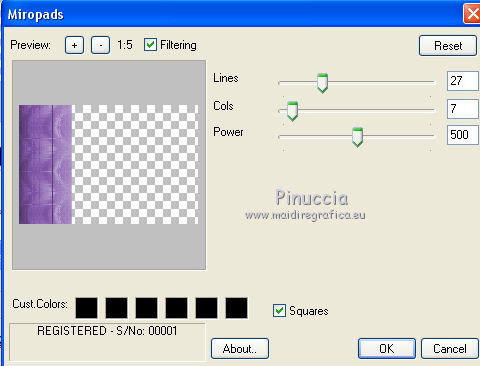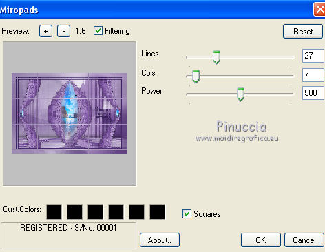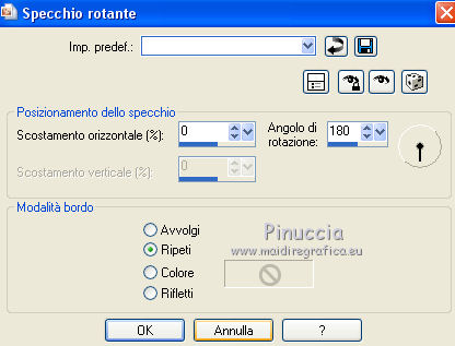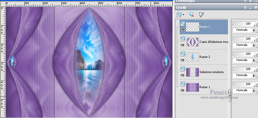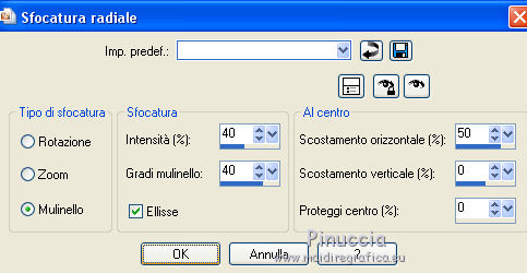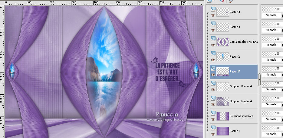 qui puoi trovare qualche risposta ai tuoi dubbi. Se l'argomento che ti interessa non è presente, ti prego di segnalarmelo. Questo tutorial è stato realizzato con Corel2020 e tradotto con CorelX7, ma può essere realizzato anche con le altre versioni di PSP. Dalla versione X4, il comando Immagine>Rifletti è stato sostituito con Immagine>Capovolgi in orizzontale, e il comando Immagine>Capovolgi con Immagine>Capovolgi in verticale. Nelle versioni X5 e X6, le funzioni sono state migliorate rendendo disponibile il menu Oggetti. Con la nuova versione X7, sono tornati Rifletti>Capovolgi, ma con nuove varianti. Vedi la scheda sull'argomento qui Occorrente: Materiale qui Per il tube grazie Luz Cristina. Il resto del materiale è di Moi-même. (in questa pagina trovi i links ai siti dei creatori del materiale) Filtri: se hai problemi con i filtri, consulta la mia sezione filtri qui Filters Unlimited 2.0 qui VM Toolbox - Tiler qui Ormente's filters - Miropads qui vedi la scheda dei filtri Ormente qui Mura's Meister - Perspective Tiling qui Flaming Pear - Flexify 2 qui I filtri VM Toolbox si possono usare da soli o importati in Filters Unlimited (come fare vedi qui) Se un filtro fornito appare con questa icona ![]() non esitare a cambiare modalità di miscelatura e opacità secondo i colori utilizzati. Apri la maschera in PSP e minimizzala con il resto del materiale. Imposta il colore di primo piano con #9a7aba, e il colore di sfondo con #341b5d. ![]() 1. Apri canal_alpha J'attends. L'immagine, che sarà la base del tuo lavoro, non è vuota, ma contiene una selezione salvata sul canale alfa. (se hai problemi con il canale alfa, apri una nuova immagine trasparente 900 x 600 pixels, e carica le selezioni da disco, usando le selezioni fornite nel materiale). Riempi l'immagine trasparente con il colore di primo piano.2. Selezione>Seleziona tutto. Livelli>Nuovo livello raster. Apri l'immagine di sfondo e vai a Modifica>Copia. Torna al tuo lavoro e vai a Modifica>Incolla nella selezione. Selezione>Deseleziona. Cambia la modalità di miscelatura di questo livello in Luminanza. 3. Regola>Sfocatura>Sfocatura radiale. ![]() 4. Effetti>Plugins>Filters Unlimited 2.0 - VM Toolbox - Tiler, con i settaggi standard. ![]() Livelli>Unisci>Unisci giù. 5. Selezione>Carica/Salva selezione>Carica selezione da canale alpha. La selezione #1 è subito disponibile. Devi soltanto cliccare Carica. se hai problemi con il canale alfa, carica da disco la selezione che trovi nel materiale ![]() Selezione>Innalza selezione a livello. 6. Effetti>Plugins>Ormente's Filters - Miropads ![]() Selezione>Deseleziona. Effetti>Effetti di riflesso>Specchio rotante. ![]() 5. Livelli>Duplica. Effetti>Effetti geometrici>Cerchio. ![]() Effetti>Effetti 3D>Sfalsa ombra, colore nero. ![]() Di nuovo: Effetti>Effetti geometrici>Cerchio. ![]() Effetti>Effetti di immagine>Motivo unico, con i settaggi standard. ![]() Effetti>Effetti 3D>Sfalsa ombra, con i settaggi precedenti. 6. Attiva il livello sottostante. Livelli>Nuovo livello raster. Selezione>Carica/Salva selezione>Carica selezione da canale alpha. Apri il menu delle selezioni e carica la selezione #2. ![]() Apri il tube del paesaggio e vai a Modifica>Copia. Torna al tuo lavoro e vai a Modifica>Incolla nella selezione. (Nota: se il tuo paesaggio non si adatta alla selezione e si deforma, fai Modifica>Incolla come nuovo livello. Selezione>Inverti, e premi sulla tastiera il tasto CANC). Selezione>Deseleziona. 7. Chiudi i due livelli inferiori e rimani posizionato sul livello superiore. ![]() Attiva lo strumento Selezione ![]() (non importa il tipo di selezione impostato, perchè con la selezione personalizzata si ottiene sempre un rettangolo) clicca sull'icona Selezione personalizzata ![]() e imposta i seguenti settaggi. ![]() Modifica>Copia Speciale>Copia Unione. Modifica>Incolla come nuovo livello. Selezione>Deseleziona. Immagine>Ridimensiona, 2 volte al 40%, tutti i livelli non selezionato. Tasto K sulla tastiera per attivare lo strumento Puntatore ![]() e imposta Posizione X: -6,00 e Posizione Y: 252,00. ![]() Touche M pour désélectionner l'outil. 8. Livelli>Duplica. Immagine>Rifletti. Livelli>Unisci>Unisci giù. 9. Riapri i livelli chiusi: Livelli>Visualizza>Tutto ![]() 10. Attiva il livello Raster 1. Regola>Sfocatura>Sfocatura radiale, con i settaggi precedenti. ![]() 11. Attiva il livello soprastante, Selezione innalzata. Effetti>Effetti 3D>Sfalsa ombra, con i settaggi precedenti. 12. Livelli>Nuovo livello raster. Riempi il livello con il colore di sfondo.Livelli>Nuovo livello maschera>Da immagine. Apri il menu sotto la finestra di origine e vedrai la lista dei files aperti. Seleziona la maschera NarahsMasks_1618. ![]() Livelli>Unisci>Unisci gruppo. 13. Livelli>Nuovo livello raster. Imposta il colore di primo piano con il colore bianco. Riempi il livello con il colore bianco.Livelli>Nuovo livello maschera>Da immagine. Apri il menu sotto la finestra di origine e carica nuovamente la maschera NarahsMasks_1618. ![]() Immagine>Capovolgi. Livelli>Unisci>Unisci gruppo. 14. Attiva il livello superiore. Apri il testo (Wa_patience) e vai a Modifica>Copia. torna al tuo lavoro e vai a Modifica>Incolla come nuovo livello. (adatta ai tuoi colori: un clic con lo strumento Cambio colore )Tasto K sulla tastiera per attivare lo strumento Puntatore ![]() e imposta Posizione x: 661,00 e Posizione Y: 230,00. ![]() Tasto M per deselezionare lo strumento. Regola>Messa a fuoco>Metti a fuoco. 15. Chiudi i 4 livelli superiori e attiva il livello Gruppo Raster 2 (la maschera bianca). ![]() Modifica>Copia speciale>Copia Unione (e minimizza l'immagine per precauzione con Modifica>Incolla come nuova immagine). 16. Modifica>Incolla come nuovo livello. Effetti>Plugins>Mura's Meister - Perspective Tiling. ![]() Effetti>Effetti di bordo>Dilata. Effetti>Effetti 3D>Sfalsa ombra, colore nero. ![]() Selezione>Carica/Salva selezione>Carica selezione da canale alfa. Apri il menu delle selezioni e carica nuovamente la selezion
