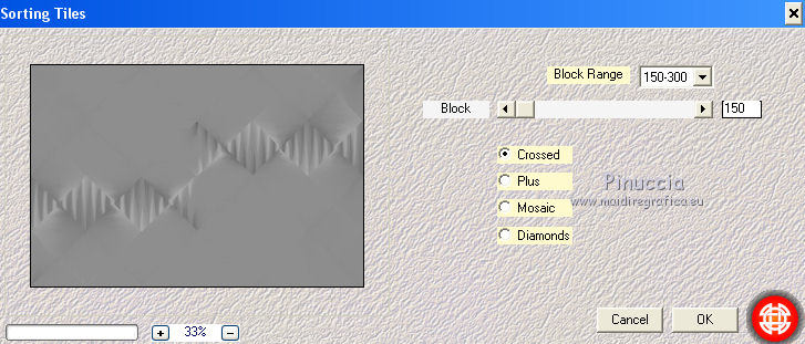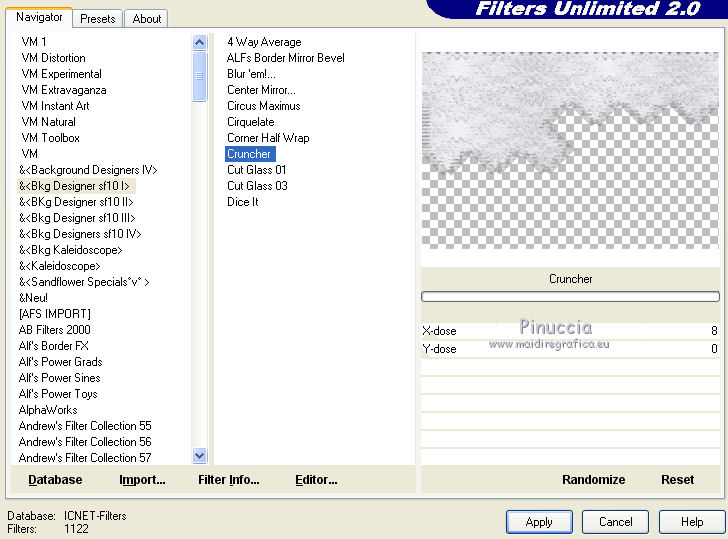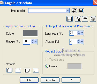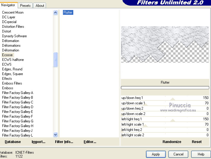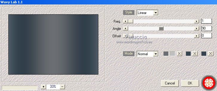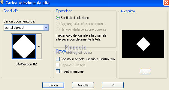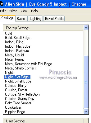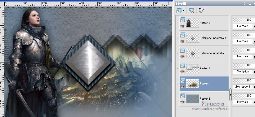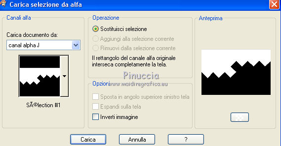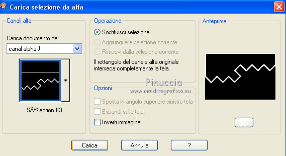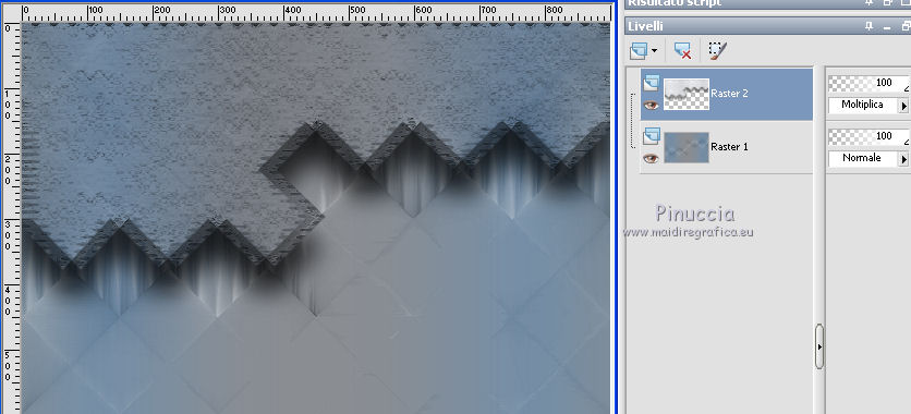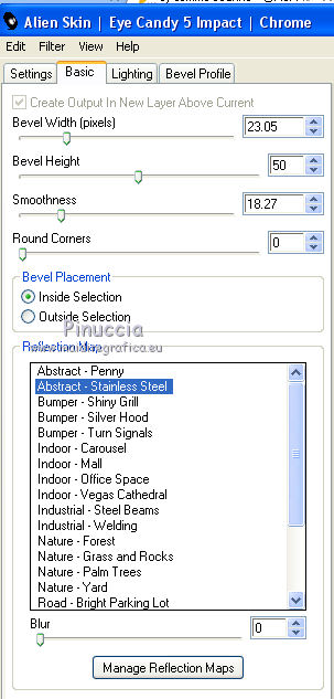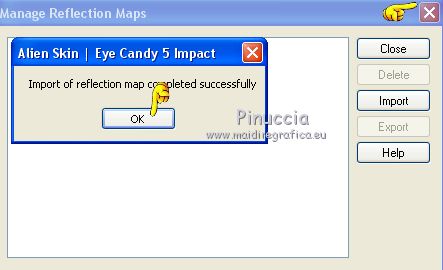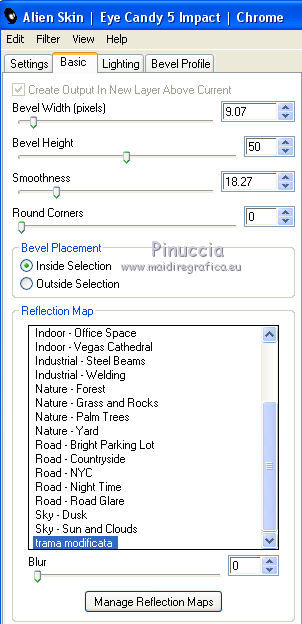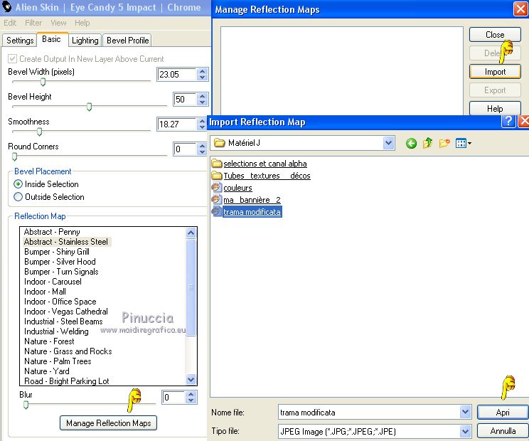 qui puoi trovare qualche risposta ai tuoi dubbi. Se l'argomento che ti interessa non è presente, ti prego di segnalarmelo. Questo tutorial è stato realizzato con Corel2020 e tradotto con CorelX7, ma può essere realizzato anche con le altre versioni di PSP. Dalla versione X4, il comando Immagine>Rifletti è stato sostituito con Immagine>Capovolgi in orizzontale, e il comando Immagine>Capovolgi con Immagine>Capovolgi in verticale. Nelle versioni X5 e X6, le funzioni sono state migliorate rendendo disponibile il menu Oggetti. Con la nuova versione X7, sono tornati Rifletti>Capovolgi, ma con nuove varianti. Vedi la scheda sull'argomento qui Occorrente: Materiale qui Per il tube grazie Jeanne. Il resto del materiale è di Moi-Même Se hai problemi con il canale alfa, puoi usare le selezioni fornite, da mettere nella cartella Selezioni. (in questa pagina trovi i links ai siti dei creatori del materiale) Filtri: se hai problemi con i filtri, consulta la mia sezione filtri qui Filters Unlimited 2.0 qui Mehdi - Wavy Lab 1.1. qui Mehdi - Sorting Tiles qui Ecosse - Flutter qui &<Bkg Designer sf10I> - Cruncher (da importare in Unlimited) qui Alien Skin Eye Candy 5 Impact - Chrome qui I filtri Ecosse si possono usare da soli o importati in Filters Unlimited (come fare vedi qui) Se un filtro fornito appare con questa icona ![]() non esitare a cambiare modalità di miscelatura e opacità secondo i colori utilizzati. Imposta il colore di primo piano con #bfbfbf, e il colore di sfondo con il colore #6b6e72. ![]() 1. Apri canal alpha_jeanne. Finestra>Duplica o sulla tastiera maiuscola+D per fare una copia. ![]() Chiudi l'originale. La copia, che sarà la base del tuo lavoro, non è vuota, ma contiene le selezioni salvate sul canale alfa Effetti>Plugins>Mehdi - Wavy Lab 1.1. Questo filtro crea gradienti con i colori della tua paletta: il primo è il colore di sfondo, il secondo quello di primo piano. Cambia gli ultimi due colori creati dal filtro con il colore #364450 ![]() 2. Livelli>Nuovo livello raster. Selezione>Seleziona tutto. Apri l'immagine texture 1. Attiva lo strumento Cambia colore ![]() e clicca sull'immagine con il tasto sinistro del mouse per usare il colore di primo piano. se stai usando una vecchia versione che non ha questo strumento, puoi usare lo strumento Sostituzione Colore, che però non sempre dà buoni risultati, o Regola>Tonalità e saturazione>Viraggio, con il colore scelto Salva la trama in jpg (per il punto 8 del tutorial): Per avere un nuovo file e mantenere la trama originale: File>Salva con nome .... e assegna un altro nome alla trama. Modifica>Copia. Torna al tuo lavoro e vai a Modifica>Incolla nella selezione. Selezione>Deseleziona. 3. Regola>Sfocatura>Sfocatura radiale. ![]() Effetti>Effetti di bordo>Aumenta di più. 4. Effetti>Plugins>Mehdi - Sorting Tiles. ![]() Regola>Messa a fuoco>Accentua messa a fuoco. Cambia la modalità di miscelatura di questo livello in Luminanza. Livelli>Unisci>Unisci giù. 5. Selezione>Carica/Salva selezione>Carica selezione da canale alfa. La selezione #1 è subito disponibile. Devi soltanto cliccare Carica. ![]() Livelli>Nuovo livello raster. Apri l'immagine texture 2, e vai a Modifica>Copia. Torna al tuo lavoro e vai a Modifica>Incolla nella selezione. Effetti>Plugins>Filters Unlimited 2.0 - Ecosse - Flutter, con i settaggi standard. ![]() Selezione>Deseleziona. Effetti>Plugins>Filters Unlimited 2.0 - &<Bkg Designer sf10I> - Cruncher. ![]() 6. Selezione>Carica/Salva selezione>Carica selezione da canale alfa. Apri il menu delle selezioni e carica la selezione #3. ![]() Effetti>Effetti di bordo>Aumenta. Selezione>Deseleziona. Effetti>Effetti 3D>Sfalsa ombra, colore nero. ![]() Cambia la modalità di miscelatura di questo livello in Moltiplica (o secondo i tuoi colori). ![]() 7. Attiva il livello Raster 1. Selezione>Carica/Salva selezione>Carica selezione da canale alfa. Apri il menu delle selezioni e carica la selezione #2. ![]() Selezione>Innalza selezione a livello. Livelli>Disponi>Sposta su. Mantieni selezionato. 8. Effetti>Plugins>Alien Skin Eye Candy 5 Impact - Chrome (se necessario, trovi i decori nel materiale: copia/incolla come nuovo livello, come nell'esempio, salta questo passaggio e prosegui al punto successivo). Sotto Settings seleziona il preset Night Flat Edge ![]() Sotto Basic, clicca su Manage Reflection Maps e, nella finestra che si apre, clicca su Import. Cerca e seleziona la trama salvata al punto 2, clicca Apri per importarla. ![]() Clicca ok sul messaggio successivo e chiudi la finestra, semplicemente cliccando sulla crocetta rossa. ![]() A questo punto, seleziona la trama nella lista dei preset e ok per applicarlo. ![]() Mantieni selezionato. Effetti>Effetti di bordo>Aumenta. 9. Selezione>Modifica>Contrai - 20 pixels. Effetti>Plugins>Alien Skin Eye Candy 5 Impact - Chrome. Seleziona il preset Abstract-Stainless Steel e ok. ![]() 10. Selezione>Innalza selezione a livello. Attiva il livello sottostante. Effetti>Effetti 3D>Sfalsa ombra, colore nero. ![]() Selezione>Deseleziona. Ripeti Effetti>Effetti 3D>Sfalsa ombra, con i settaggi precedenti. 11. Attiva il livello soprastante. Modifica>Ripeti Sfalsa ombra. 12. Apri il tube principale "Jeanne tube" e vai a Modifica>Copia. Torna al tuo lavoro e vai a Modifica>Incolla come nuovo livello. Immagine>Ridimensiona, al 70%, tutti i livelli non selezionato. Sposta il tube in basso a sinistra.Effetti>Effetti 3D>Sfalsa ombra, colore nero. ![]() 13. Attiva il livello Raster 1. Apri il misted Scène, e vai a Modifica>Copia. Torna al tuo lavoro e vai a Modifica>Incolla come nuovo livello. Oggetti>Allinea>Inferiore, o se stai usando una versione precedente che non rende disponibile il menu Oggetti, usa lo strumento Spostamento ![]() ![]() Carica nuovamente la selezione 1: Selezione>Carica/Salva selezione>Carica selezione da canale alfa. Carica ![]() Premi sulla tastiera il tasto CANC ![]() Selezione>Deseleziona. Cambia la modalità di miscelatura di questo livello in Sovrapponi, o seco