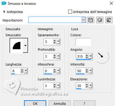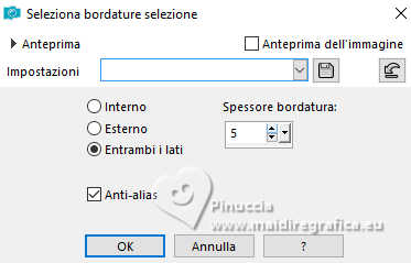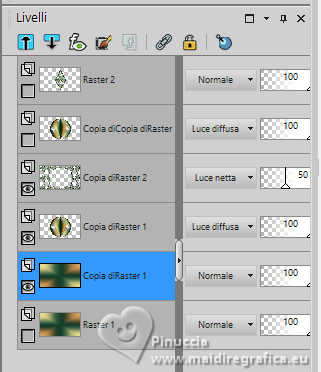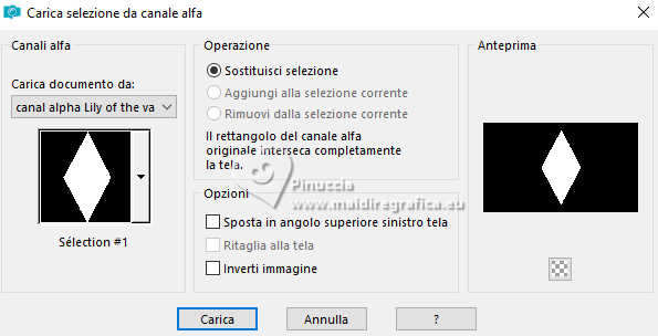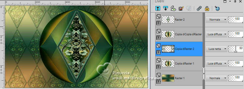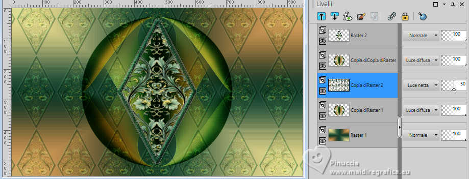 qui puoi trovare qualche risposta ai tuoi dubbi. Se l'argomento che ti interessa non è presente, ti prego di segnalarmelo. Questo tutorial, creato con PSP 2020, è stato tradotto con PSPX9, ma può essere realizzato anche con le altre versioni di PSP. Dalla versione X4, il comando Immagine>Rifletti è stato sostituito con Immagine>Capovolgi in orizzontale, e il comando Immagine>Capovolgi con Immagine>Capovolgi in verticale. Nelle versioni X5 e X6, le funzioni sono state migliorate rendendo disponibile il menu Oggetti. Con la nuova versione X7, sono tornati Rifletti>Capovolgi, ma con nuove varianti. Vedi la scheda sull'argomento qui English Translation qui/here Le vostre versioni qui![]() Occorrente: ![]() Il materiale è di Moi-Méme. (in questa pagina trovi i links ai siti dei creatori del materiale) ![]() se hai problemi con i filtri, consulta la mia sezione filtri qui Filters Unlimited 2.0 qui Mehdi - Wavy Lab 1.1. qui &> Bkg Designer sf10I> - Cruncher (da importare in Unlimited) qui Mura's Seamless - Mirror Diagonal qui Mura's Meister - Copies qui Mura's Meister - Perspective Tiling qui Alien Skin Eye Candy 5 Impact - Gradient Glow qui AAA Frames - Foto Frame qui FM Tile Tools - Blend Emboss qui I filtri Mura's Seamless si possono usare da soli o importati in Filters Unlimited (come fare vedi qui) Se un filtro fornito appare con questa icona ![]() non esitare a cambiare modalità di miscelatura e opacità secondo i colori utilizzati. Metti il preset Cliccando sul file una o due volte (a seconda delle tue impostazioni), automaticamente il preset si installerà nella cartella corretta. perché uno o due clic vedi qui ![]() Se hai problemi con il canale alfa, apri una nuova immagine trasparente 950 x 550 pixels, e usa le selezioni da disco. Imposta il colore di primo piano con il colore #8daf7c, e il colore di sfondo con il colore #17412d. ![]() 1. Apri canal_alpha_Lily of the valley Questa immagine, che sarà la base del tuo lavoro non è vuota, ma contiene le selezioni salvate sul canale alfa. Effetti>Plugins>Mehdi - Wavy Lab 1.1. Questo filtro crea gradienti con i colori della paletta: il primo è il colore di sfondo, il secondo quello di primo piano. Cambia gli ultimi due colori creati dal filtro: il terzo con il colore #c89756 e il quarto con il colore #dad28a. ![]() Effetti>Plugins>Mura's Seamless - Mirror Diagonal, con i settaggi standard. ![]() Effetti>Plugins>Filters Unlimited 2.0 - Lens Effects - Refractor 1 ![]() Effetti>Effetti di bordo>Aumenta. 2. Livelli>Duplica. Effetti>Effetti geometrici>Prospettiva verticale. ![]() Effetti>Effetti di immagine>Motivo unico, con i settaggi standard. ![]() Regola>Messa a fuoco>Accentua messa a fuoco. Cambia la modalità di miscelatura di questo livello in Luce diffusa. 3. Livelli>Duplica. Immagine>Rifletti>Rifletti verticalmente (Immagine>Capovolgi). ![]() Livelli>Unisci>Unisci giù. Effetti>Effetti geometrici>Cerchio. ![]() Regola>Messa a fuoco>Metti a fuoco. Immagine>Ridimensiona, al 90%, tutti i livelli non selezionato. Livelli>Duplica (non unire). 4. Livelli>Nuovo livello raster. Selezione>Carica/Salva selezione>Carica selezione da canale alfa. La selezione sélection 1 è subito disponibile. Devi soltanto cliccare Carica. ![]() Apri déco 1 ![]() Modifica>Copia. Torna al tuo lavoro e vai a Modifica>Incolla nella selezione. Selezione>Modifica>Seleziona bordature selezione. ![]() Mantieni selezionato. 5. Attiva il livello di sfondo, Raster 1. Selezione>Innalza selezione a livello. Livelli>Disponi>Porta in alto. Effetti>Plugins>Filters Unlimited 20 - Lens Effects - Refractor 1. ![]() Effetti>Effetti di bordo>Aumenta. Effetti>Effetti 3D>Smusso a incasso. ![]() Effetti>Plugins>Alien Skin Eye Candy 5 Impact - Gradient Glow. Seleziona il preset Lily of the valley - setting: Black and white stripes ![]() se hai problemi con il filtro, copia/incolla come nuovo livello il tube déco gradient glow che trovi nel materiale. Effetti>Effetti 3D>Sfalsa ombra, colore nero. ![]() Selezione>Deseleziona. Livelli>Unisci>Unisci giù. 6. Livelli>Duplica. Immagine>Ridimensiona, al 50%, tutti i livelli non selezionato. Effetti>Plugins>Mura's Meister - Copies. ![]() Cambia la modalità di miscelatura di questo livello in Luce netta, e abbassa l'opacità al 50%. Livelli>Disponi>Sposta giù - 2 volte. ![]() Effetti>Effetti 3D>Sfalsa ombra, con i settaggi precedenti. Selezione>Carica/Salva selezione>Carica selezione da canale alfa. Apri il menu delle selezioni e carica la selezione sélection 2 ![]() Premi sulla tastiera il tasto CANC ![]() Selezione>Deseleziona. Risultato ![]() 7. Attiva il livello Raster 1. Livelli>Duplica. Rimani sulla copia e chiudi il livello inferiore e i due livelli superiori. ![]() Livelli>Unisci>Unisci visibile. Livelli>Visualizza>Tutto. Rimani sul livello Uniti. Effetti>Plugins>Mura's Meister - Perspective Tiling. ![]() Effetti>Effetti 3D>Sfalsa ombra, colore nero. ![]() Selezione>Carica/Salva selezione>Carica selezione da canale alfa. Apri il menu delle selezioni e carica nuovamente la selezione sélection 2 ![]() Premi sulla tastiera il tasto CANC ![]() Selezione>Deseleziona. 8. Attiva il livello Raster 1. ![]() Livelli>Nuovo livello raster. Selezione>Seleziona tutto. Apri Lily-Valley-1_misted par MM ![]() Cancella il watermark e vai a Modifica>Copia. Torna al tuo lavoro e vai a Modifica>Incolla nella selezione. Selezione>Deseleziona. Effetti>Effetti di immagine>Motivo unico. ![]() Selezione>Carica/Salva selezione>Carica selezione da canale alfa. Apri il menu delle selezioni e carica nuovamente la selezione sélection 2 ![]() Premi sulla tastiera il tasto CANC. 9. Attiva il livello raster 1. Selezione>Carica/Salva selezione>Carica selezione da canale alfa. Apri il menu delle selezioni e carica la selezione sélection 3 ![]() Selezione>Innalza selezione a livello. Livelli>Disponi>Porta in alto. Effetti>Effetti di bordo>Aumenta di più. Mantieni selezionato. 10. Selezione>Modifica>Contrai - 15 pixels. Effetti>Plugins>AAA Frames - Foto 