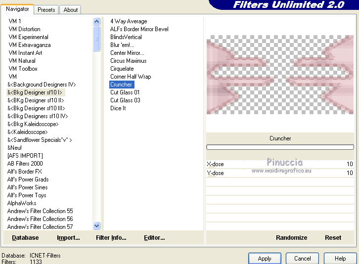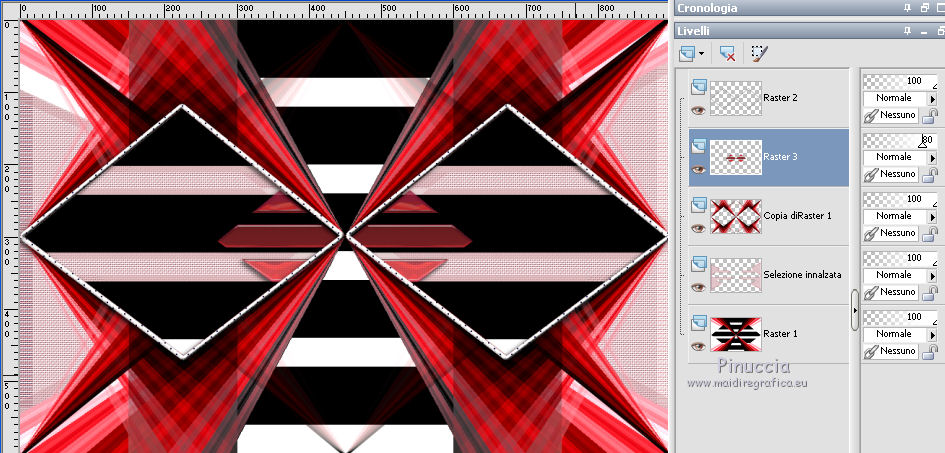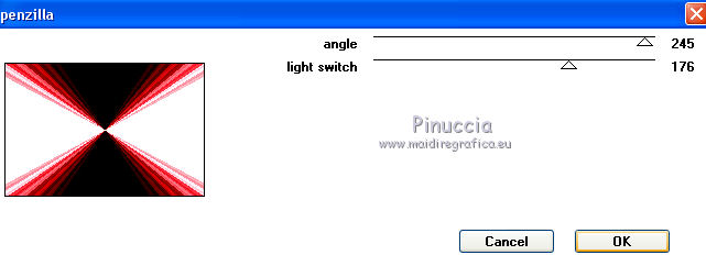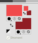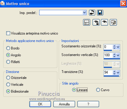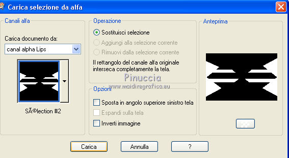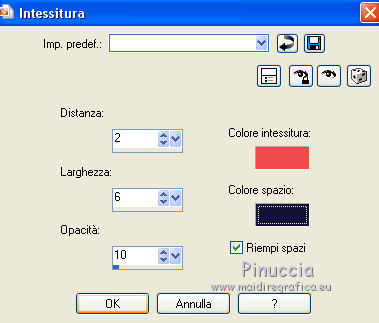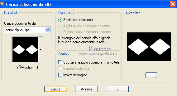 qui puoi trovare qualche risposta ai tuoi dubbi. Se l'argomento che ti interessa non è presente, ti prego di segnalarmelo. Questo tutorial è stato realizzato con Corel2020 e tradotto con CorelX7, ma può essere realizzato anche con le altre versioni di PSP. Dalla versione X4, il comando Immagine>Rifletti è stato sostituito con Immagine>Capovolgi in orizzontale, e il comando Immagine>Capovolgi con Immagine>Capovolgi in verticale. Nelle versioni X5 e X6, le funzioni sono state migliorate rendendo disponibile il menu Oggetti. Con la nuova versione X7, sono tornati Rifletti>Capovolgi, ma con nuove varianti. Vedi la scheda sull'argomento qui Occorrente: Materiale qui Per il tube grazie Karine. Il resto del materiale è di Moi-Même (in questa pagina trovi i links ai siti dei creatori del materiale) Filtri: se hai problemi con i filtri, consulta la mia sezione filtri qui Filters Unlimited 2.0 qui &<Bkg Designersf10I> - Cruncher (da importare in Unlimited) qui Kang 1 - Penzilla qui Transparency - Eliminate White qui I filtri Kang e Transparency si possono usare da soli o importati in Filters Unlimited (come fare vedi qui) Se un filtro fornito appare con questa icona ![]() non esitare a cambiare modalità di miscelatura e opacità secondo i colori utilizzati. Imposta il colore di primo piano con #f14a4d, e il colore di sfondo con il colore #901e25. ![]() 1. Apri canal alpha Lips. L'immagine, che sarà la base del tuo lavoro, non è vuota, ma contiene le selezioni salvate sul canale alfa. Se hai problemi con le selezioni, puoi usare le selezioni alternative fornite nel materiale (da mettere nella cartella Selezioni). Riempi l'immagine trasparente con il colore di sfondo.Effetti>Plugins>Kang 1 - Penzilla, con i settaggi standard. ![]() 2. Livelli>Duplica. Immagine>Ruota per gradi - 90 gradi a sinistra. ![]() Effetti>Effetti di immagine>Motivo unico ![]() Modifica>Ripeti Motivo unico. 3. Attiva il livello di sfondo Raster 1. Selezione>Seleziona tutto. Immagine>Ritaglia la selezione. 4. Attiva il livello superiore. Effetti>Plugins>Transparency - Eliminate White. Selezione>Carica/Salva selezione>Carica selezione da canale alfa. La selezione #1 è subito disponibile. Devi soltanto cliccare Carica. ![]() Premi sulla tastiera il tasto CANC ![]() Selezione>Deseleziona. 5. Livelli>Duplica. Effetti>Effetti di immagine>Motivo unico, con i settaggi standard. ![]() Livelli>Unisci>Unisci giù. Selezione>Carica/Salva selezione>Carica selezione da canale alfa. Carica nuovamente La selezione #1 ![]() Premi sulla tastiera il tasto CANC. Mantieni selezionato. 6. Imposta il colore di sfondo con il colore bianco Livelli>Nuovo livello raster. Riempi la selezione con il colore bianco.Effetti>Effetti di trama>Intessitura colore intessitura: colore di primo piano colore spazio: nero ![]() Effetti>Effetti 3D>Smusso a incasso. ![]() Selezione>Deseleziona. Effetti>Effetti 3D>Sfalsa ombra, colore nero. ![]() 7. Attiva il livello Raster 1. Apri motif_calque.png, cancella il watermark, e vai a Modifica>Copia. Torna al tuo lavoro e vai a Modifica>Incolla come nuovo livello. Livelli>Unisci>Unisci giù. 8. Selezione>Carica/Salva selezione>Carica selezione da canale alfa. Apri il menu delle selezioni e carica la selezione #2. ![]() Selezione>Innalza selezione a livello. Effetti>Effetti di trama>Intessitura colore intessitura: colore di primo piano colore spazio: nero ![]() Importante, prima di applicare il prossimo filtro (altrimenti, avrai un risultato differente), imposta nuovamente il colore di sfondo con il colore iniziale #901e25. Effetti>Plugins>Filters Unlimited 2.0 - &<Bkg Designersf10I> - Cruncher. ![]() Selezione>Deseleziona. 9. Attiva il livello soprastante. Apri il tube Déco 2 e vai a Modifica>Copia. Torna al tuo lavoro e vai a Modifica>Incolla come nuovo livello. (puoi colorizzare o utilizzare lo strumento Cambia colore ![]() Immagine>Ridimensiona, al 40%, tutti i livelli non selezionato. Effetti>Effetti 3D>Sfalsa ombra, con i settaggi precedenti. ![]() 10. Immagine>Aggiungi bordatura, 1 pixel, simmetriche, colore nero. Immagine>Aggiungi bordatura, 2 pixels, simmetriche, colore di sfondo Immagine>Aggiungi bordatura, 1 pixel, simmetriche, colore nero. Immagine>Aggiungi bordatura, 50 pixels, simmetriche, colore bianco. 11. Apri il tube déco01MM e vai a Modifica>Copia. Torna al tuo lavoro e vai a Modifica>Incolla come nuovo livello. Tasto K per attivare lo strumento Puntatore ![]() e imposta Posizione x: 227,00 e Posizione V: 180,00 ![]() Tasto M per deselezionare lo strumento (ti sei mai chiesto il perchè di questo comando? Vedi qui) 12. Apri il tube déco coins fin, cancella il watermark, e vai a Modifica>Copia. Torna al tuo lavoro e vai a Modifica>Incolla come nuovo livello. Non spostarlo. 13. Apri il tube rouge lèvres_MM 1 e vai a Modifica>Copia. Torna al tuo lavoro e vai a Modifica>Incolla come nuovo livello. Immagine>Ridimensiona, al 50%, tutti i livelli non selezionato. Effetti>Effetti 3D>Sfalsa ombra, colore nero. ![]() Strumento Puntatore ![]() e imposta Posizione x: 49,00 e Posizione V: 467,00 (ricorda che i settaggi cambiano se impostati prima di applicare lo Sfalsa ombra) ![]() (o sposta il tube come preferisci)Tasto M per deselezionare lo strumento 14. Apri il tube WA Texte, cancella il watermark, e vai a Modifica>Copia. Torna al tuo lavoro e vai a Modifica>Incolla come nuovo livello. Lascialo come sta. 15. Apri il tube della donna, cancella il watermark, e vai a Modifica>Copia. Torna al tuo lavoro e vai a Modifica>Incolla come nuovo livello. Immagine>Ridimensiona, al 60%, tutti i livelli non selezionato. Strumento Puntatore ![]() e imposta Posizione x: 594,00 e Posizione V: 9,00 ![]() o adatta al tuo tube Effetti>Effetti 3D>Sfalsa ombra, colore nero. ![]() 16. Firma il tuo lavoro su un nuovo livello. Aggiungi, se vuoi, il watermark dell'autore e del traduttore. 17. Immagine>Aggiungi bordatura, 1 pixel, simmetriche, colore nero. Immagine>Ridimensoina, 950 pixels di larghezza, tutti i livelli seleziona