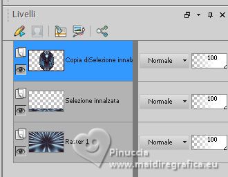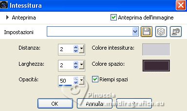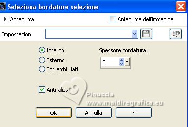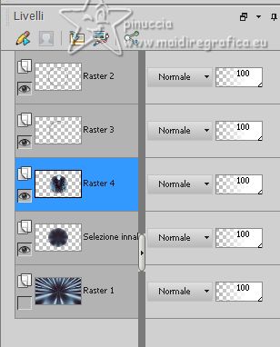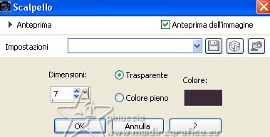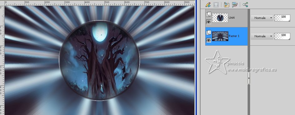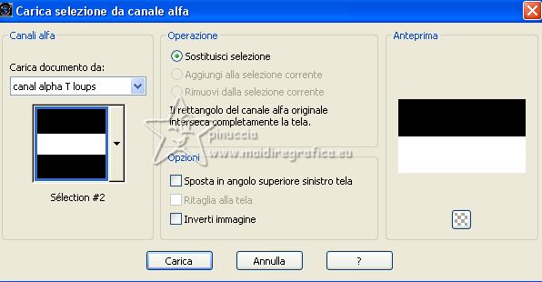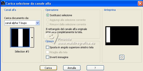 qui puoi trovare qualche risposta ai tuoi dubbi. Se l'argomento che ti interessa non è presente, ti prego di segnalarmelo. Questo tutorial è stato realizzato con PSP Ultimate 2020 e tradotto con PSPX7, ma può essere realizzato anche con le altre versioni di PSP. Dalla versione X4, il comando Immagine>Rifletti è stato sostituito con Immagine>Capovolgi in orizzontale, e il comando Immagine>Capovolgi con Immagine>Capovolgi in verticale. Nelle versioni X5 e X6, le funzioni sono state migliorate rendendo disponibile il menu Oggetti. Con la nuova versione X7, sono tornati Rifletti>Capovolgi, ma con nuove varianti. Vedi la scheda sull'argomento qui English Translation qui/here Le vostre versioni qui![]() Occorrente: ![]() (in questa pagina trovi i links ai siti dei creatori del materiale) ![]() se hai problemi con i filtri, consulta la mia sezione filtri qui Filters Unlimited 2.0 qui VM Distortion - Tumbler qui Alf's Border FX - Mirror Bevel qui Mura's Meister - Perspective Tiling qui Alien Skin Eye Candy 5 Impact - Extrude, Glass qui I filtri VM Distortion e Alf's Border FX si possono usare da soli o importati in Filters Unlimited (come fare vedi qui) Se un filtro fornito appare con questa icona ![]() non esitare a cambiare modalità di miscelatura e opacità secondo i colori utilizzati. ![]() Se hai problemi con il canale alfa, Apri una nuova immagine trasparente 950 x 550 pixels, e usa le selezioni da disco. 1. Scegli dal misted del paesaggio due colori, imposta il colore di primo piano con il colore chiaro, per l'esempio #cfcfd5. e il colore di sfondo con il colore scuro, per l'esempio #3c2c37. ![]() 2. Apri canal alpha T des loups Questa immagine, che sarà la base del tuo lavoro, non è vuota, ma contiene le selezioni salvate sul canale alfa. Selezione>Seleziona tutto. Apri il misted landscape7_fantasy_misted MM ![]() Selezione>Seleziona tutto. Selezione>Modifica>Contrai - 200 pixels (adatta al tuo paesaggio) Modifica>Copia e minimizza il tube, che ti servirà ancora. Torna al tuo lavoro e vai a Modifica>Incolla nella selezione. Selezione>Deseleziona. Effetti>Effetti di immagine>Motivo unico, con i settaggi standard. ![]() Regola>Sfocatura>Sfocatura radiale. ![]() Livelli>Unisci>Unisci tutto. 3. Livelli>Innalza livello di sfondo, Raster 1. Regola>Sfocatura>Sfocatura gaussiana, raggio 20. ![]() Effetti>Plugins>VM Distortion - Tumber, con i settaggi standard. ![]() Effetti>Effetti di riflesso>Specchio rotante, con i settaggi standard. ![]() 4. Selezione>Carica/Salva selezione>Carica selezione da canale alfa. La selezione sélection 1 è subito disponibile. Devi soltanto cliccare Carica. ![]() Selezione>Innalza selezione a livello. Regola>Sfocatura>Sfocatura gaussiana, con i settaggi precedenti. Mantieni selezionato. 5. Livelli>Nuovo livello raster. Riempi il livello con il colore di primo piano.Selezione>Modifica>Contrai - 5 pixels. Riempi con il colore di sfondo.Selezione>Modifica>Contrai - 5 pixels. Premi sulla tastiera il tasto CANC ![]() Mantieni ancora selezionato. 6. Effetti>Effetti 3D>Scalpello, colore di sfondo. ![]() Mantieni sempre selezionato. 7. Livelli>Nuovo livello raster. Effetti>Effetti 3D>Ritaglio. ![]() Livelli>Disponi>Sposta giù. Mantieni ancora selezionato. 8. Livelli>Nuovo livello raster. Modifica>Incolla nella selezione (il paesaggio è sempre in memoria). Livelli>Disponi>Sposta giù. Facoltativo: Regola>Messa a fuoco>Metti a fuoco. Selezione>Deseleziona. 9. Rimani su questo livello e chiudi il livello Raster 1. ![]() Livelli>Unisci>Unisci visibile Riapri e attiva il livello Raster 1. ![]() Selezione>Carica/Salva selezione>Carica selezione da canale alfa. Apri il menu delle selezioni e carica la selezione sélection 2. ![]() Selezione>Innalza selezione a livello. Effetti>Plugins>Mura's Meister - Perspective Tiling. ![]() Selezione>Deseleziona. 10. Livelli>Duplica. Effetti>Effetti geometrici>Cerchio. ![]() Tasto K per attivare lo strumento Puntatore ![]() modalità Prospettiva ![]() spingi il nodo superiore sinistro verso destra, simmetricamente il nodo destro si sposterà sinistra. ![]() Tasto M per deselezionare lo strumento. Livelli>Duplica. Ripeti Effetti>Effetti geometrici>Cerchio. ![]() Modifica>Taglia. Modifica>Incolla come nuova immagine e minimizza questa immagine. Torna al tuo lavoro ed elimina il livello rimasto vuoto (tasto destro del mouse sul livello e seleziona Elimina). ![]() 11. Ti troverai posizionato sul livello Copia di Selezione innalzata. ![]() Livelli>Duplica. Immagine>Capovolgi. Livelli>Unisci>Unisci giù. 12. Attiva il livello superiore, Uniti. ![]() Livelli>Unisci>Unisci giù. ![]() Immagine>Ridimensiona, all'80%, tutti i livelli non selezionato. Effetti>Effetti 3D>Sfalsa ombra, colore nero. ![]() 13. Attiva il livello Raster 1. Selezione>Carica/Salva selezione>Carica selezione da canale alfa. Apri il menu delle selezioni e carica la selezione sélection 3. ![]() Selezione>Innalza selezione a livello. Regola>Sfocatura>Sfocatura gaussiana, con i settaggi precedenti. Effetti>Plugins>Filters Unlimited 2.0 - Alf's Border FX - Mirror Bevel, con i settaggi standard. ![]() Effetti>Effetti di bordo>Aumenta. Selezione>Modifica>Seleziona bordature selezione. ![]() Effetti>Effetti di trama>Intessitura colore intessitura: colore di primo piano, colore spazio: colore di sfondo ![]() Effetti>Plugins>Alien Skin Eye Candy 5 Impact - Extrude. Seleziona il preset Centered small taper ![]() Selezione>Deseleziona. Effetti>Effetti 3D>Sfalsa ombra, con i settaggi precedenti. Livelli>Disponi>Porta in alto. ![]() Livelli>Duplica. Immagine>Rifletti. Livelli>Unisci>Unisci giù. 14. Attiva l'immagine minimizzata al punto 10 ![]() Modifica>Copia. Torna al tuo lavoro e vai a Modifica>Incolla come nuovo livello. Immagine>Ridimensiona, al 40%, tutti i livelli non selezionato. Tasto K per attivare lo strumento Puntatore ![]() e imposta Posizione X: 34,00 e Posizione Y: 23,00. ![]() Livelli>Duplica. Immagine>Capovolgi. Mantieni Posizione X: 34,00 e imposta Posizione Y: 35